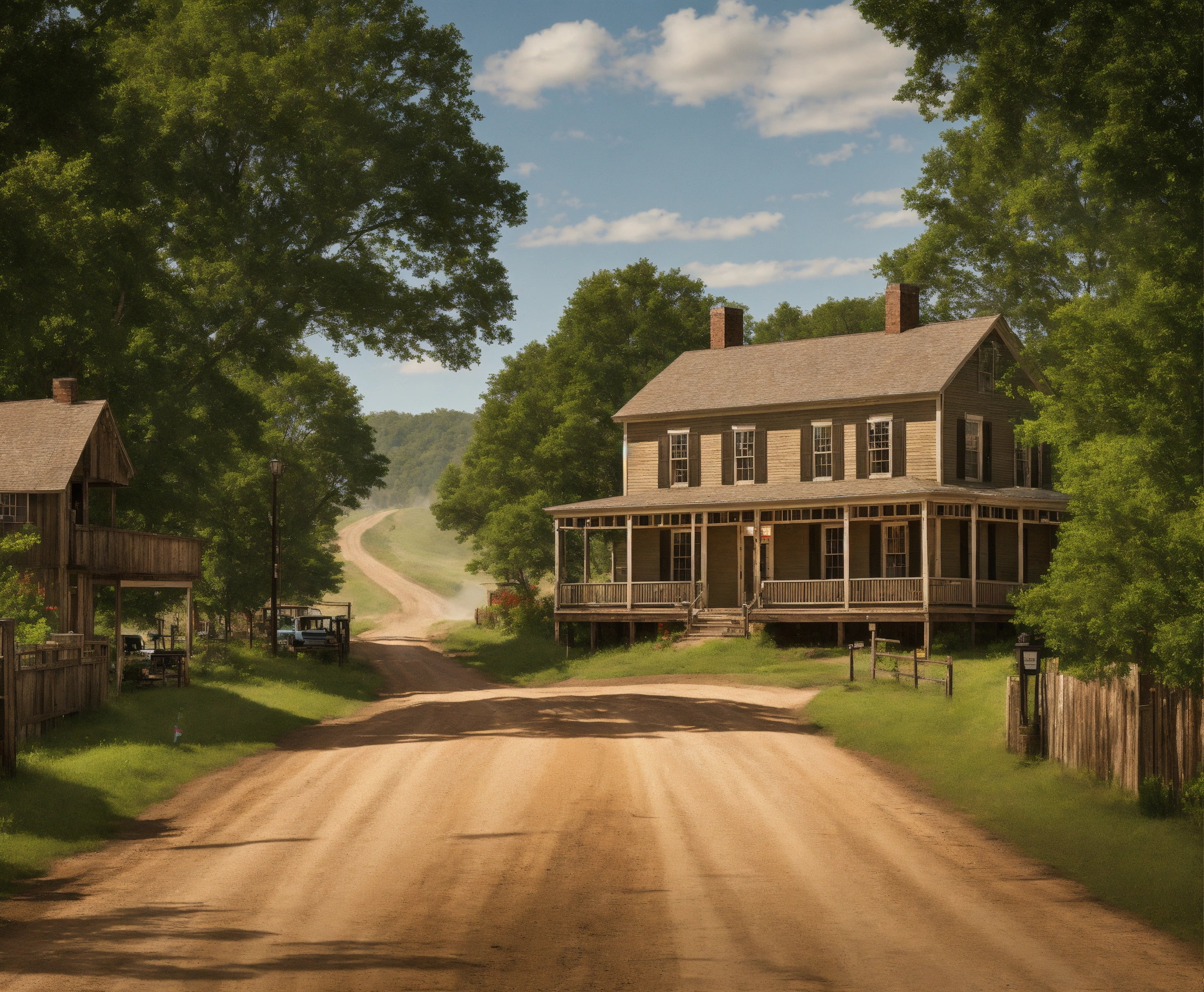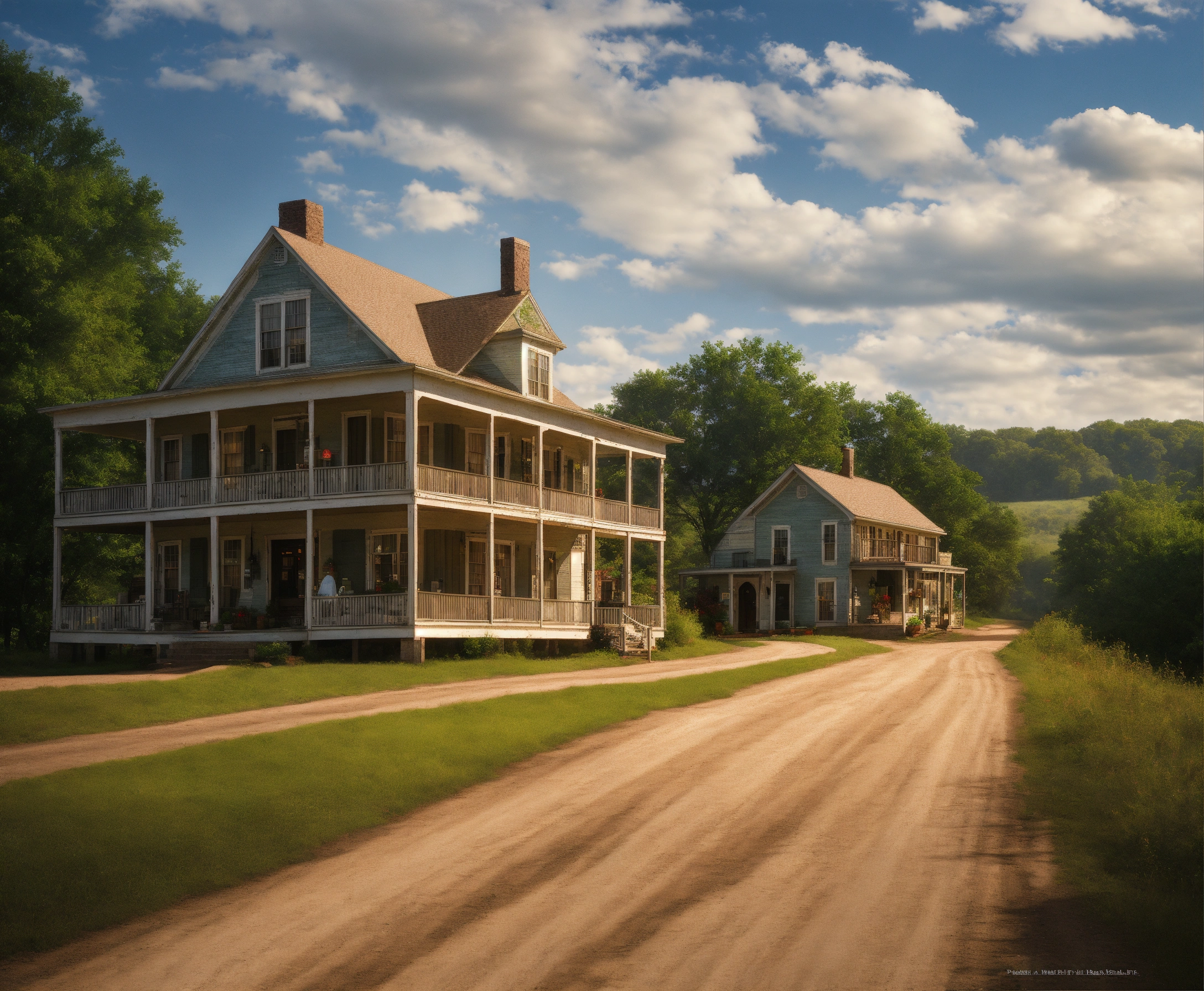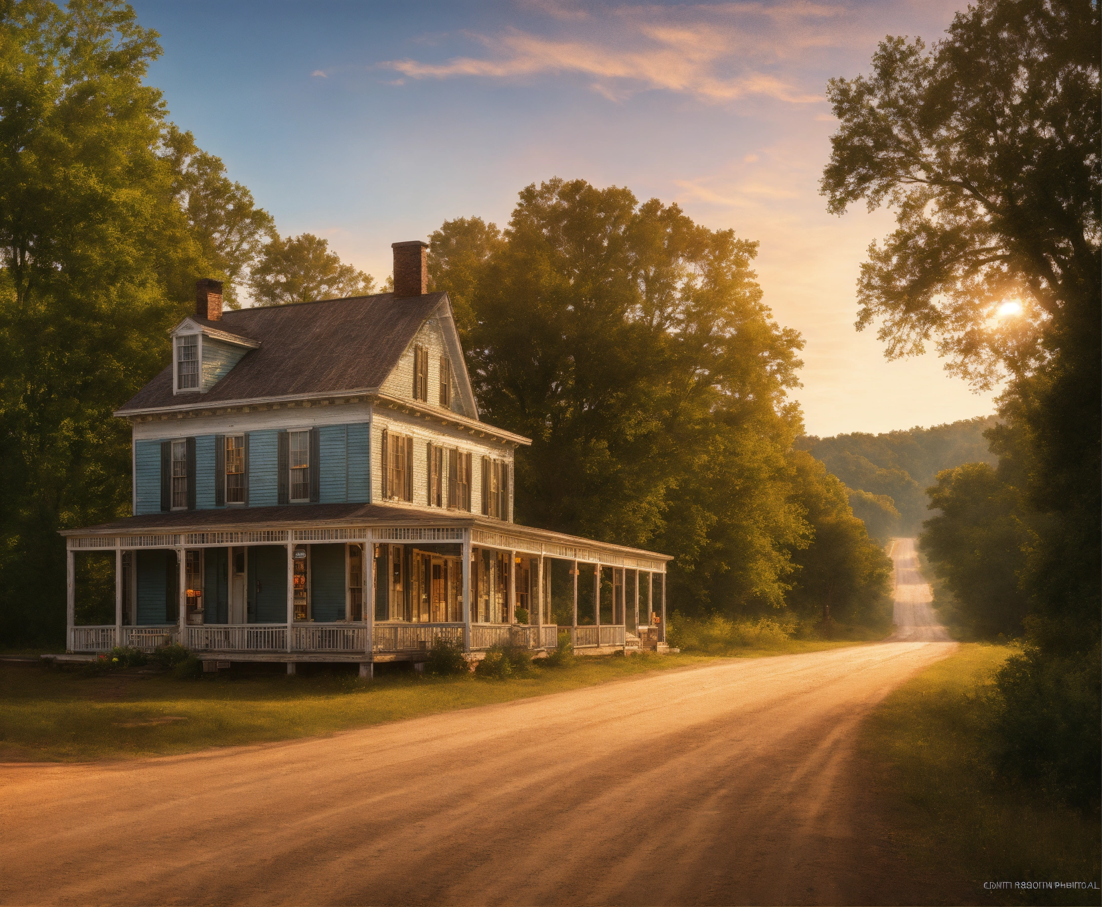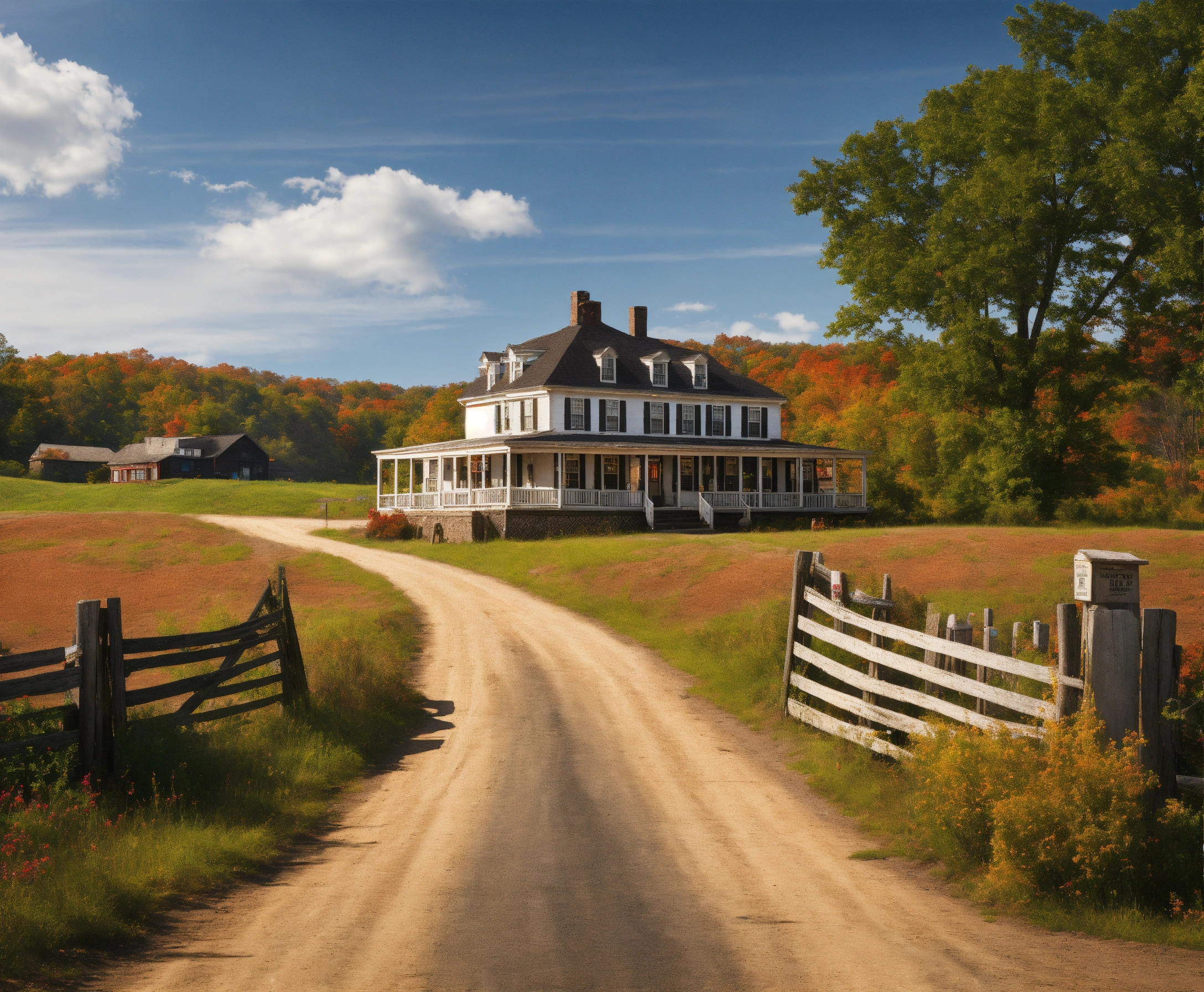 Picture a 1800 colonial inn at the end of a road, mid day with a dirt road leading up to it, photorealistic, magazine-quality