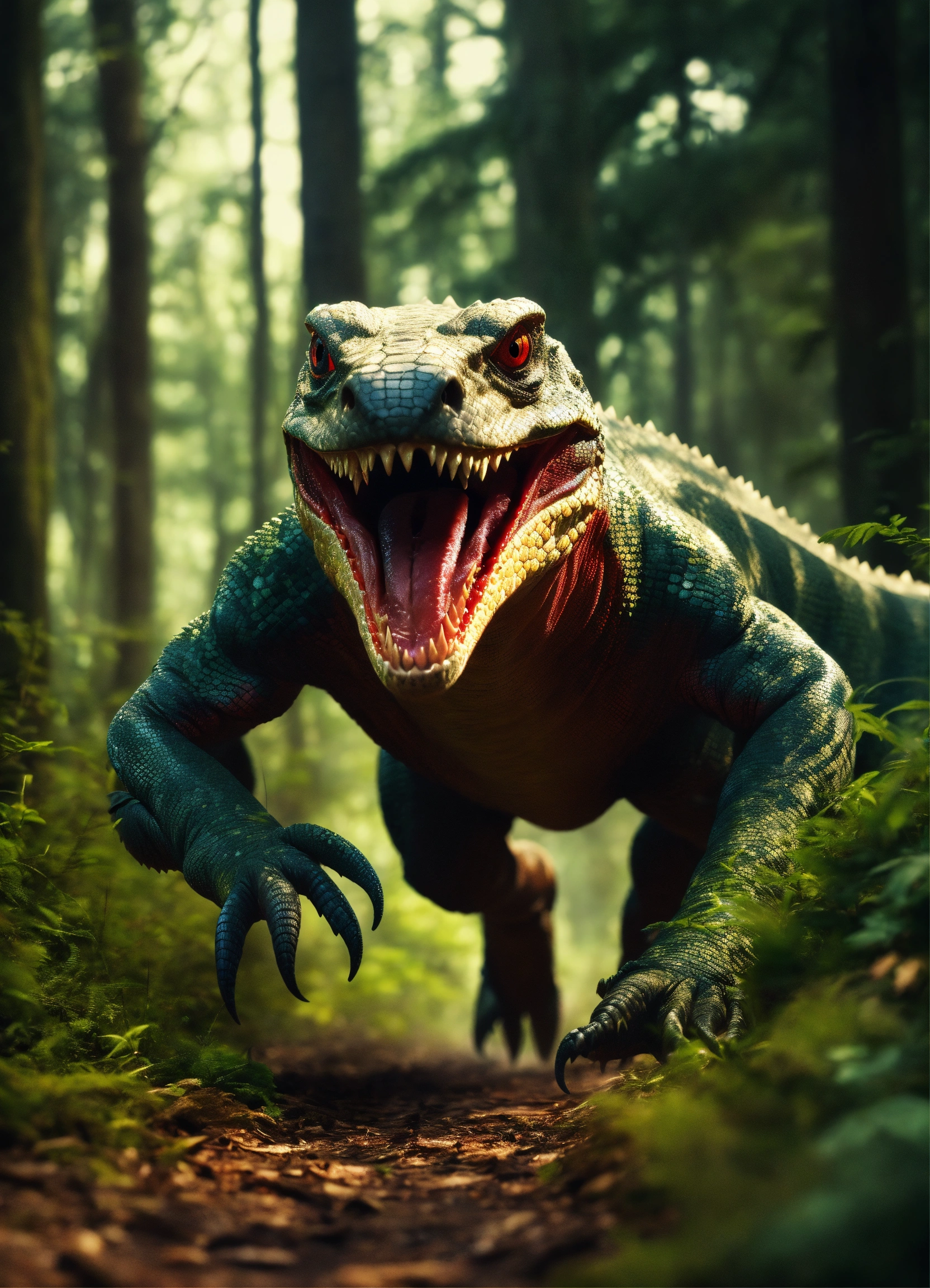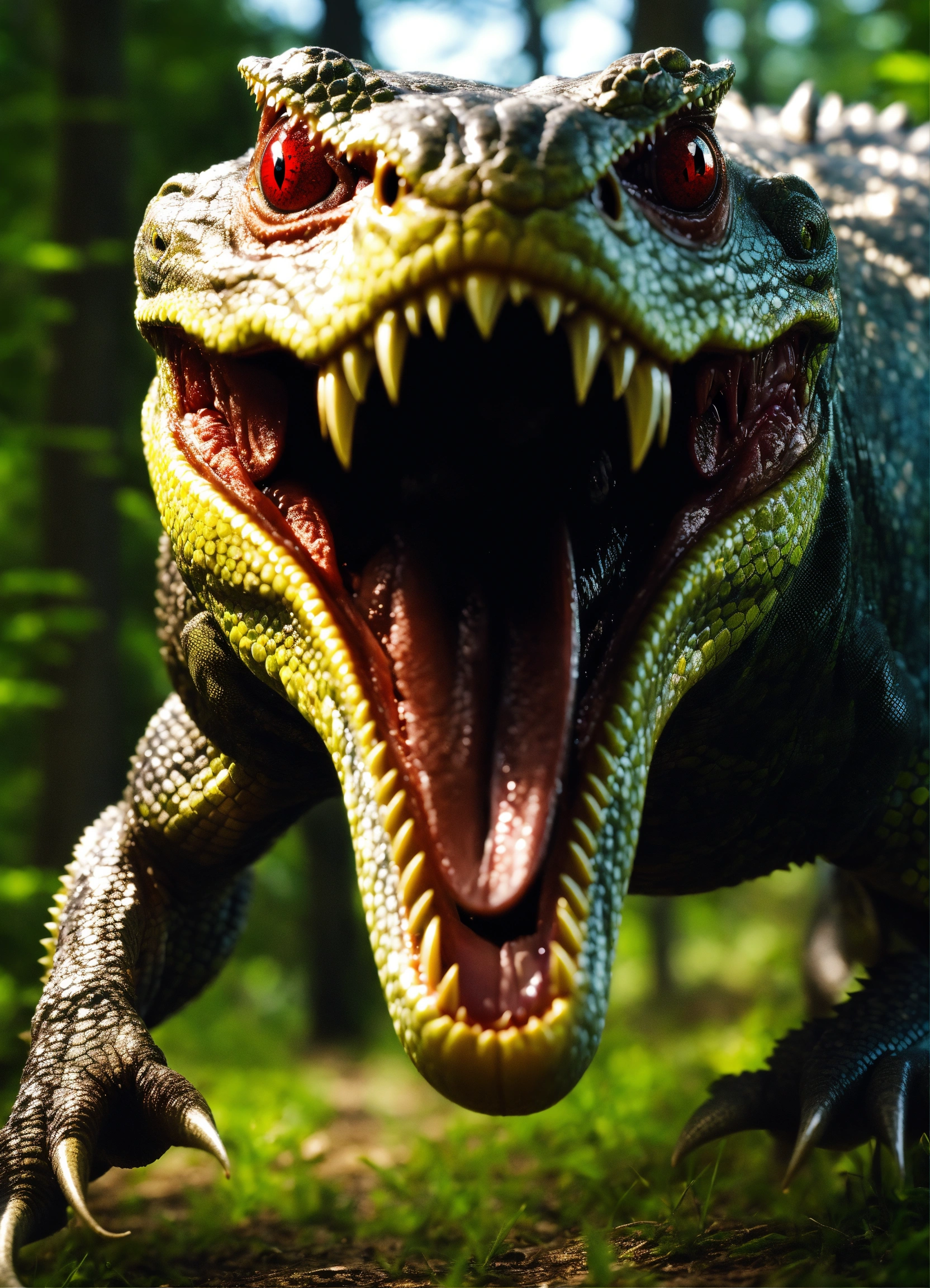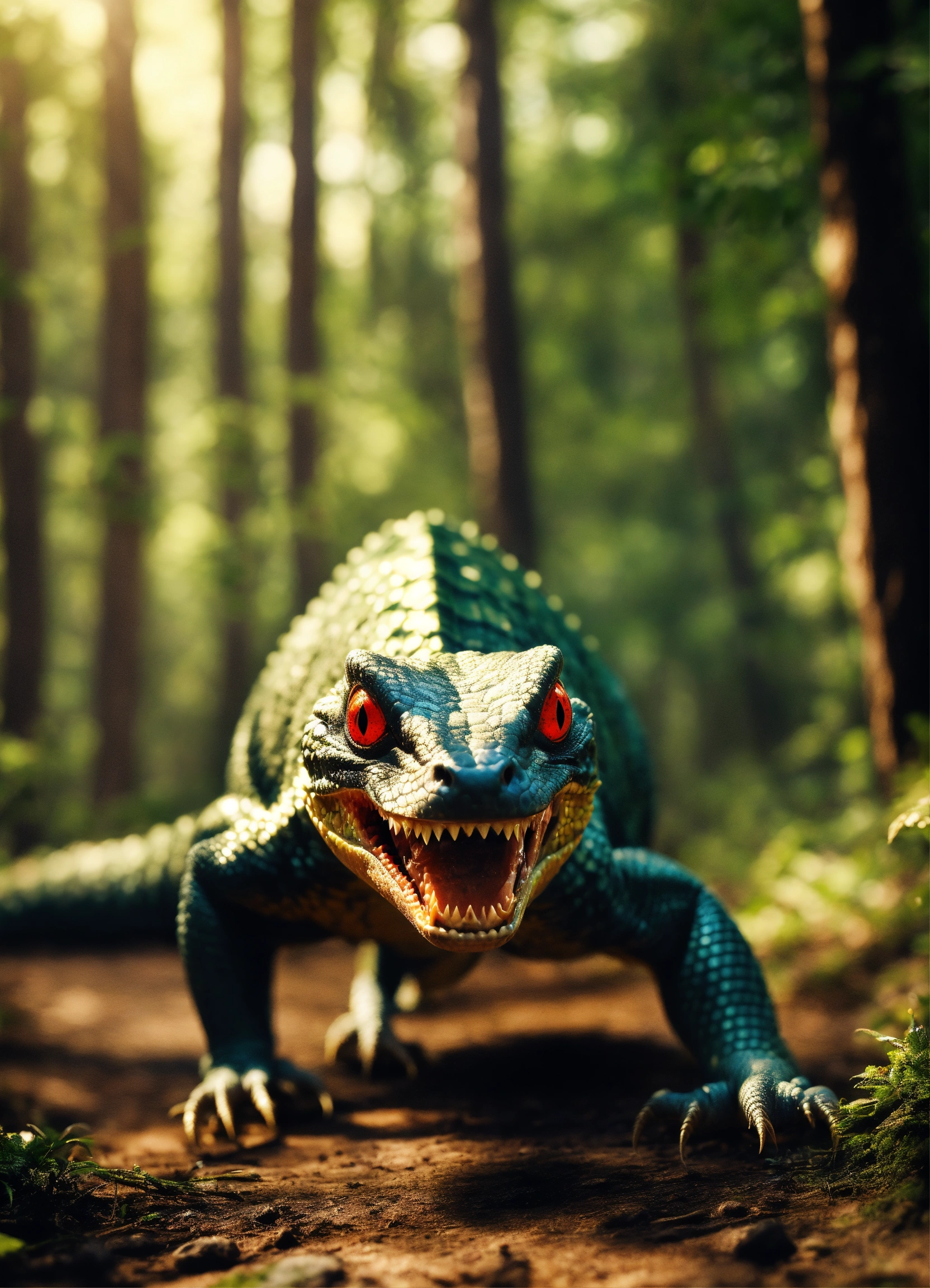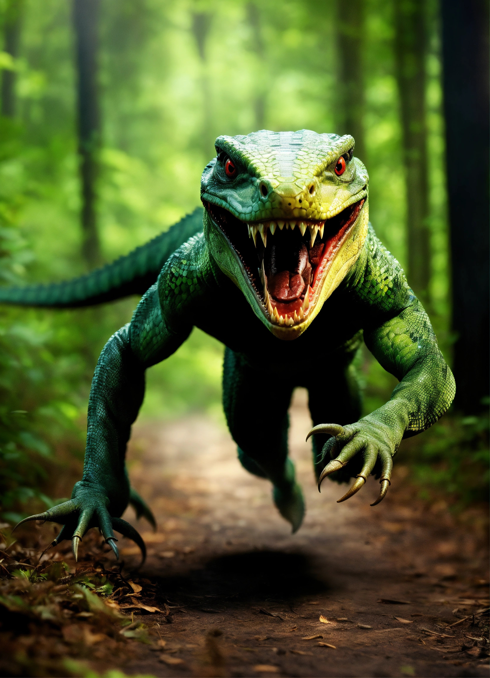 Terrifying reptilian running in ultra realistic style in the woods, big fangs, red eyes, ultra realistic, 4k resolution