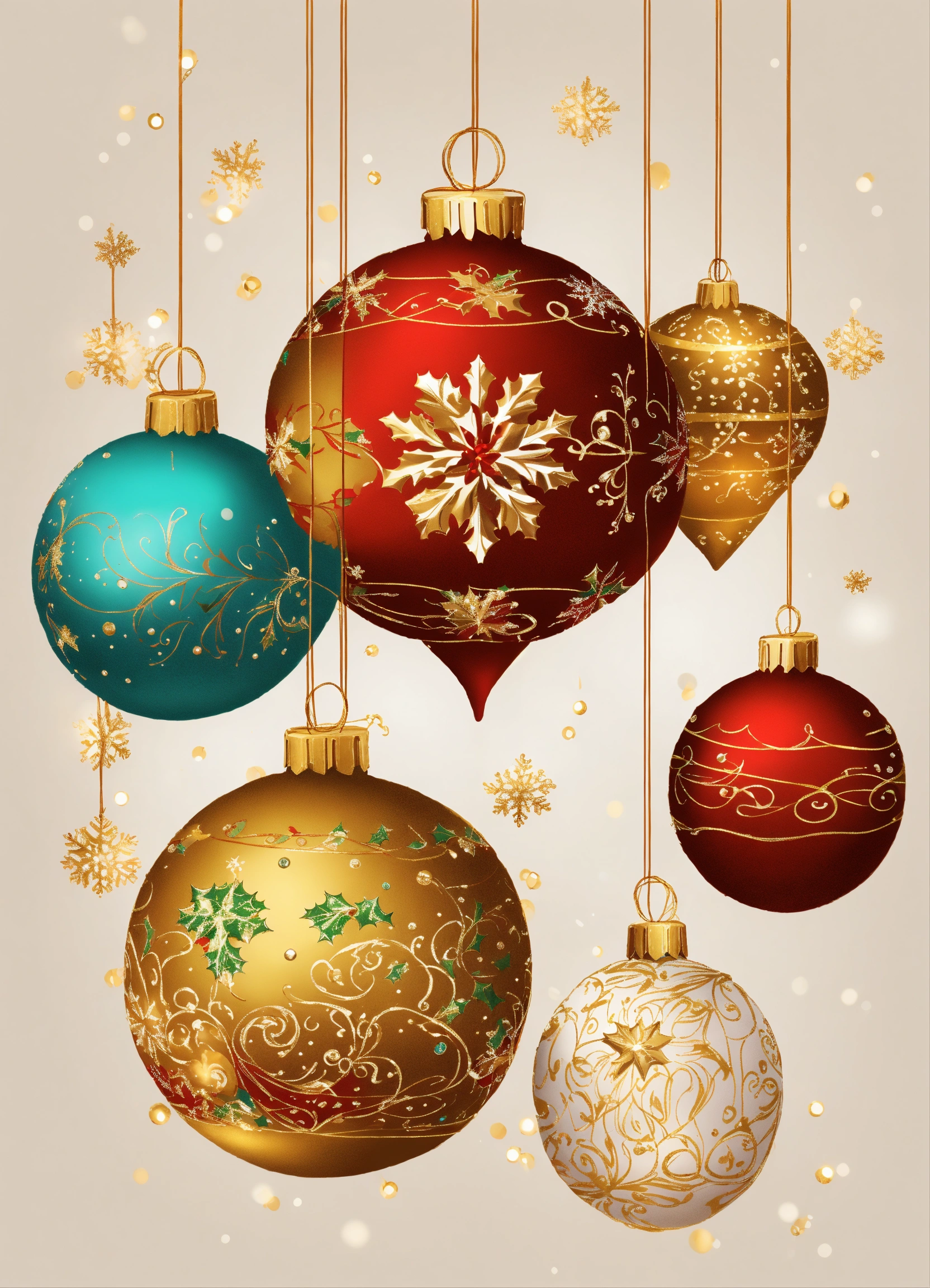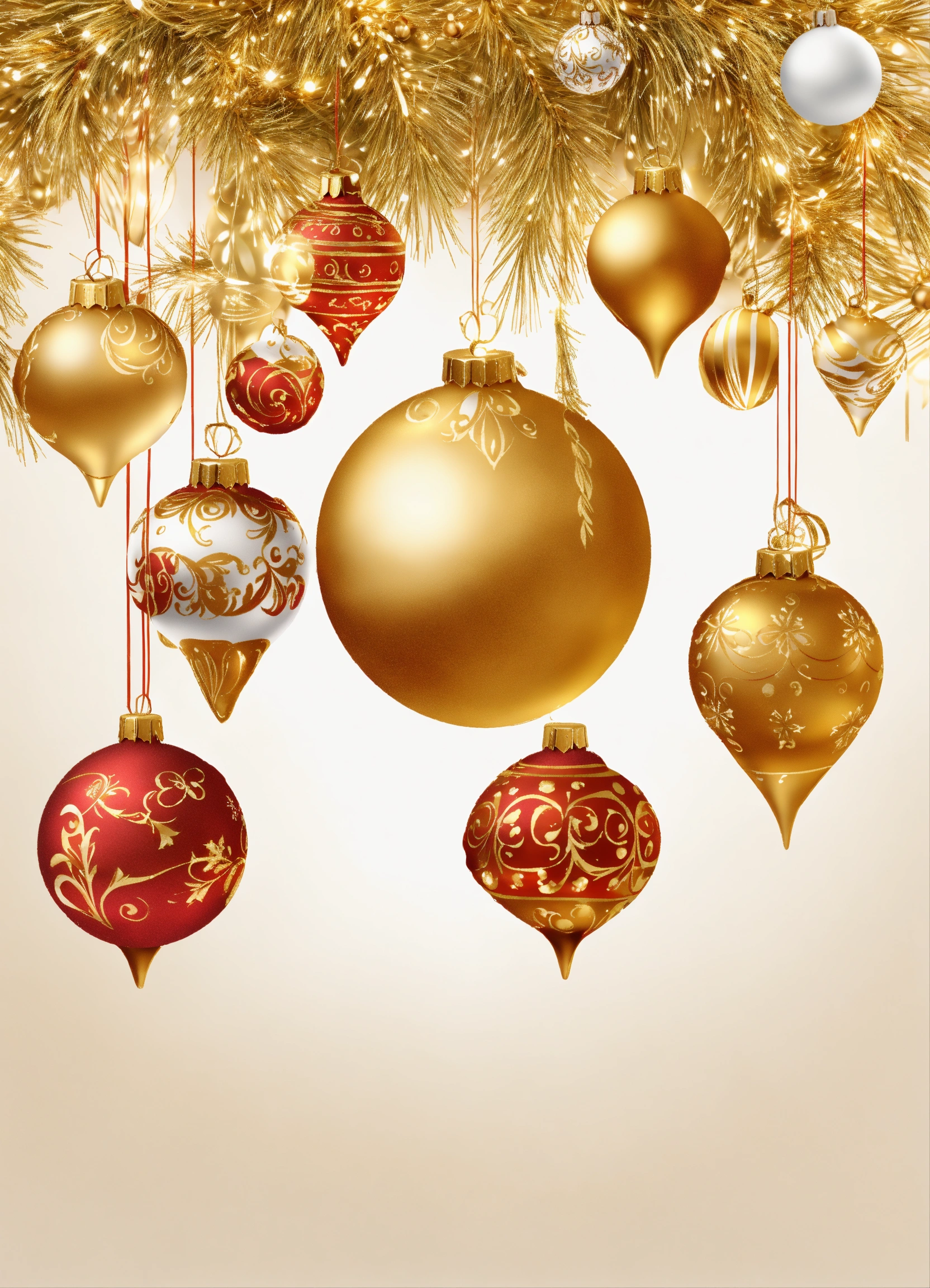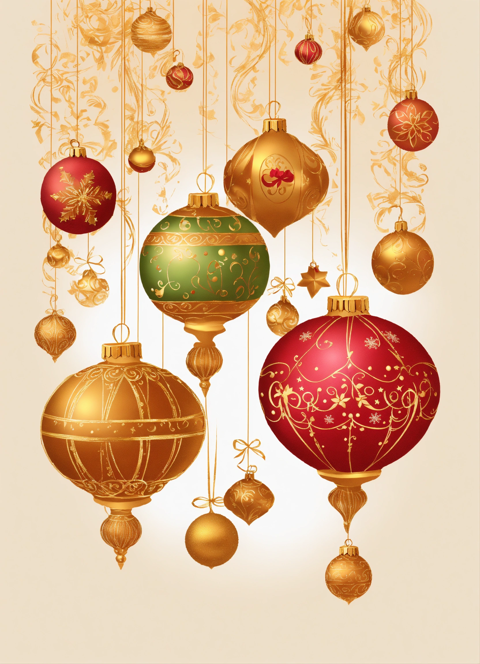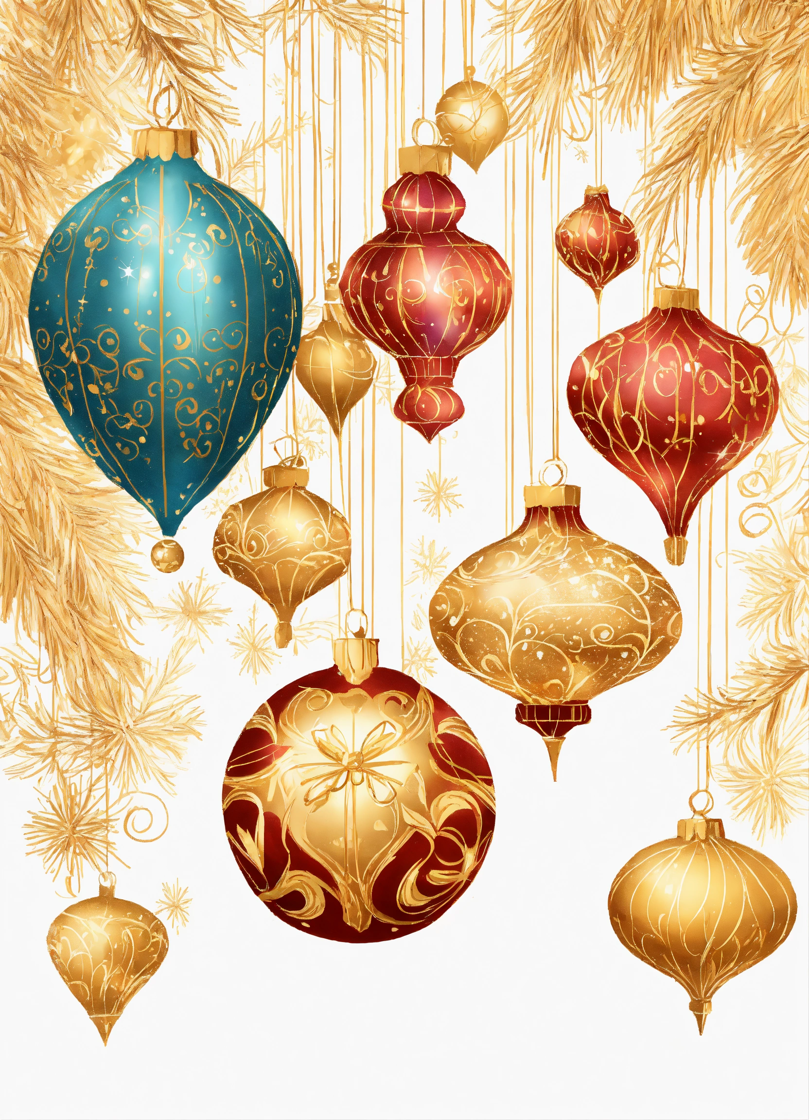 A drawing of beautiful christmas ornaments on a golden string on a white background