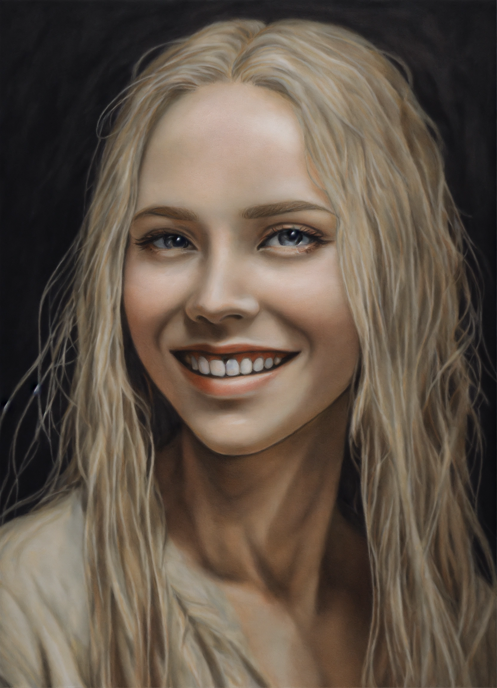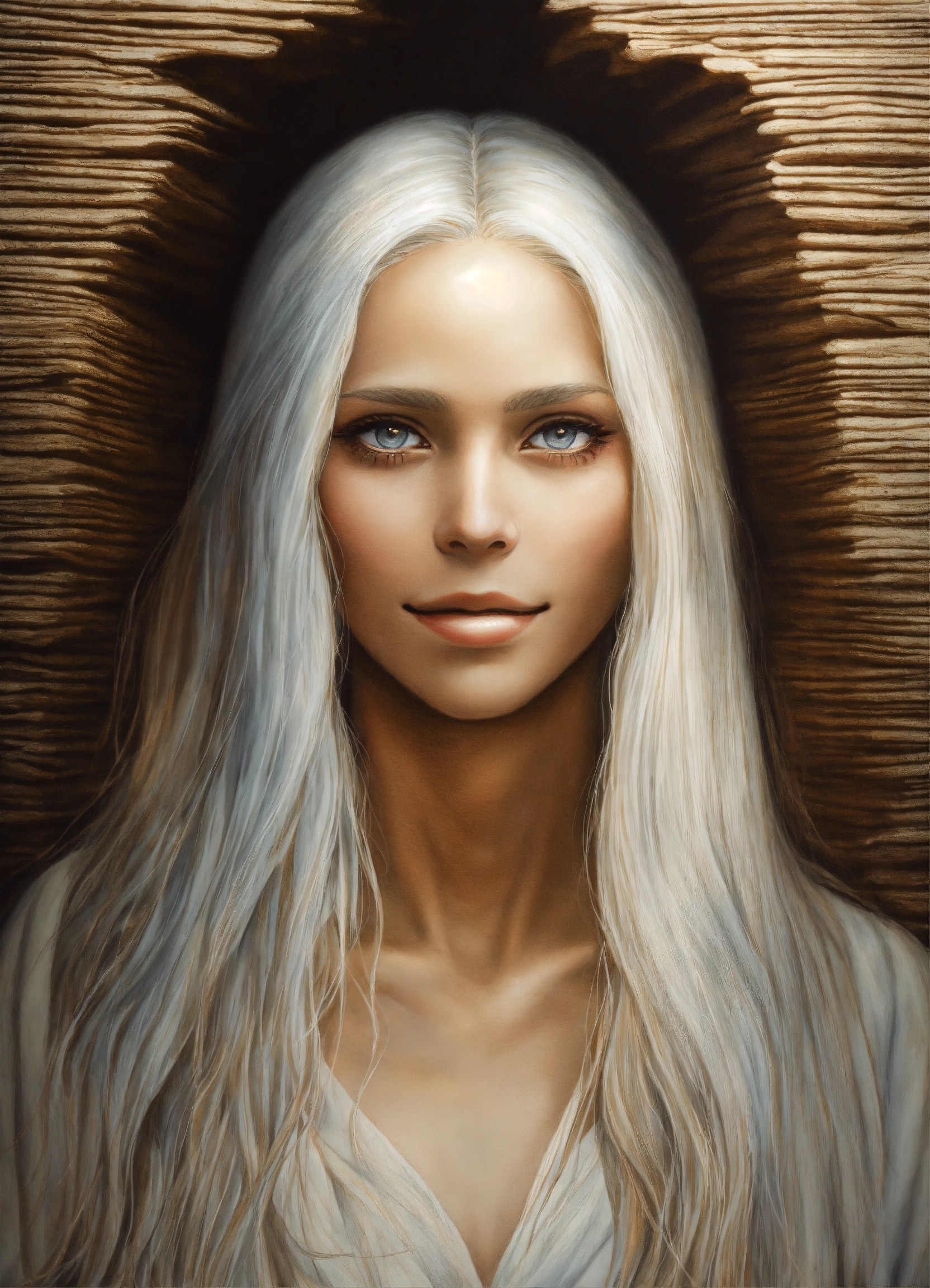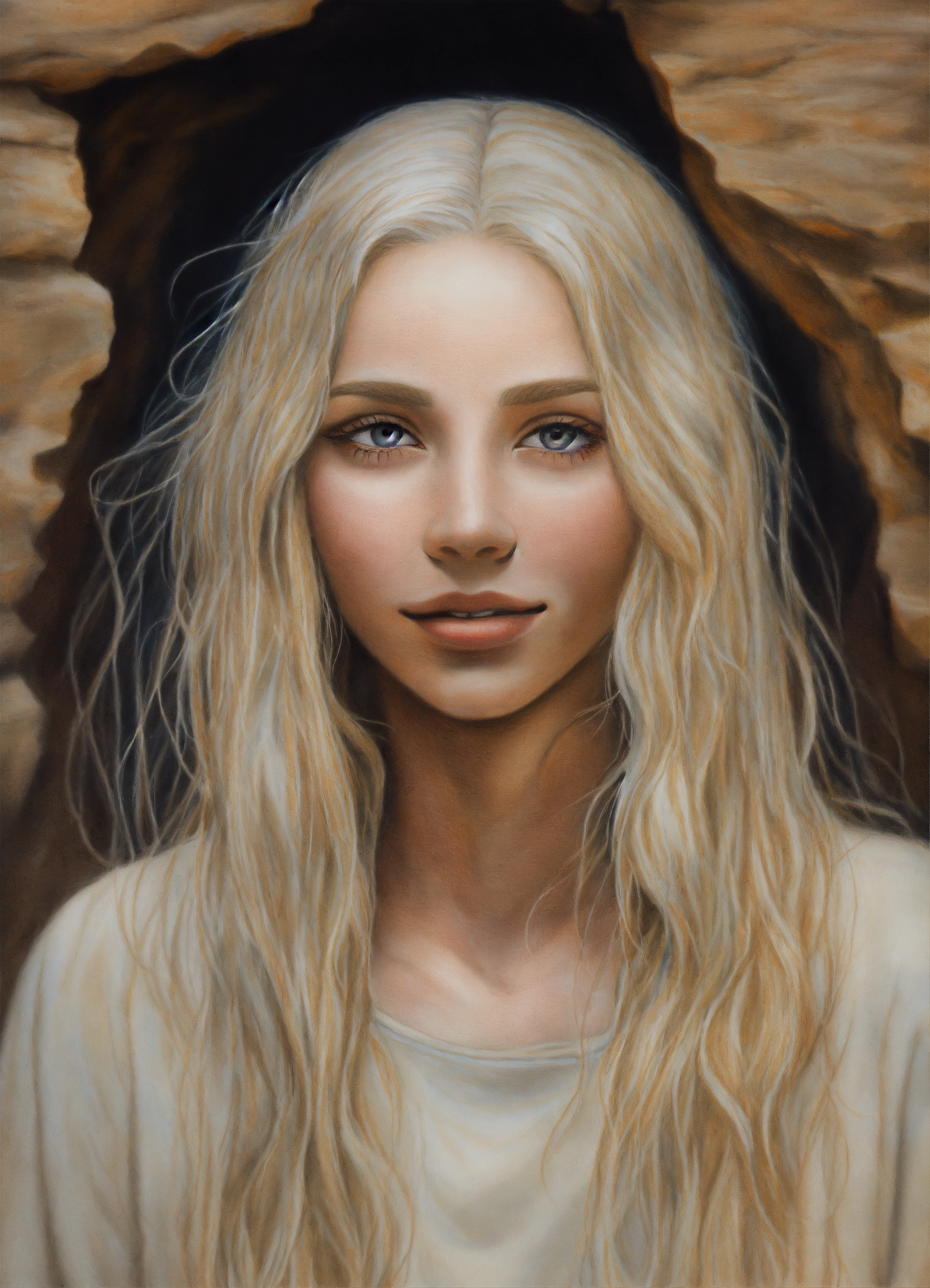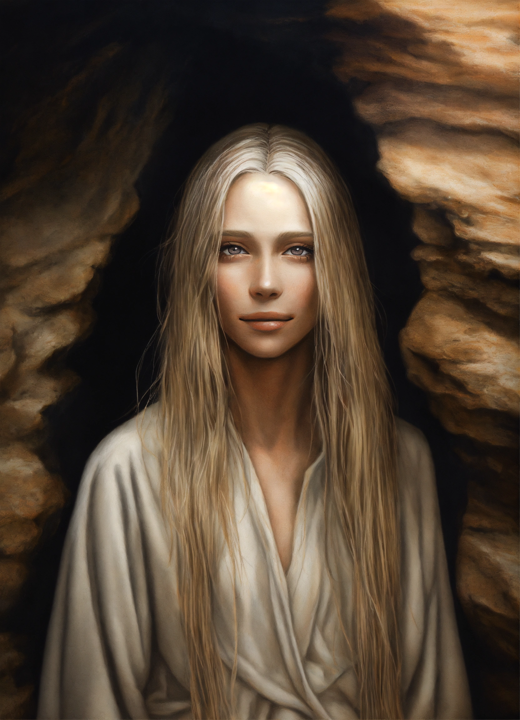 Realistic colored pencil drawing of a spiritual totally white eyes female humanoid, shiny extremely white skin, blind, loving, sad smile, extremely long hair, big mouth, wearing simple beige anscient clothes. dark cave background.