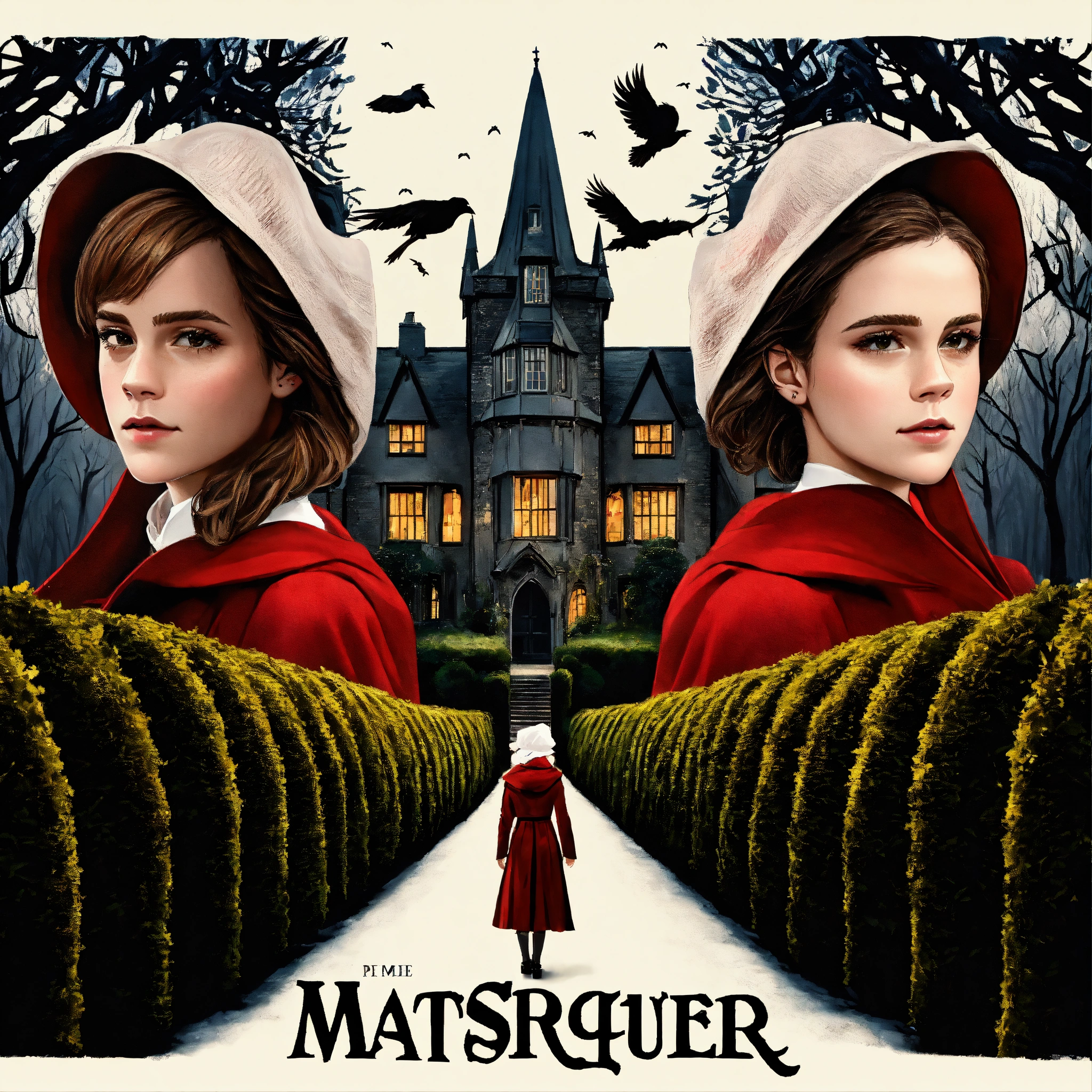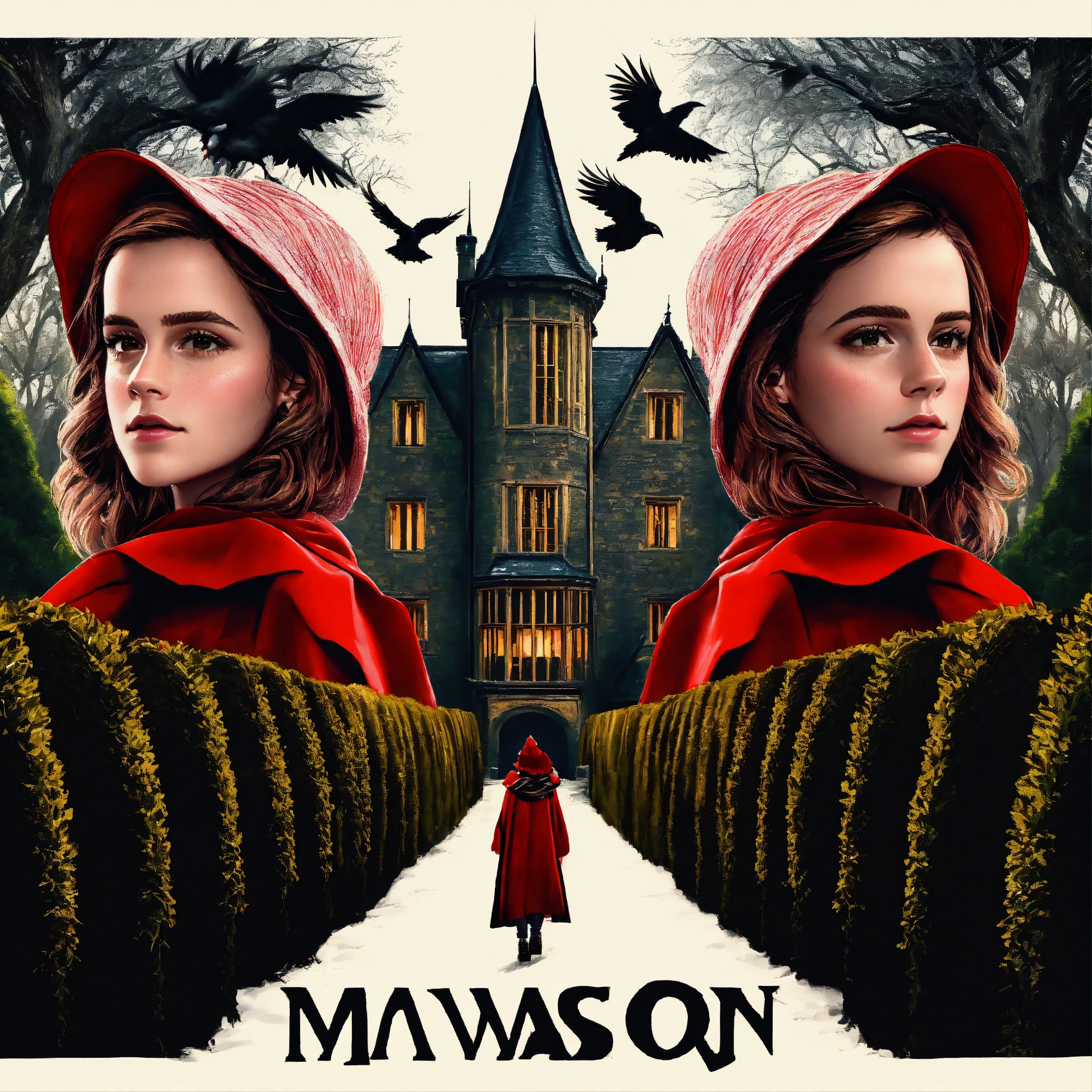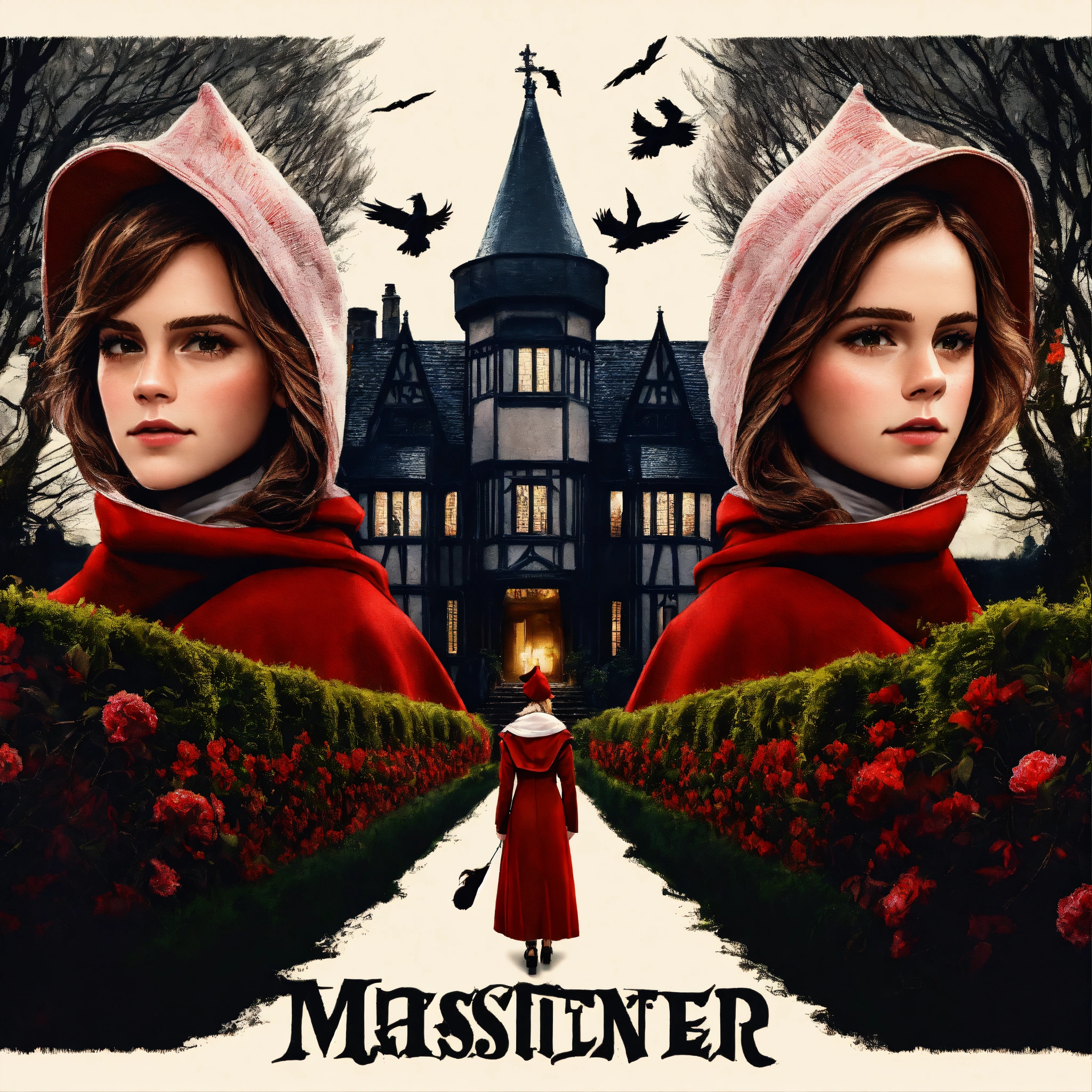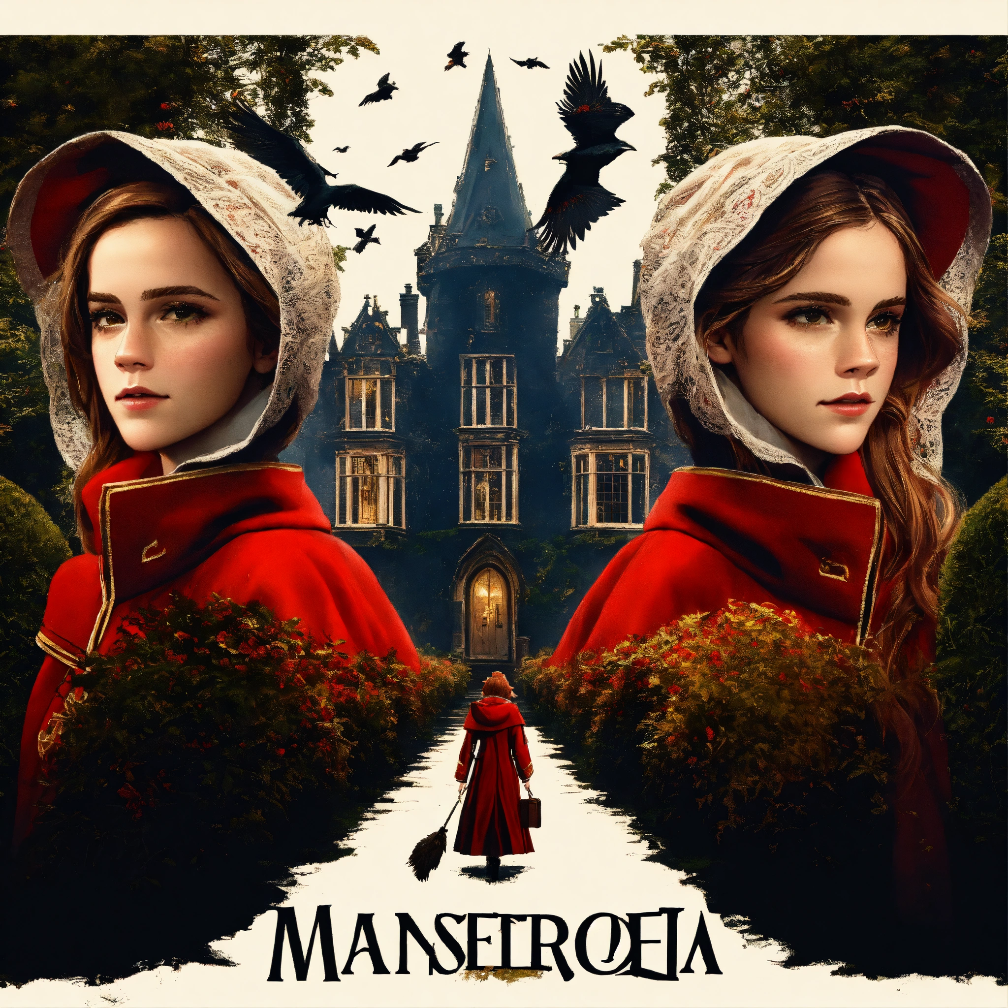 Masterpiece, highest quality, emma watson as hermione granger in a red cloak and white bonnet outside a gothic manor in the woods with parallel hedges and crows, 8k resolution. digital art, high quality, realistic.