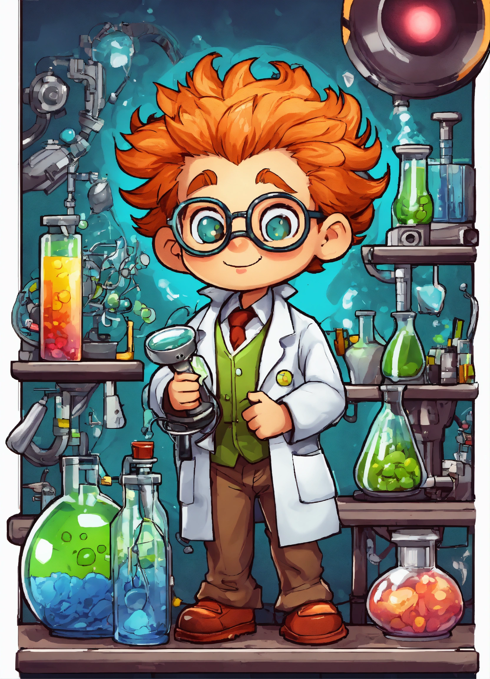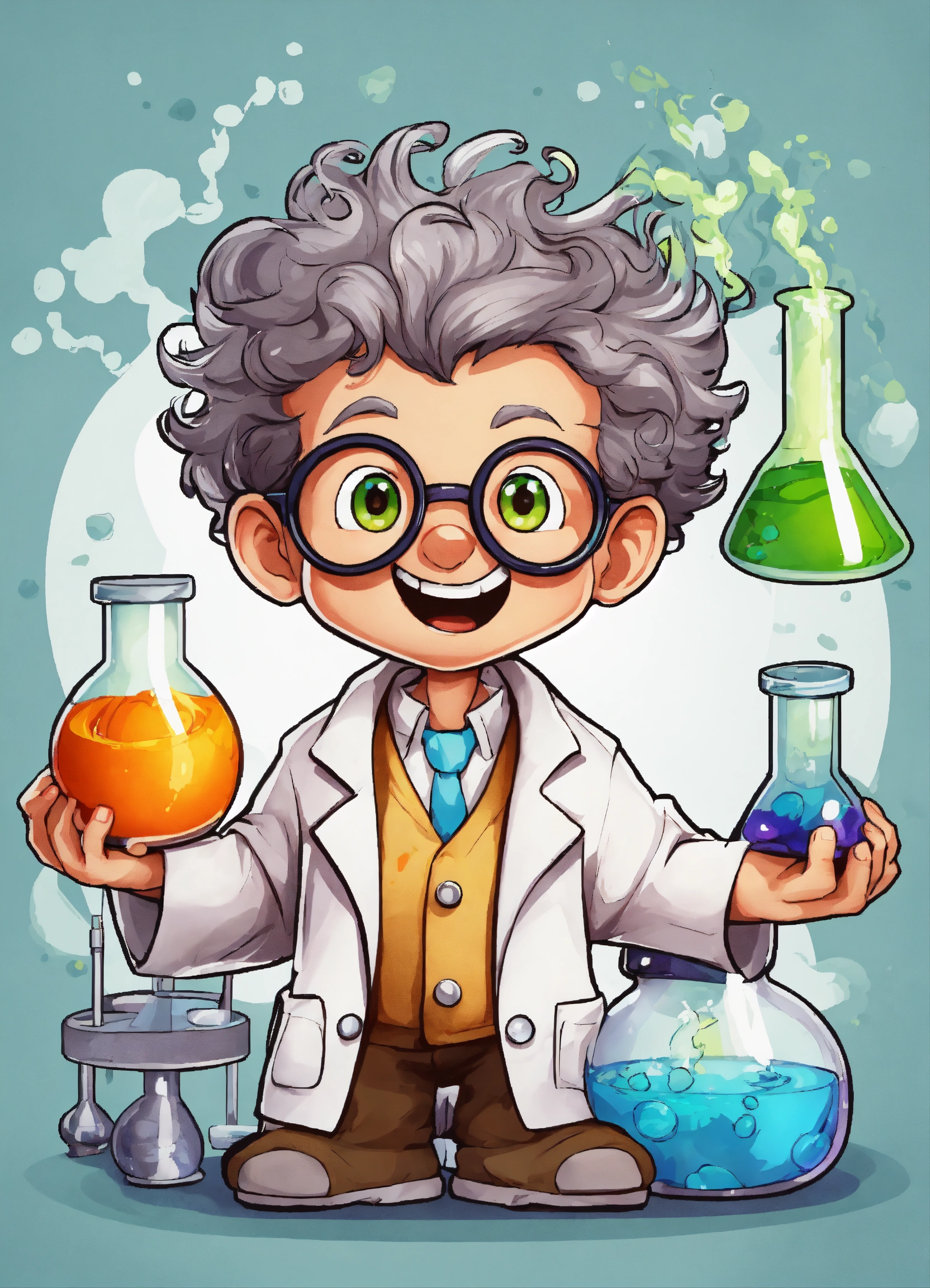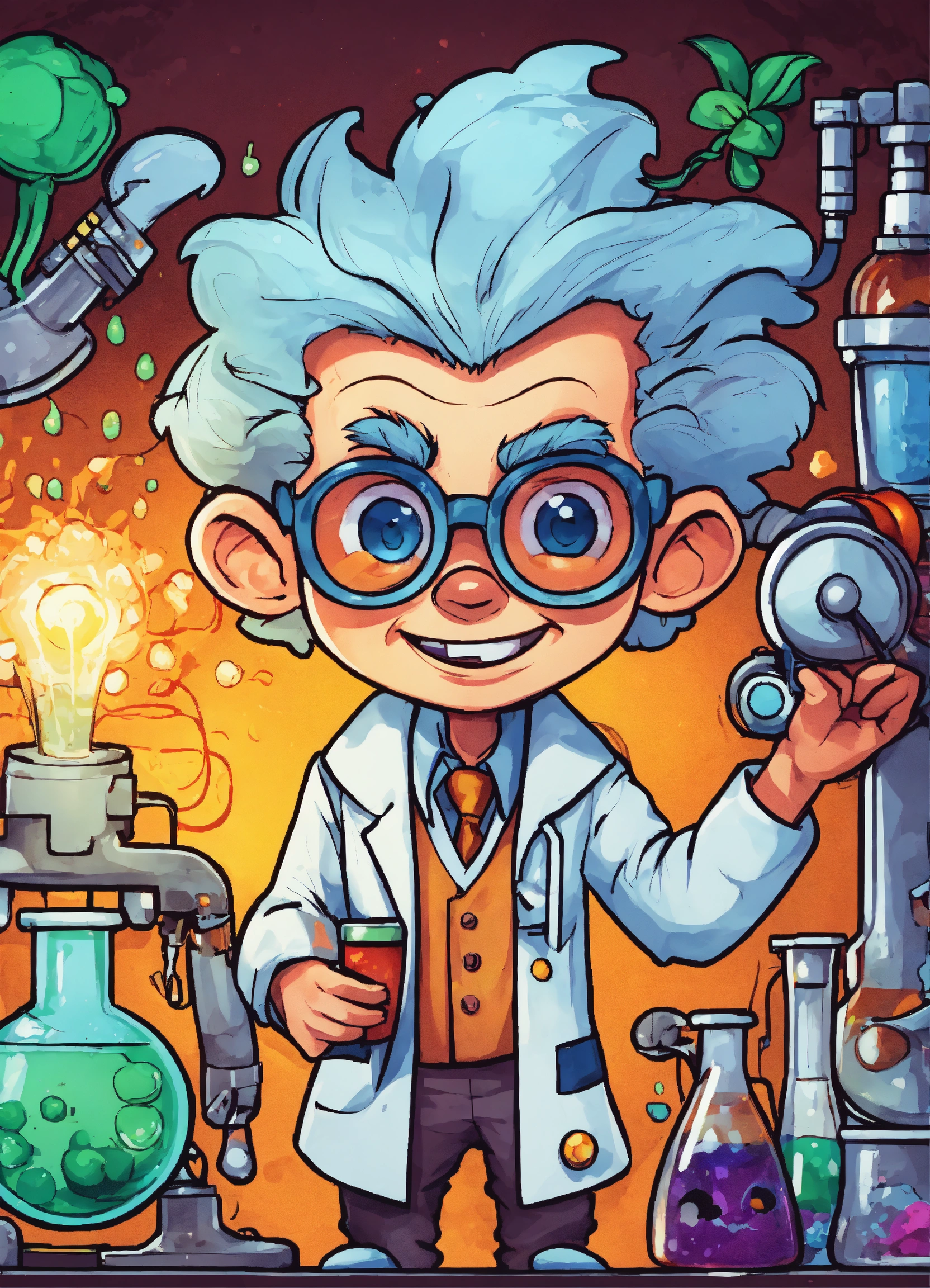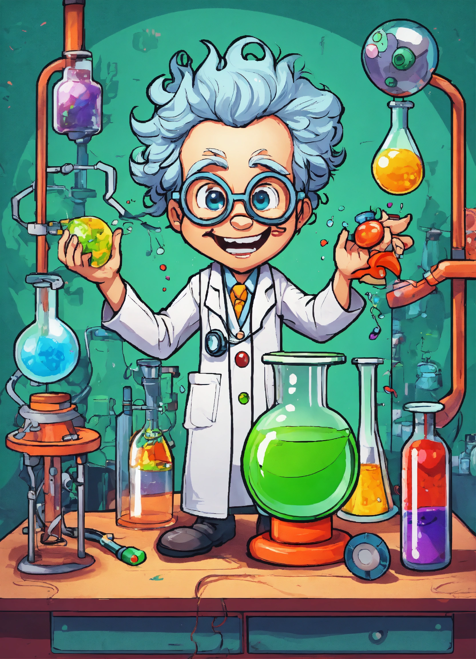 Generate a cute the mad scientist illustration, 4k resolution, cartoon-sticker style with clear lines on a pure white background suitable for a children's coloring book.