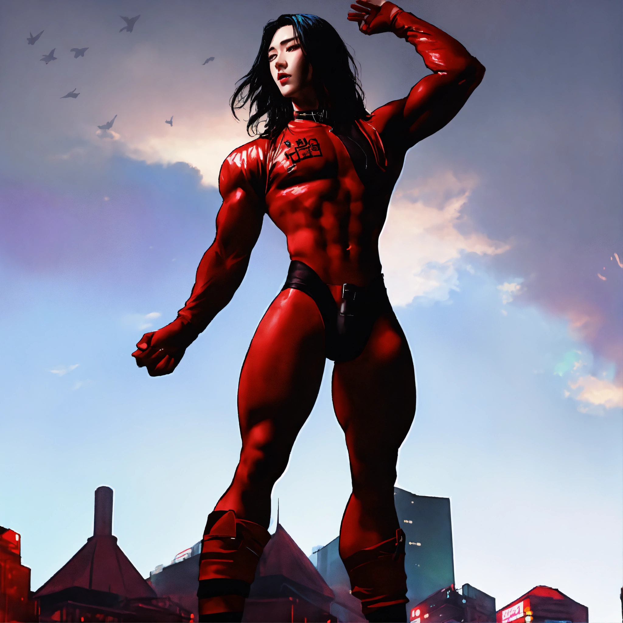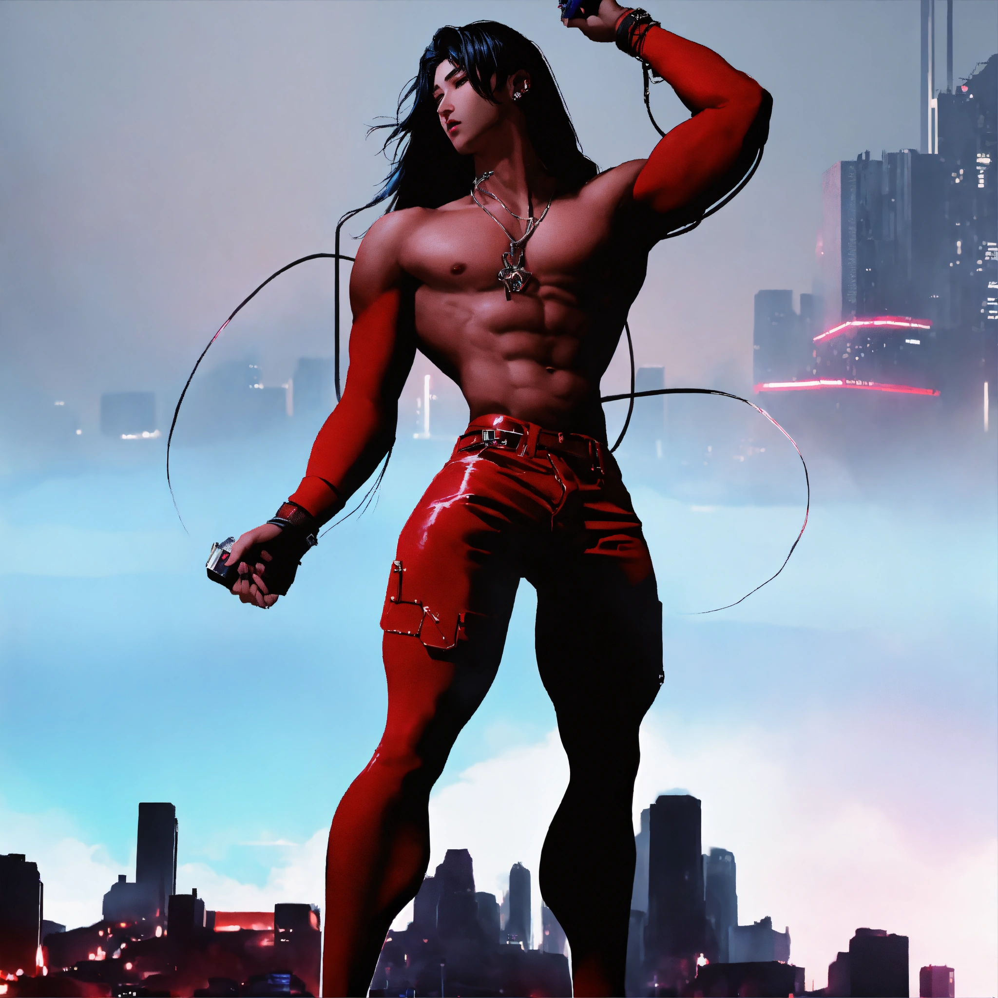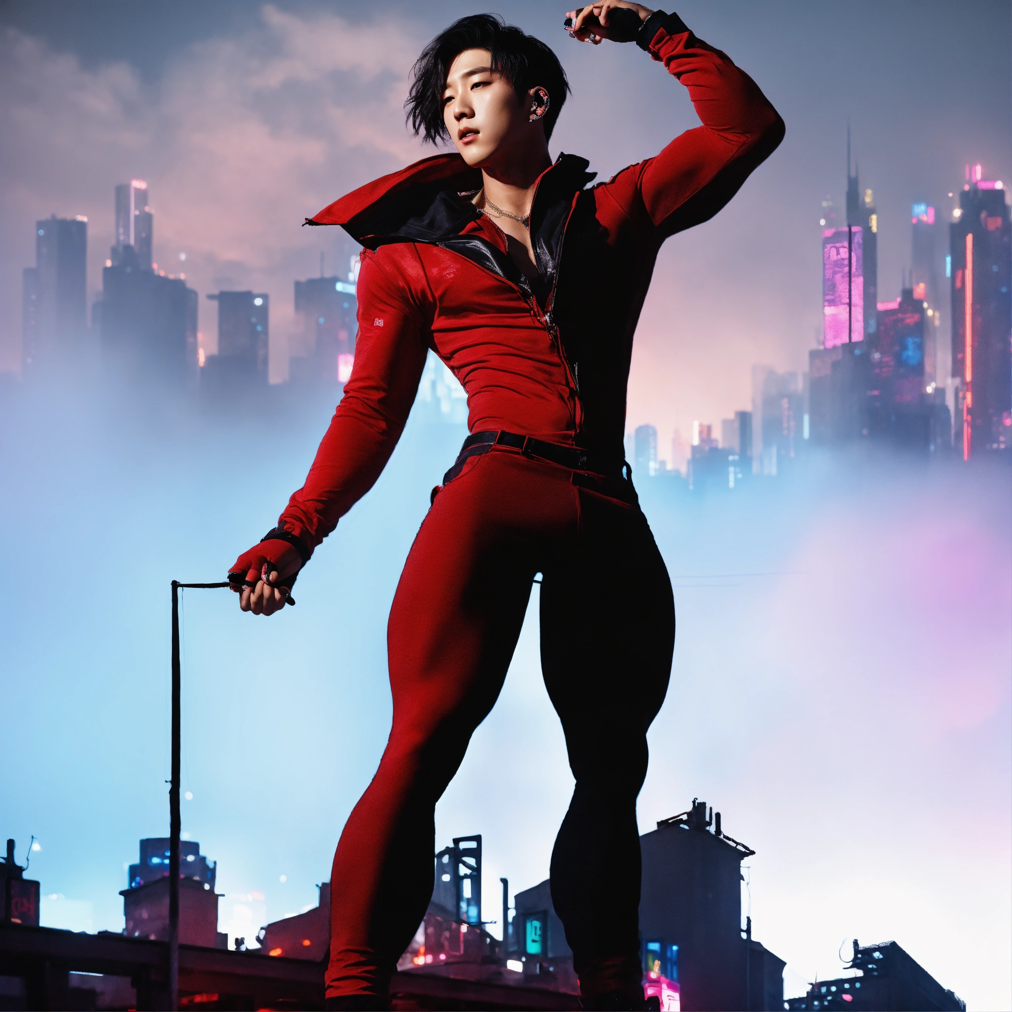 Pin-up poster of fit south korean pop idol wonho wearing a blank red t-shirt in a cyberpunk cityscape, dark fantasy steamy atmosphere, dramatic lighting, colorful neon