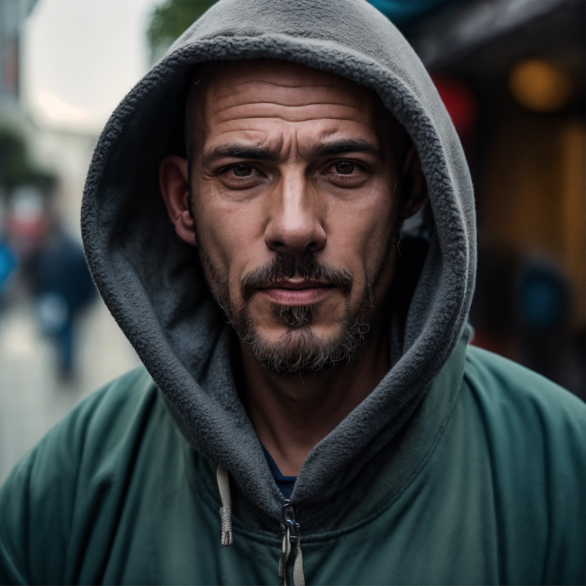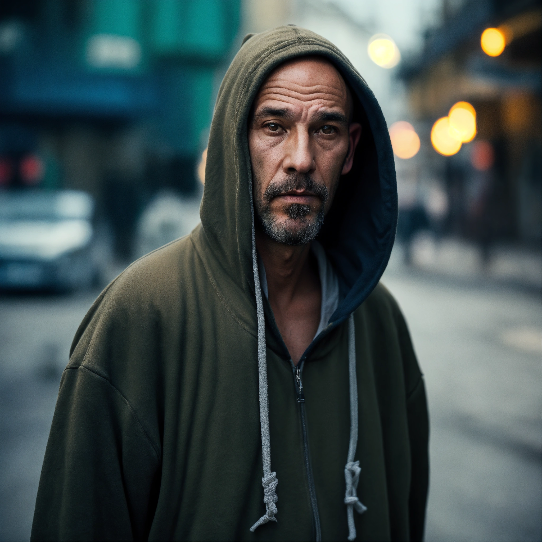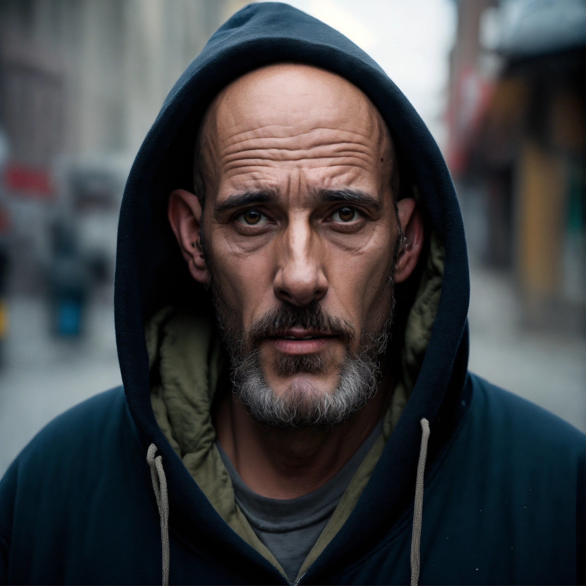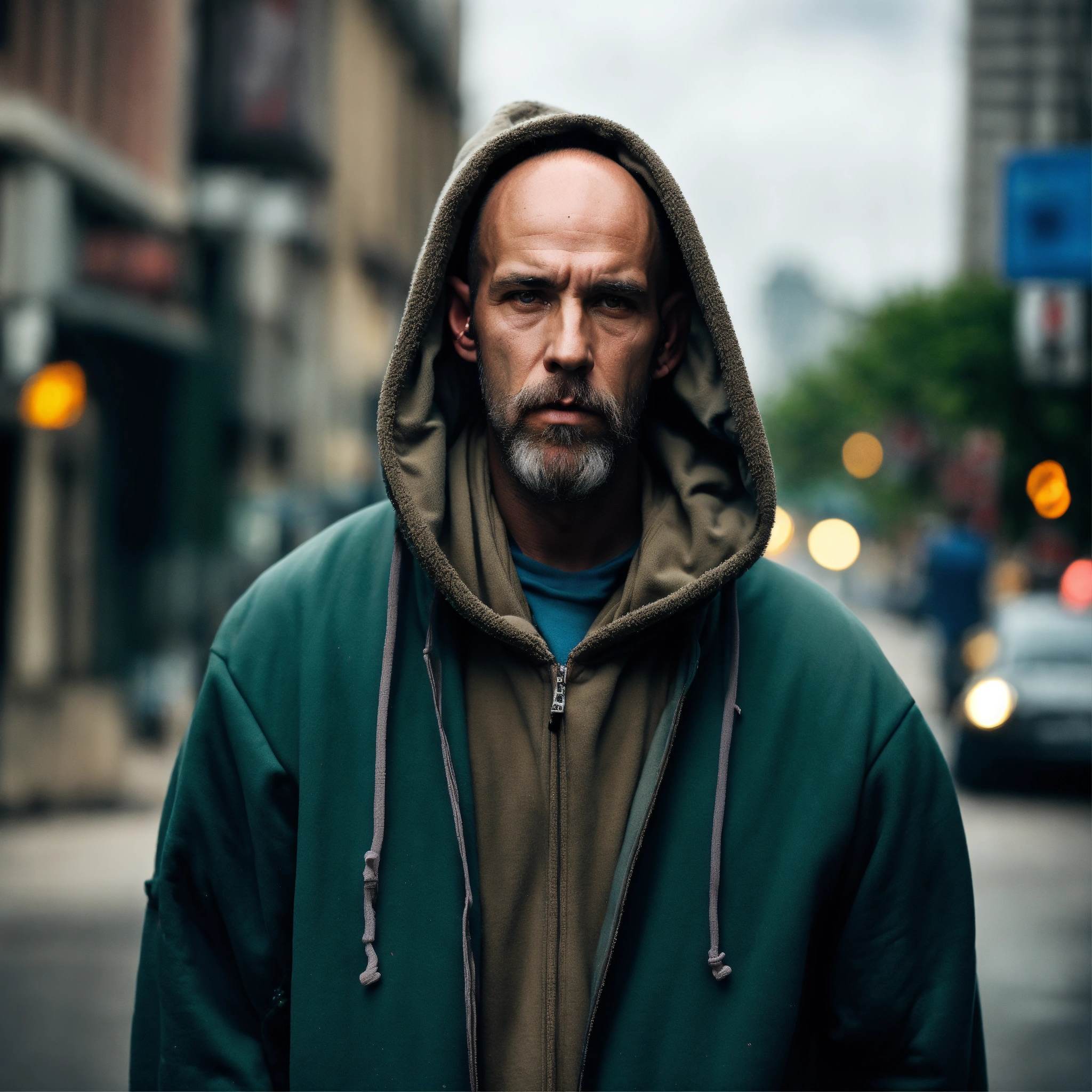 A huge homeless man with a huge lumpy bald head, a tiny goatee, protruding forehead, sunken silver eyes, crooked mouth, large ears, wearing a hoodie up over his head, standing in the street