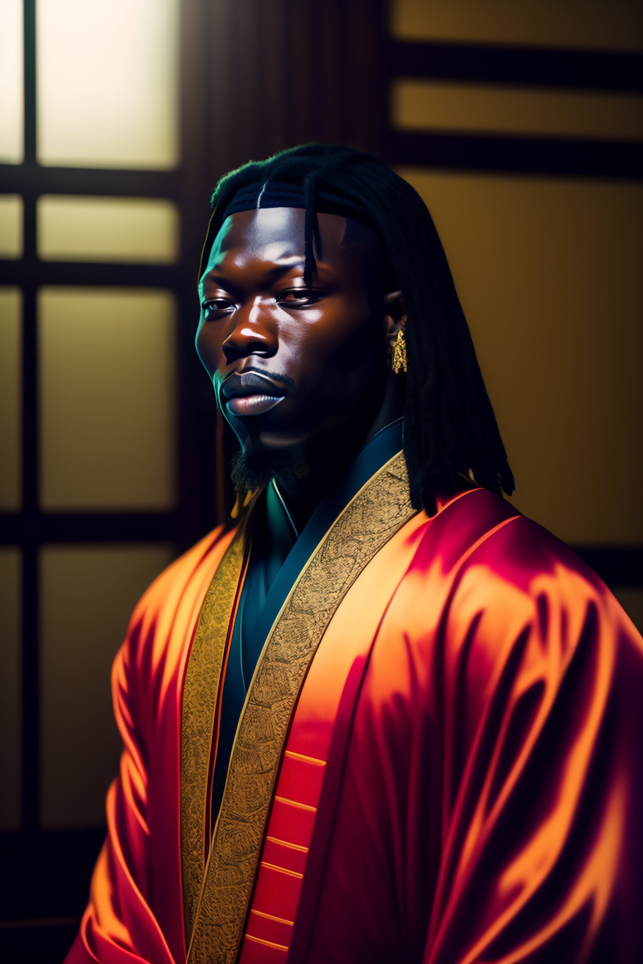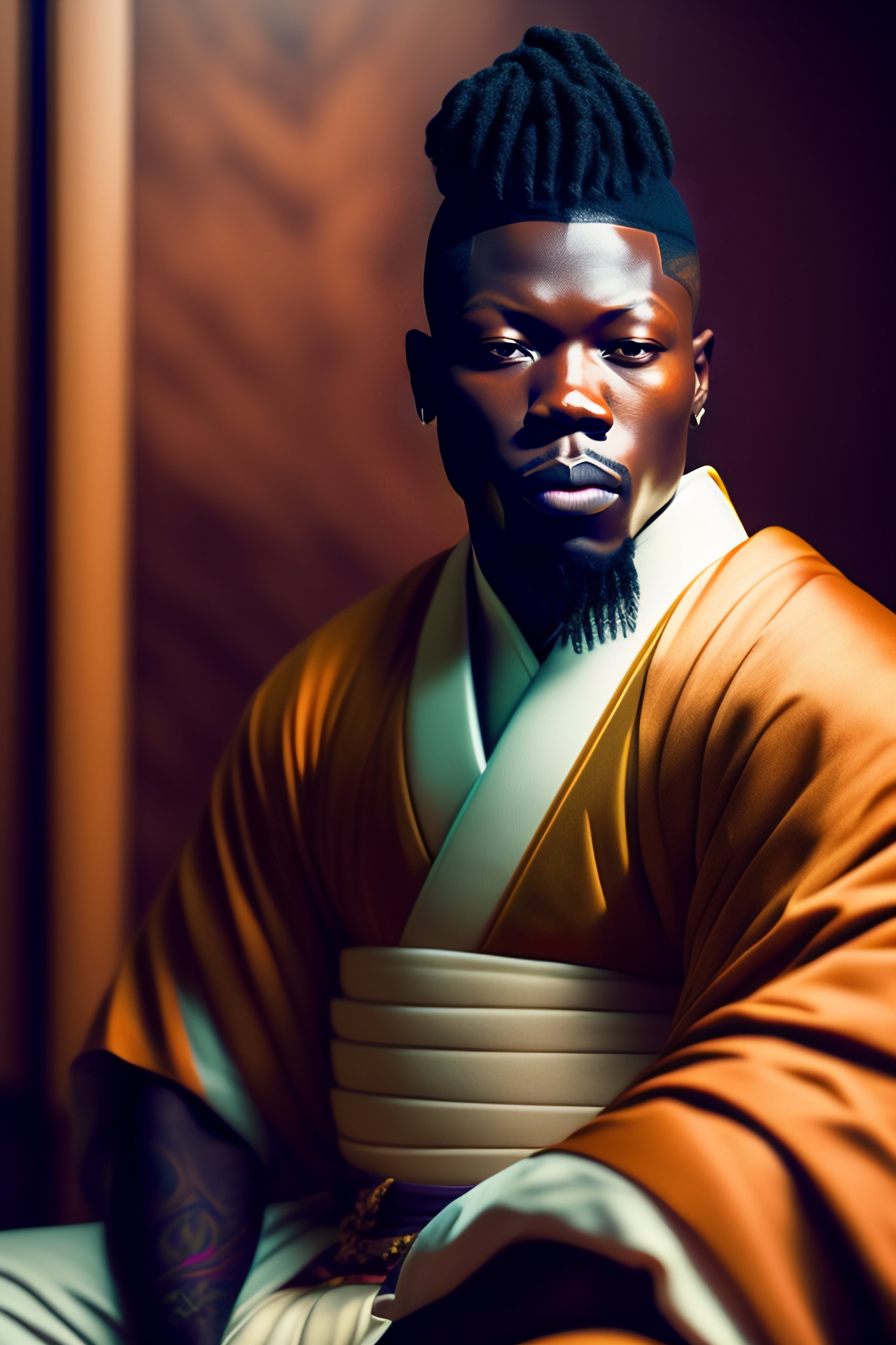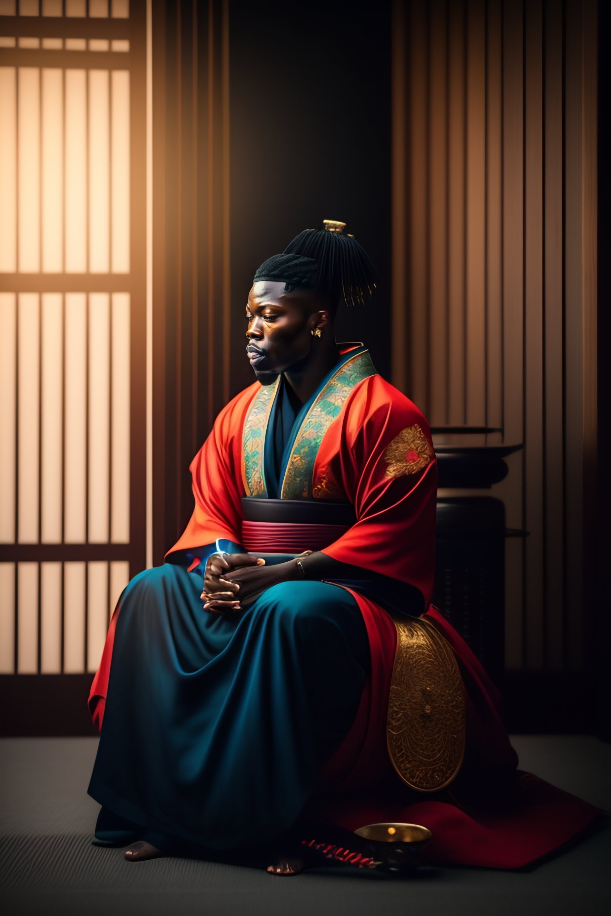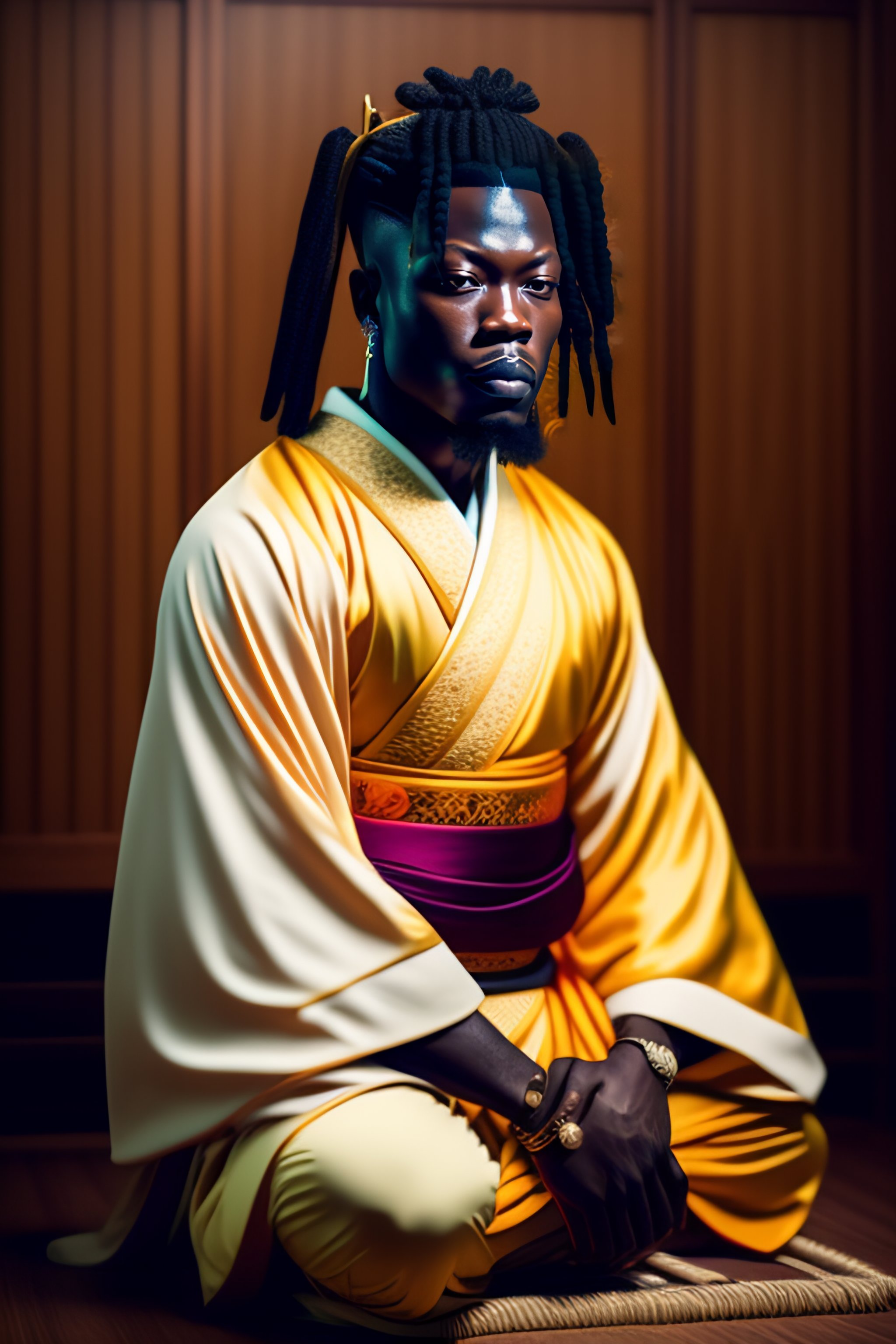 Portrait of stonebwoy dressed as a samurai meditating in dojo