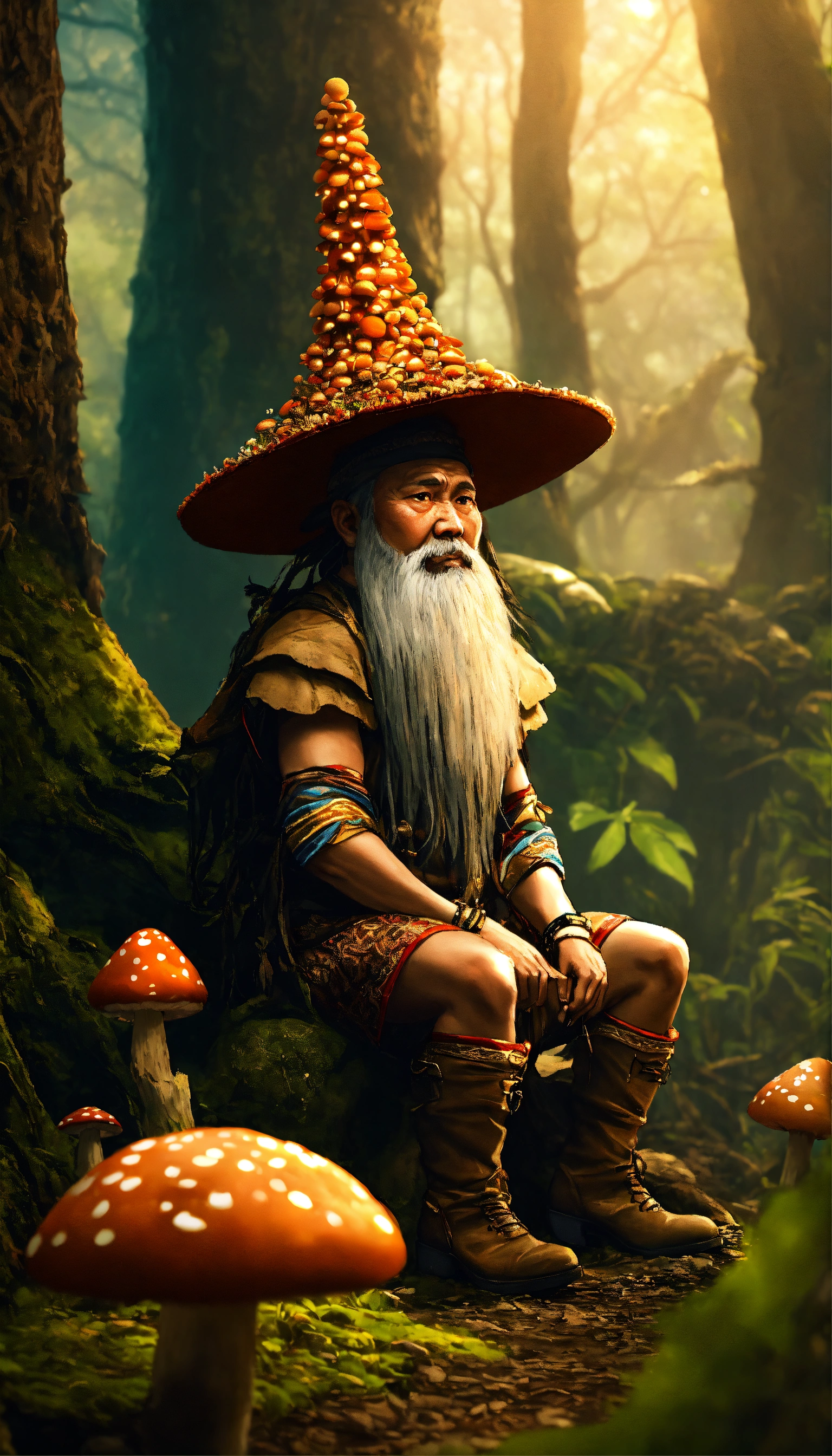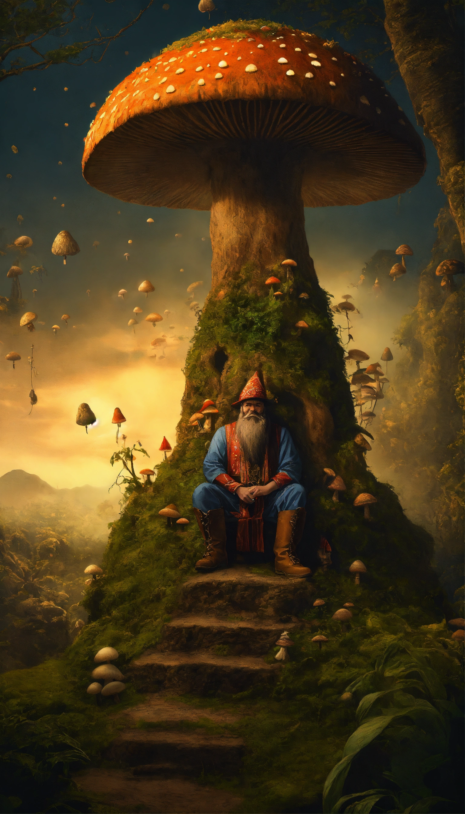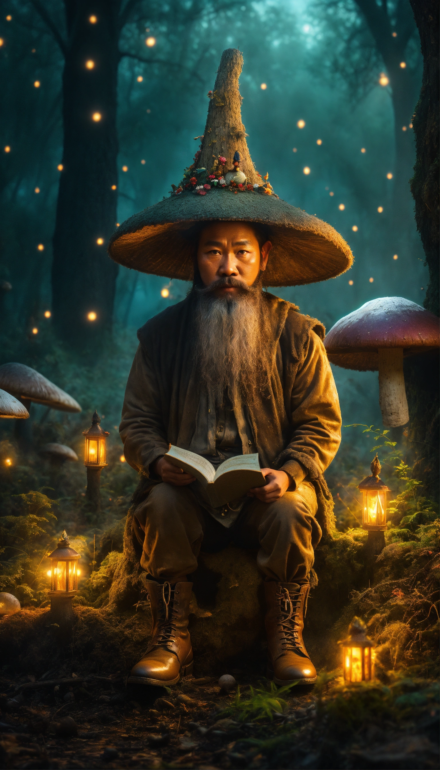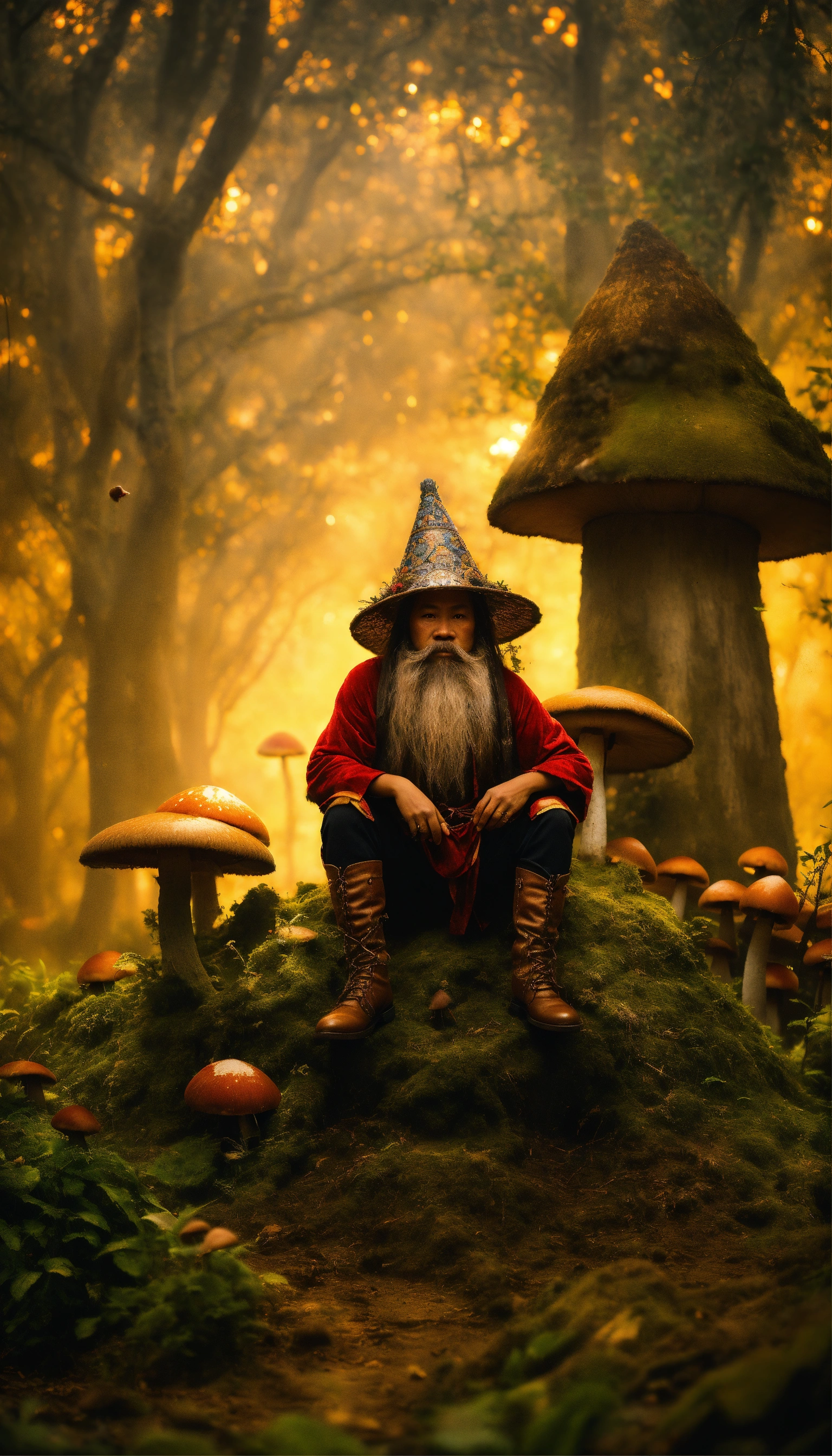 Scary philippines duwende, nuno sa punso, tiny dwarf being with long beard, wearing a salukot hat, wearing pointed boots, sitting by a termite mound, with big mushrooms surrounded the place, night light, foggy weather, intricate, fantasy, with orbs of light, with fairy's on background, trees, and other mythical creature from philippines, cinematic