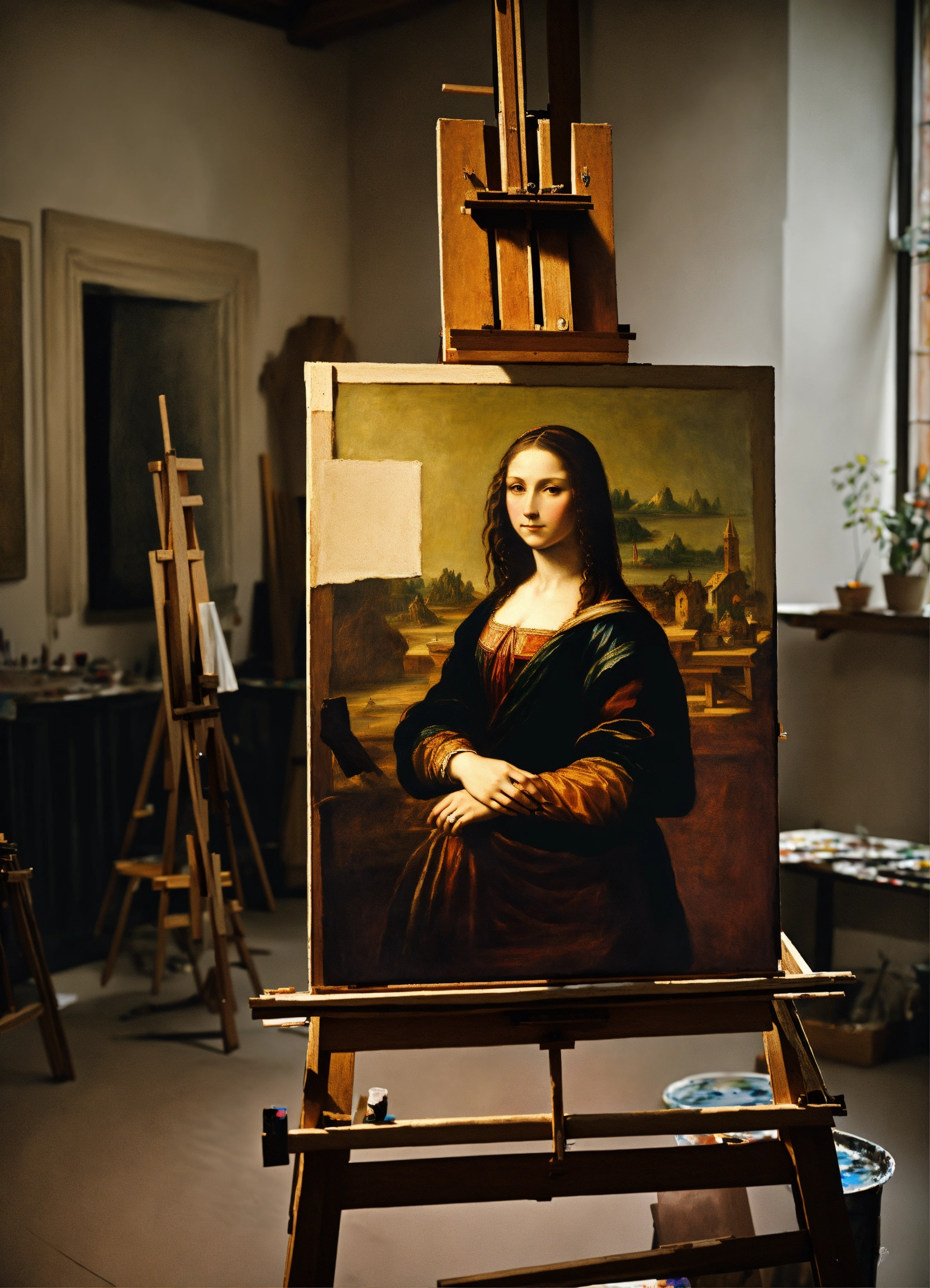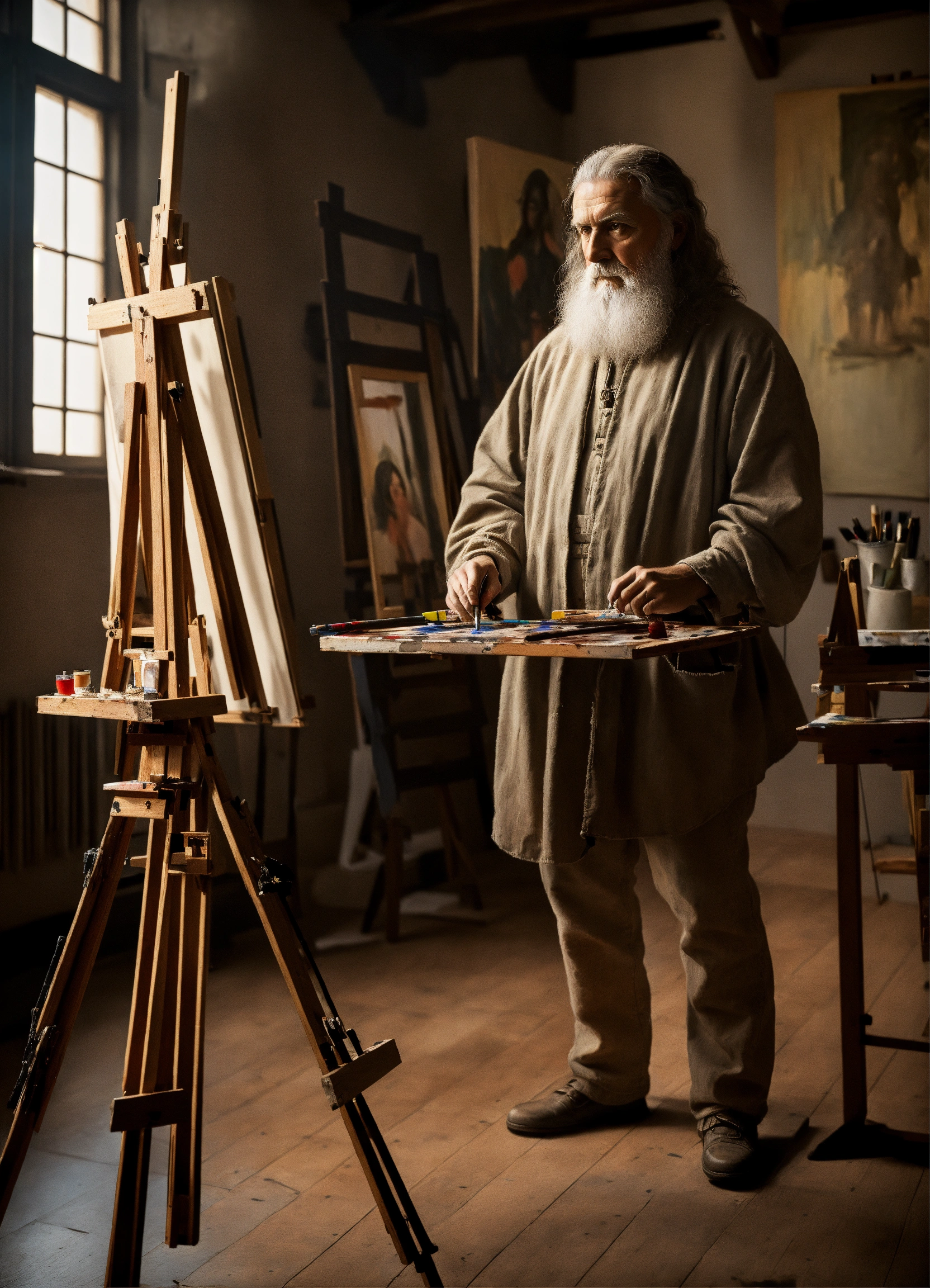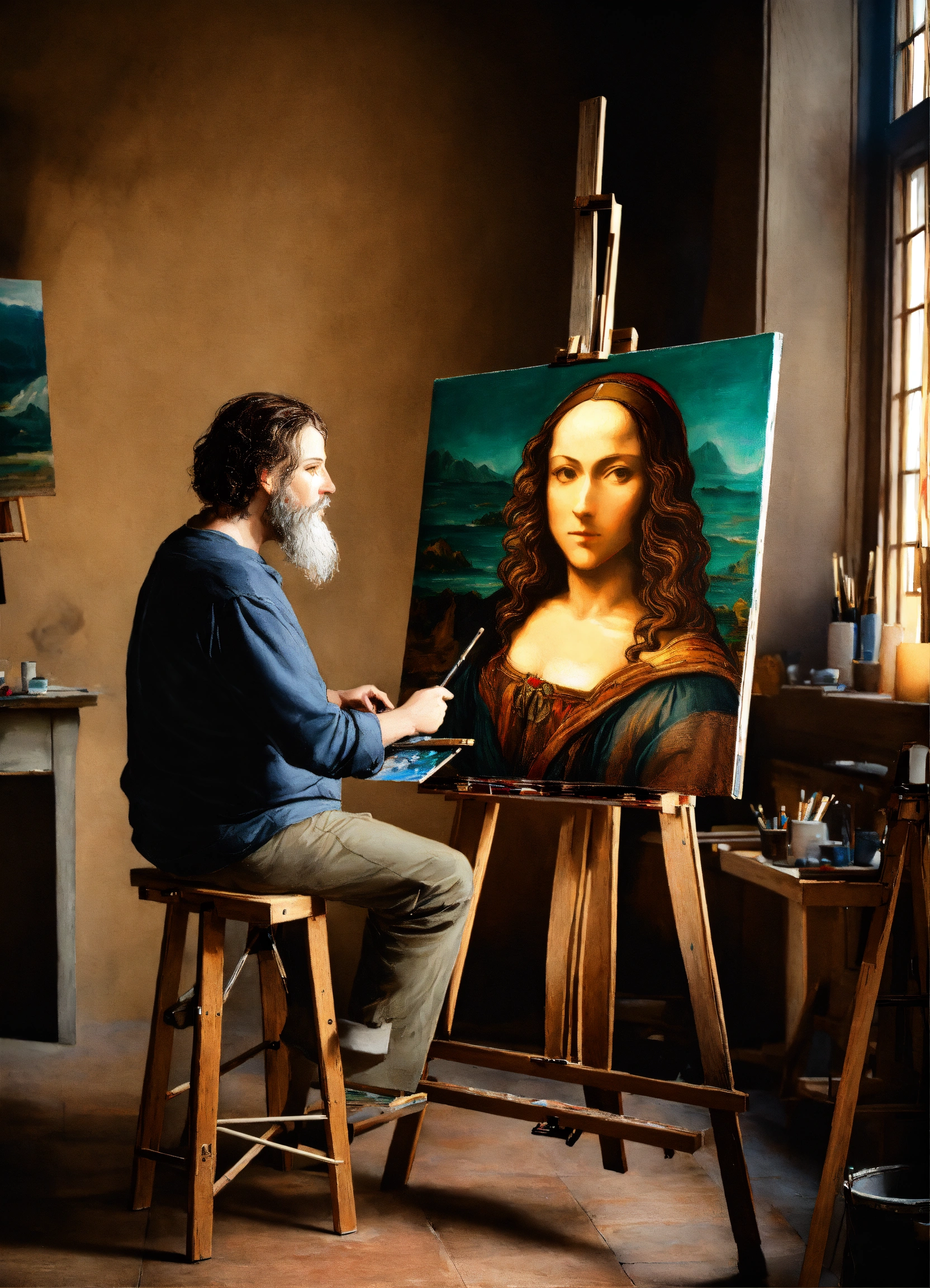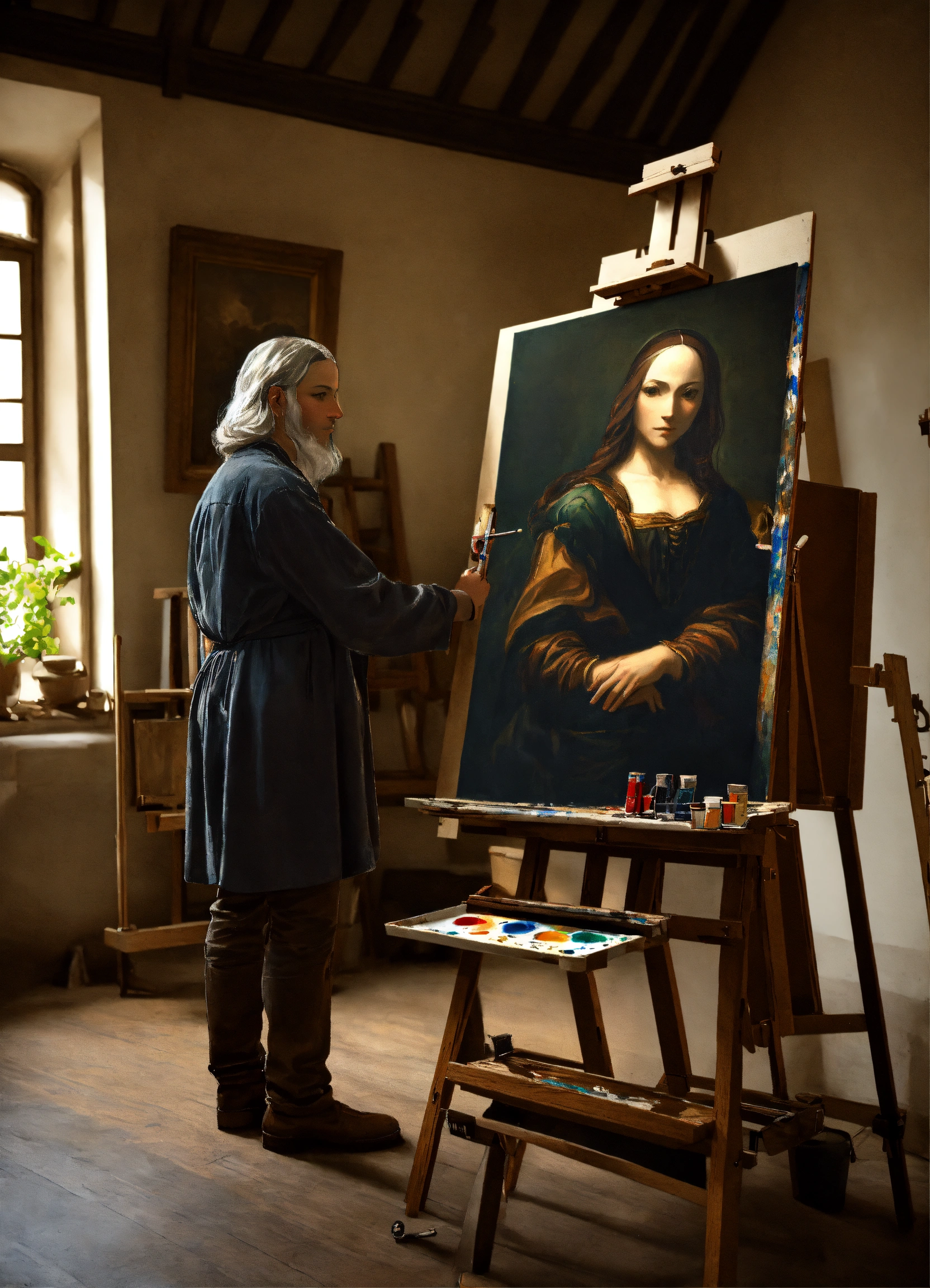 Extremely realistic photograph of da vinci who paints a portrait with monochromatic shades, in a florentine art studio, using an easel.
