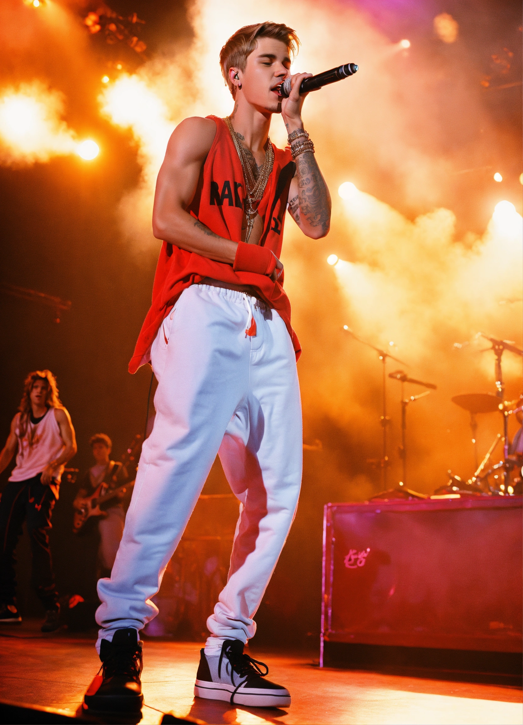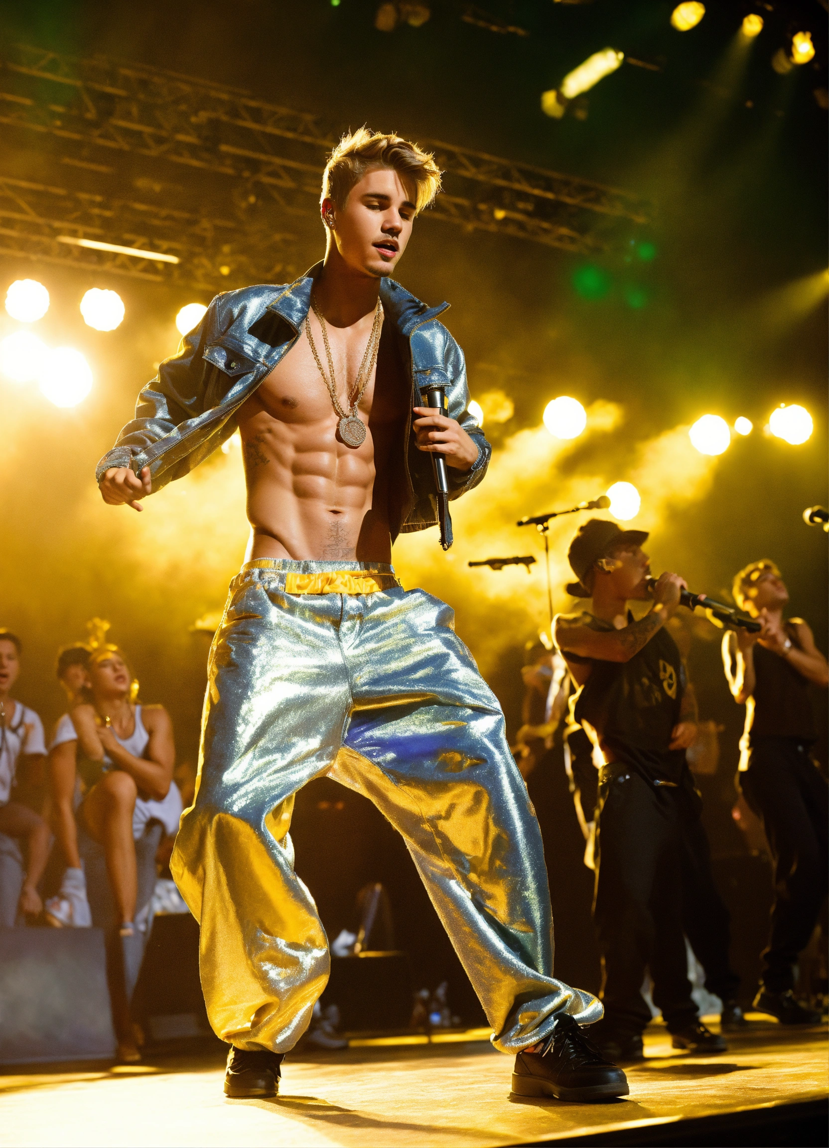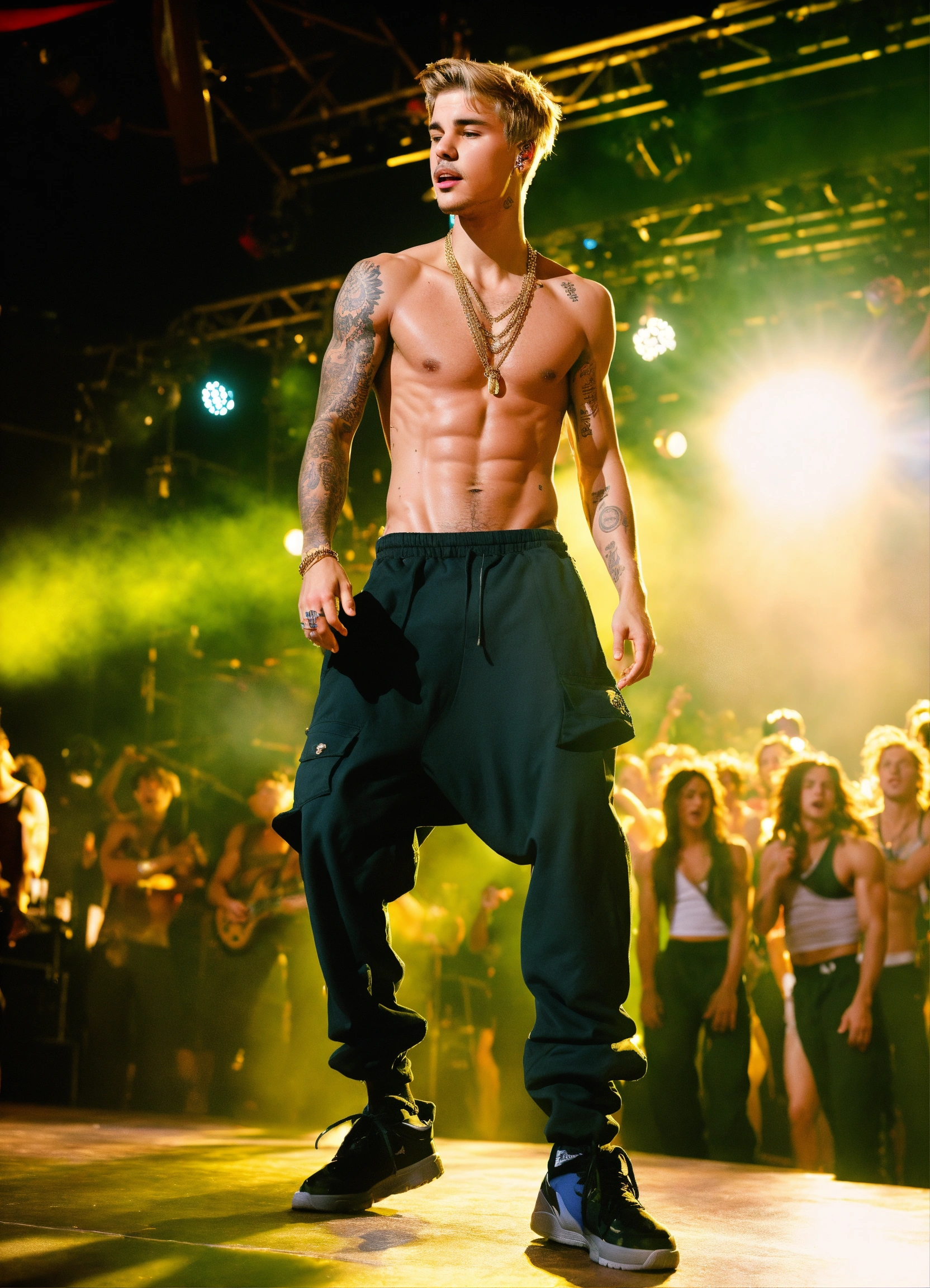 An impressive realistic photo of bieber performing on stage in baggy pants, toned physique, sweating, sunny, warm day, photographed by bruce weber