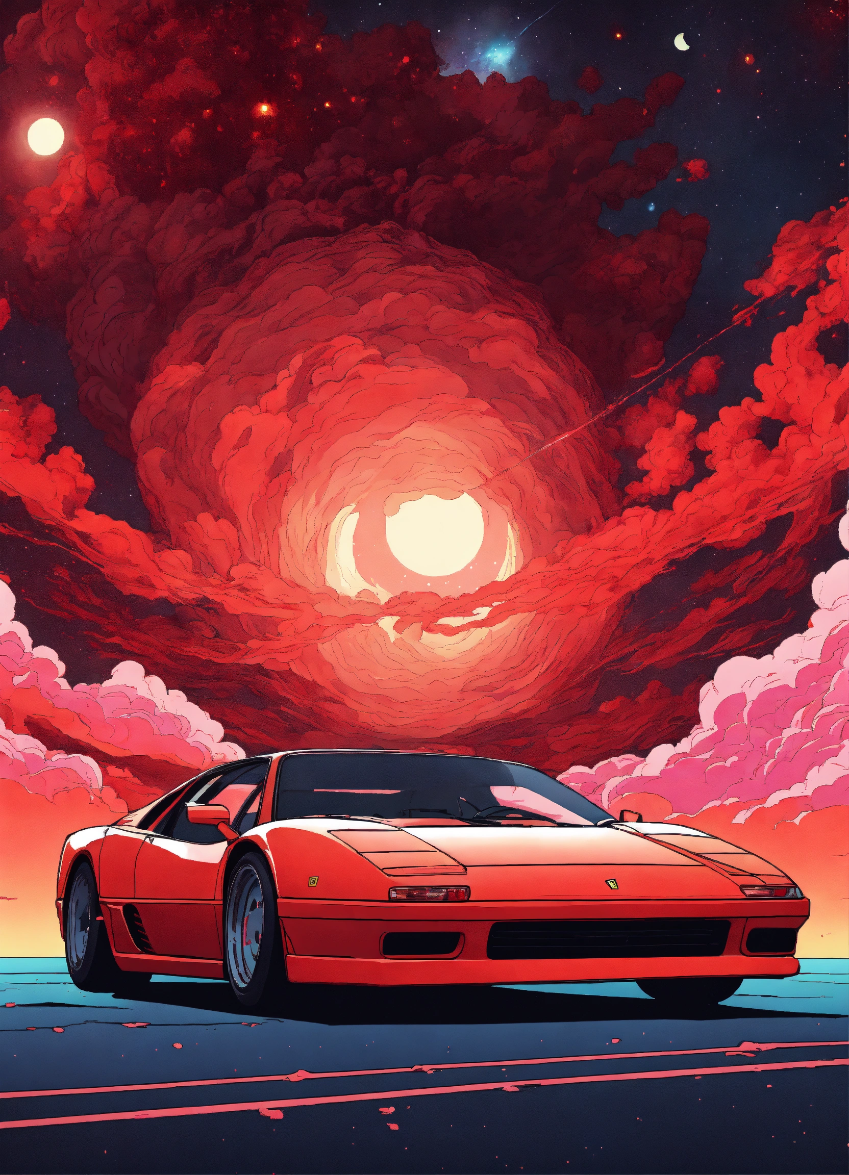 A red ferrari, the style of 90's vintage anime, surrealism, akira style. detailed line art. fine details. inside an exploding nebula, solid lines, vibrant colors, surreal lunar style. vintage anime (nostaliga-core), lofi cozy
