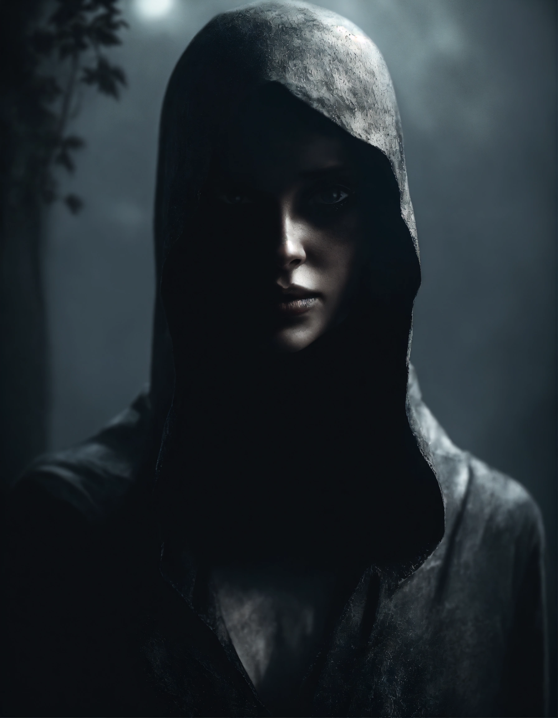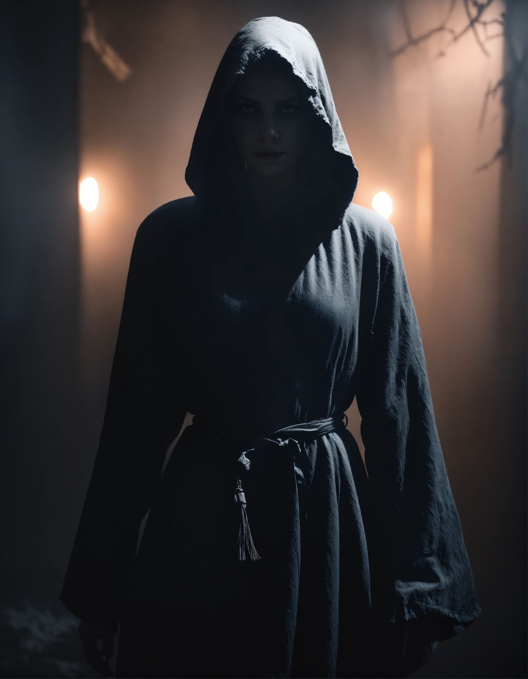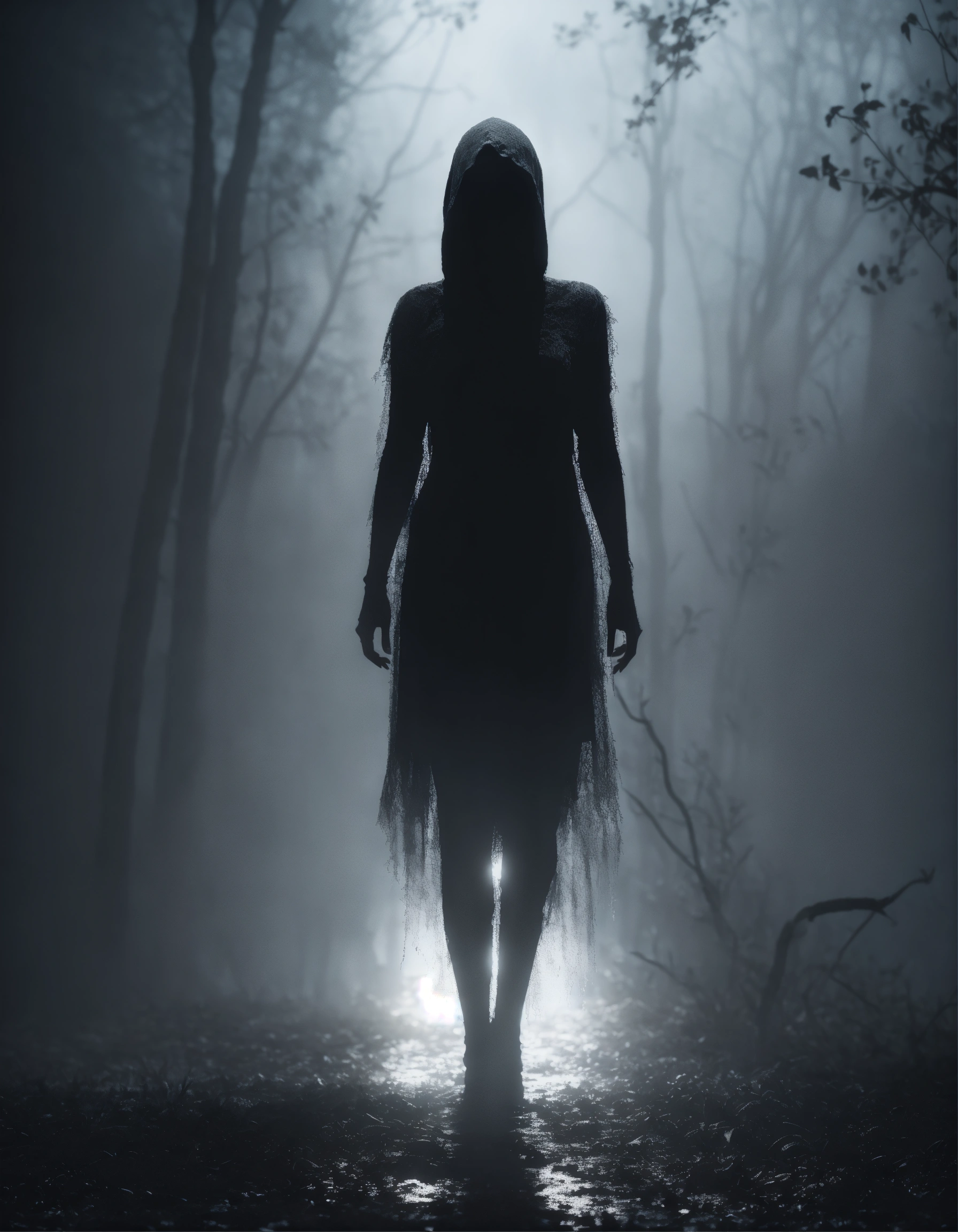 Demonic spooky shadow figure woman emerging from the darkness, black and grey gradient, foggy, realistic, 8k, unreal engine, cinematic