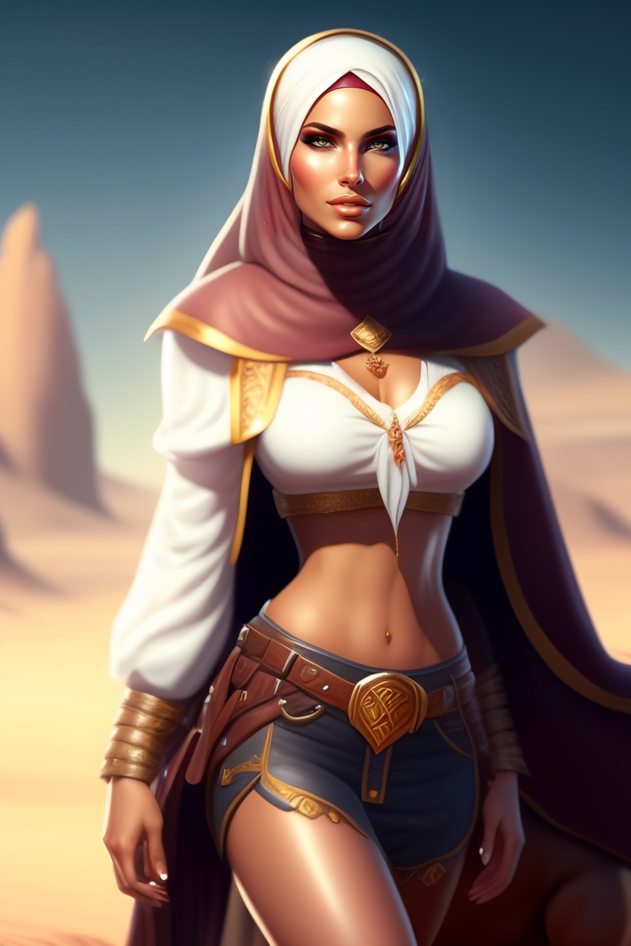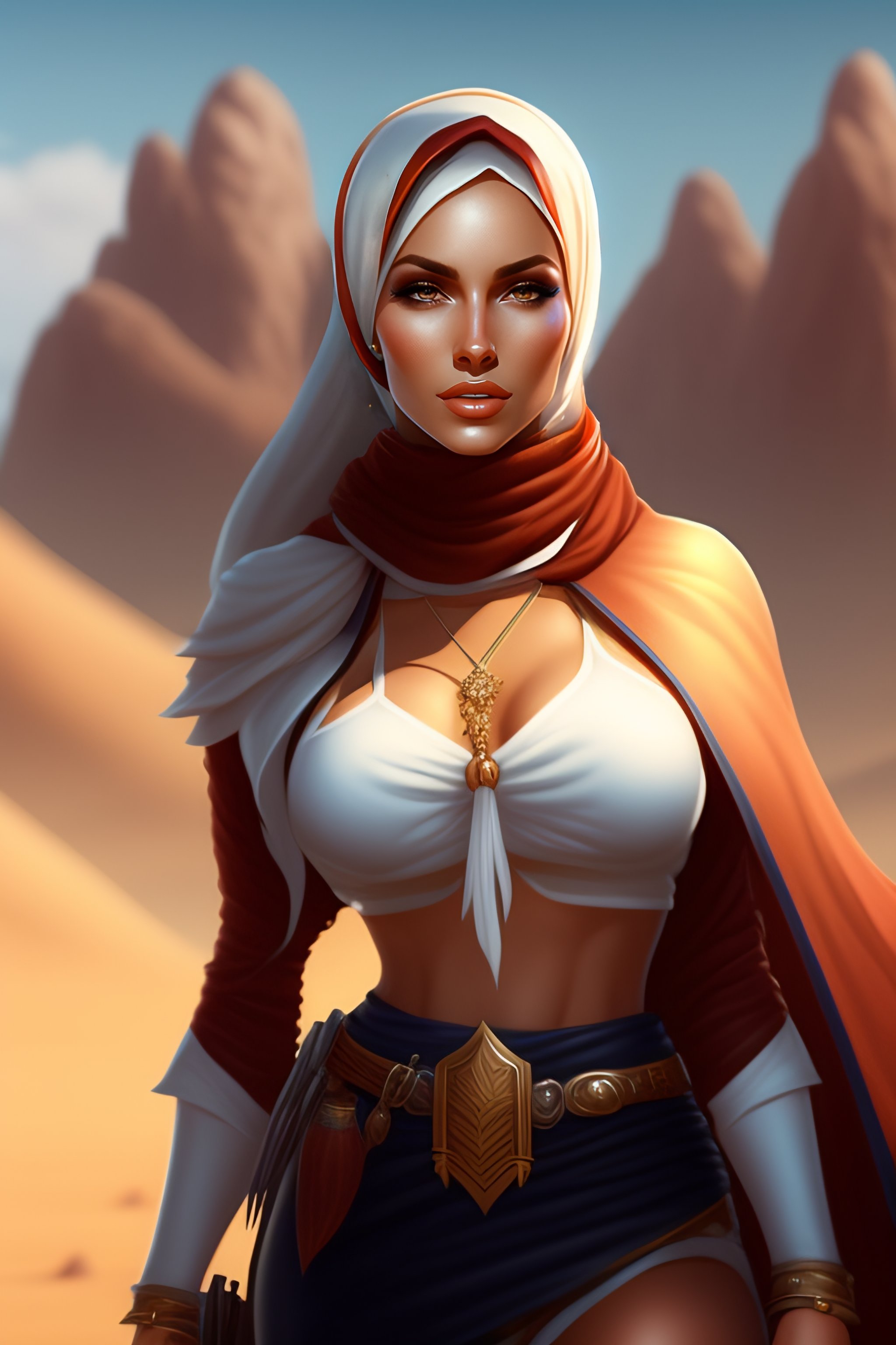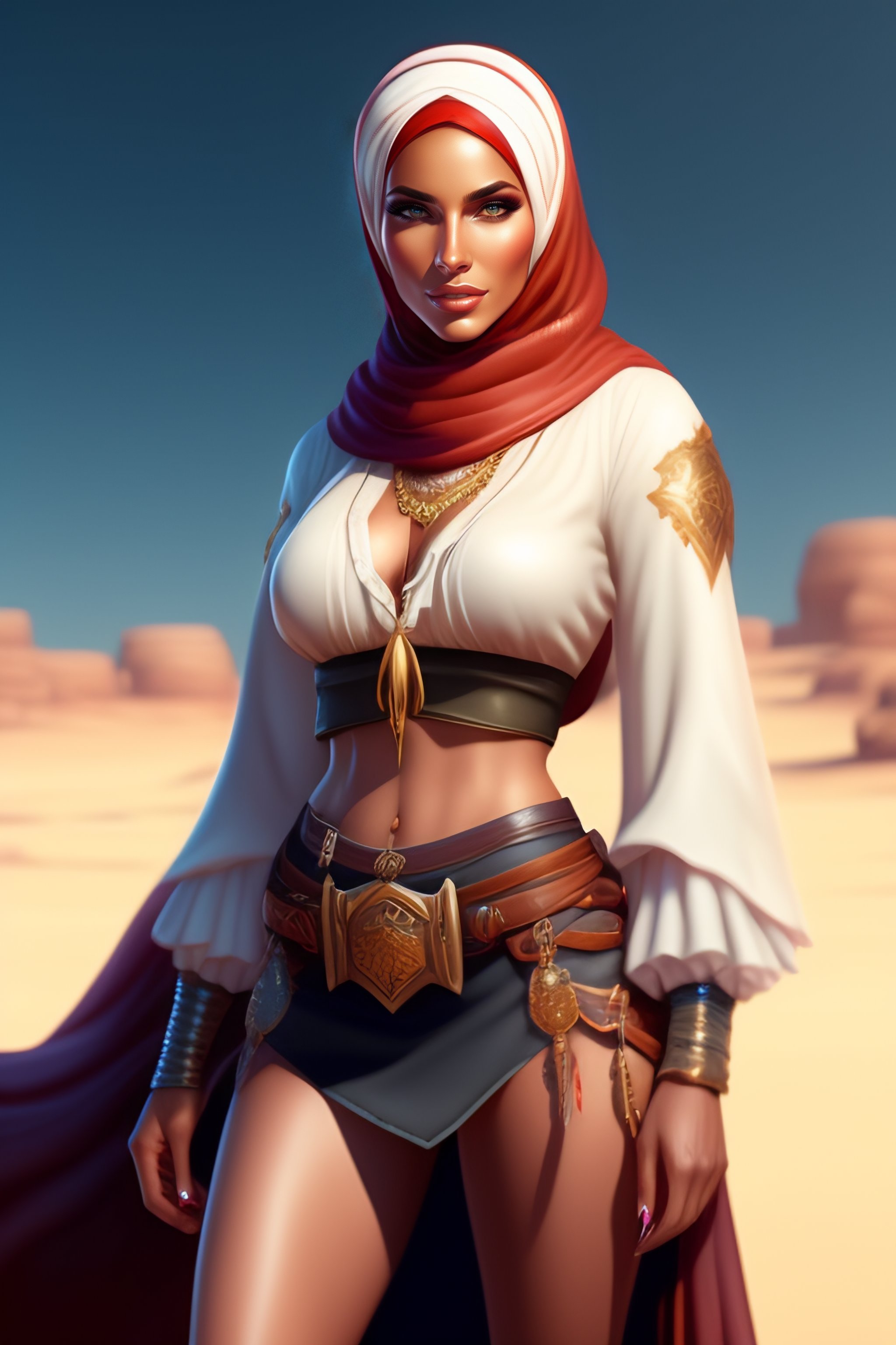 Full body, female cowgirl wearing hijab, perfect face, white blouse, holster, 8 k, magic the gathering, desert, d & d, artstation, high detail, smooth, muscular