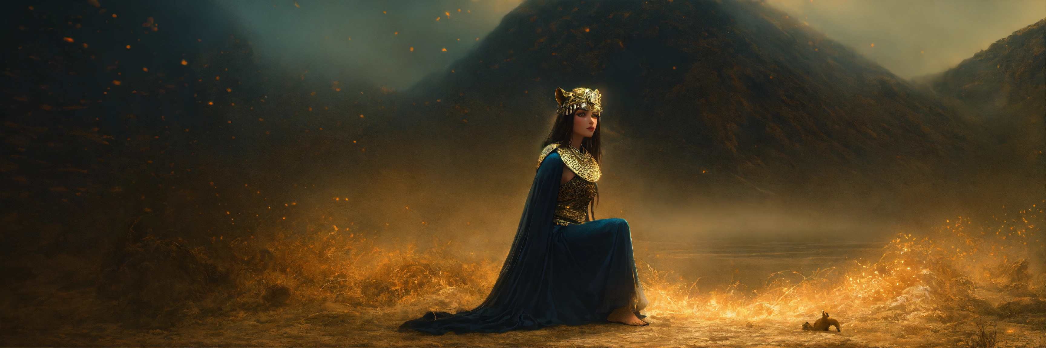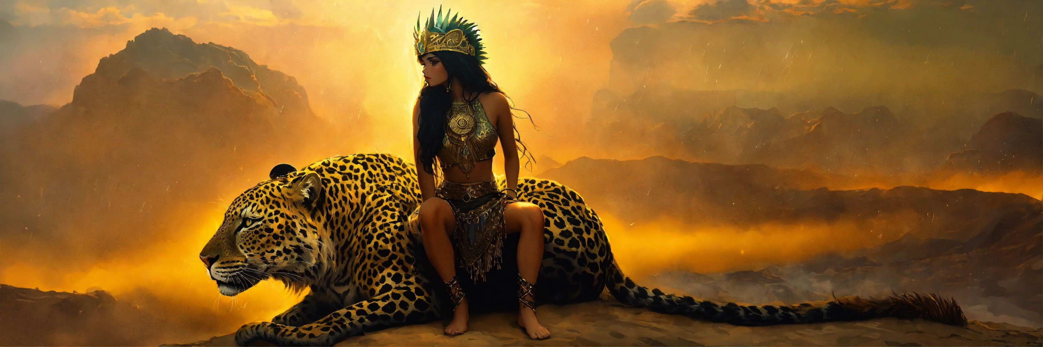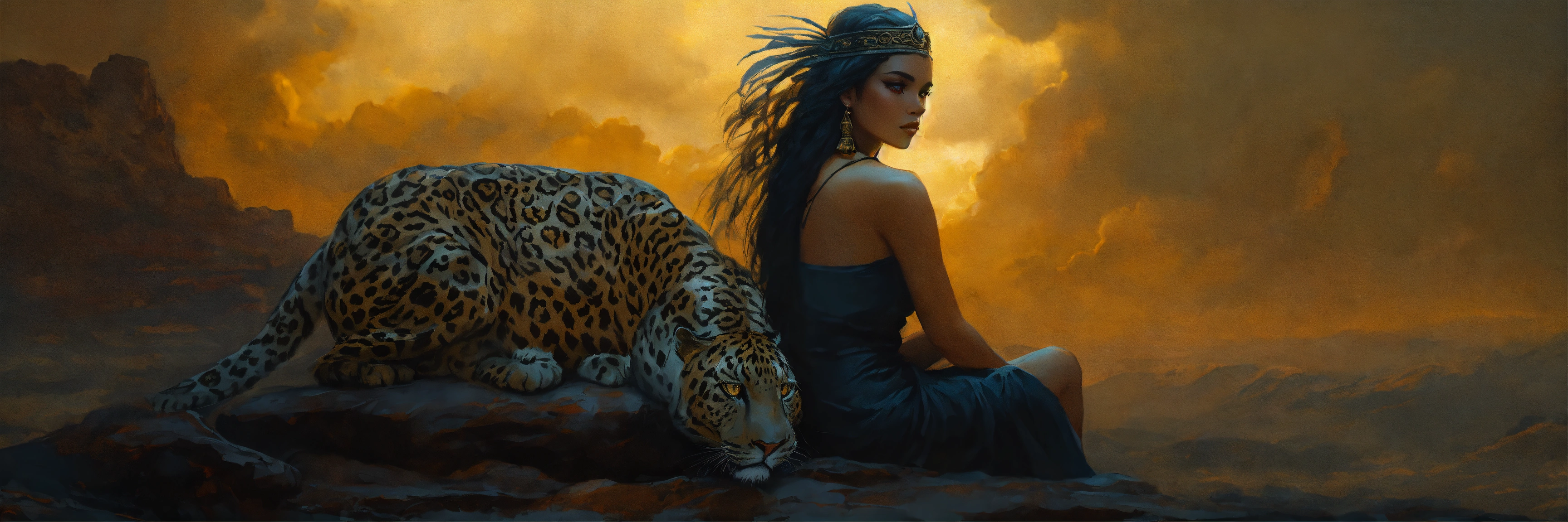 Latina women with babylonian head dress and dark flowing hair sitting on a leopard beast, dense black oil, metallic, fog and dust, hyperrealistic macro photo by wlop and zdzislaw beksinski [glowing eyes]"