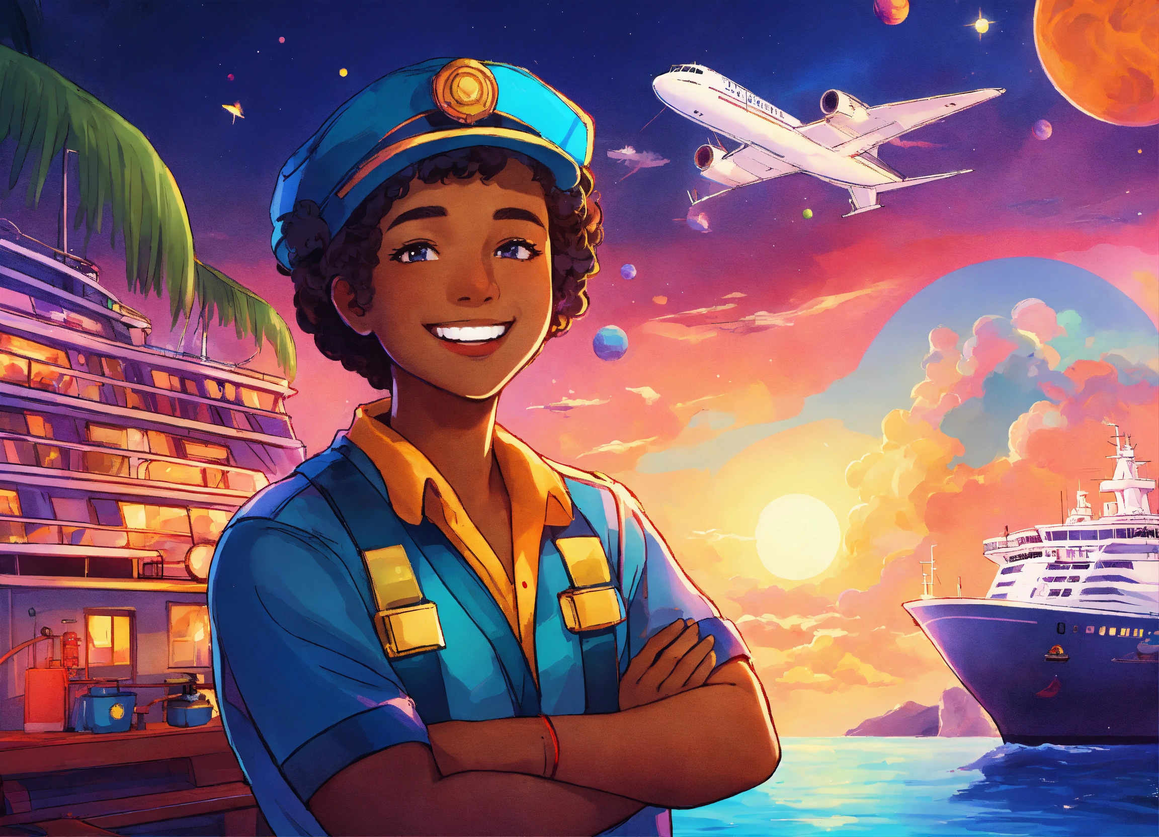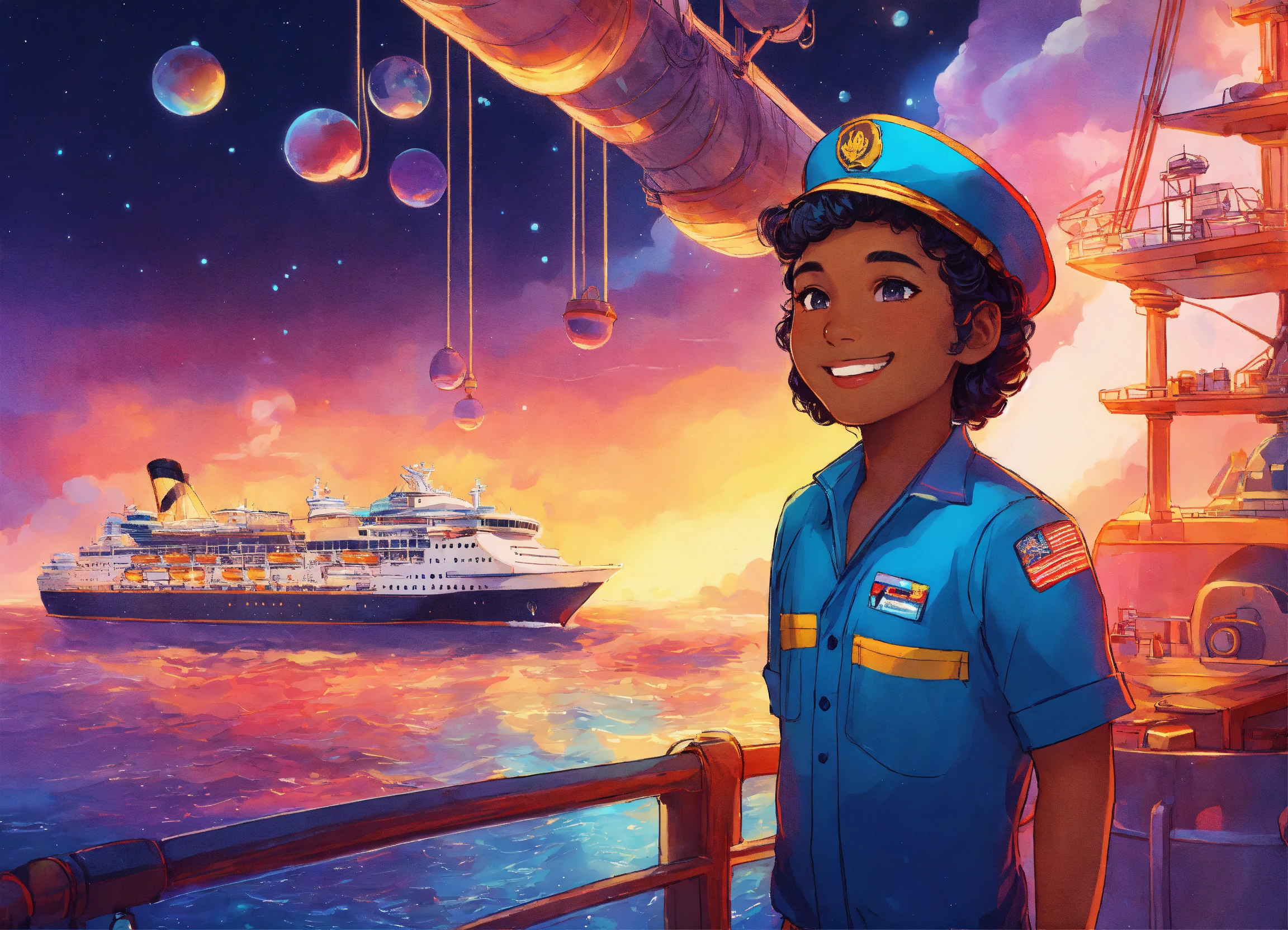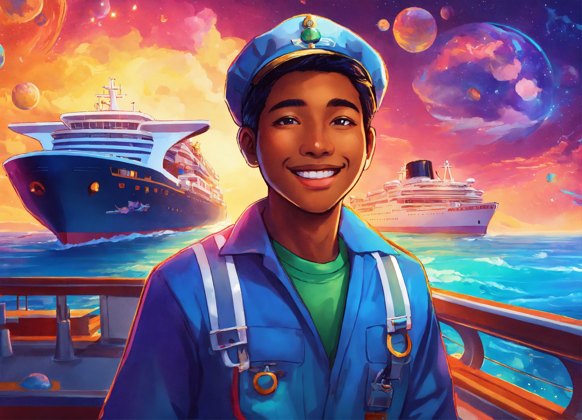 Young ship technician, smiling, indonesian face, modern cruise ship space background in seafaring, dramatic light, storybook illustration, 8k, by lisa frank