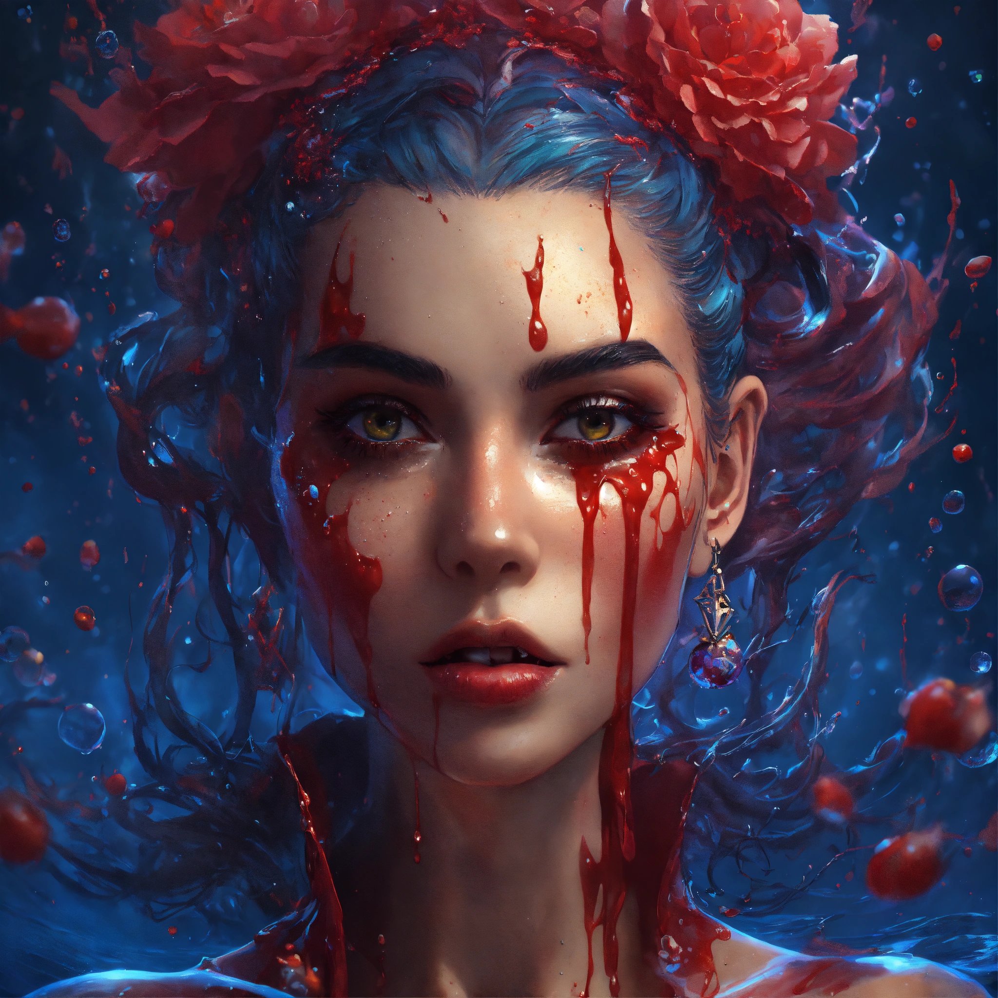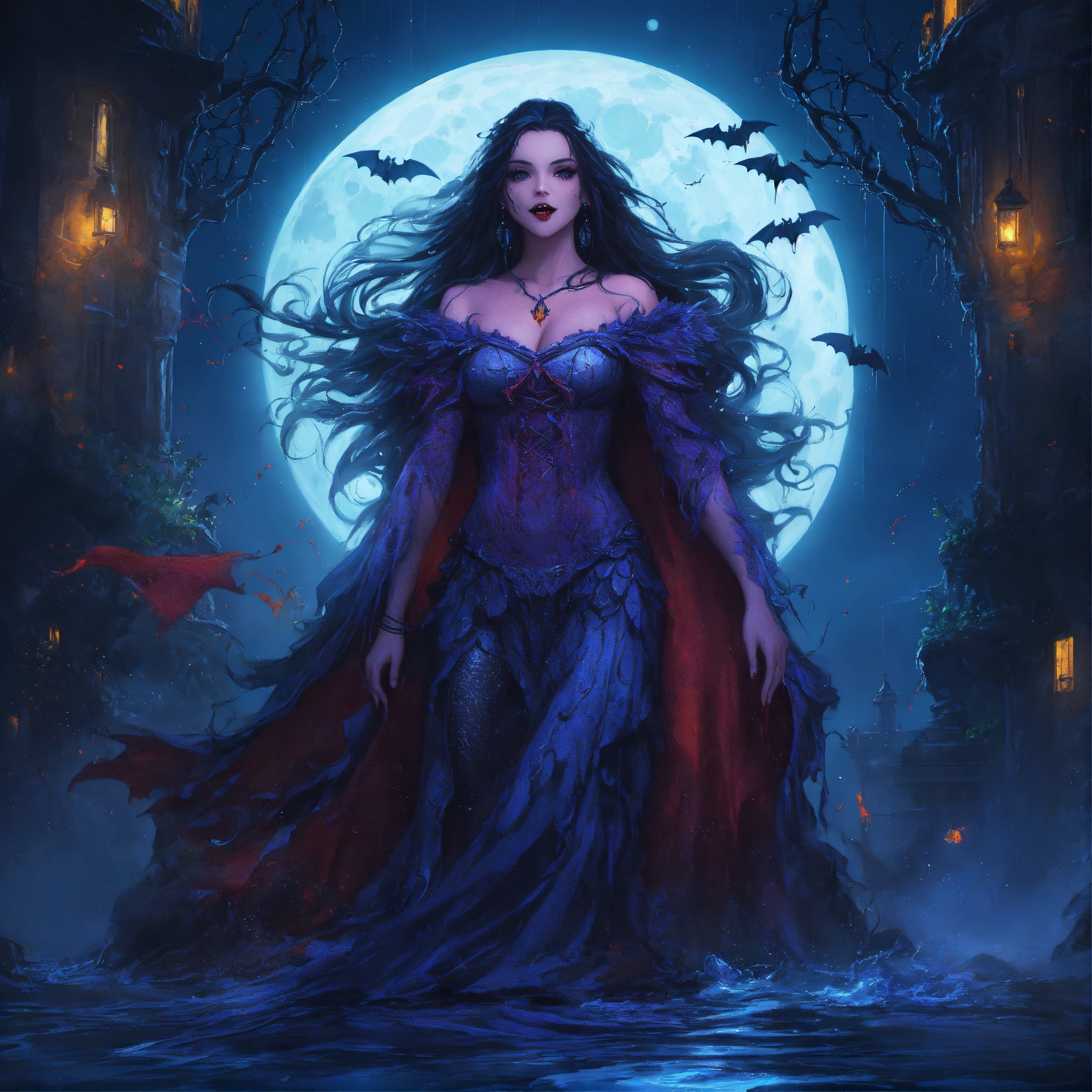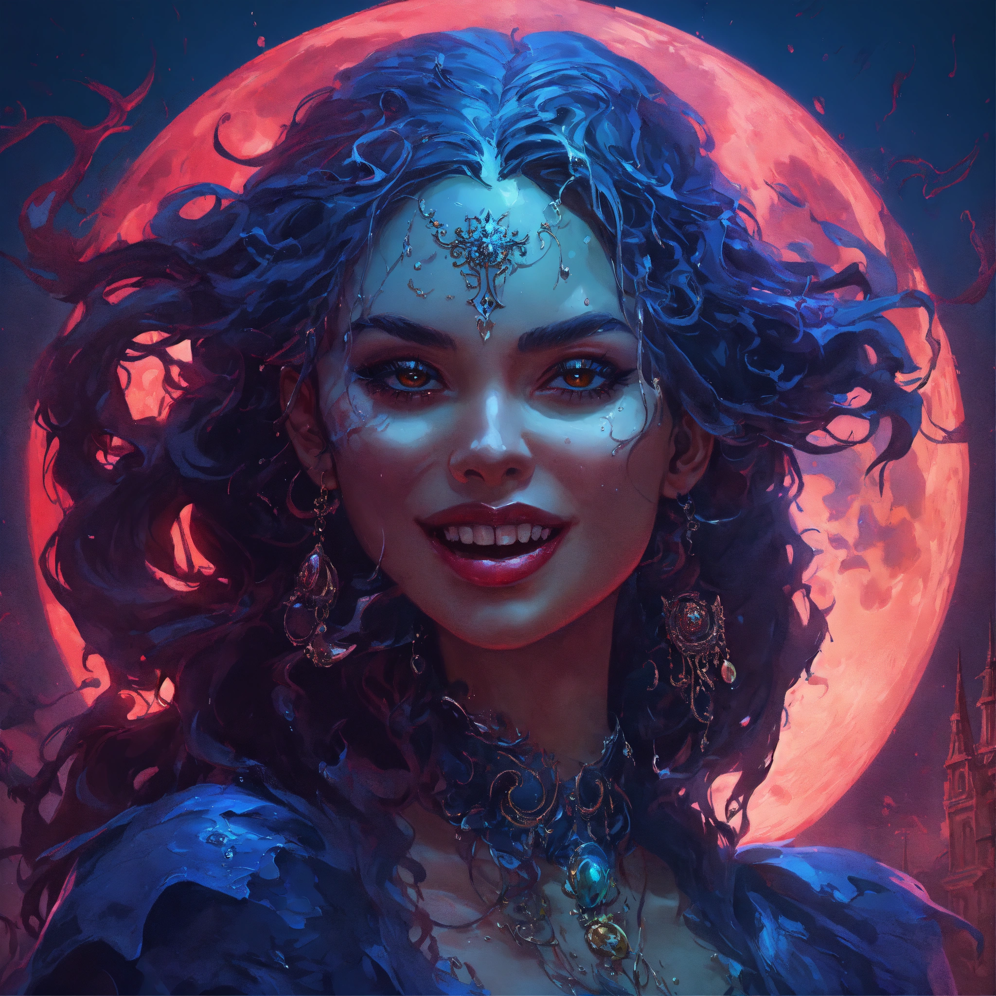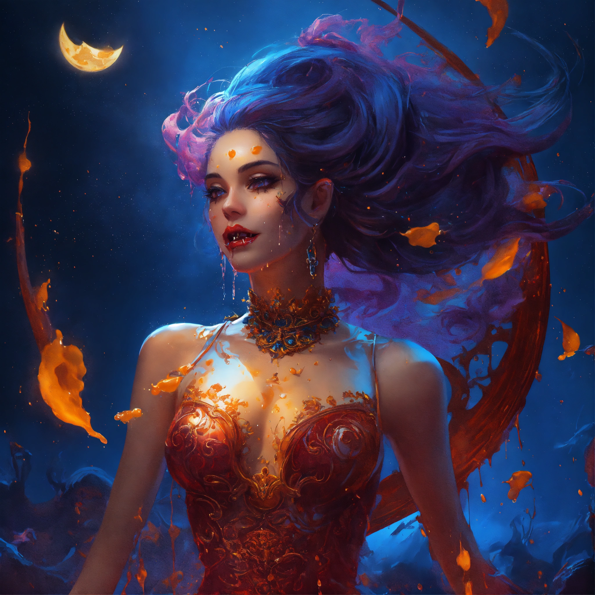 Splash art, a quirky liquid portrait of a hauntingly beautiful vampire woman with fangs, splash style of paint, pixar style, halloween colors, hyper detailed intricately detailed, fantastical, intricate detail, splash screen, liquid, gooey, slime, splashy, fantasy, concept art, 8k resolution, masterpiece, melting, complex background, intricate detailed, dark colors, fantasy, concept art, digital art, intricate, oil on canvas, masterpiece, expert, insanely detailed, 8k resolution. full blue moon background at night