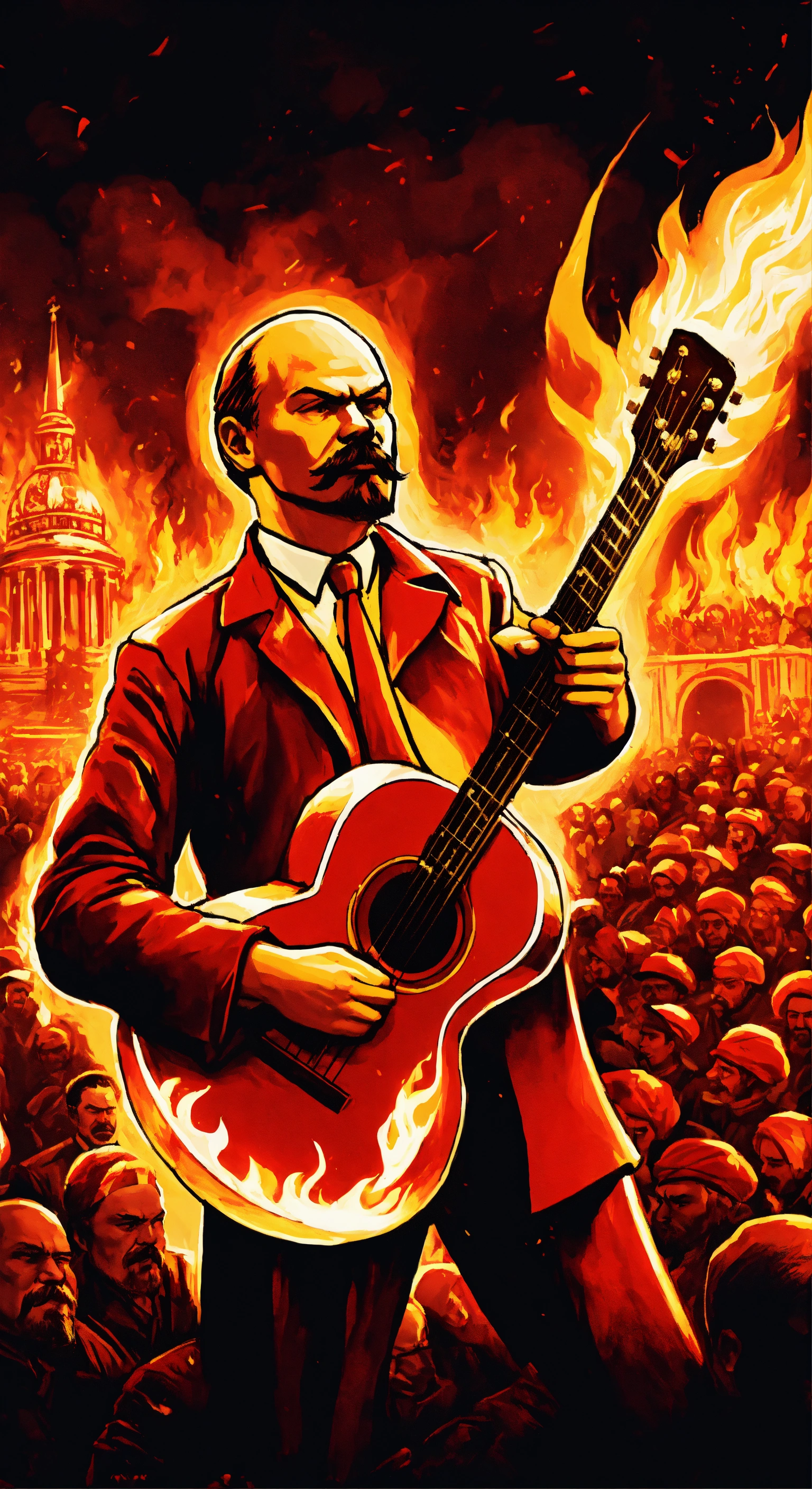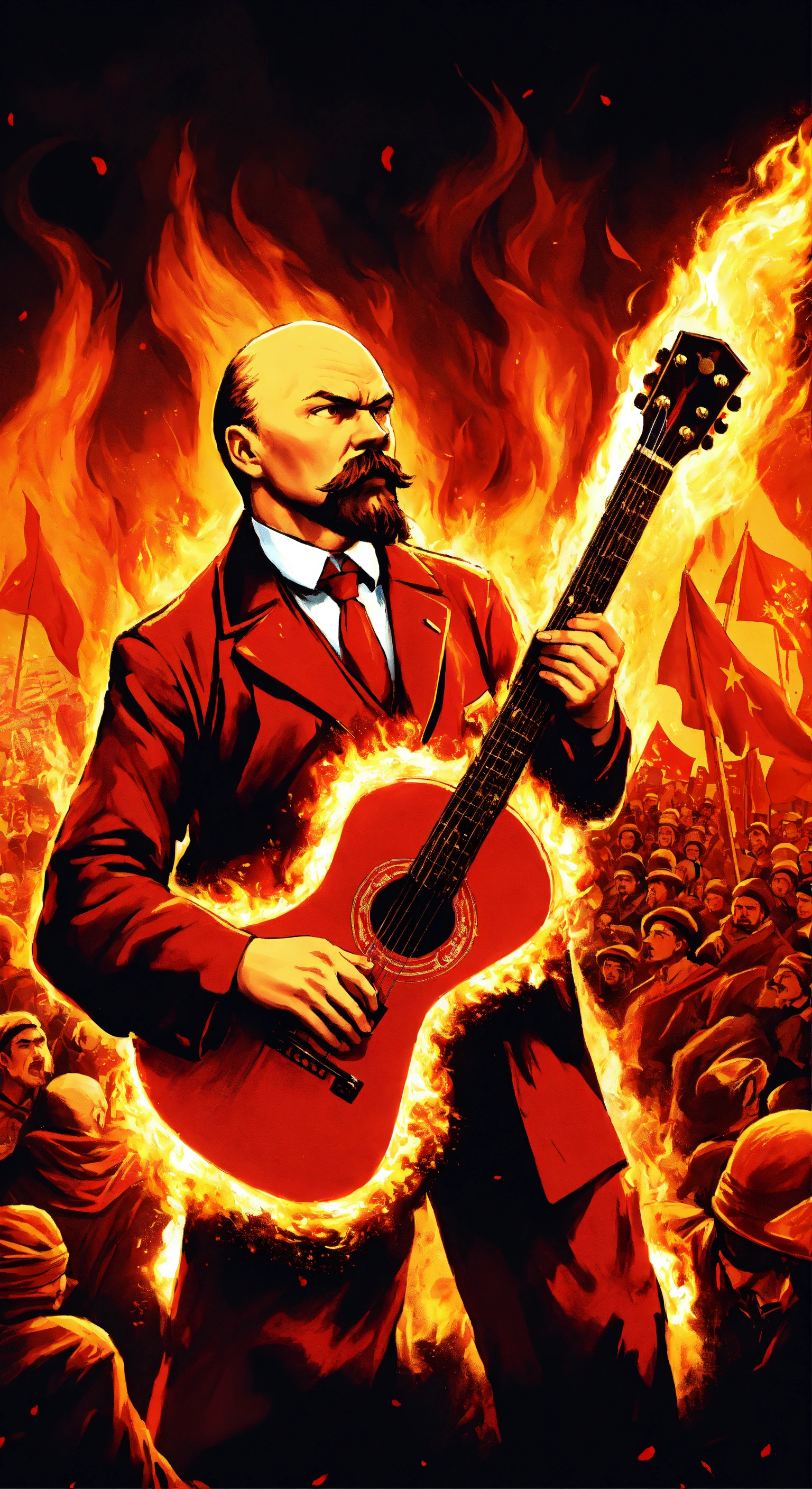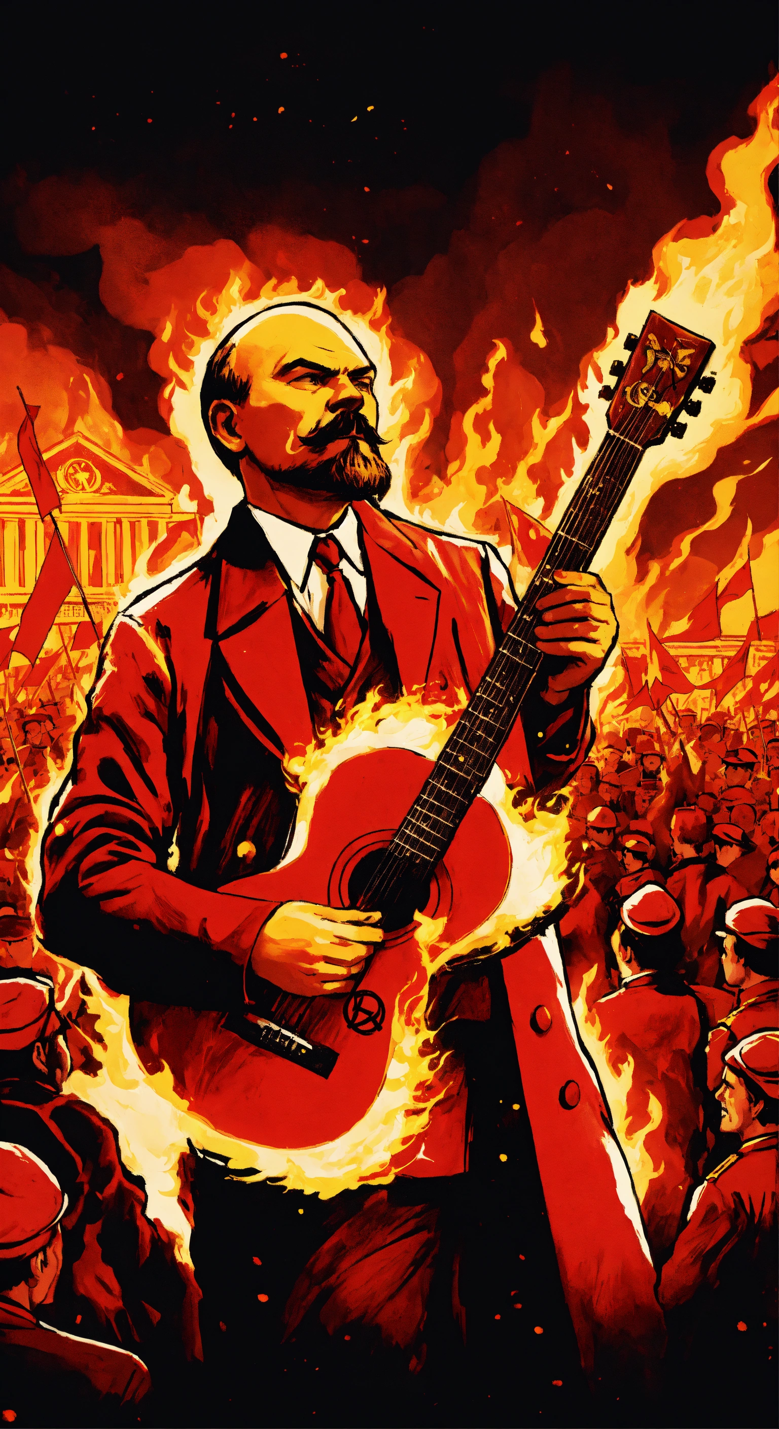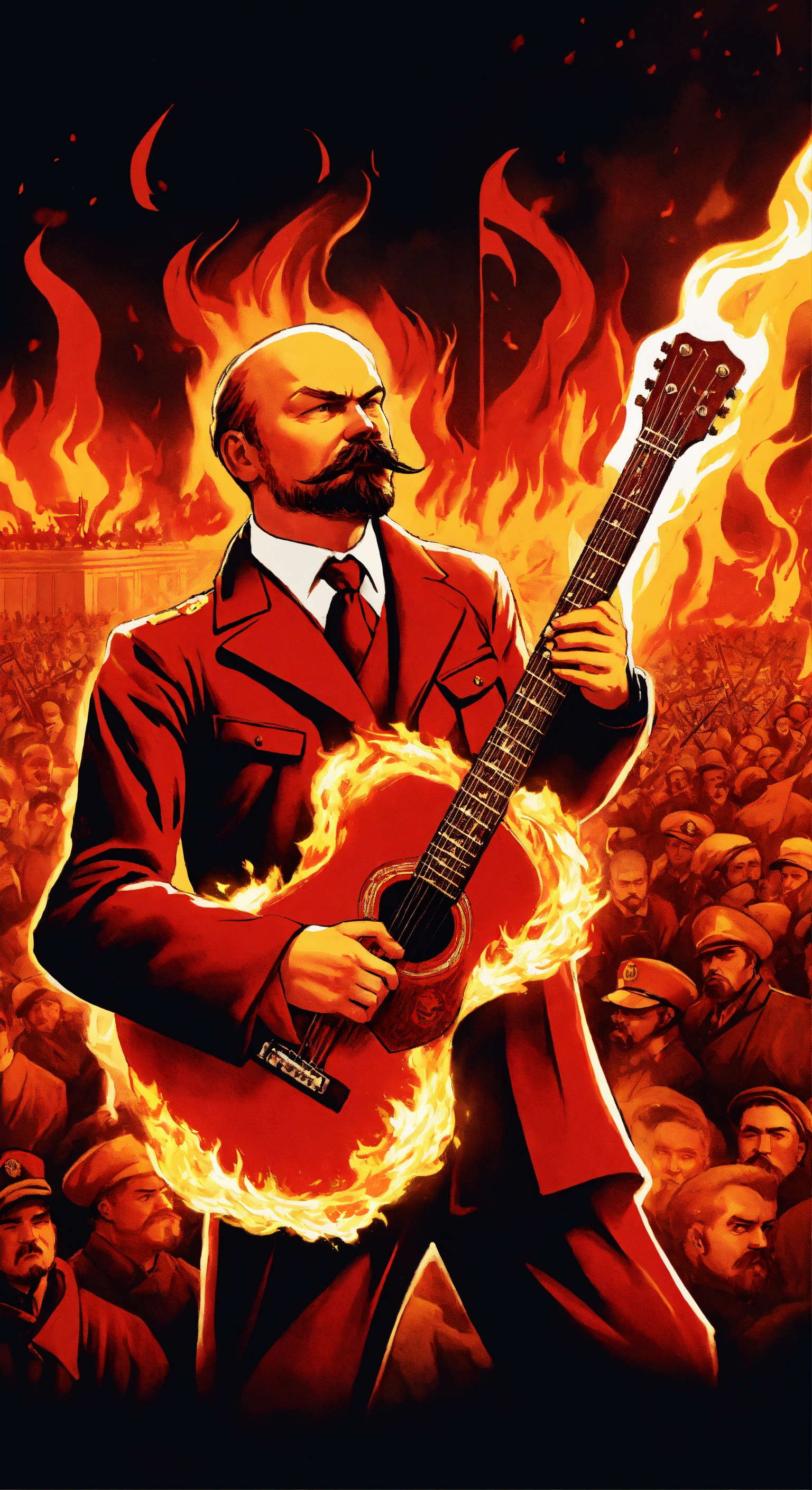 Illustration lenin, with a determined look, is playing a guitar that's ablaze, with the hammer and sickle emblem glowing amidst the flames. the crowd behind is equally fiery, cheering in a revolutionary fervor. with a red flag with the communist symbol in yellow in the background