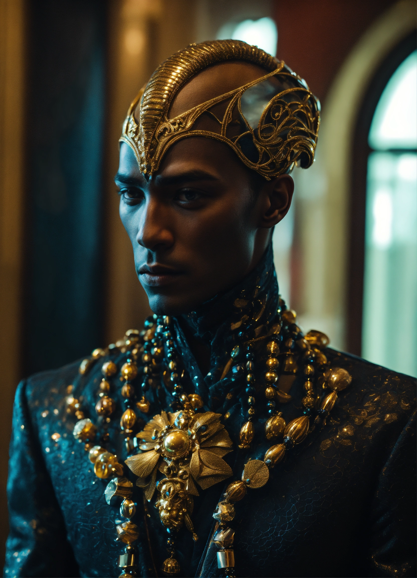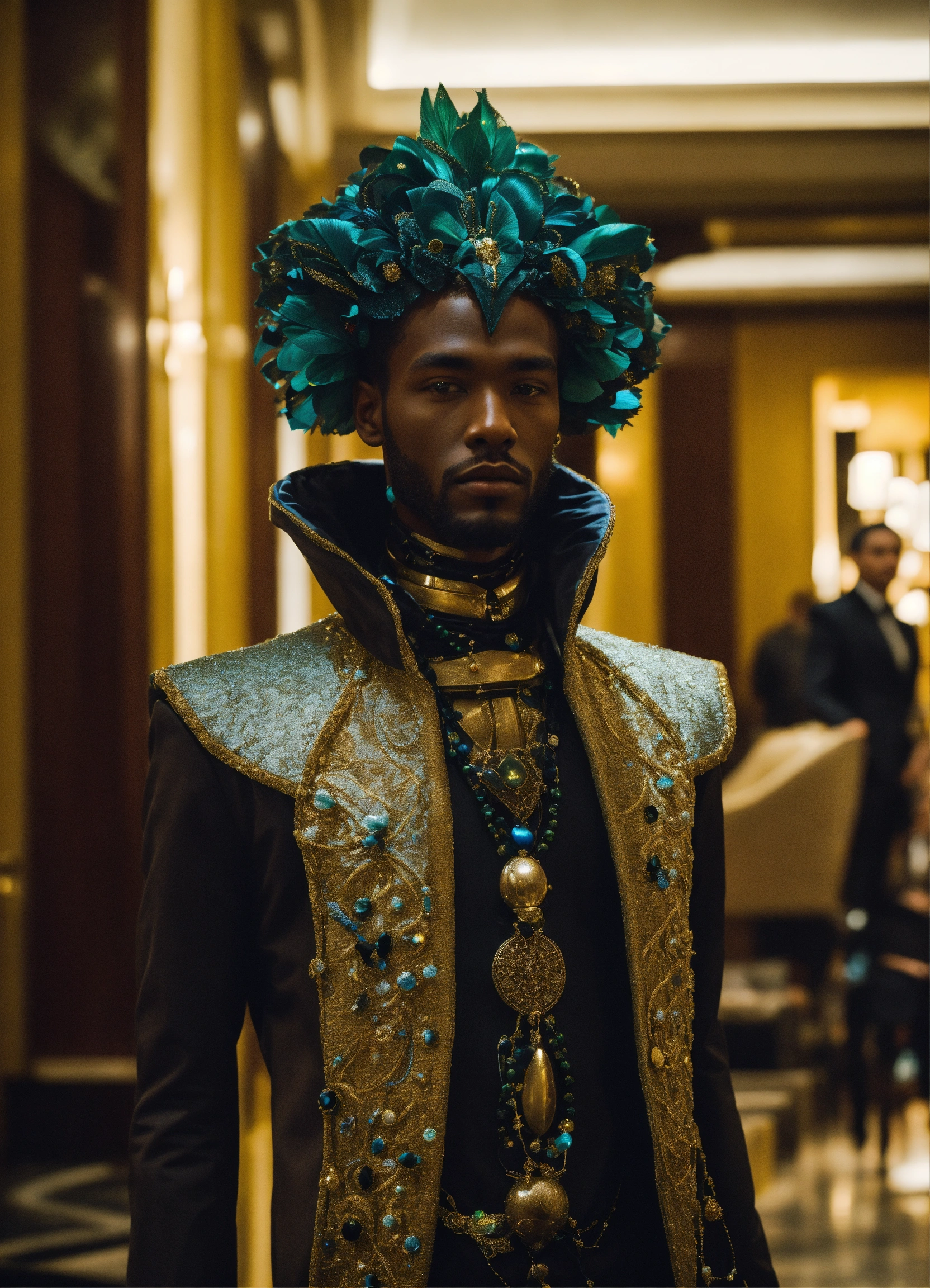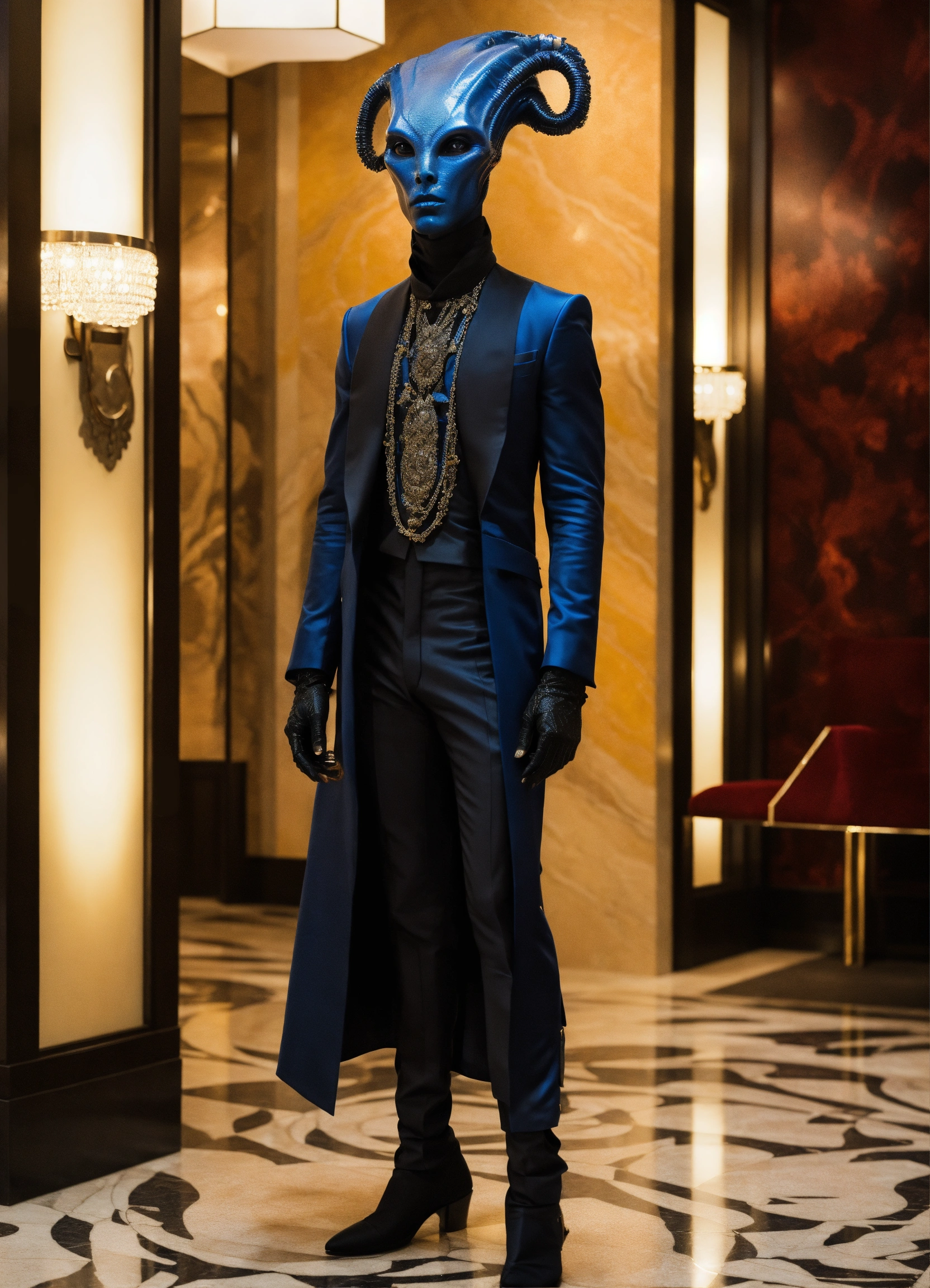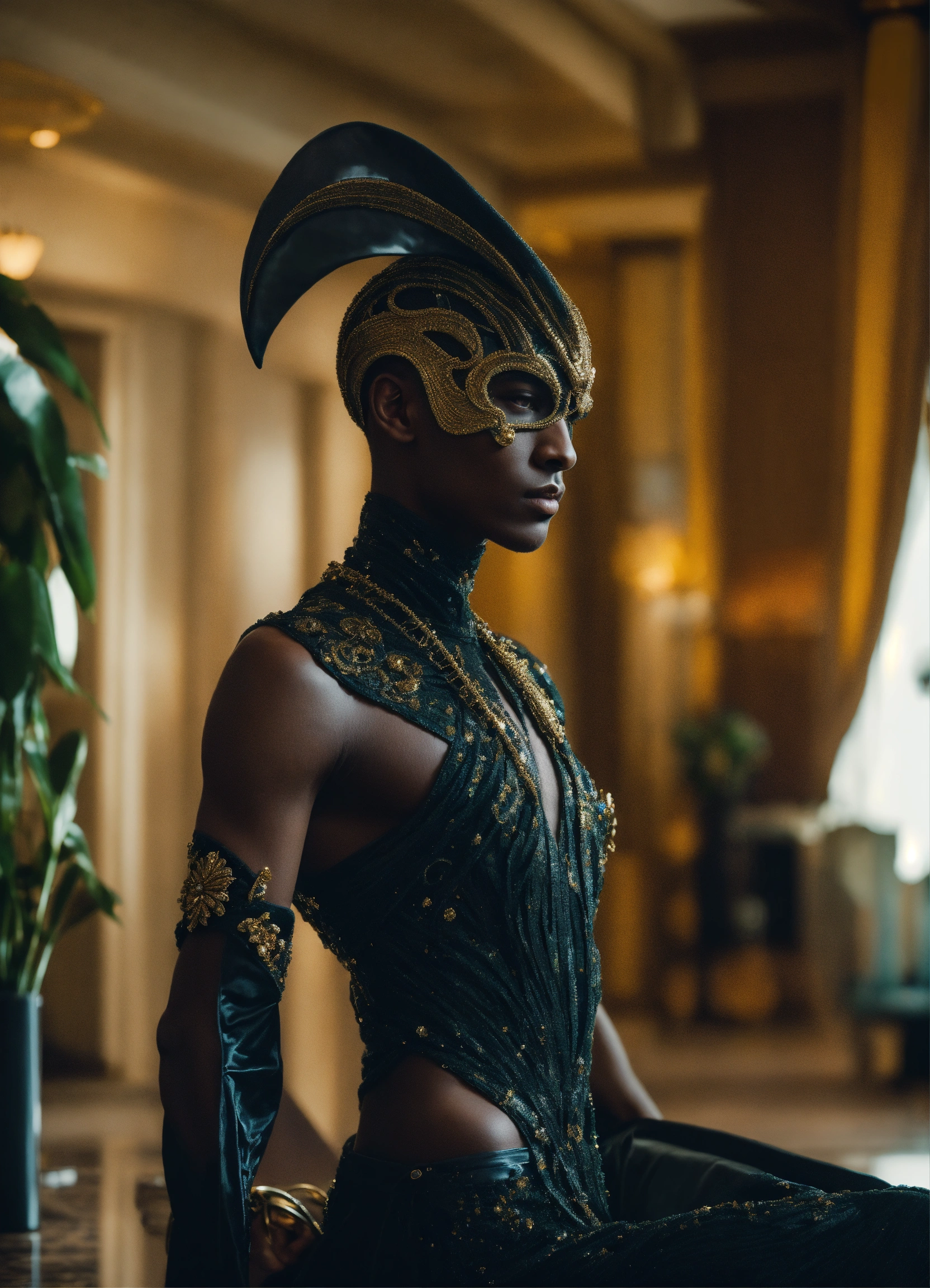 Human looking alien male with obsidian skin, dressed in haute couture. regal demeanor, in hotel lobby