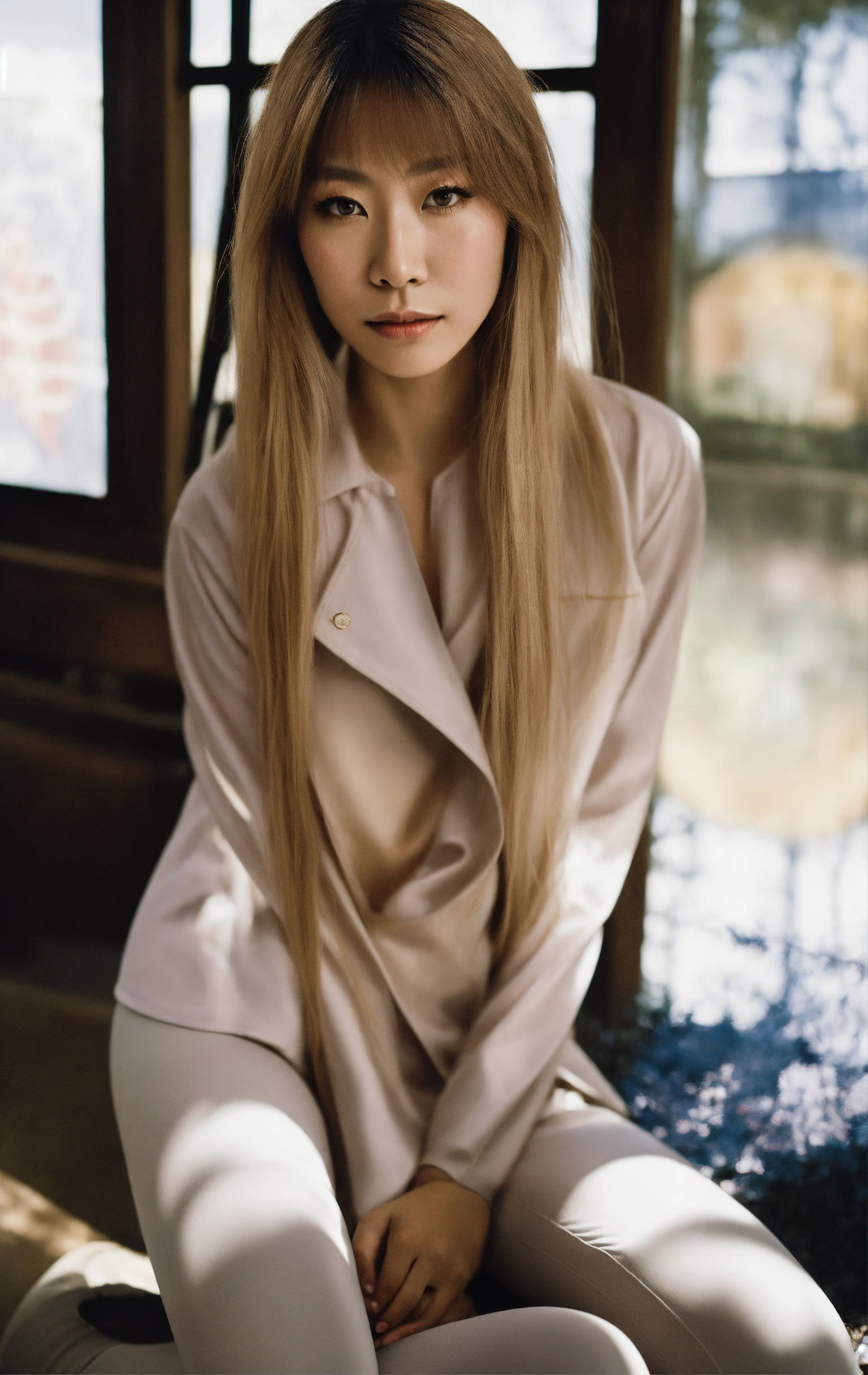 Portrait of an exquisite alluring japanese-swedish singer with long straight hair, wearing athletic leggings, ethereal dreamy foggy, photoshoot by cindy sherman, editorial fashion magazine photoshoot, fashion poses, in front of the modern art gallery. kinfolk magazine. film grain. a soft smile, low contrast, and cinematic lighting.