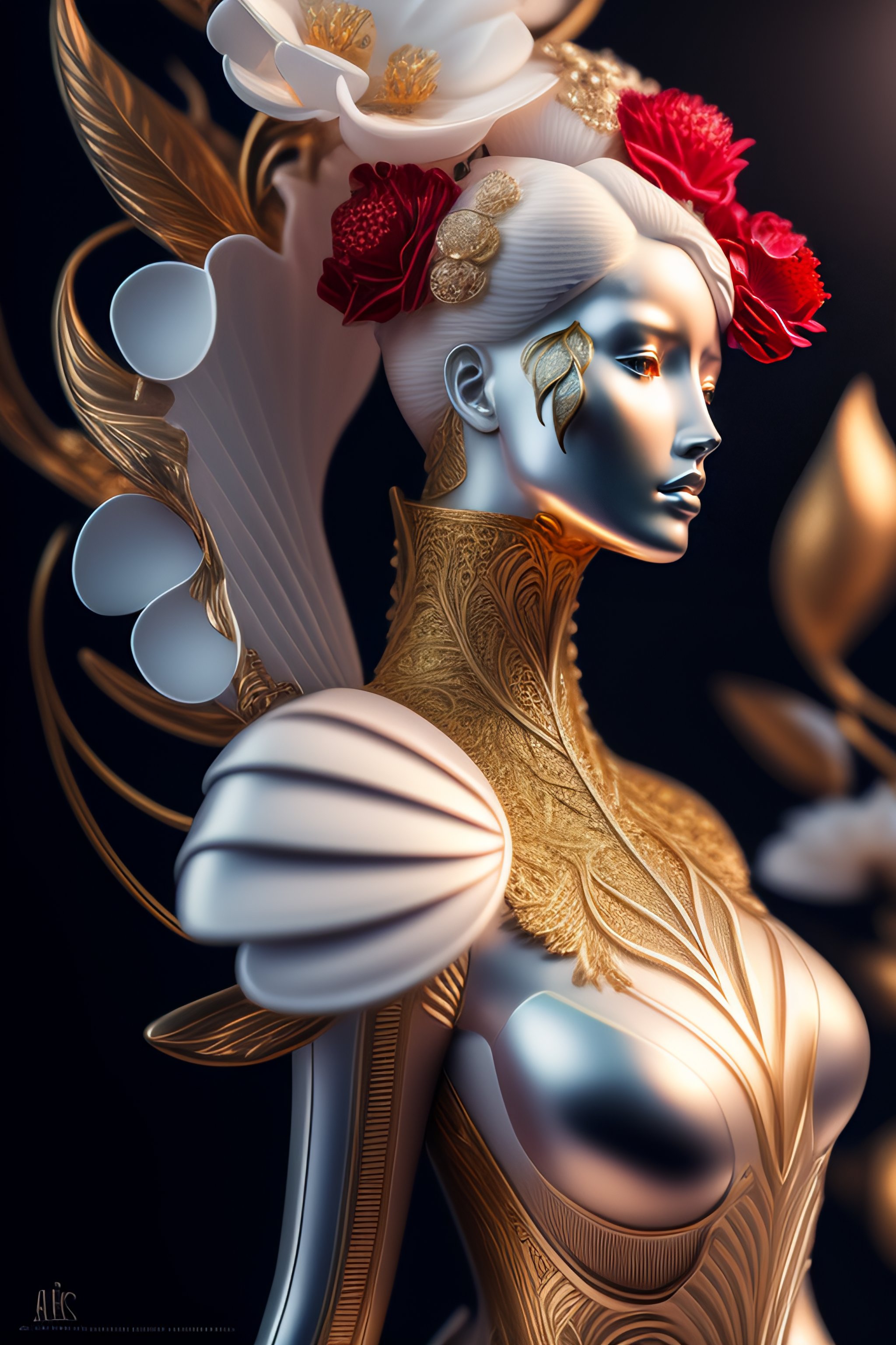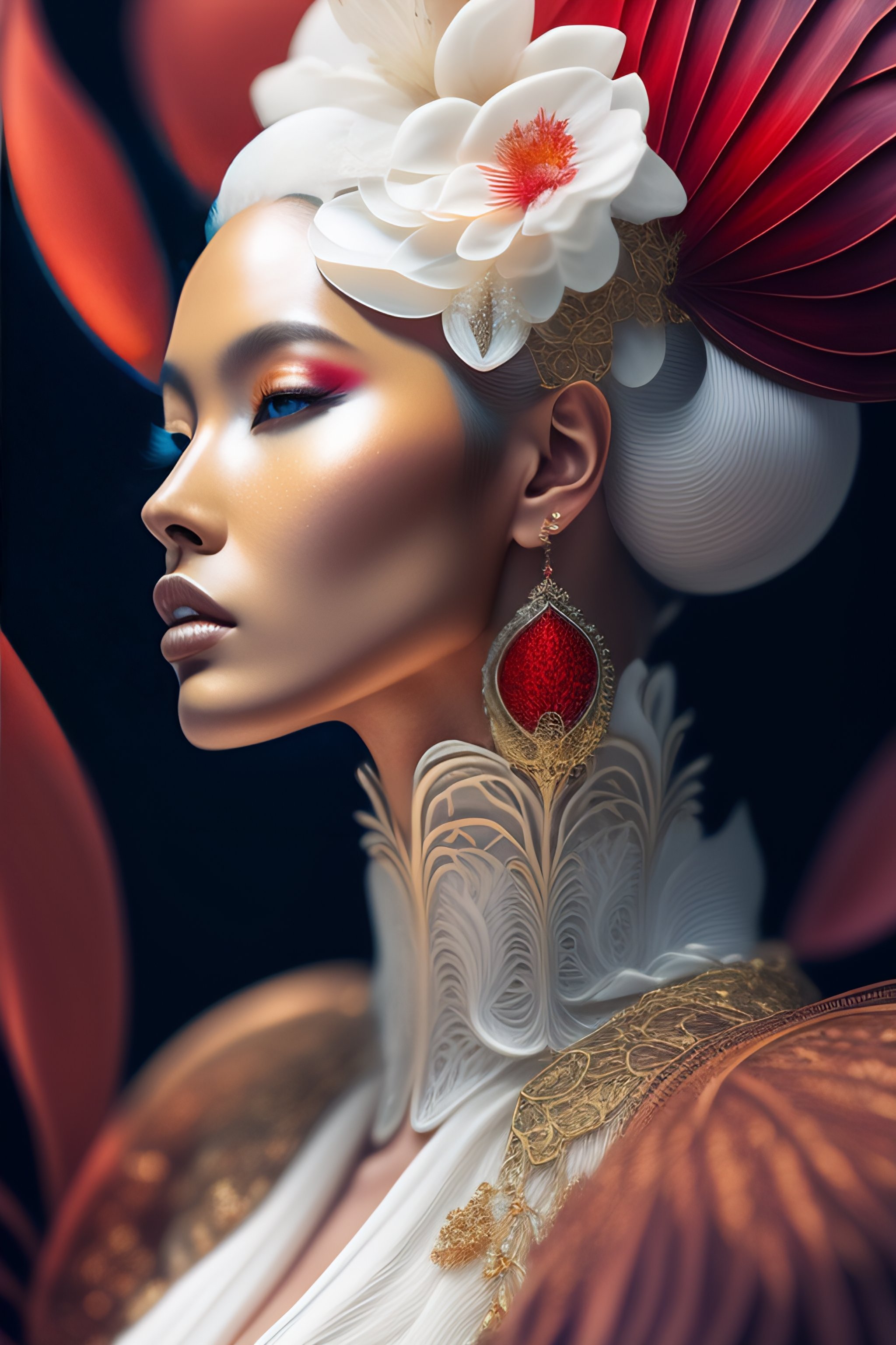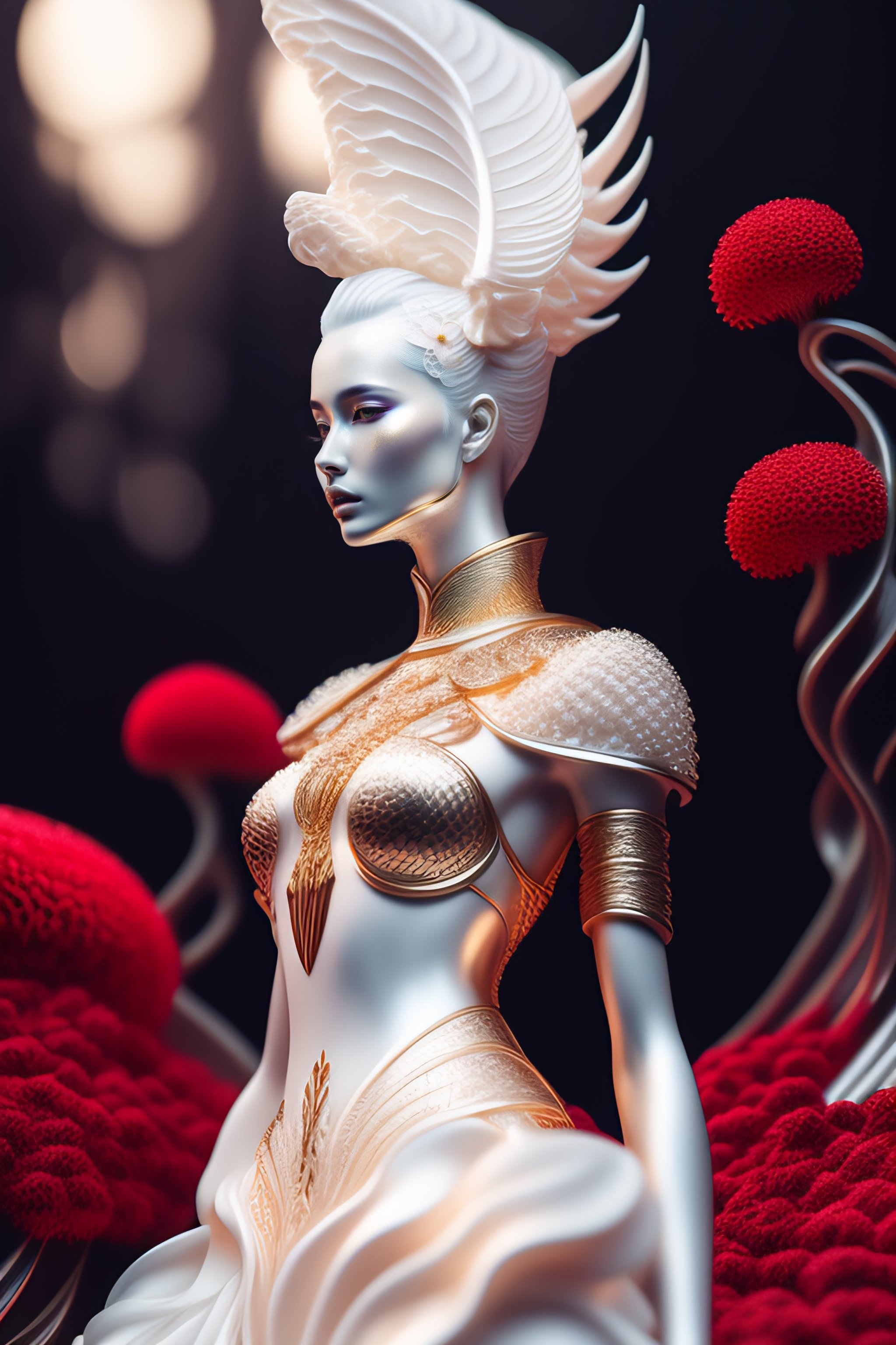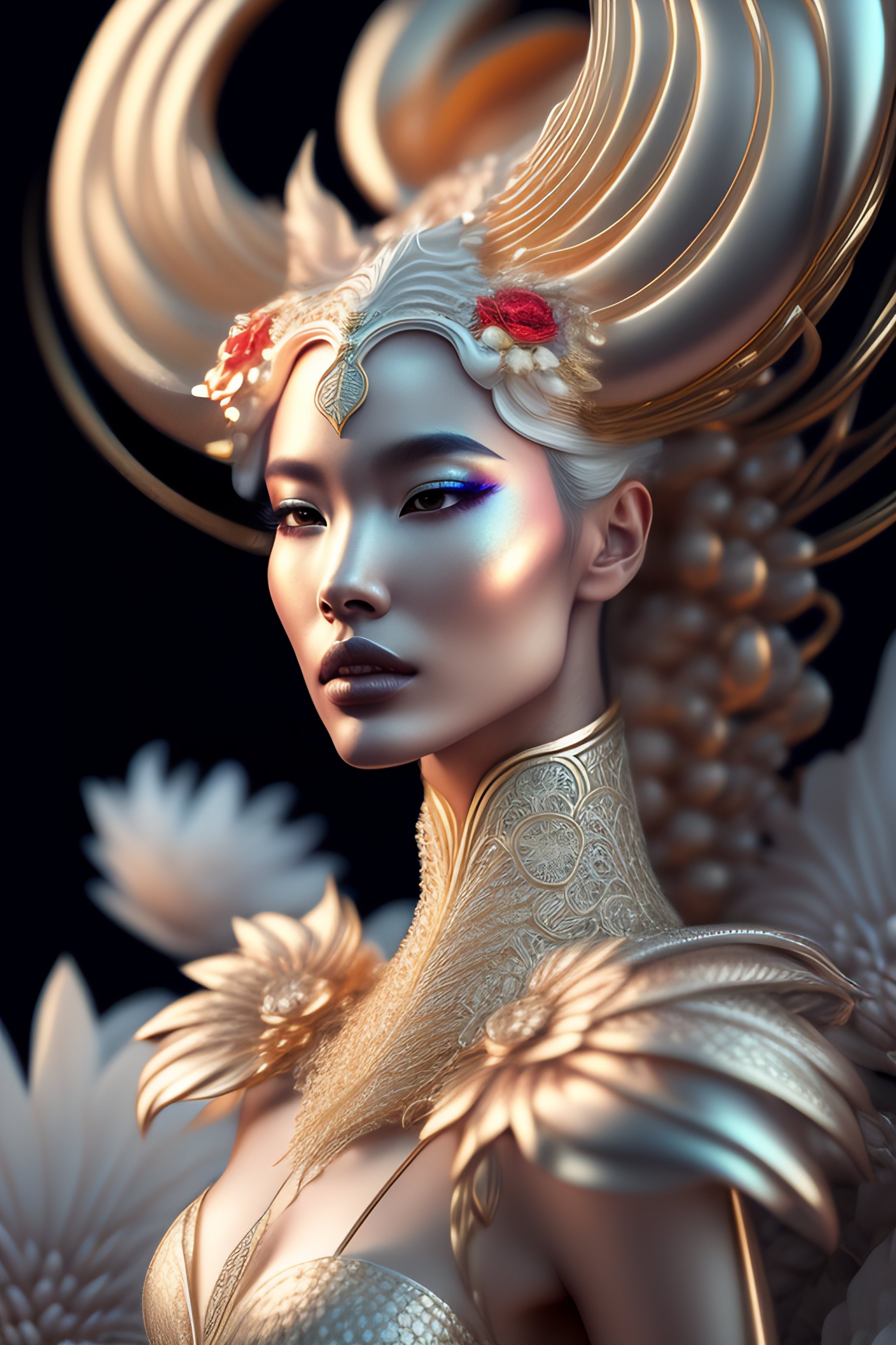 Hyperwave cover art fantasy concept art, 8k resolution intricate artwork by tooth wu, wlop, and beeple. octane render greg rutkowski's very coherent symmetrical artwork. cinematic universe fulfilling the body, fantasy, sharp focus, biomechanical brain white hair female, biomechanical skull demon king concept art portrait by casey weldon bioluminiscent creatures 1 5 0 mm lens, beautiful natural soft rim light big leaves and stems, white blossoms, sinuous roots, fine foliage lace alexander mcqueen high fashion haute couture charles de vilmorin silver, gold, red filigree details, pearl earring art nouveau fashion embroidered