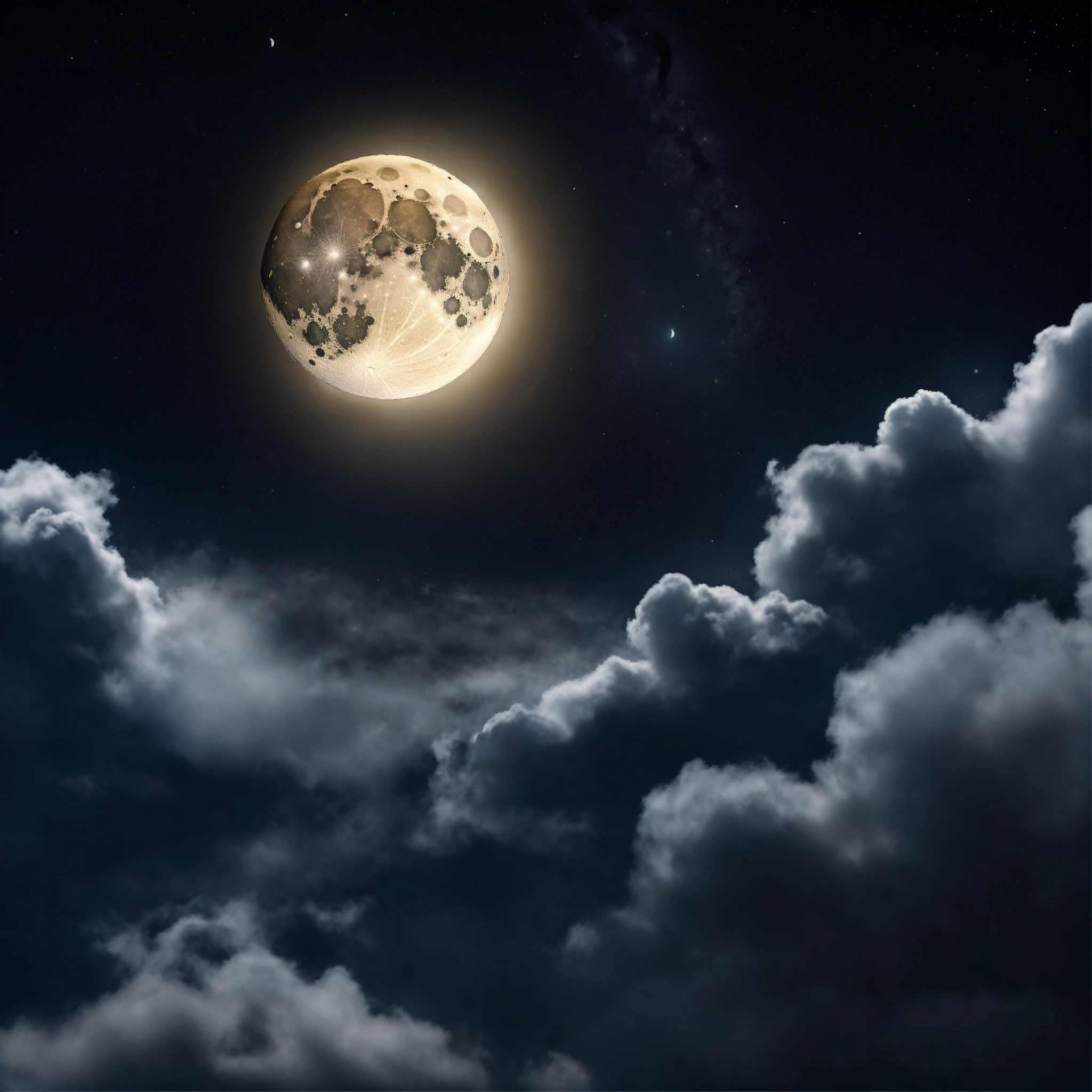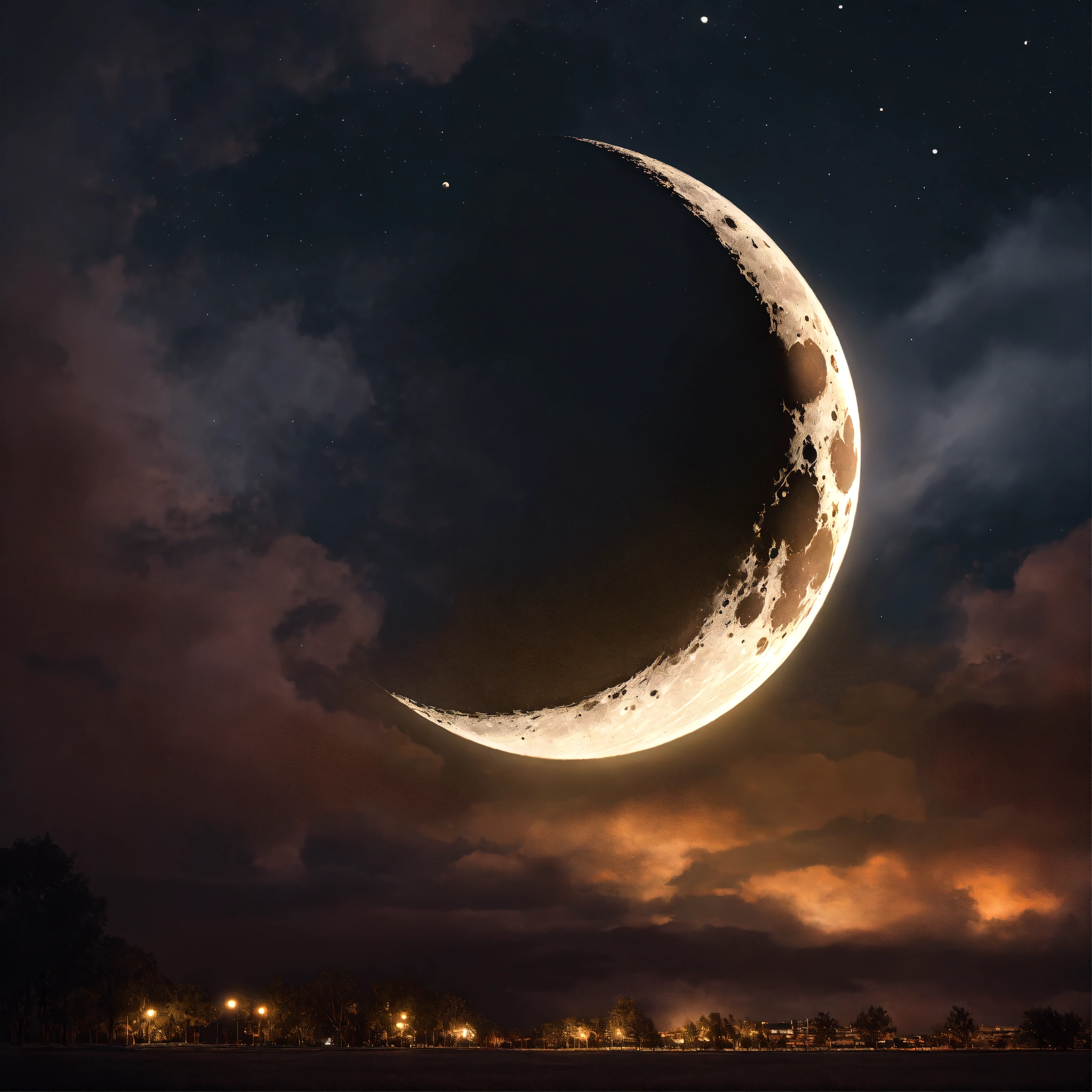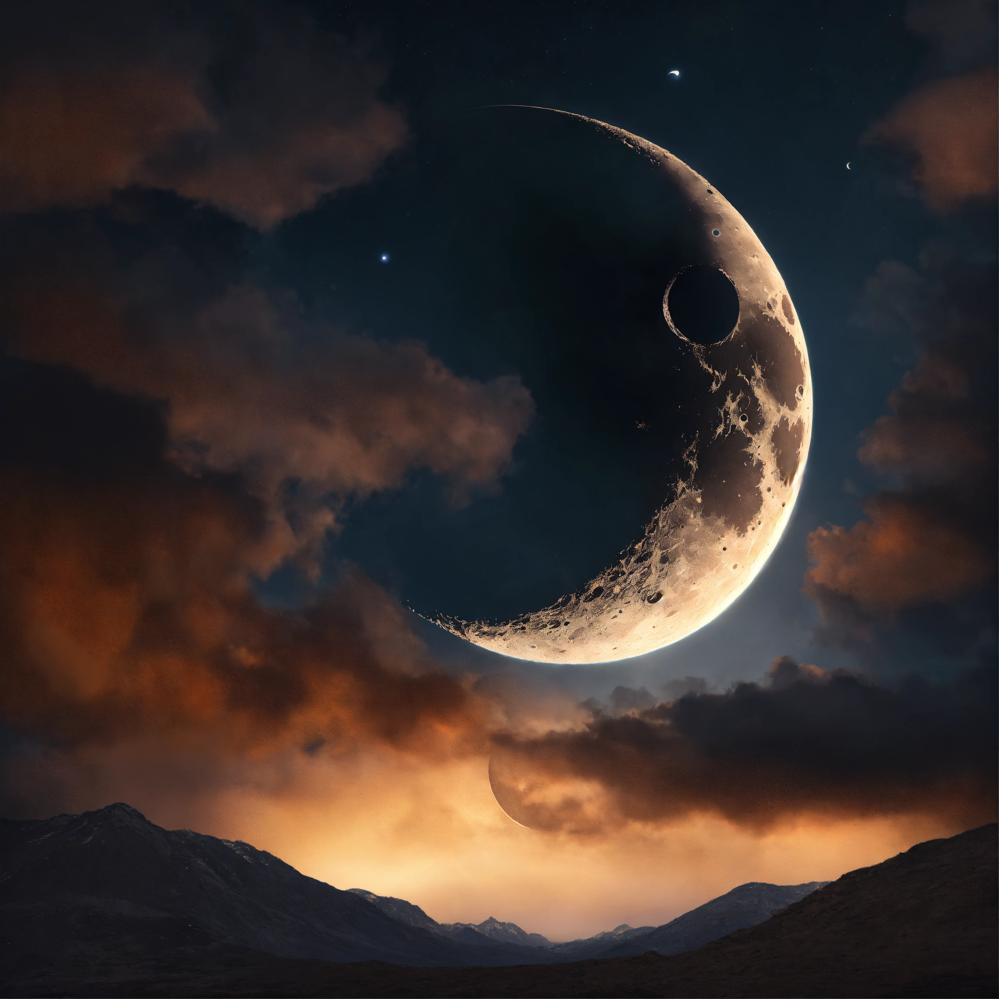 Create a portrait image of a crescent moon enveloped by darkness, dark clouds cover the base of the moon, zoom into the moon