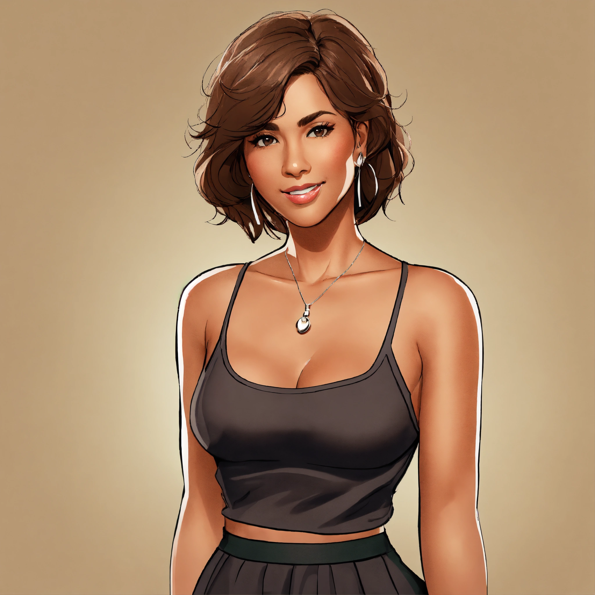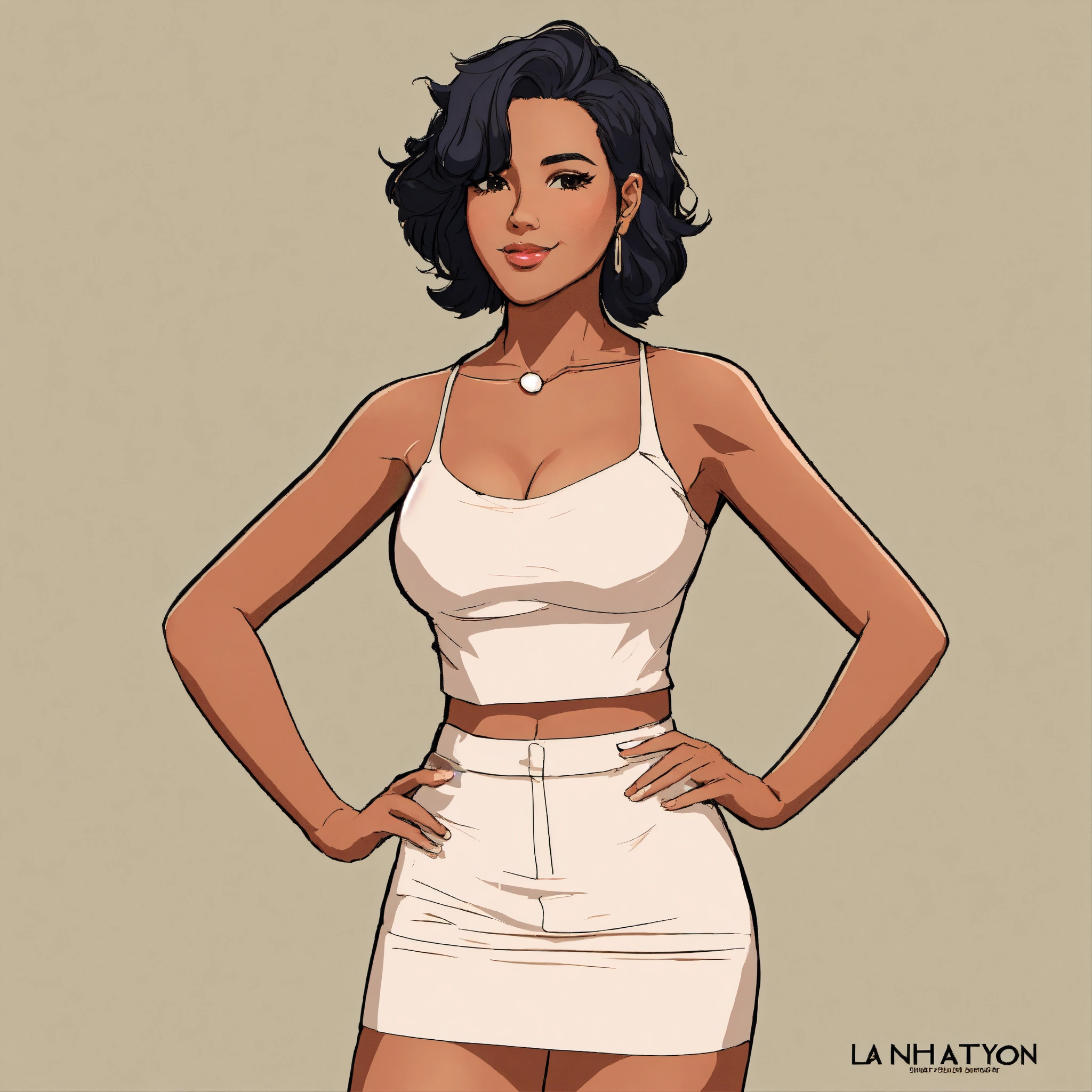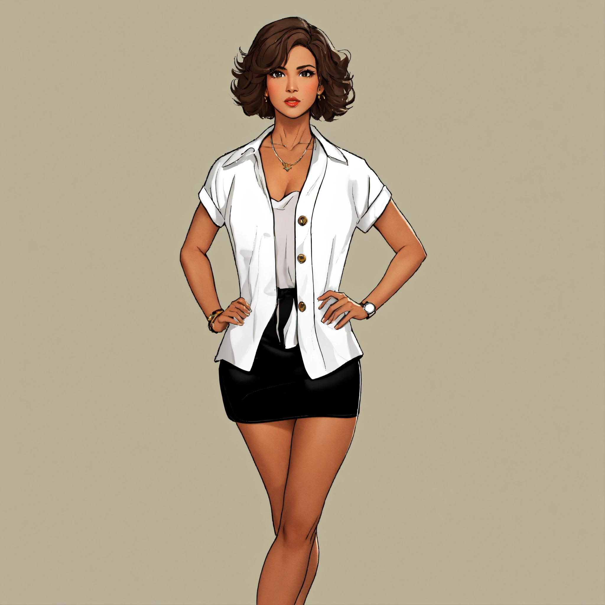 Maya, brazilian, tan skin, gorgeous middle aged woman, white background, short hair, standing, facing front. hd, ((((((((((((show whole body)))))), no shadows, wearing a black mini skirt, full frame, 35mm wide angle shot, 80s styles, make image into 3d, coloring book, vector, normal chest, brown skin, no cropped body