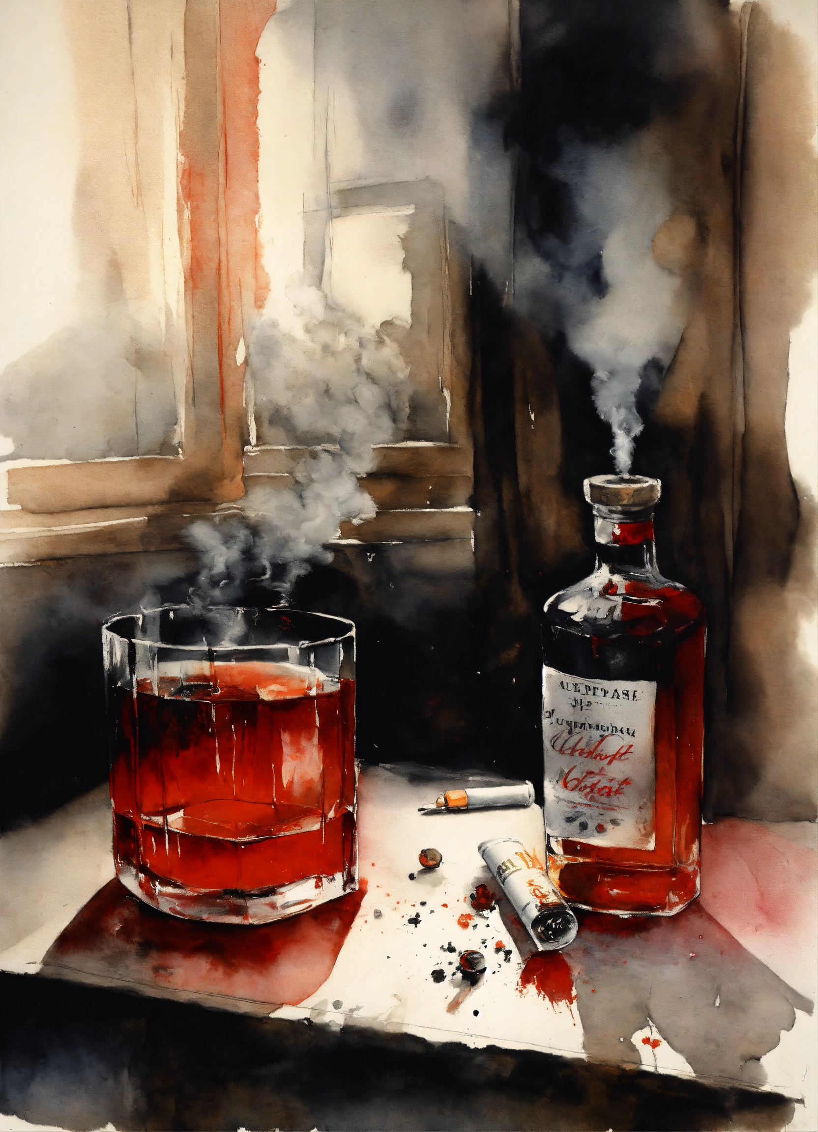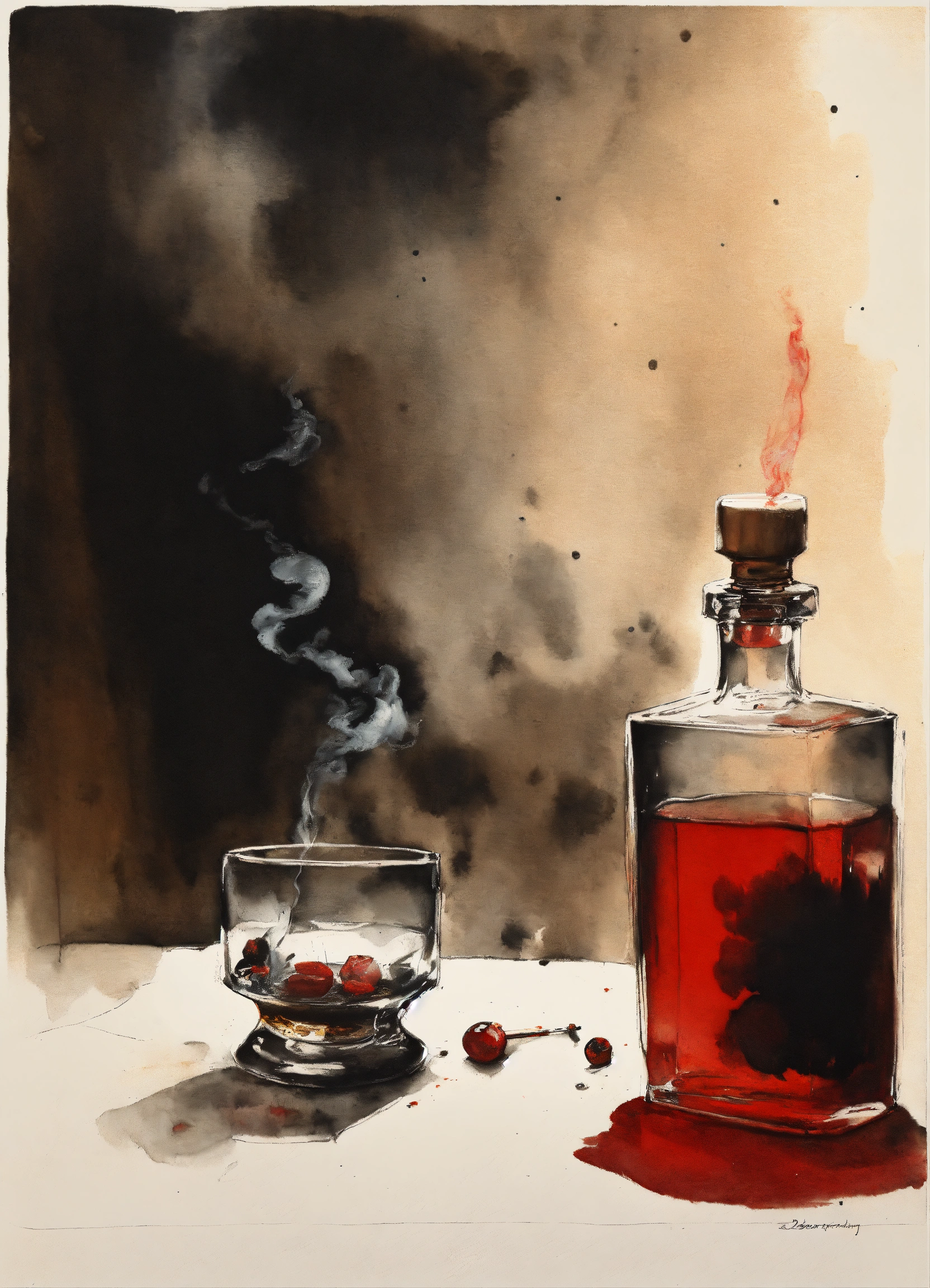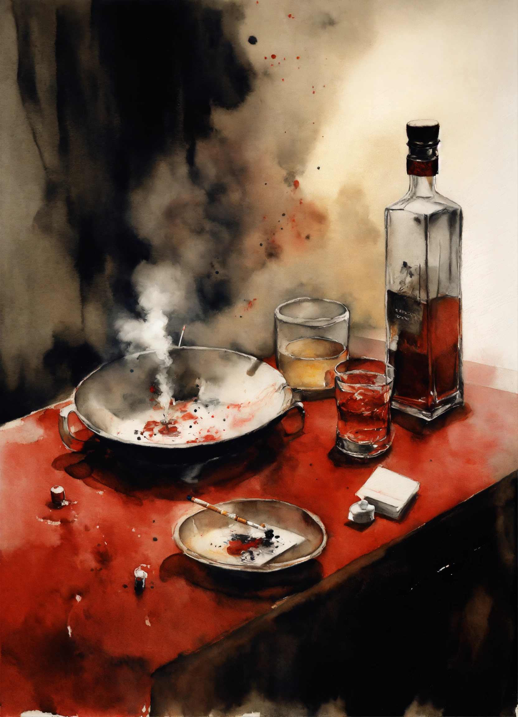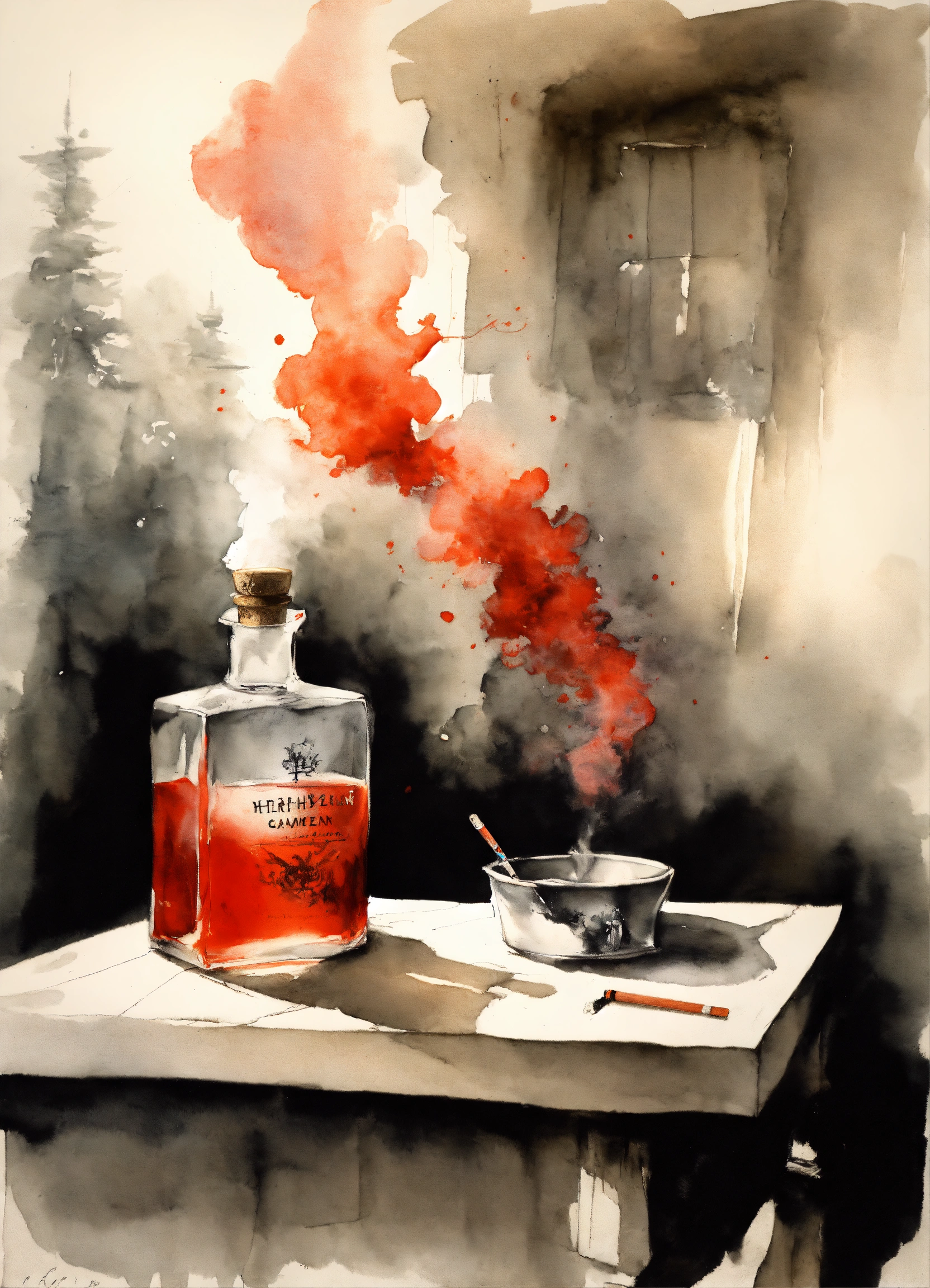 Stephen gammell style, dessin, aquarelle, aquarelles, noir et blanc et rouge, de marais, de sombres créatures, dégoulinant, a cigarette in an ashtray which lets out whitish smoke on a table next to a bottle of whiskey
