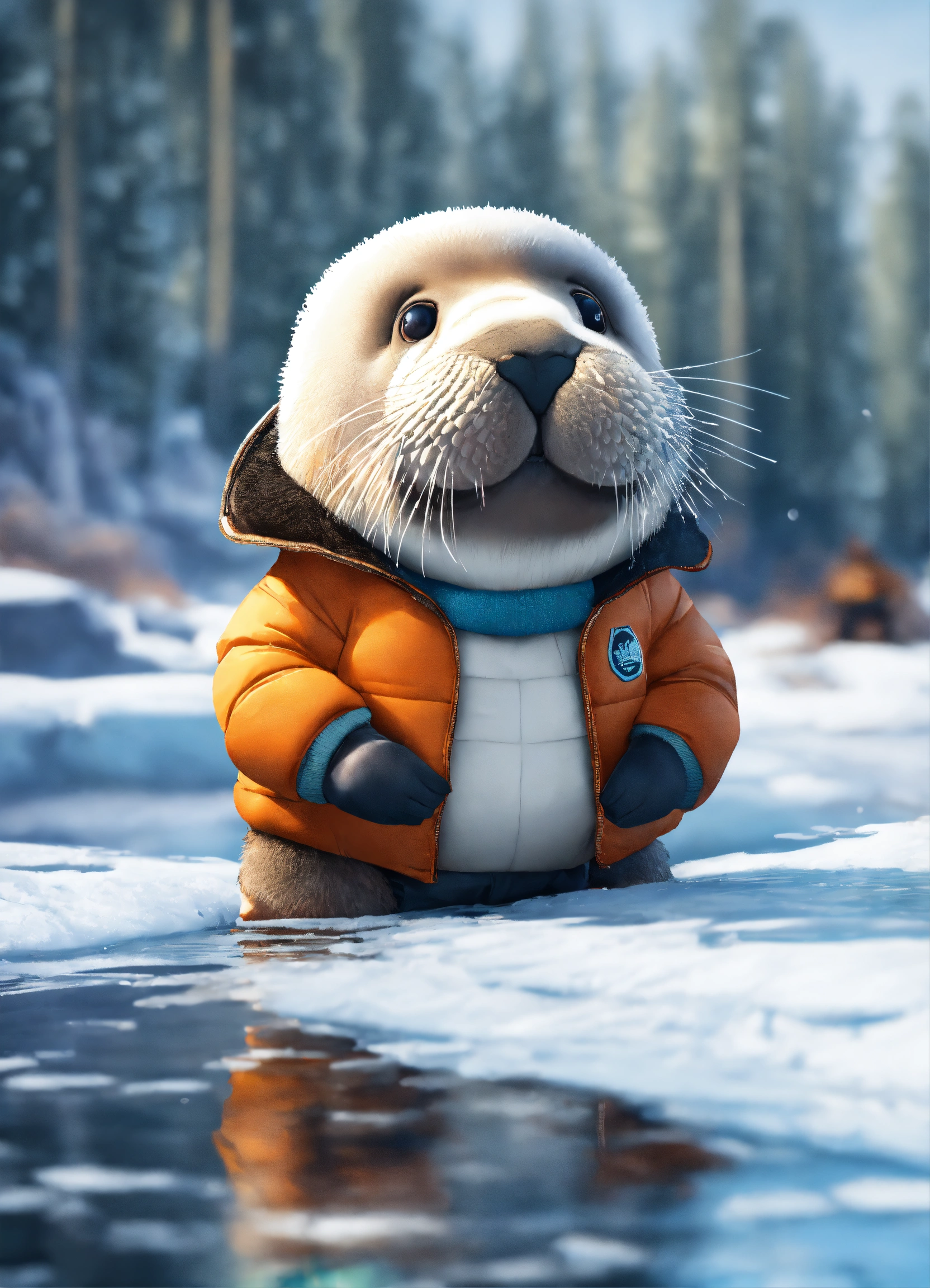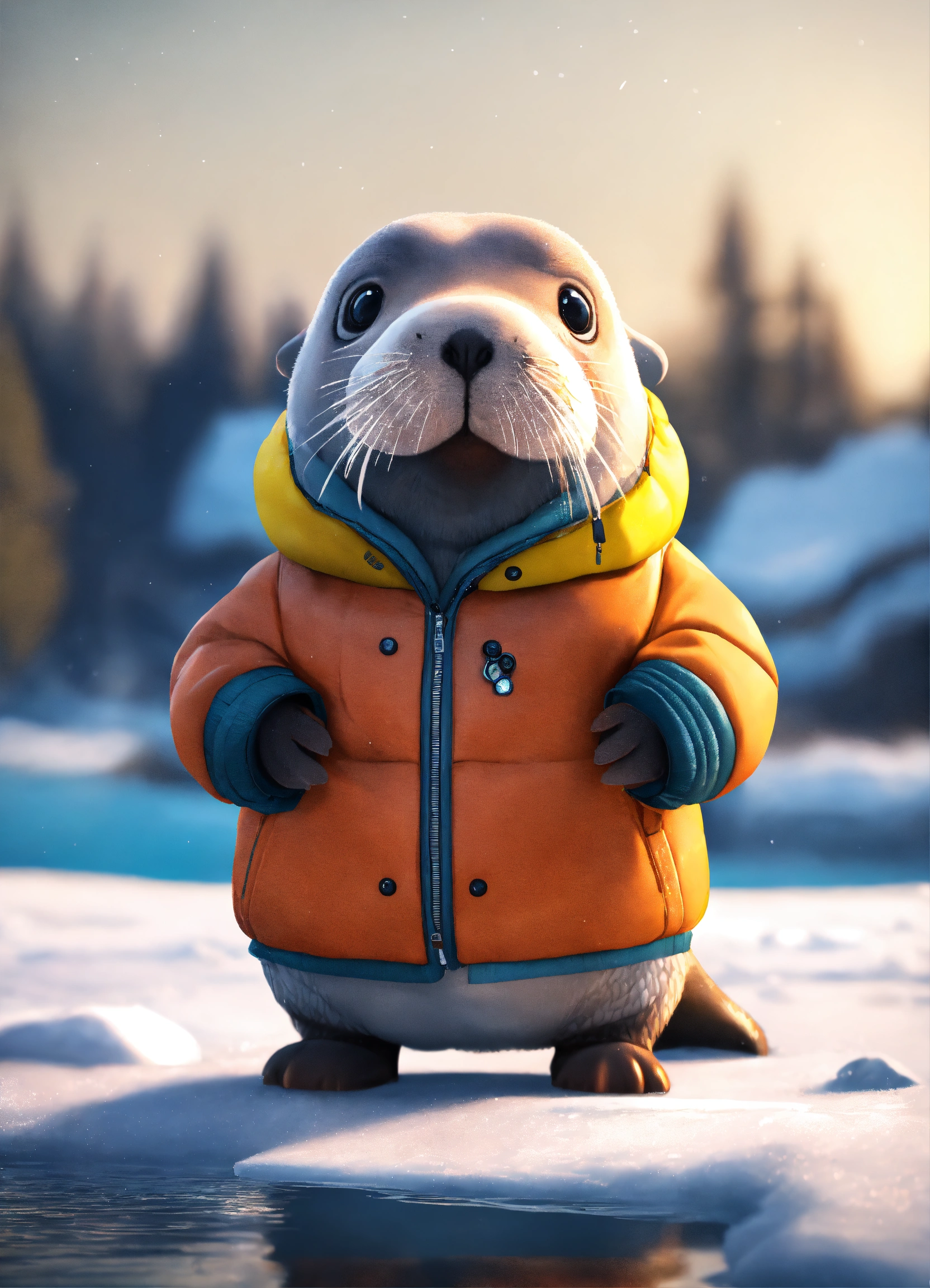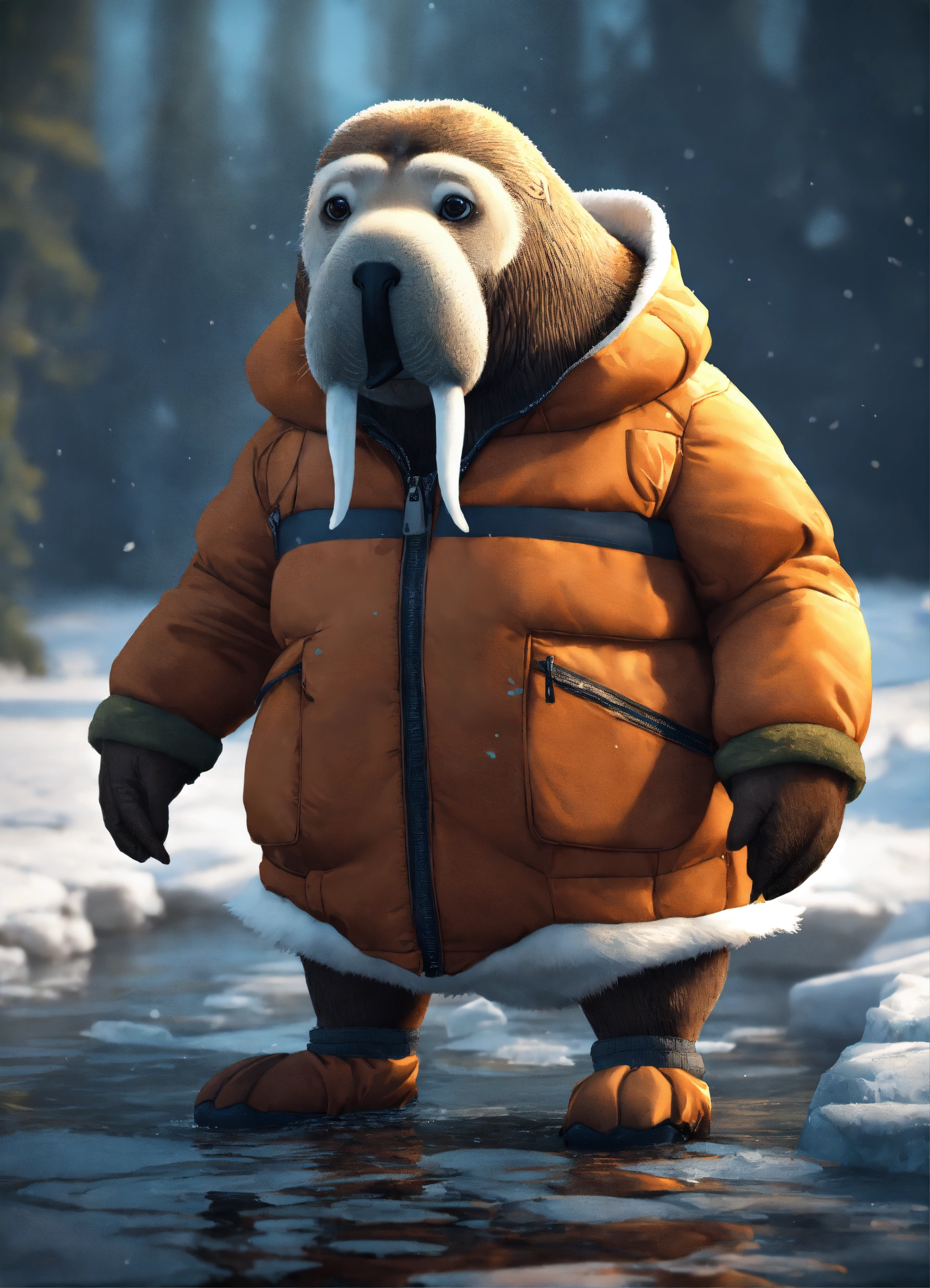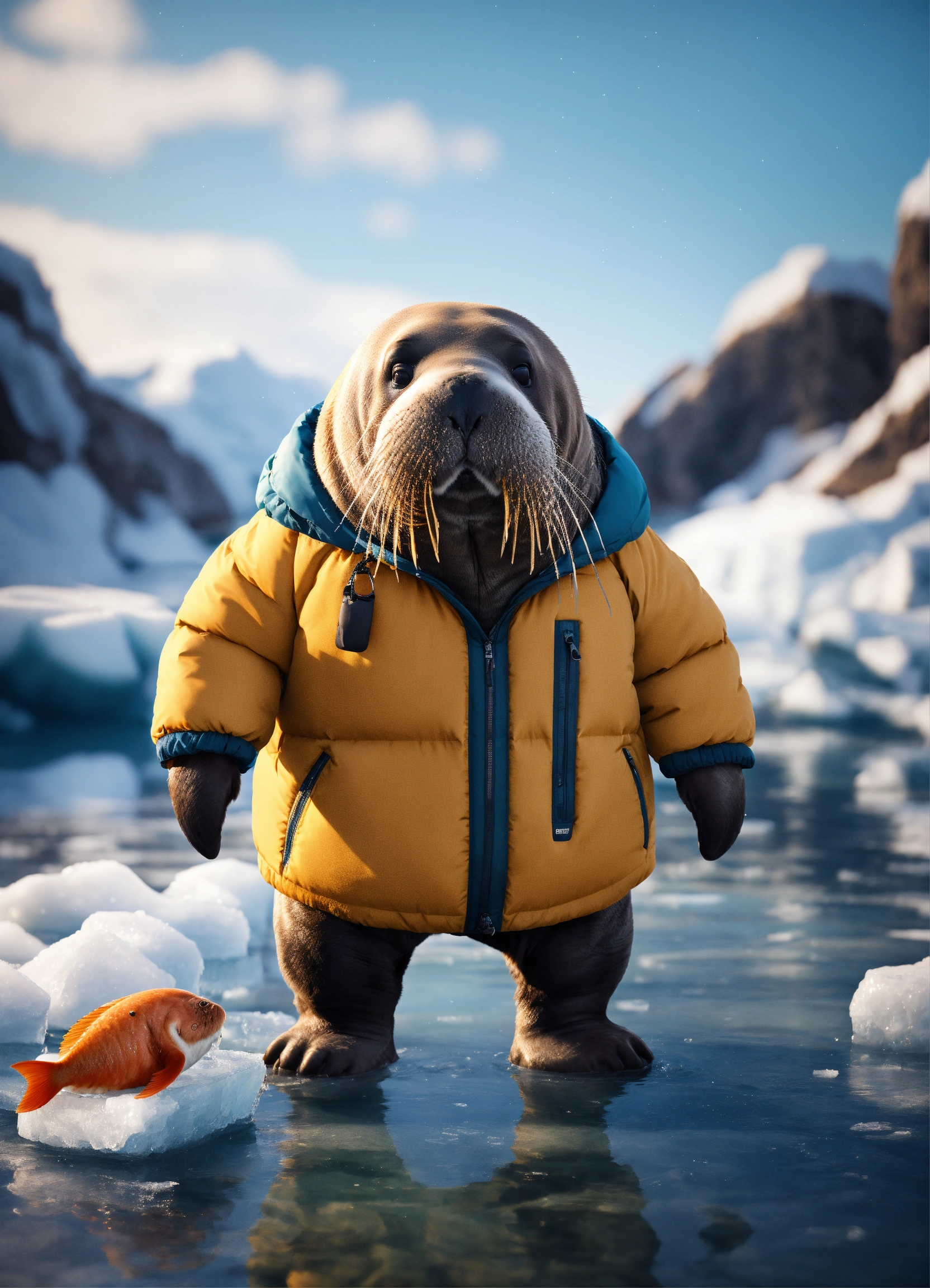 A cute walrus, wearing a puffer jacket standing on ice next the water, eating fish, on it unreal engine render