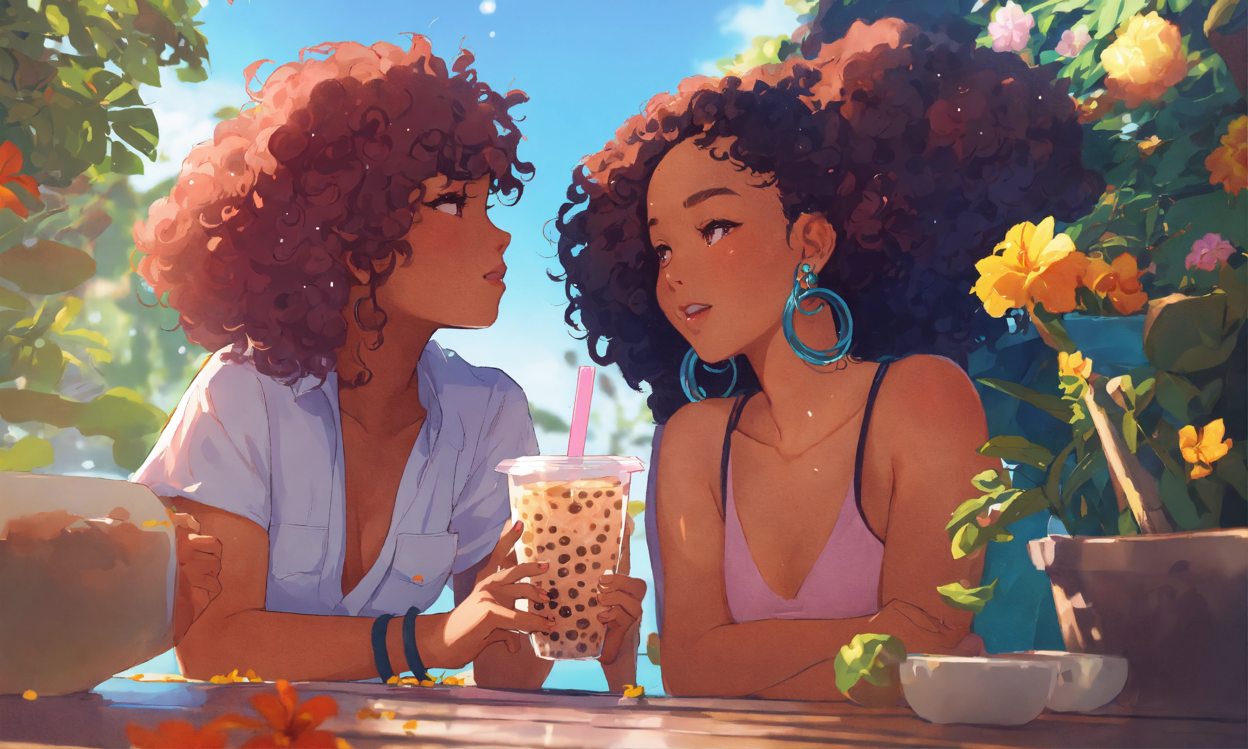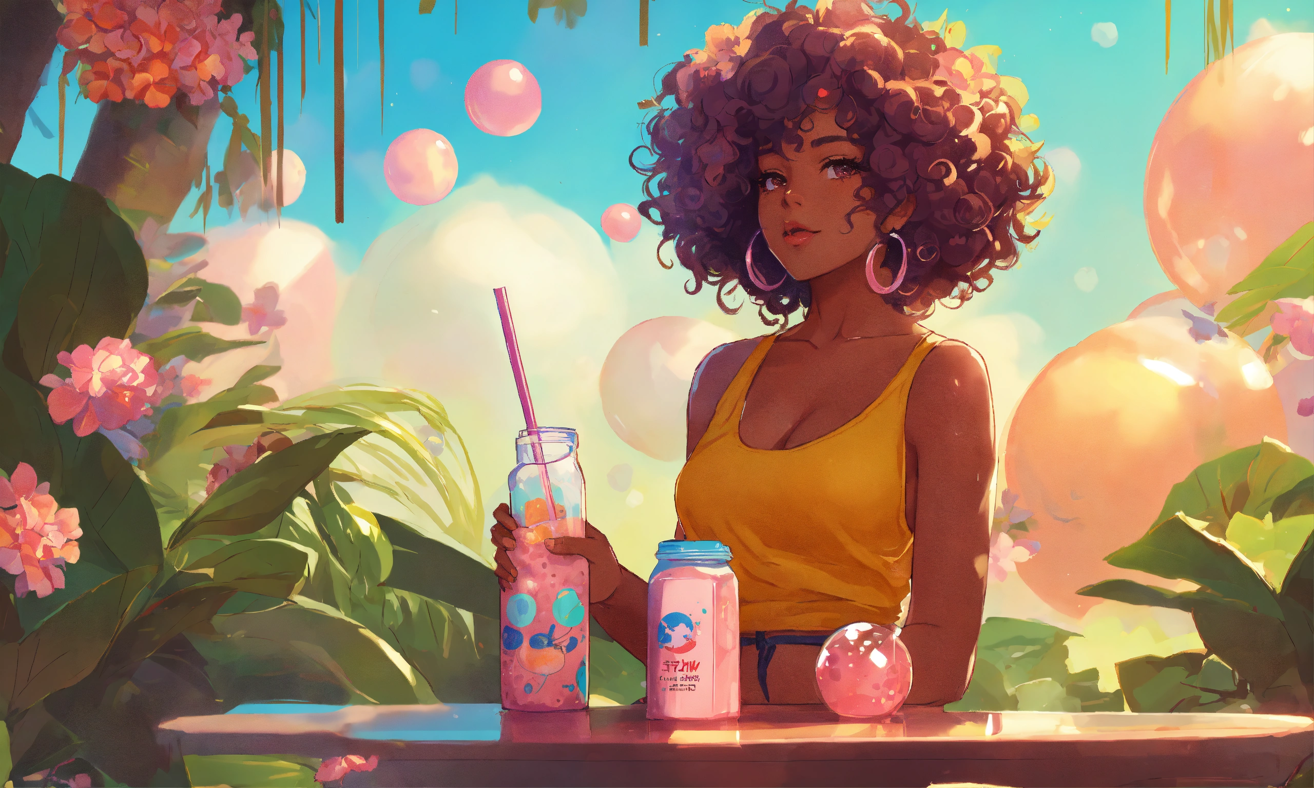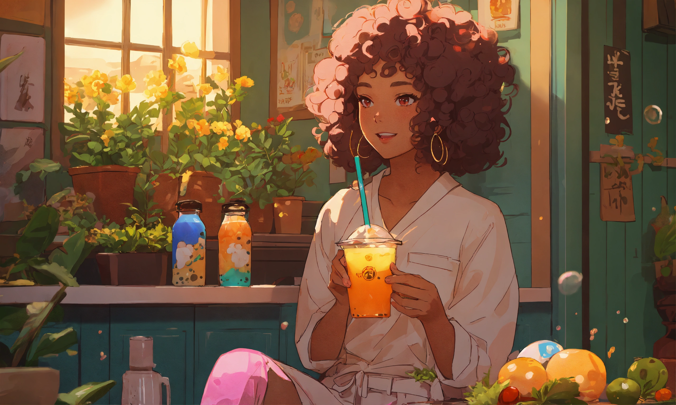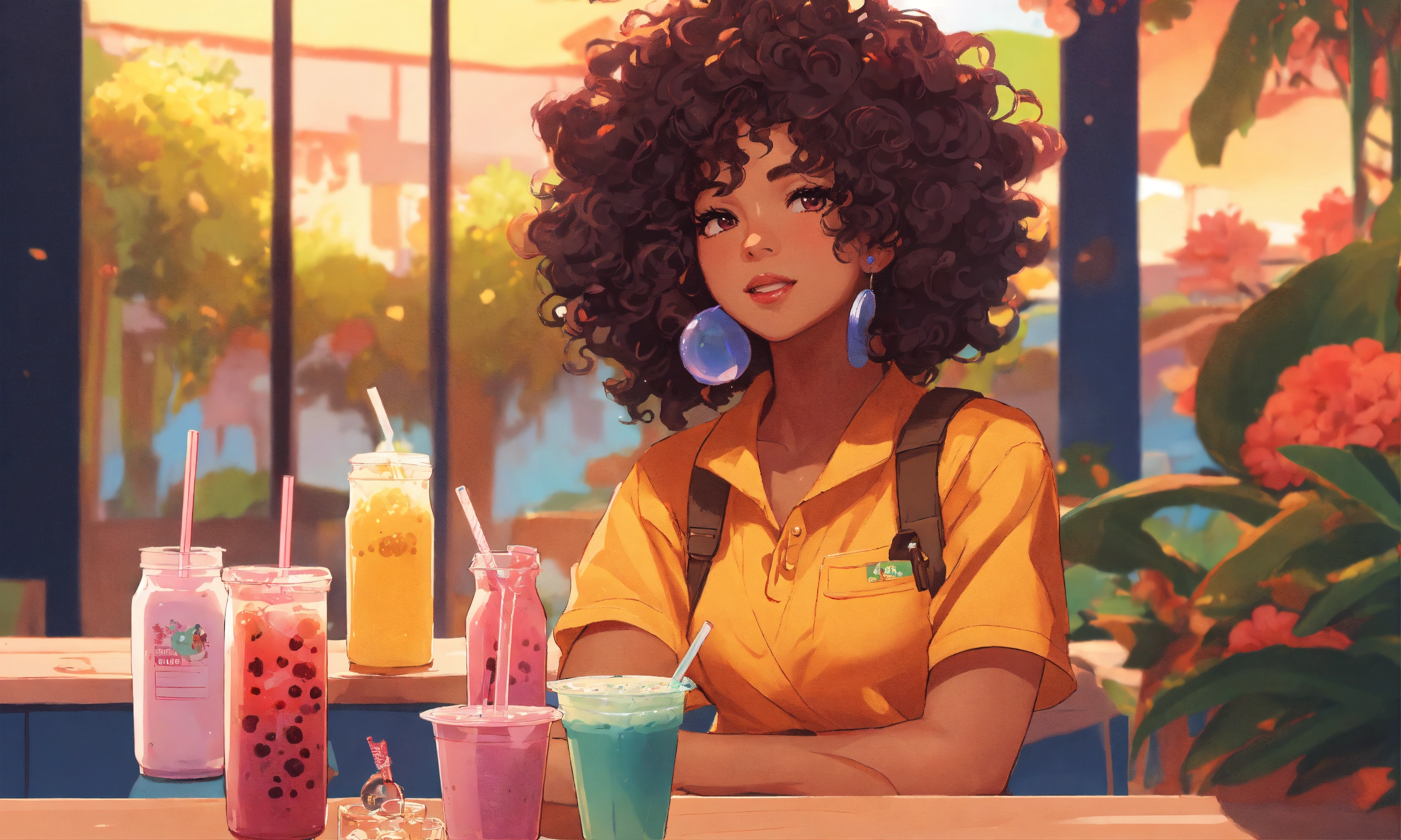 Bubble tea vector, curly locks, joy, bubble tea, milk tea, island girl, tropical, exotic flowers, bubble tea, bubble tea, cute girl, curly hair, cute waifu, afro, girlie, style of laurie greasley, studio ghibli, akira toriyama, james gilleard, genshin impact, trending pixiv fanbox, acrylic palette knife, 4k, vibrant colors, devinart, trending on artstation, low details.