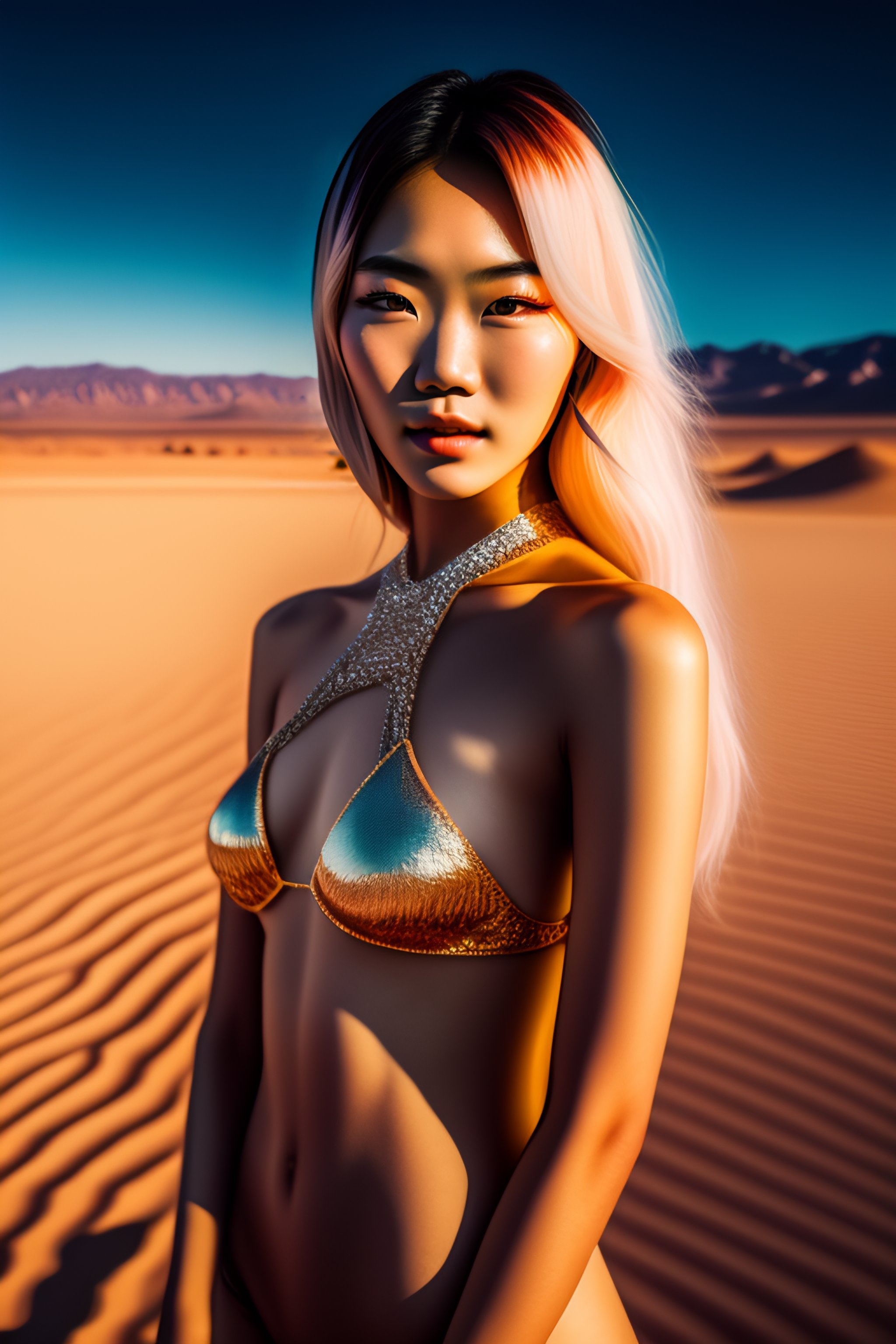 Realistic photo of slight smile, korean female model in bikini photoshoot in desert at night, full body portrait, beautiful, at coachella, 18 years old, two piece, coachella outfit, stringy material design, feminine, high contrast, strong shadows, blonde, hair partial highlight