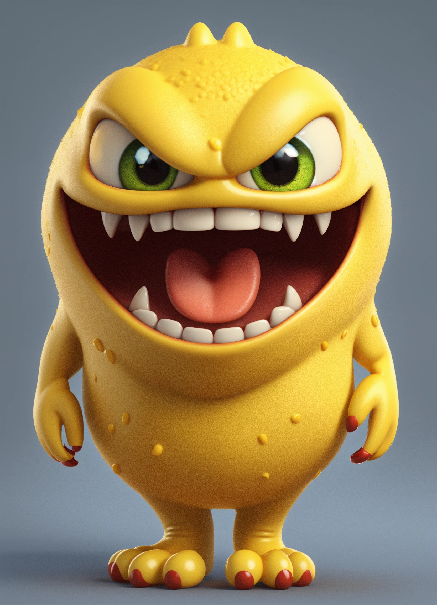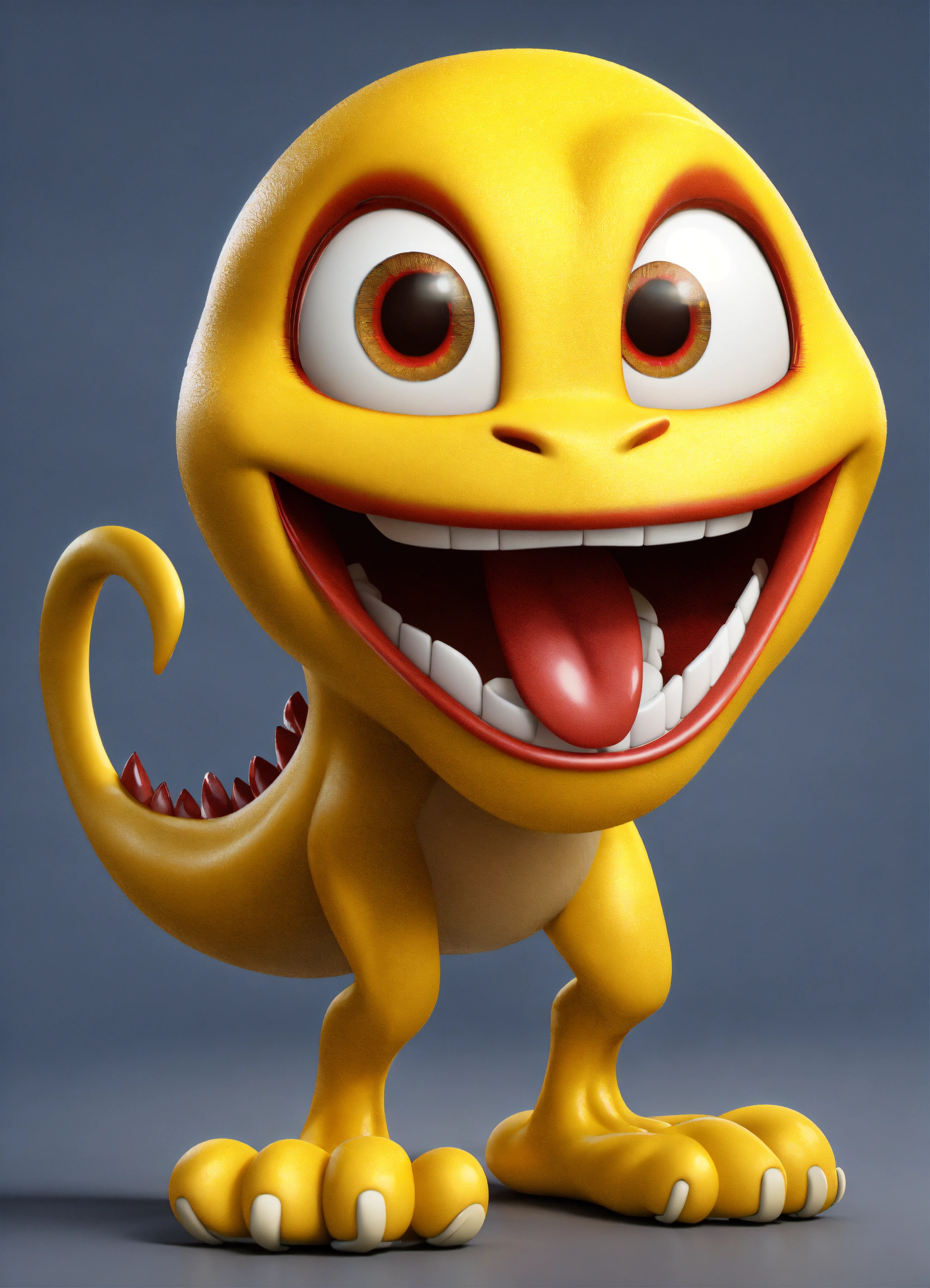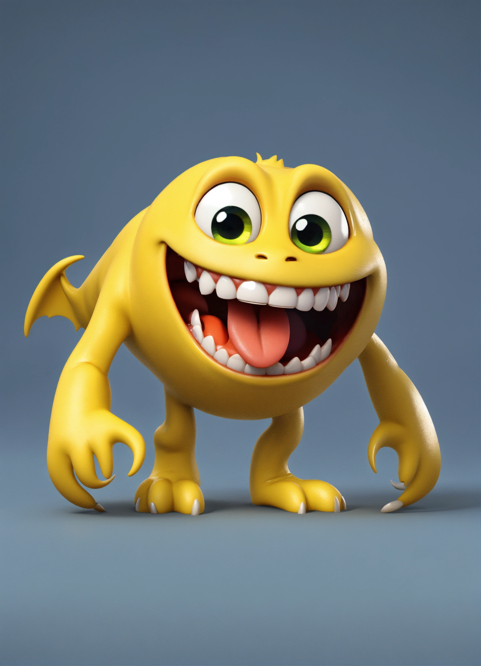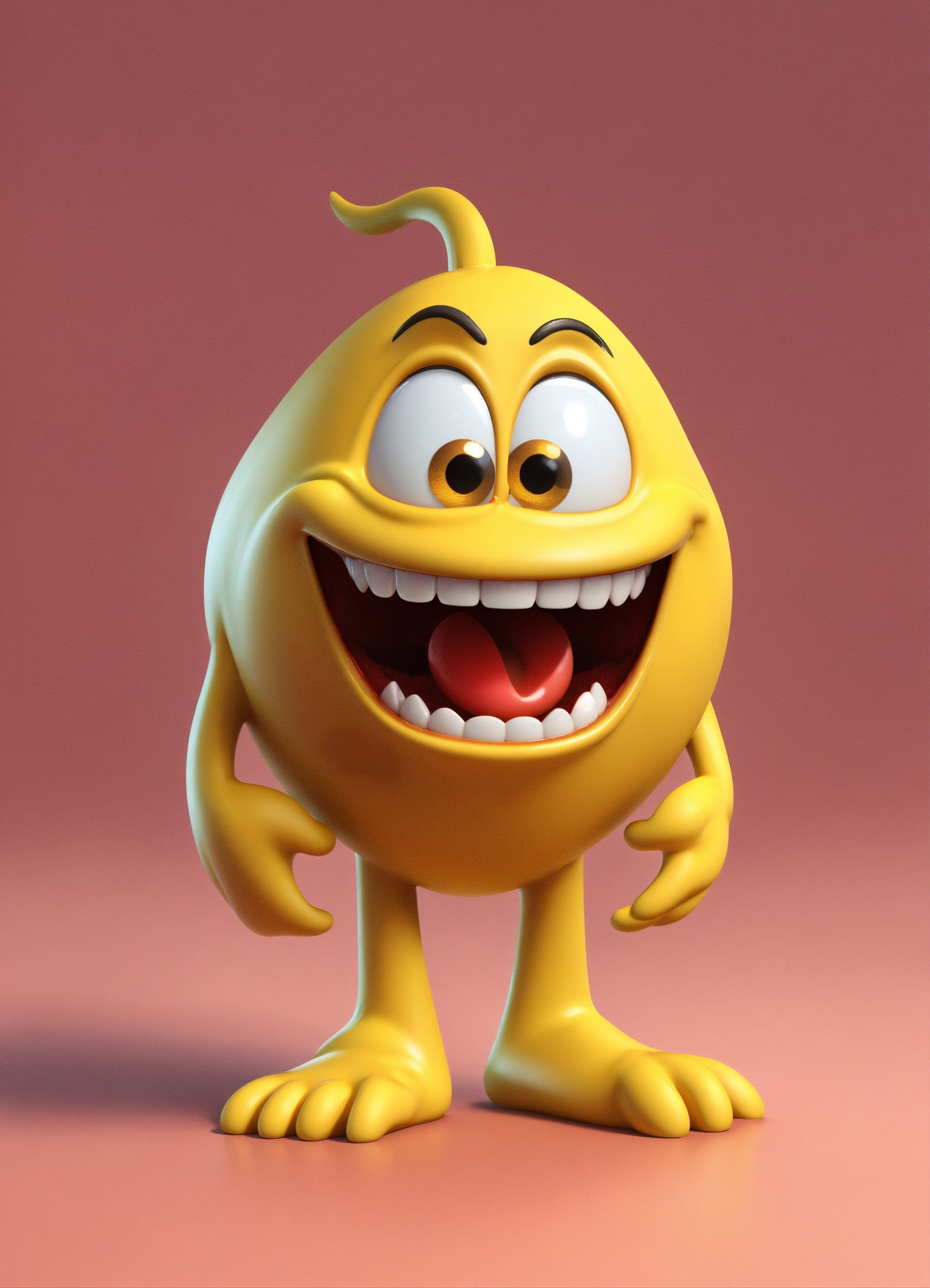 3d realistic emoji with hand and foot look pixar monster inch, yellow color, toothless, droopy red eyes, glanced to the side, laugh