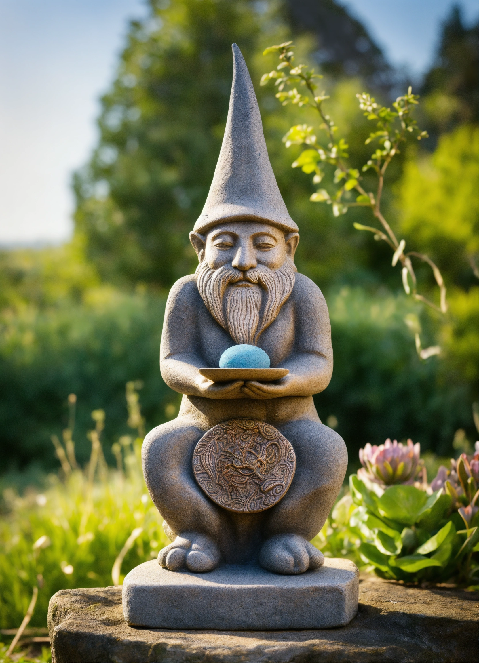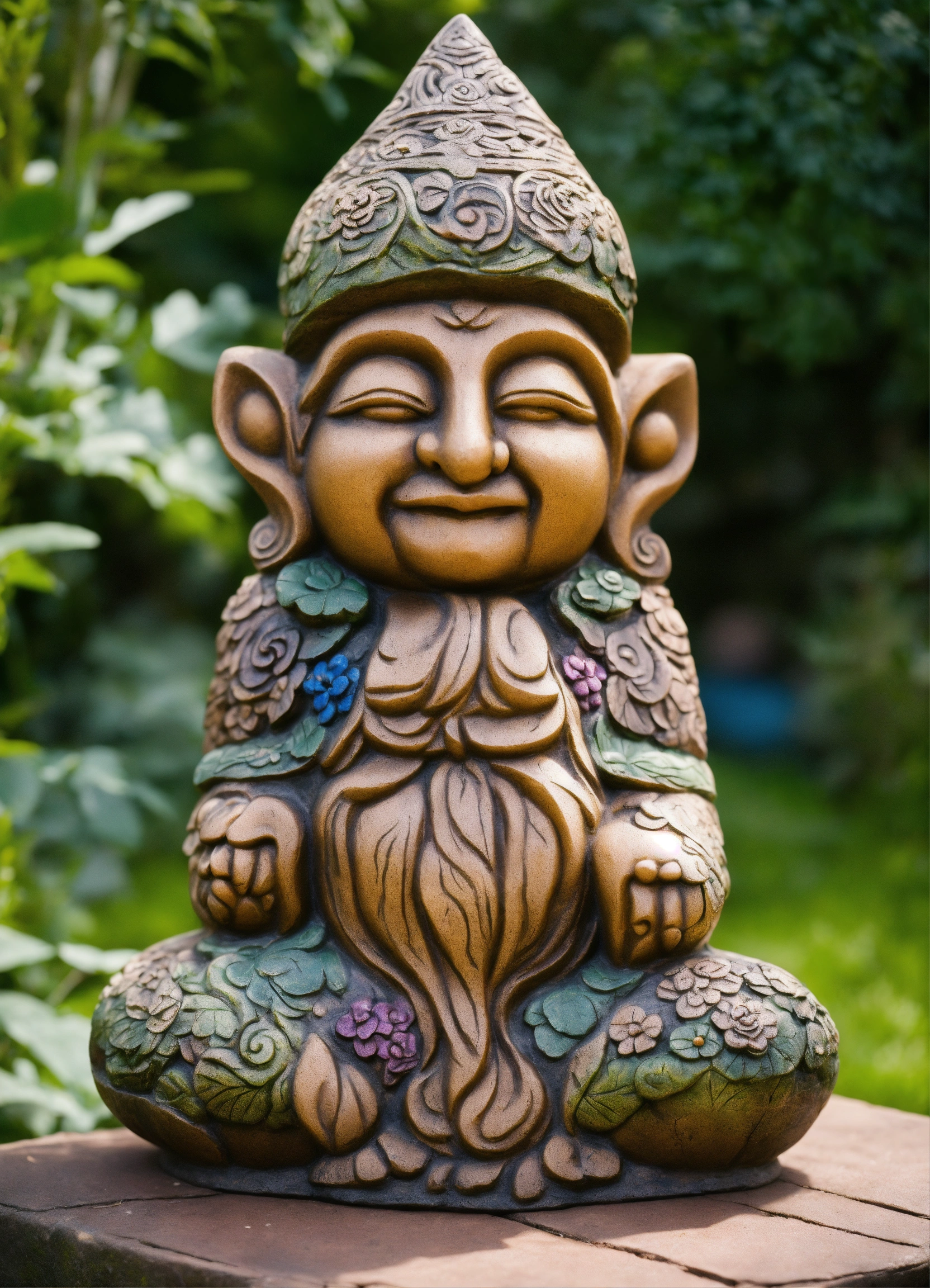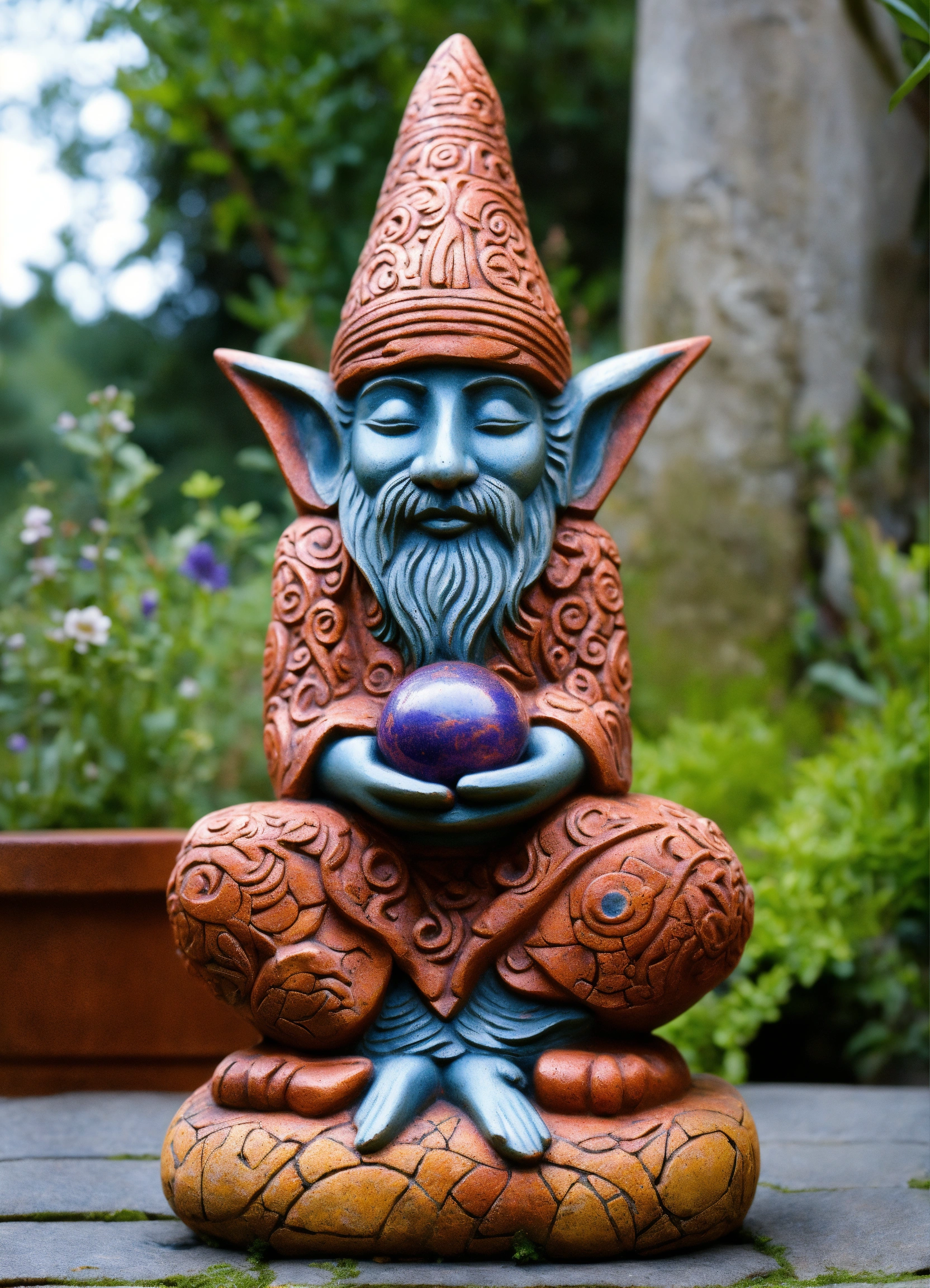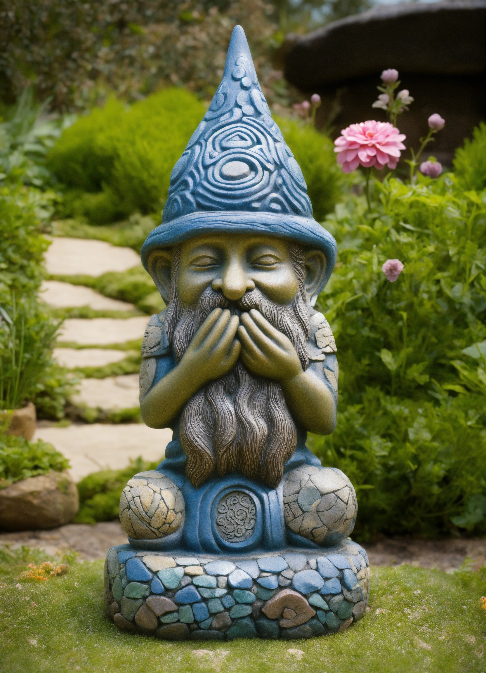 An ancient stone hand made meditative gnome totem style garden sculpture in the style of alex grey