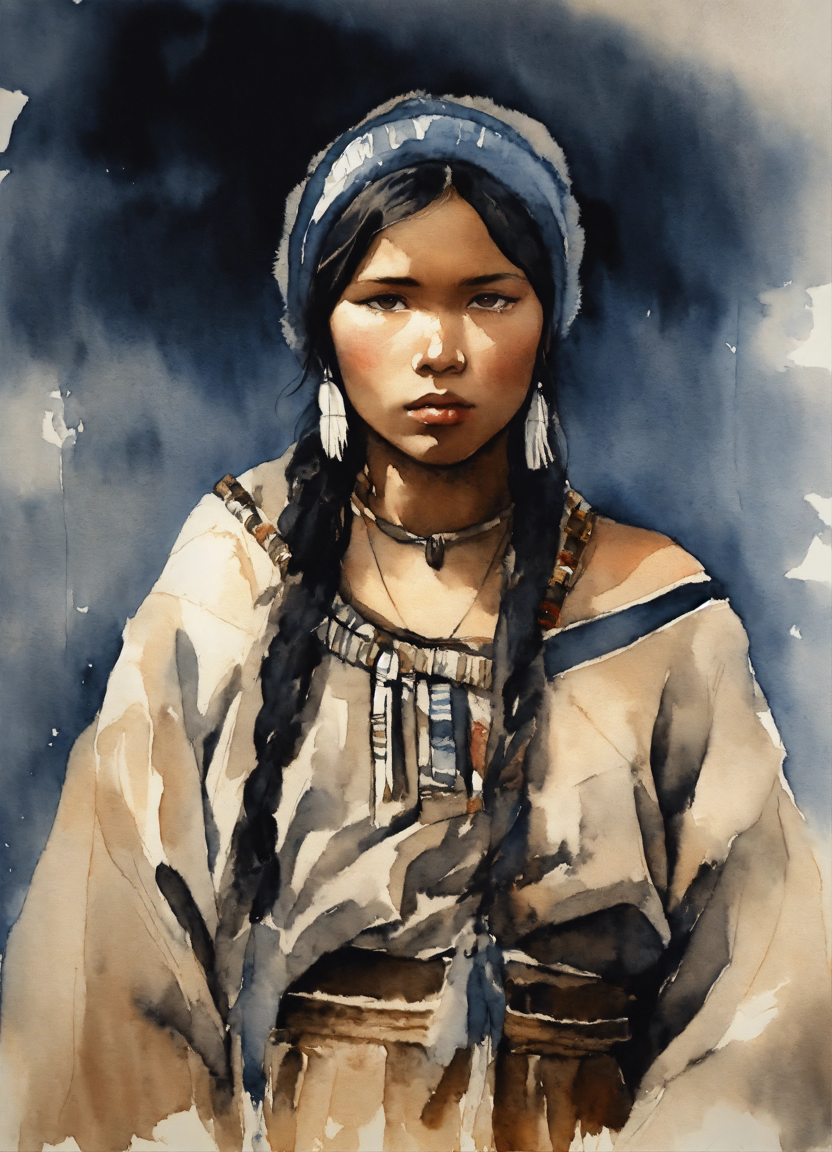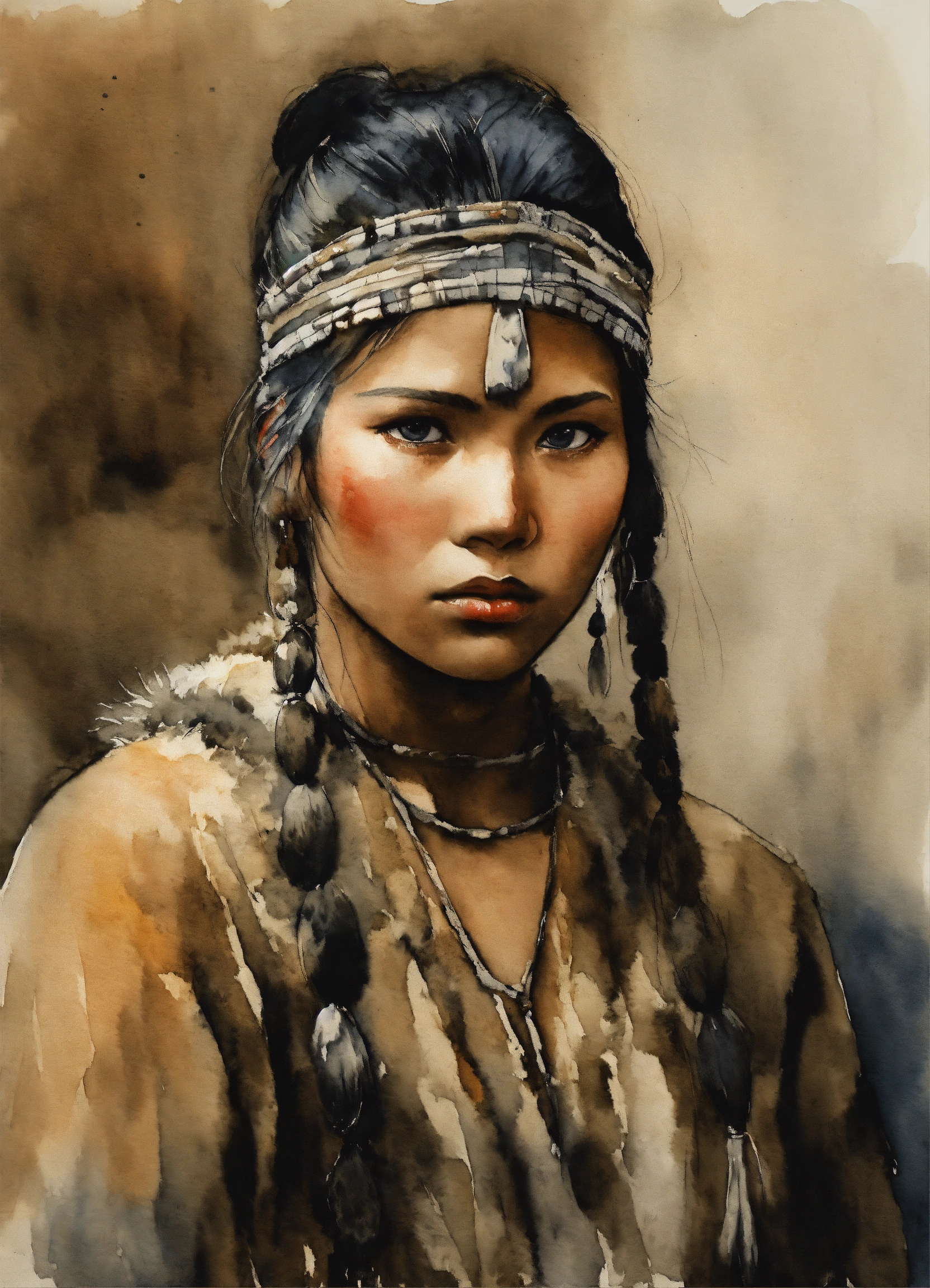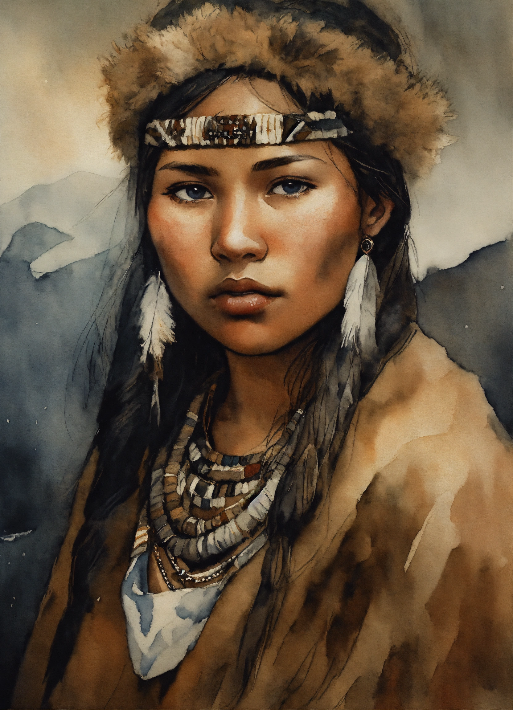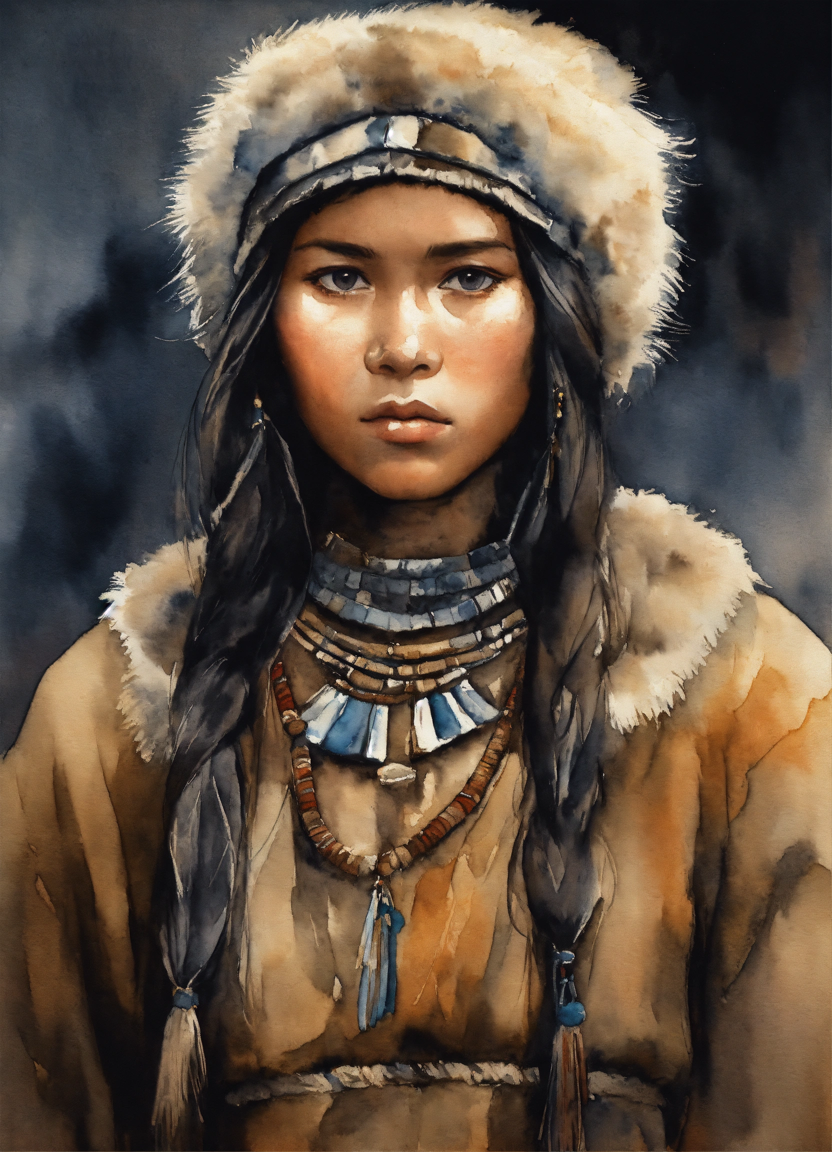Illustration by tom björklund of a siberian "aboriginal" young woman wearing arctic paleolithic clothing, tehuelche phenotype. watercolor painting by tom björklund, dark hues, gloomy and depressing, masterpiece.