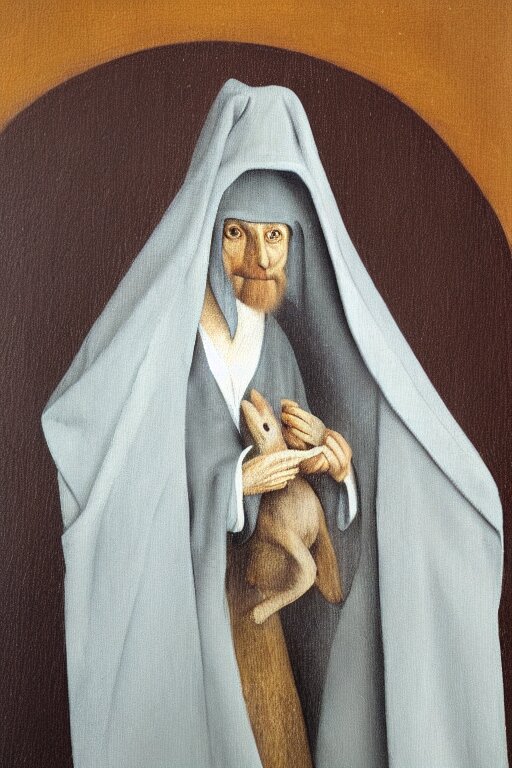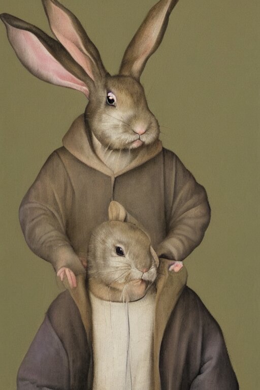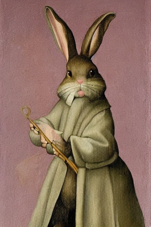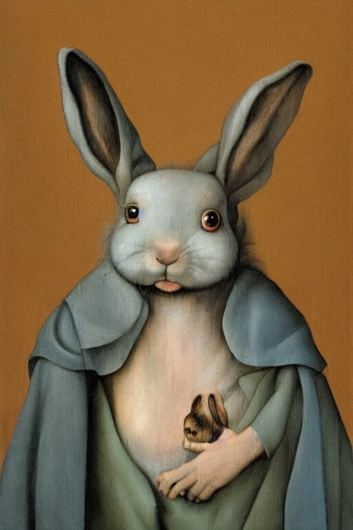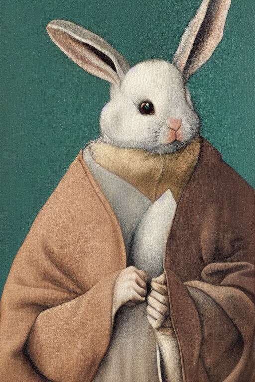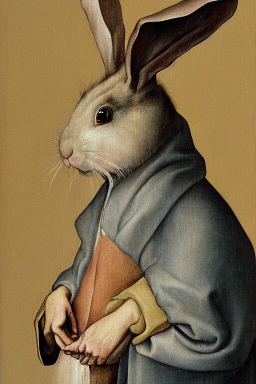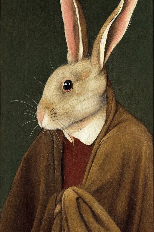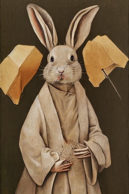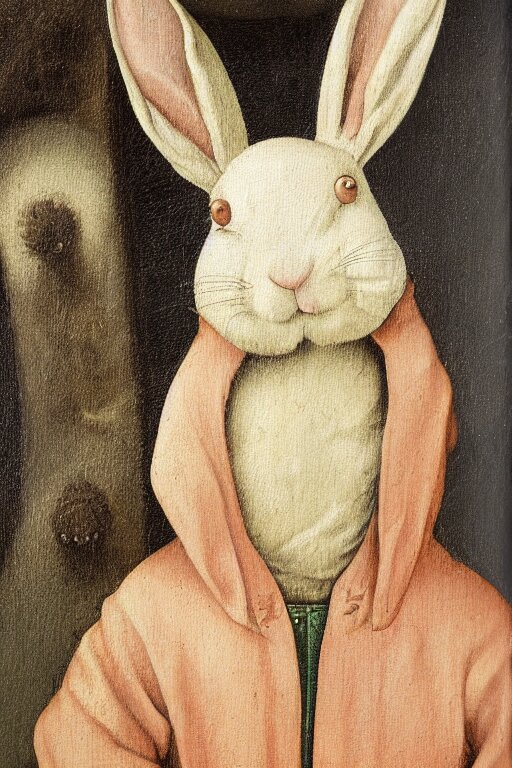 Silly hieronymus bosch oil painting portrait of a bunny in a coat