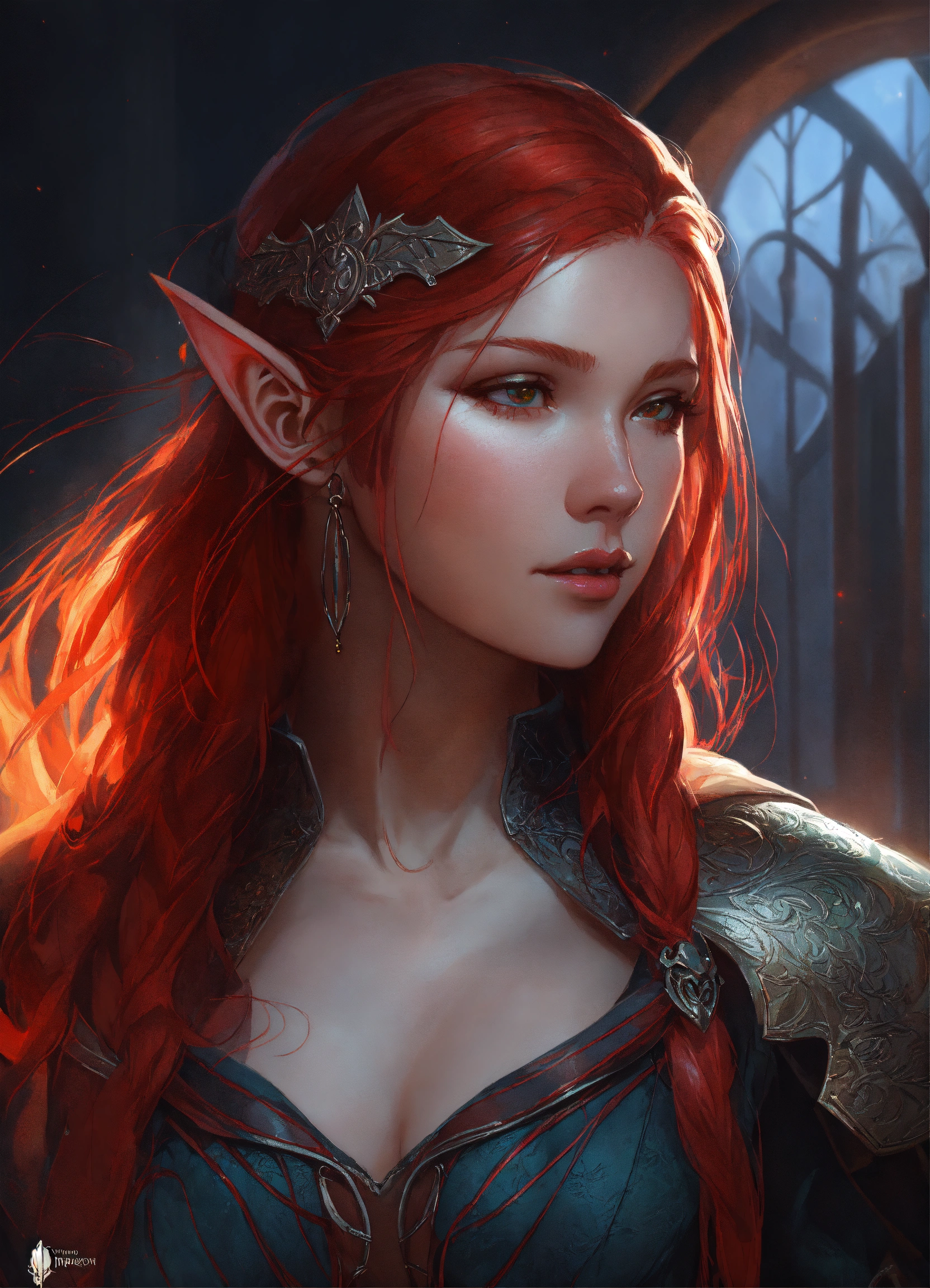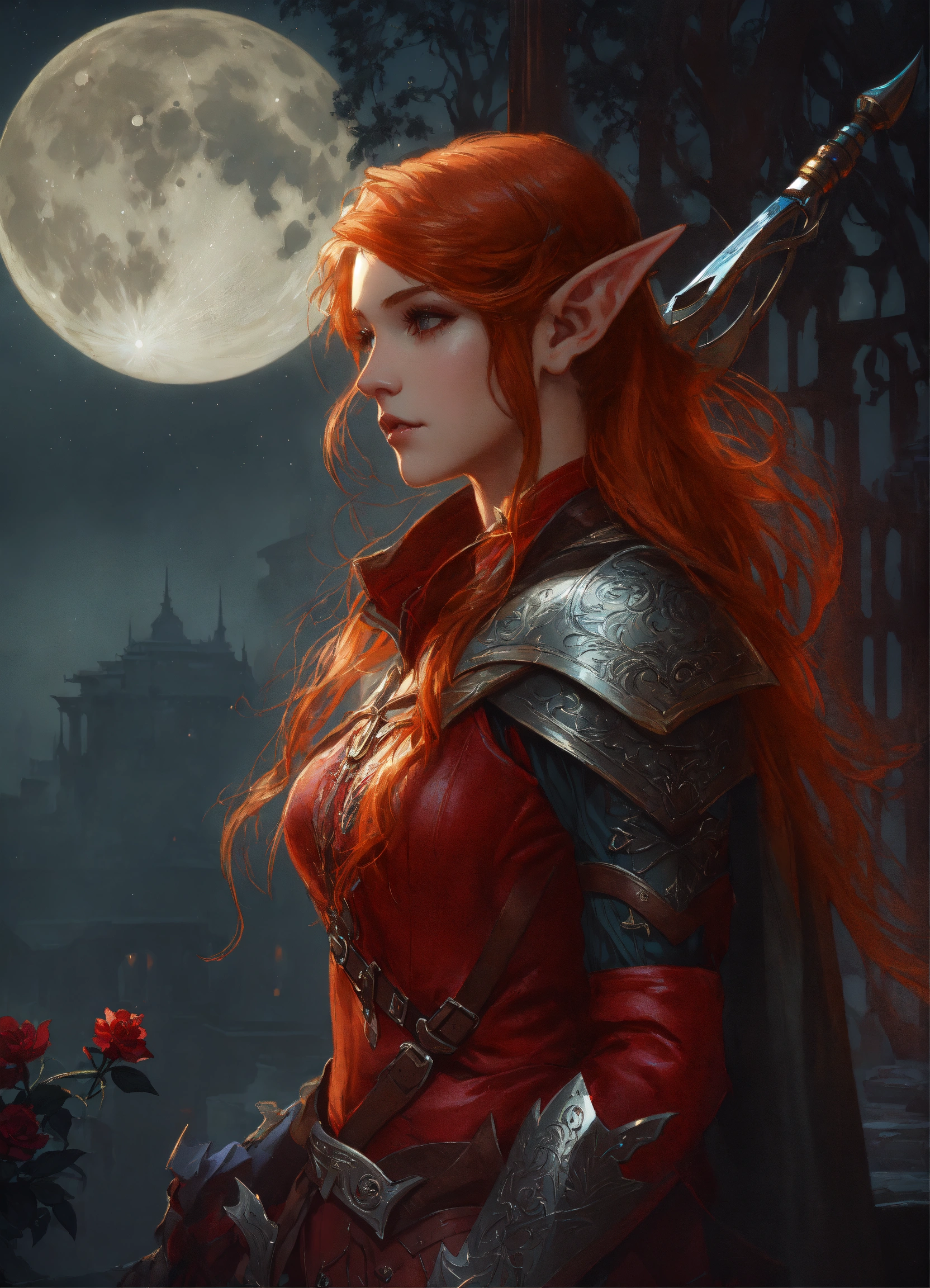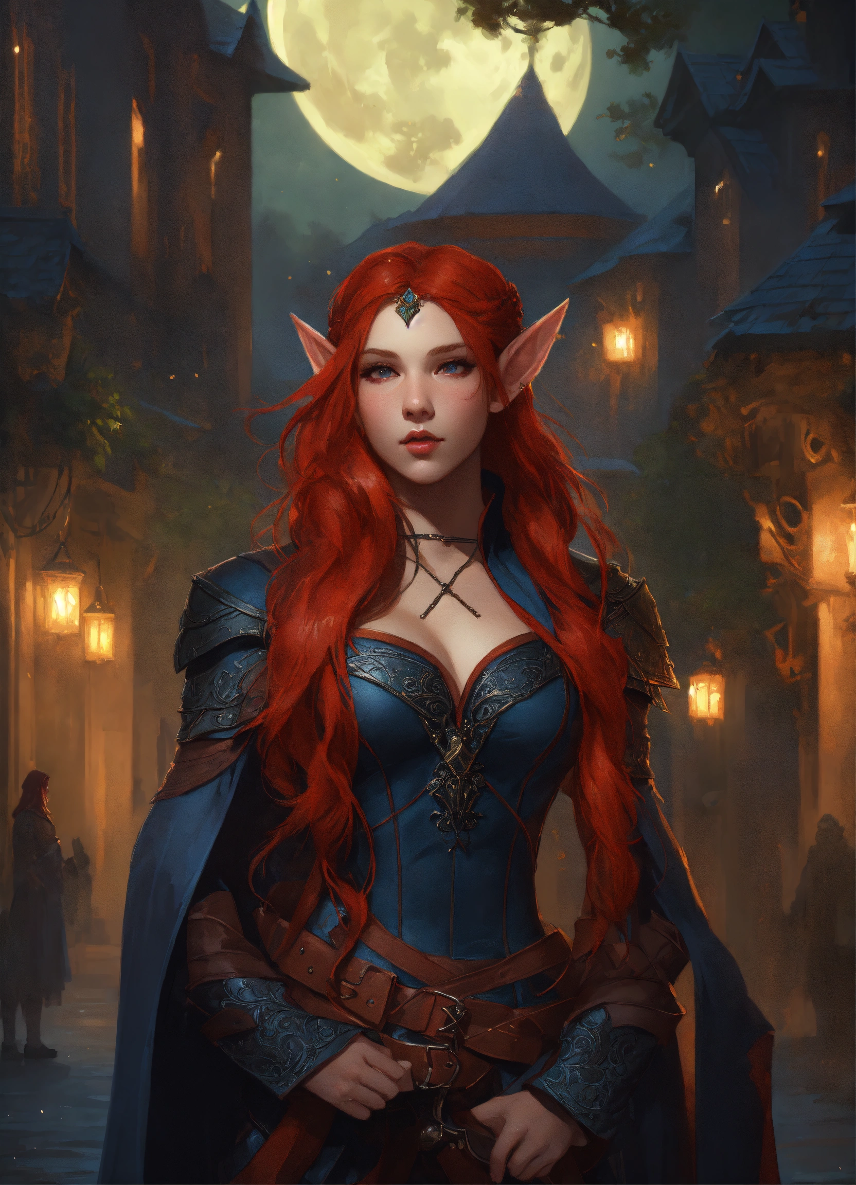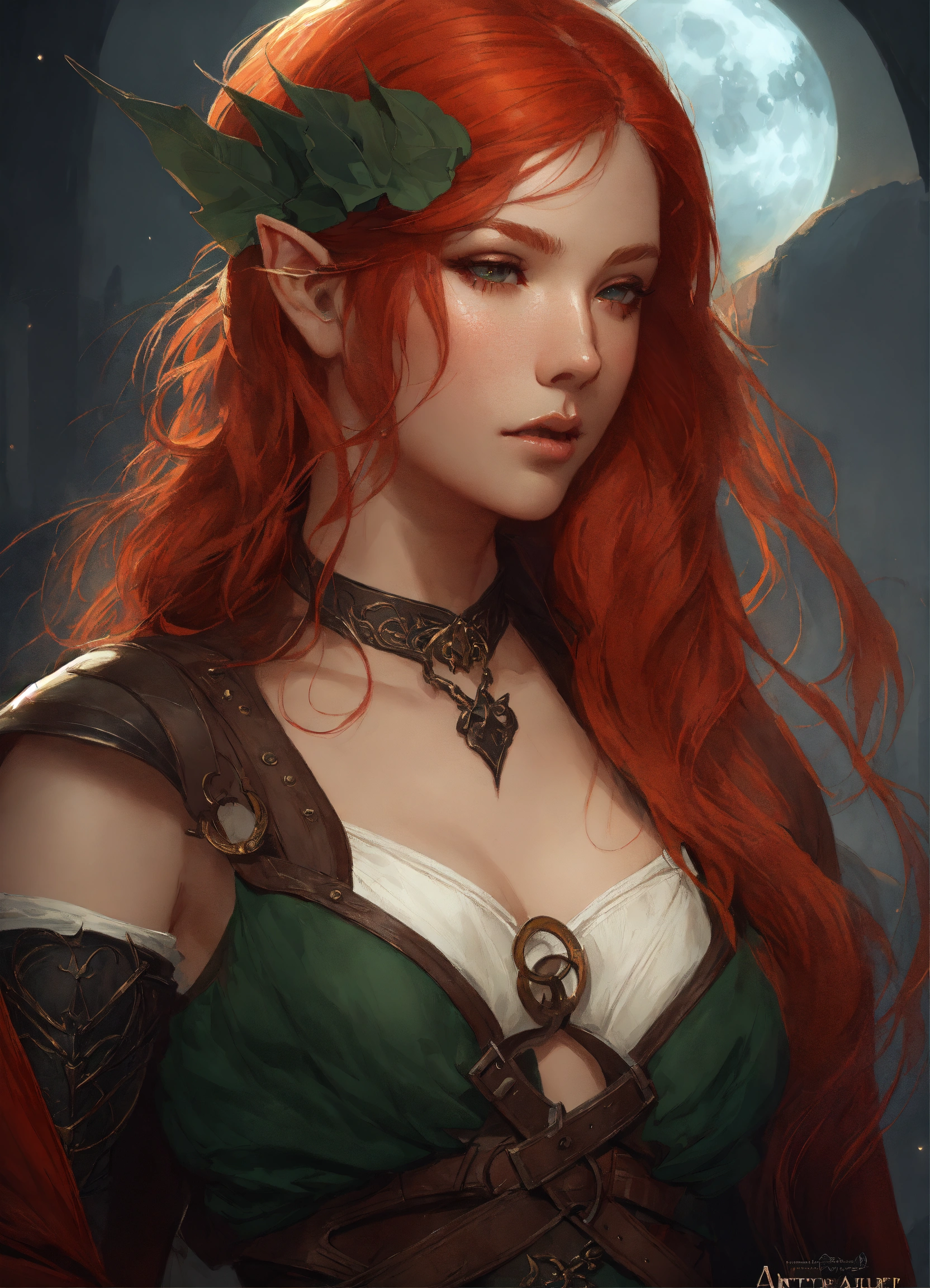 Beautiful, red hair, elf, long hair, mysterious moonlit night, intricate, sharp focus, illustration, highly detailed, digital painting, concept art, matte, art by wlop and artgerm and greg rutkowski and alphonse mucha, masterpiece, fantasy, elf ears, assassin, hunter, rogue, leather clothes, no armour, corset