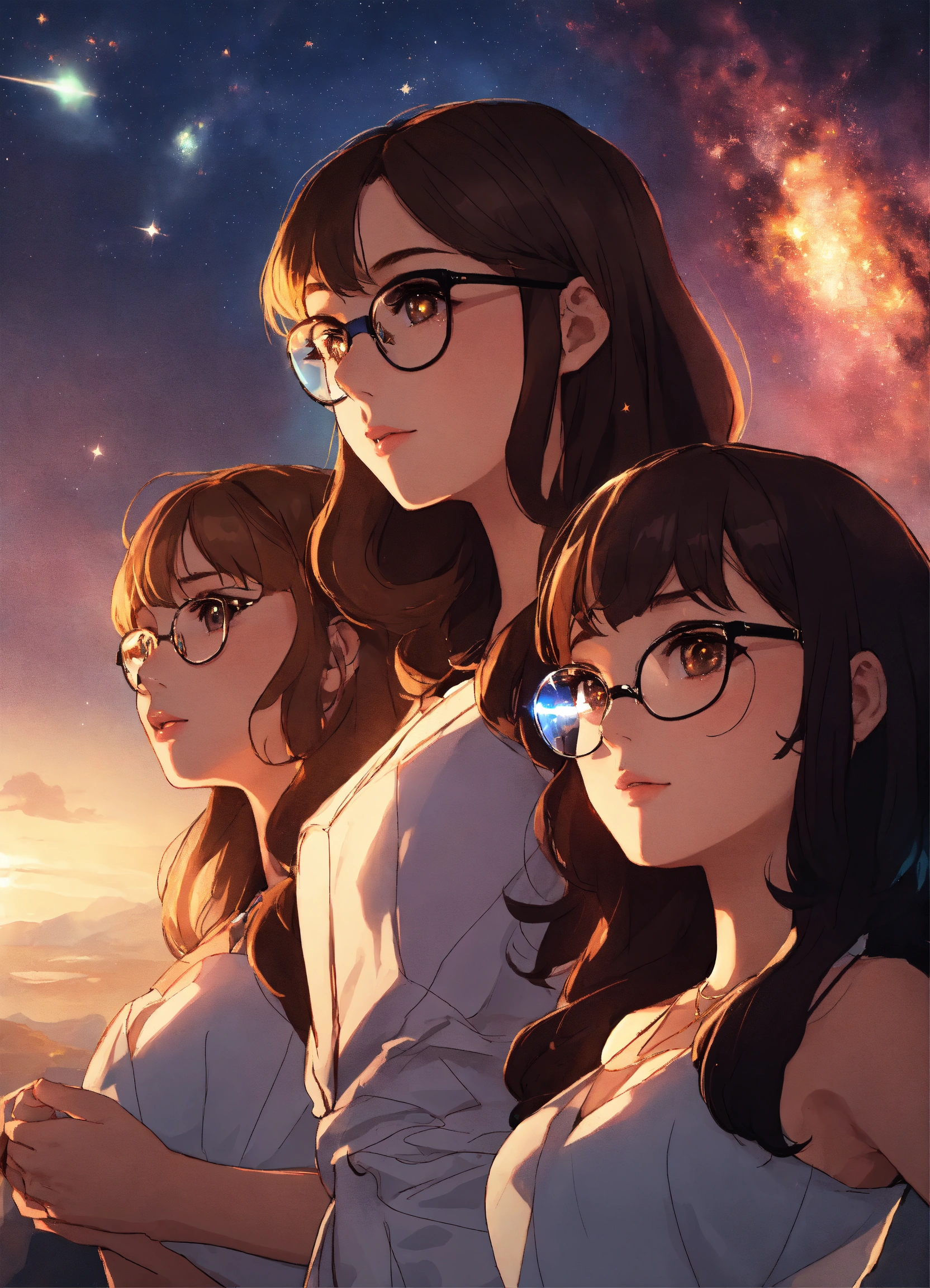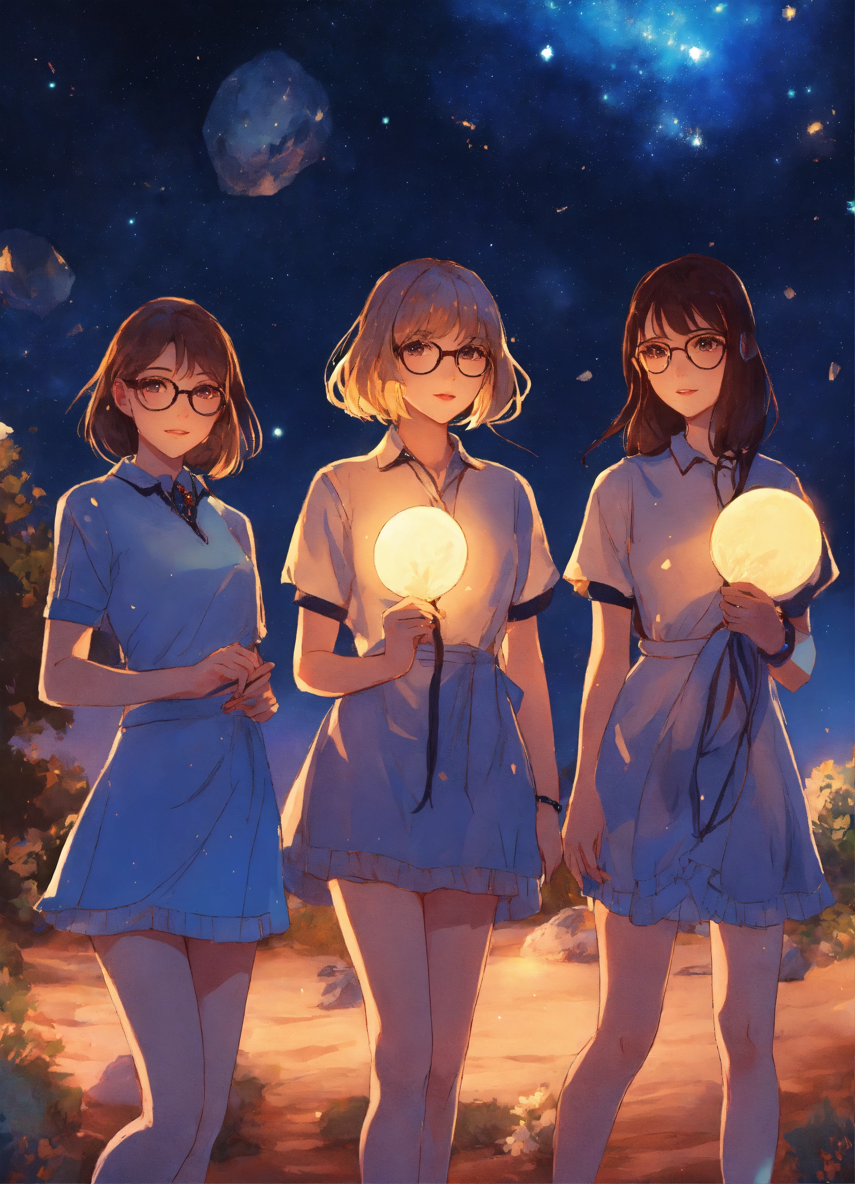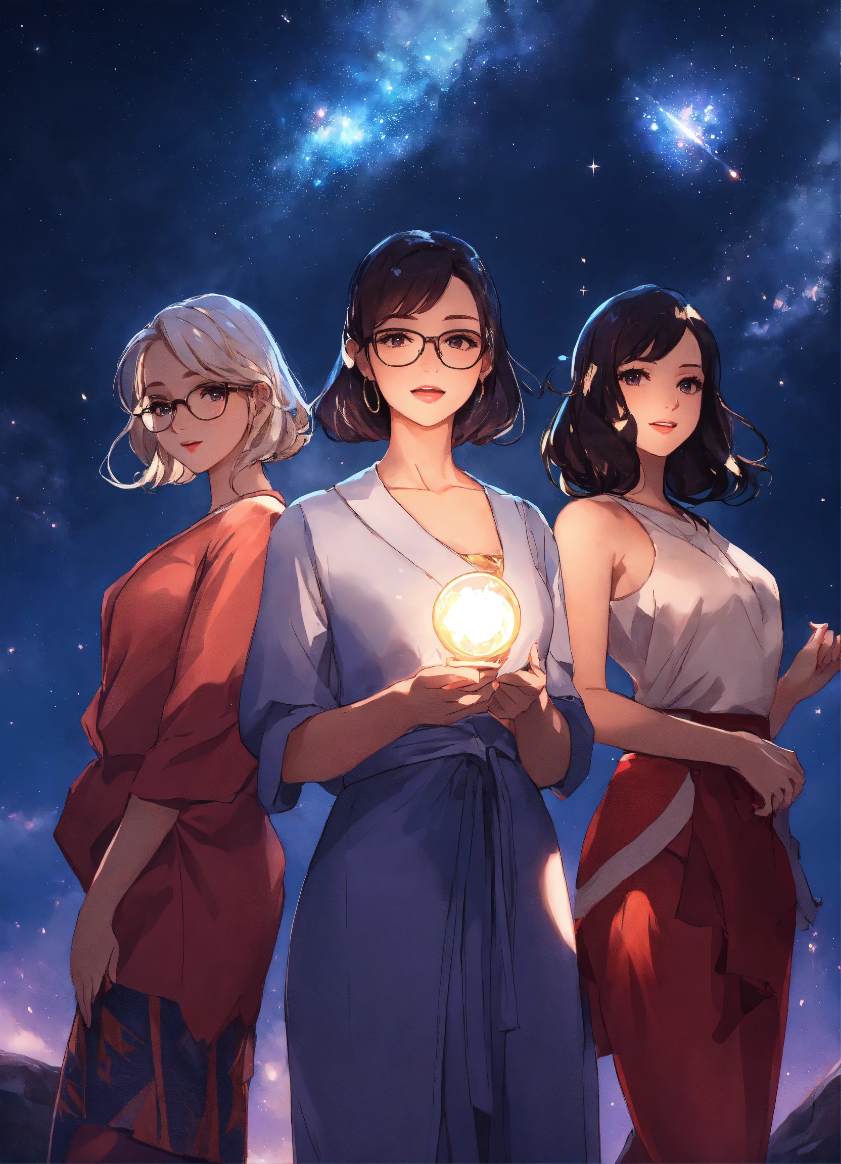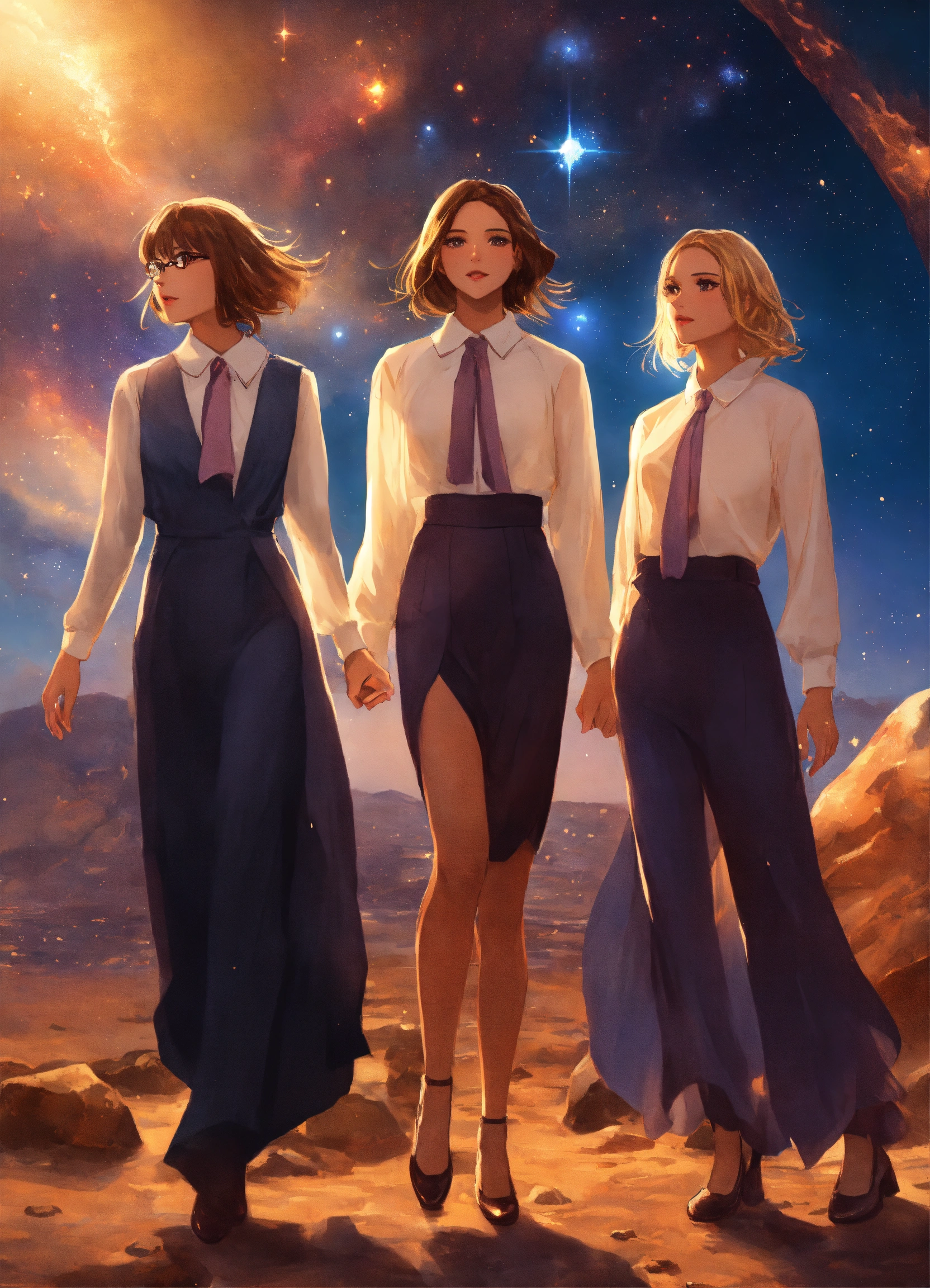 The three girls are a team of stars, background - orion galaxy, there are stones flying in the background, very beautiful, the first girl is a blonde with a bob and black-framed glasses, the second girl is a brunette with long hair, the third girl is a brunette with medium-length hair, girls in wedding suits, girls like goddesses are very beautiful - they emit light