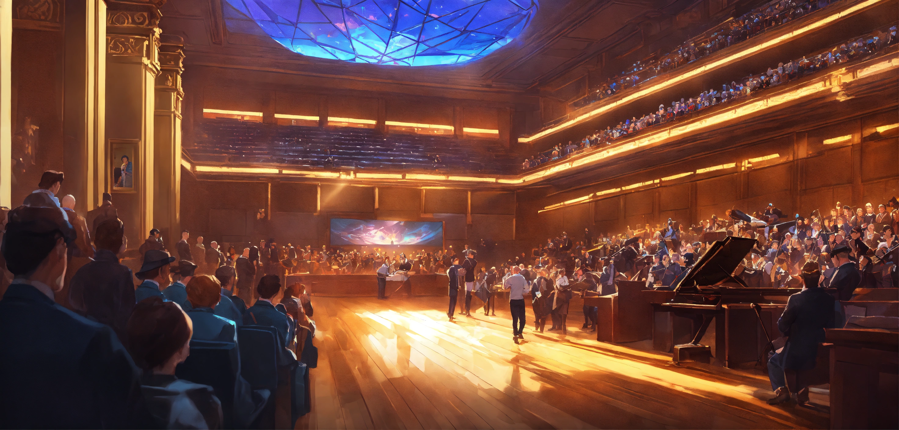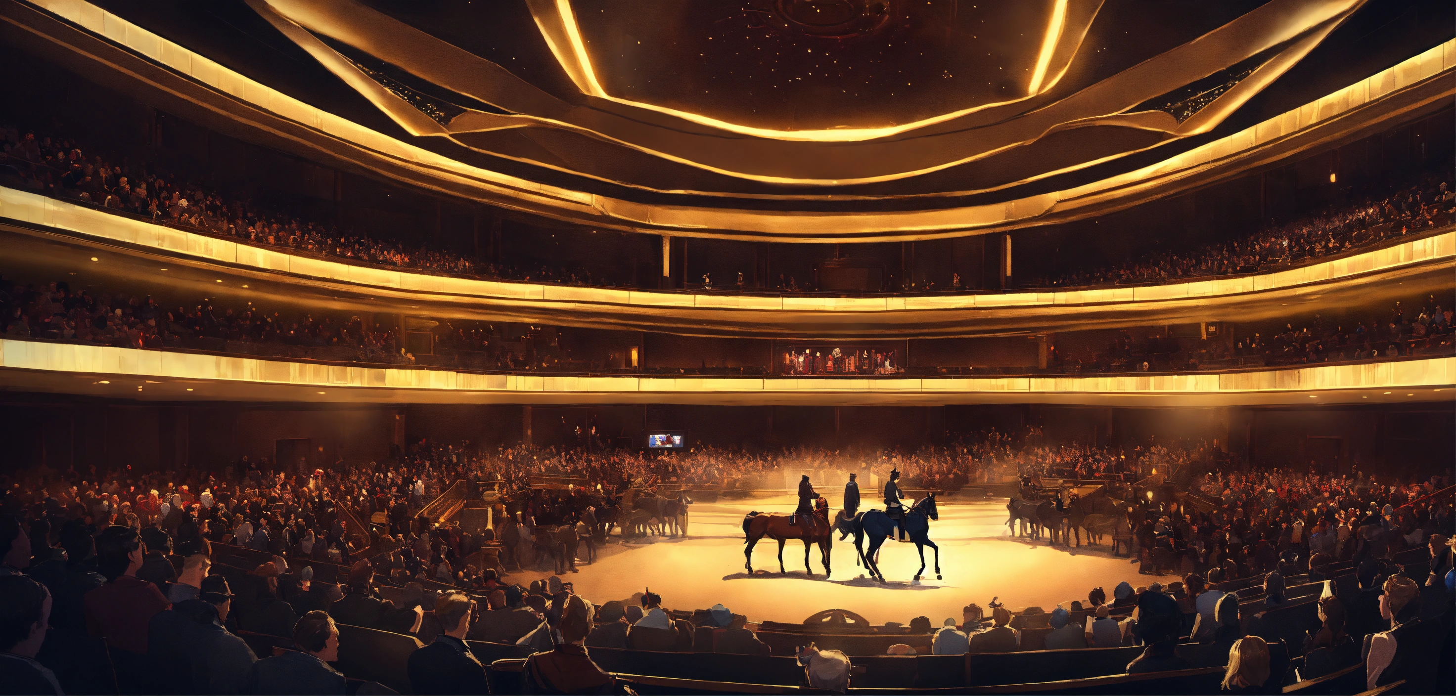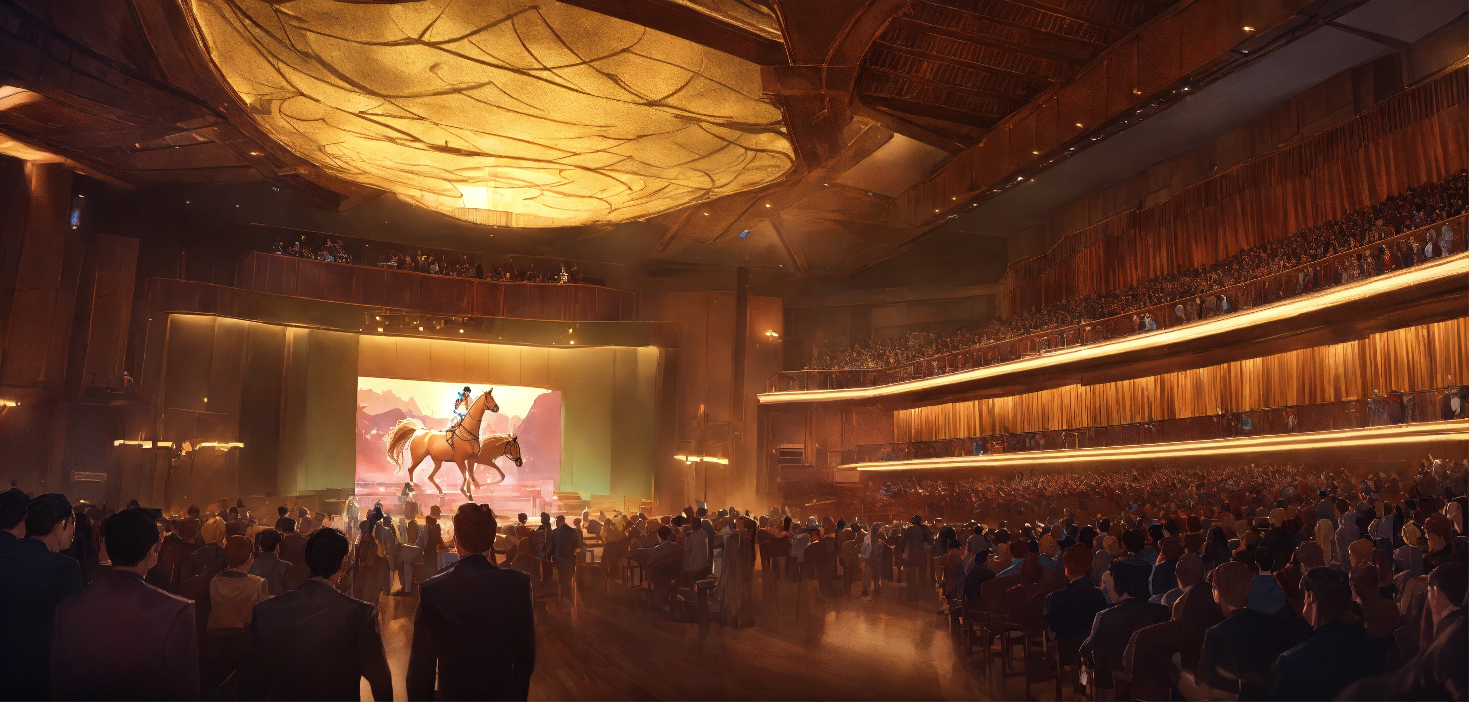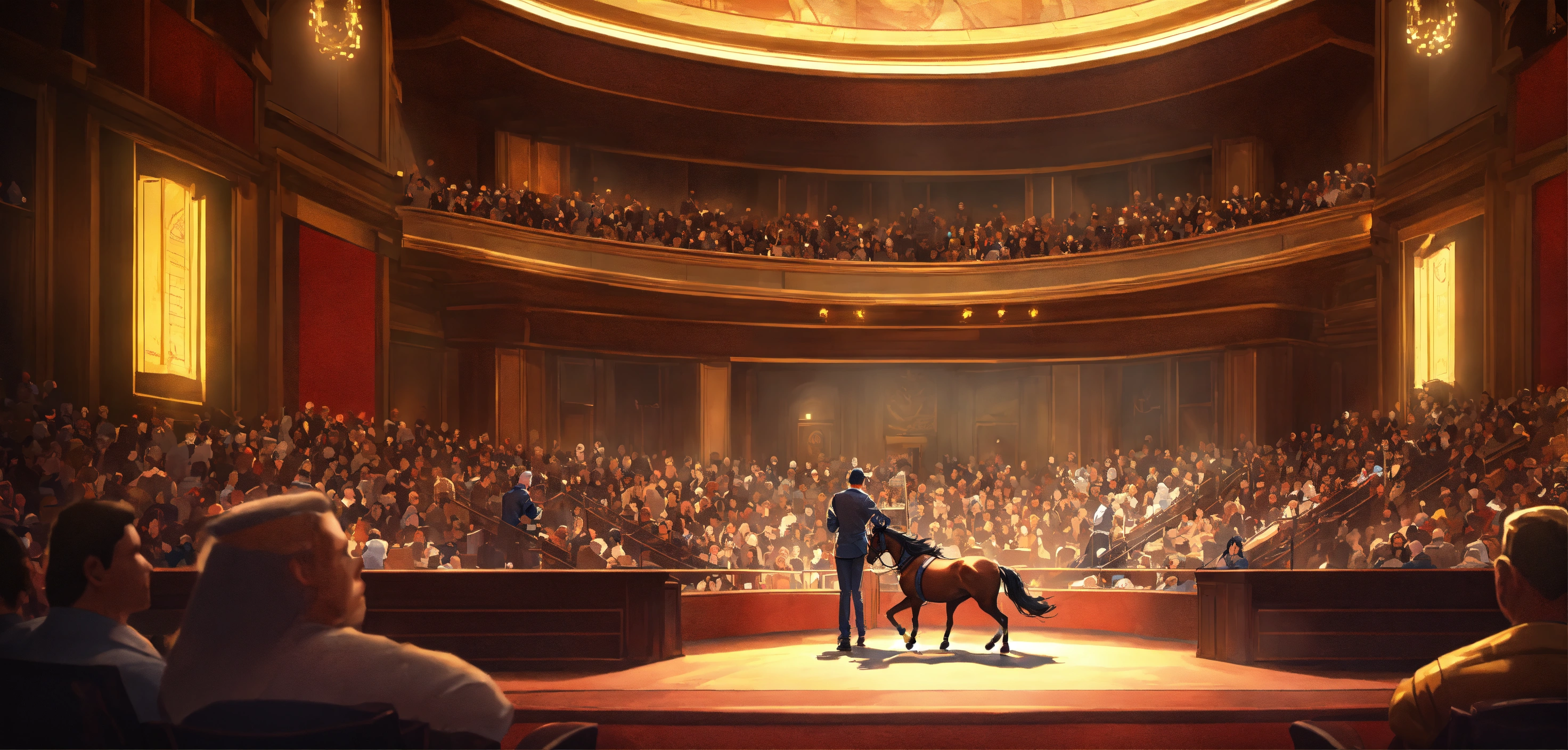 A highly detailed league of legend dynamic illustration of the horse auction in modern concert hall by joshua raphael, by artgerm, by huyy nguyen, by cj xander, by jennifer wuestling, by diep duong van, by huyy nguyen, by grafit studio, volumetric lighting, 3d render, 4k resolution, trending on artstation, masterpiece, close up frame, cinematic shot, sport competition, epic, keeneland sales, inside hall with stands, lot of armchairs with people, one horse in centre only, evening, hall without windows