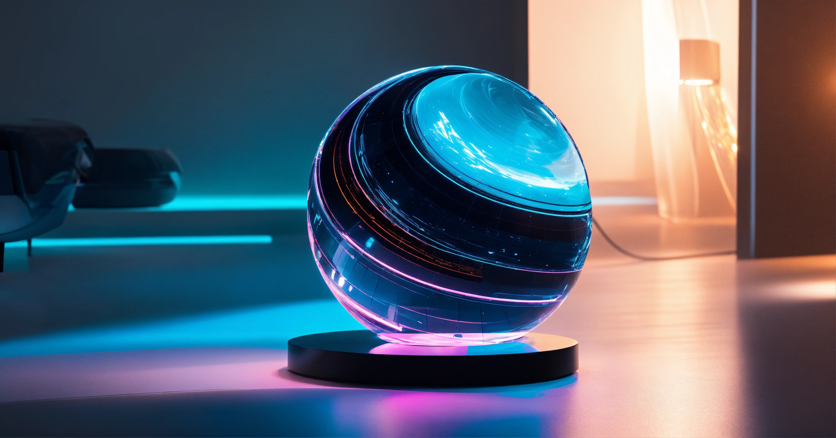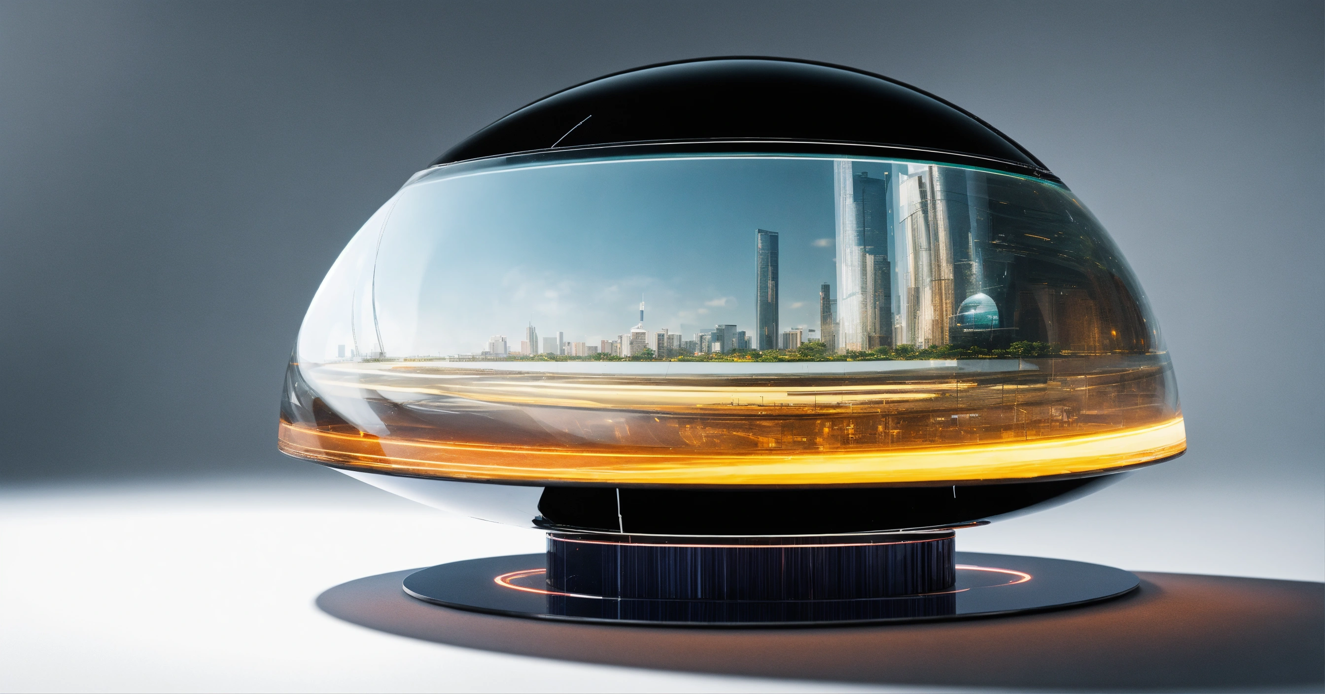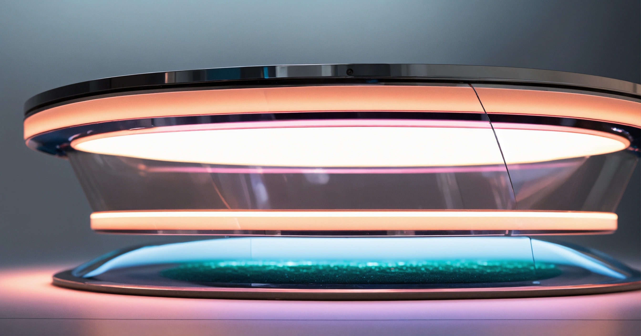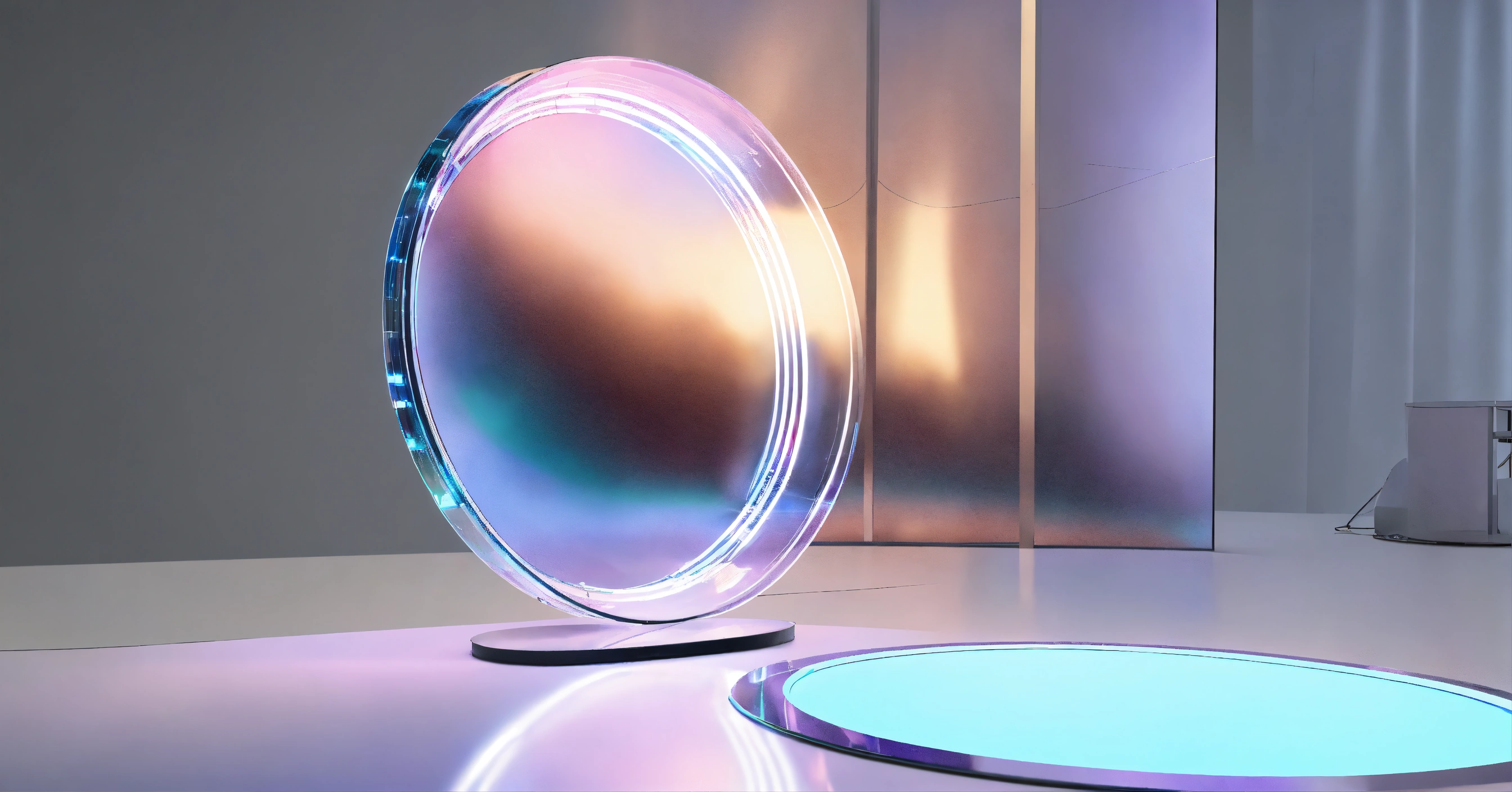 Thin glass circle, seen from a side angle with a rotated perspective. it is brilliantly illuminated and stands against a pristine white background, showcasing futuristic tech design, perfect for 8k resolution.