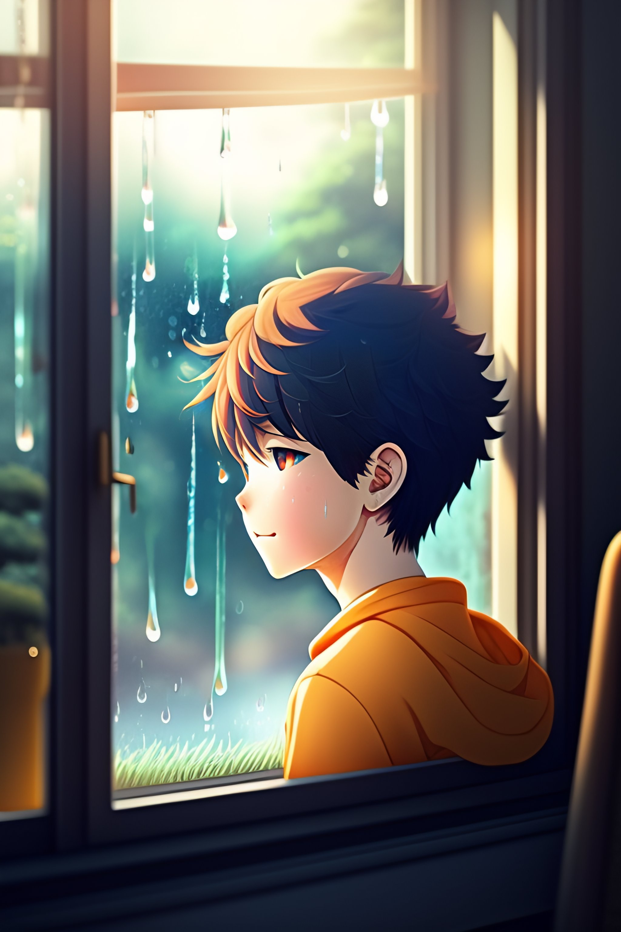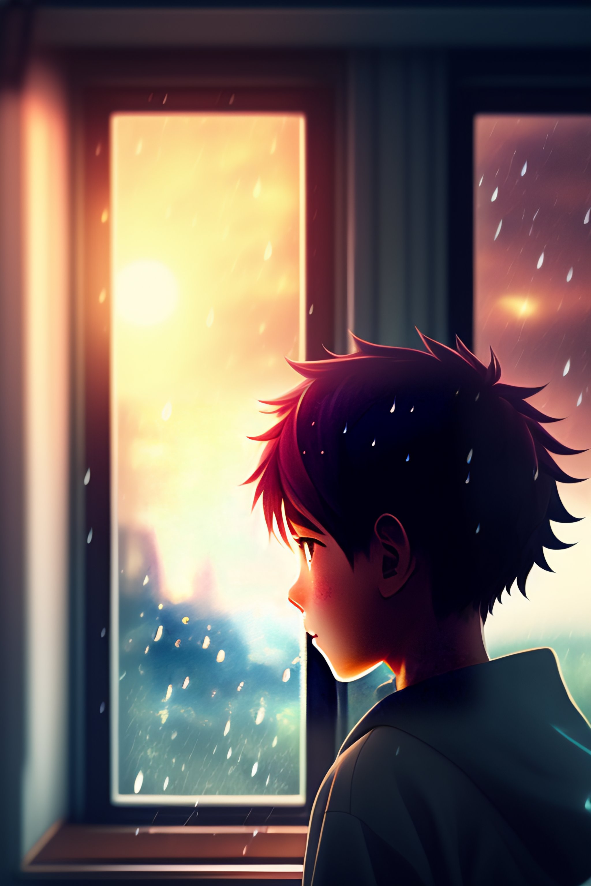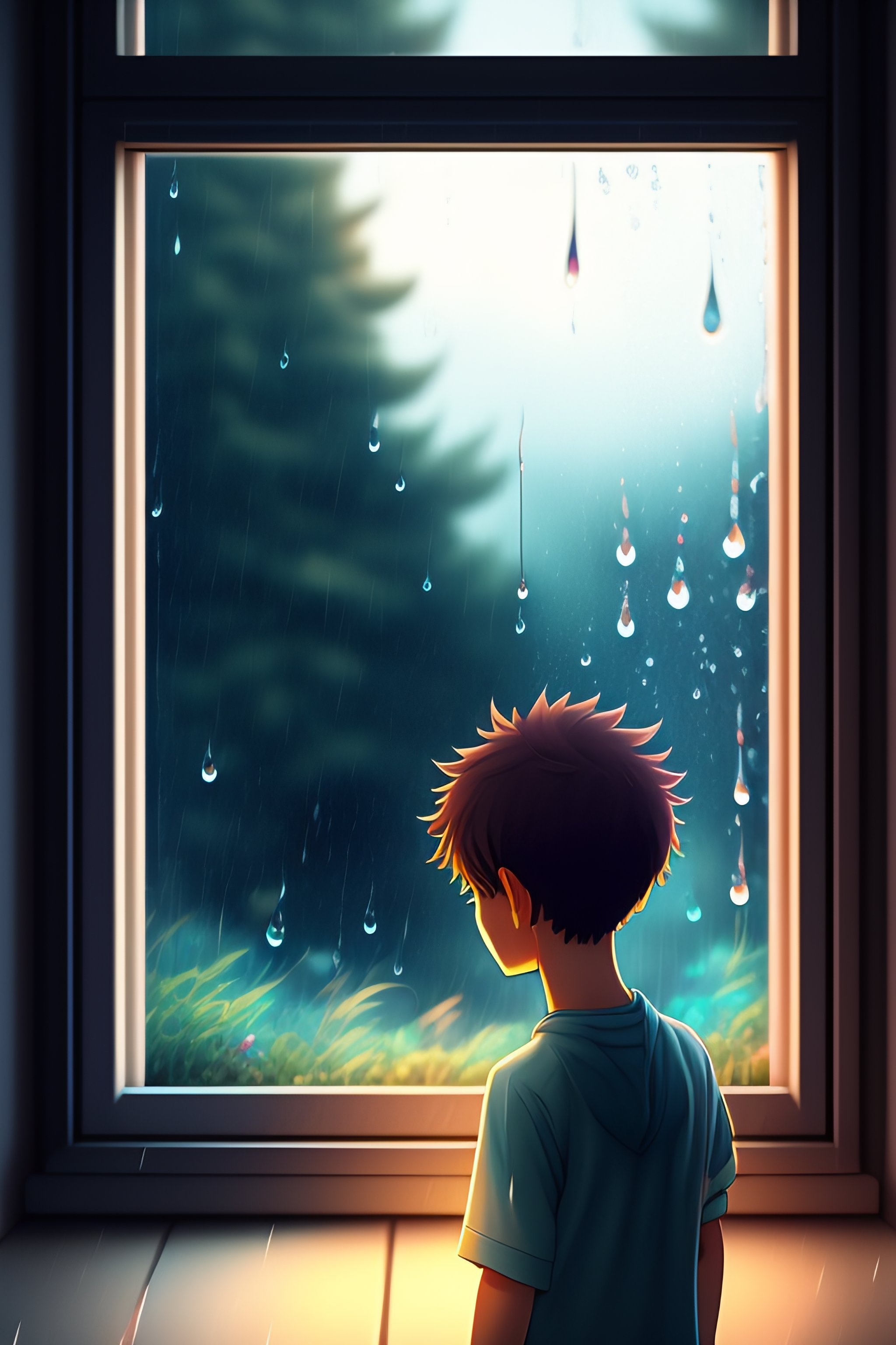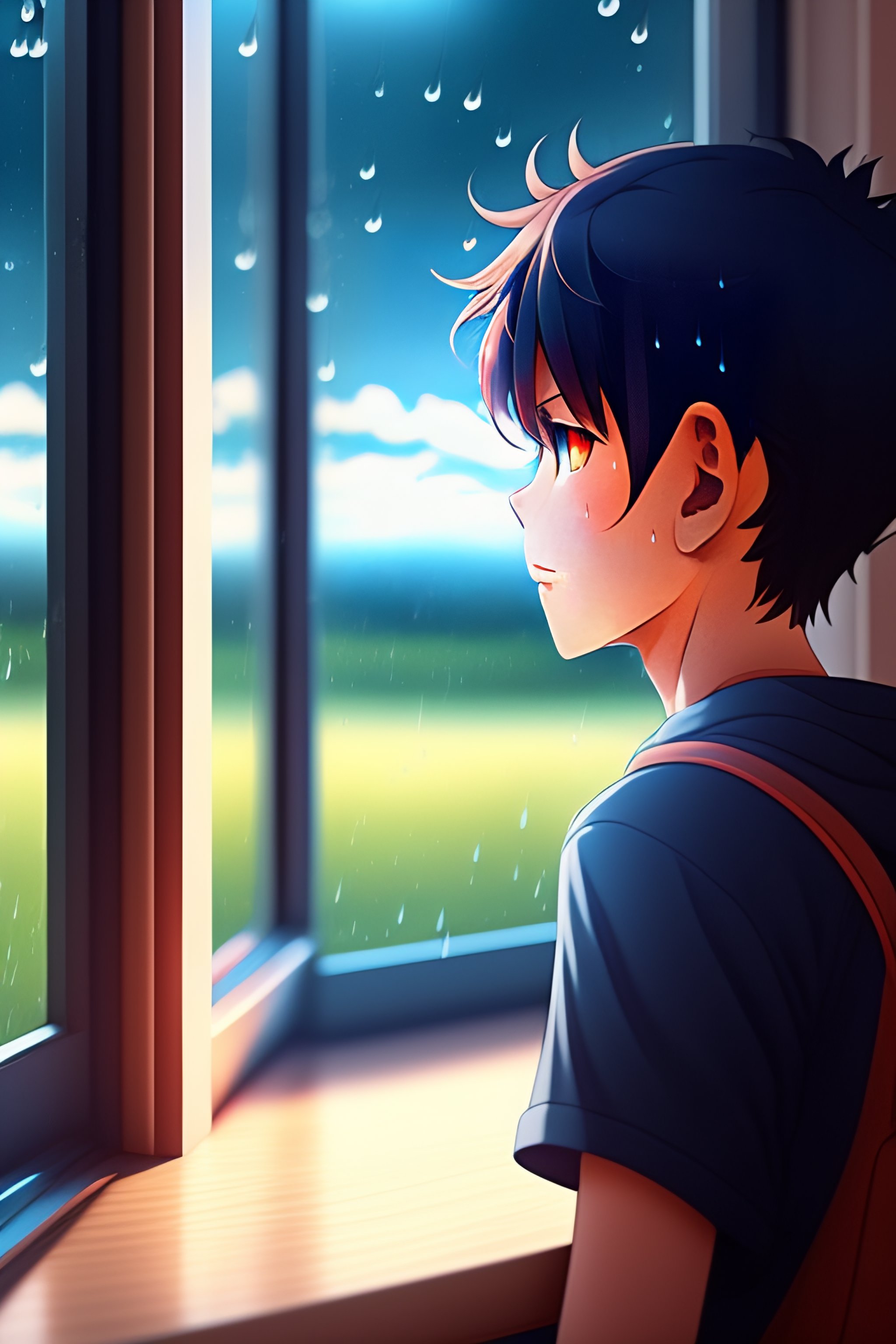 Create an anime of a boy listening to music in the back room with an open window showing the rainy night