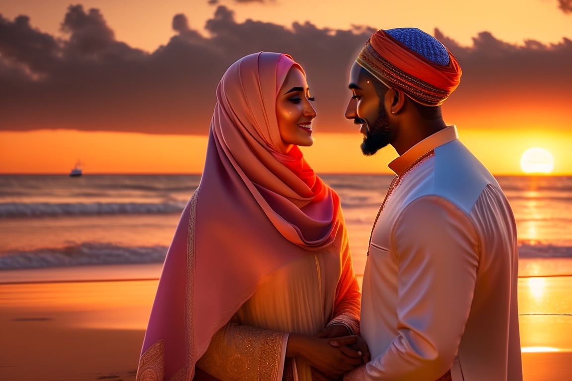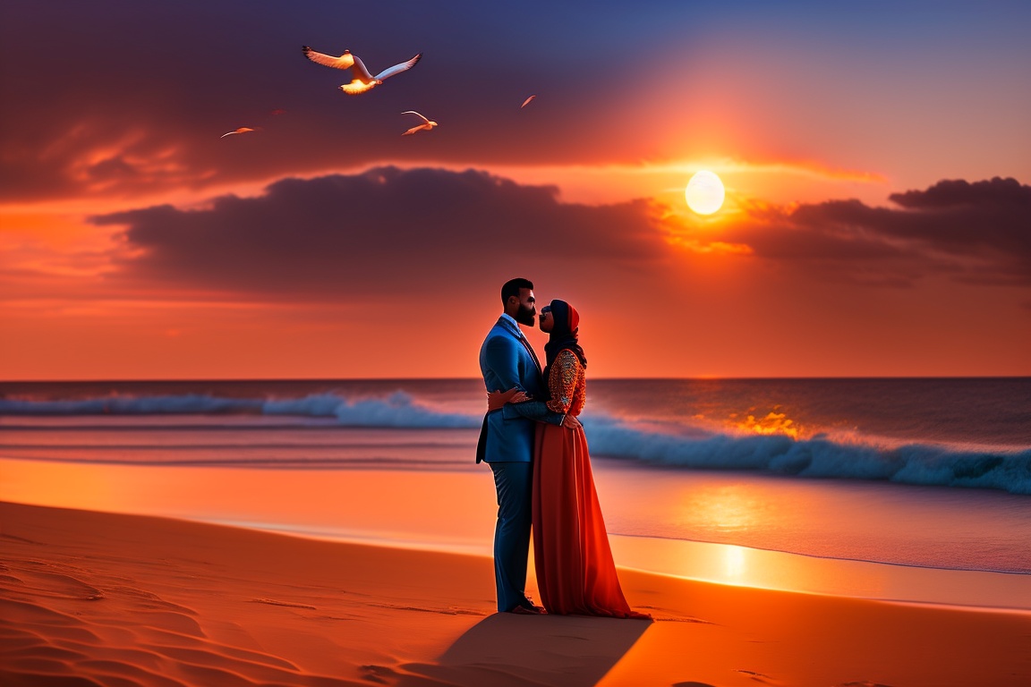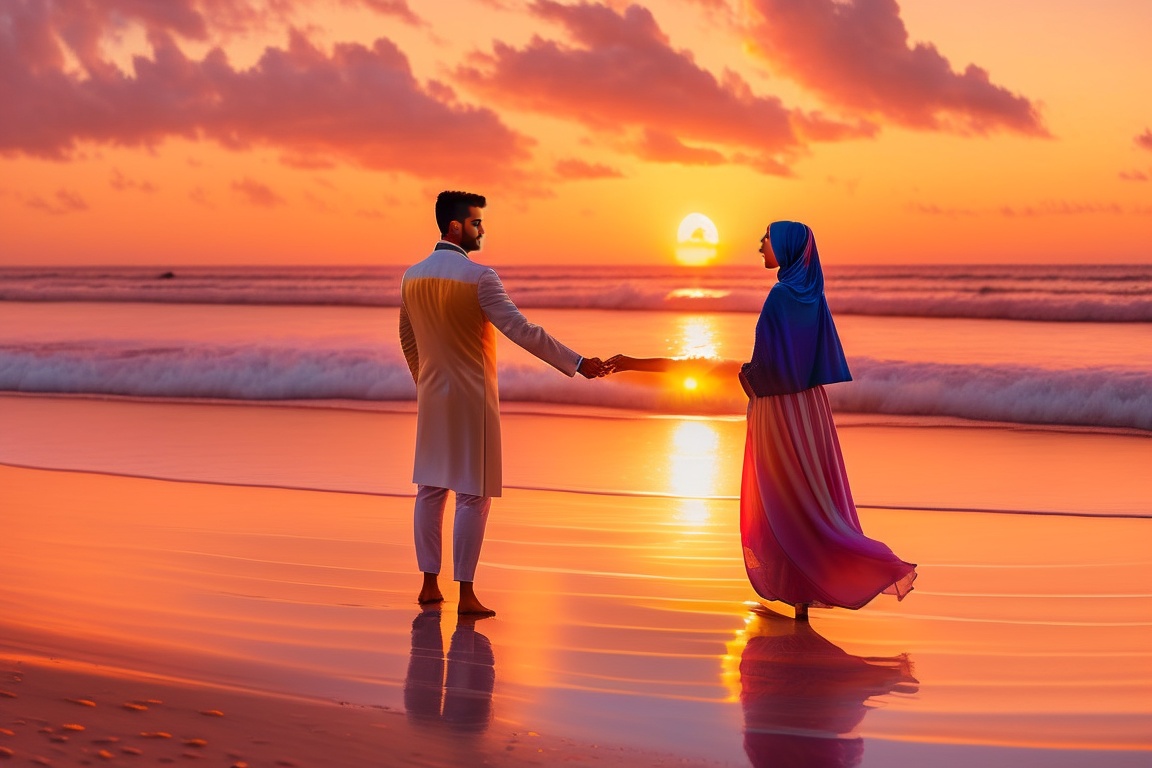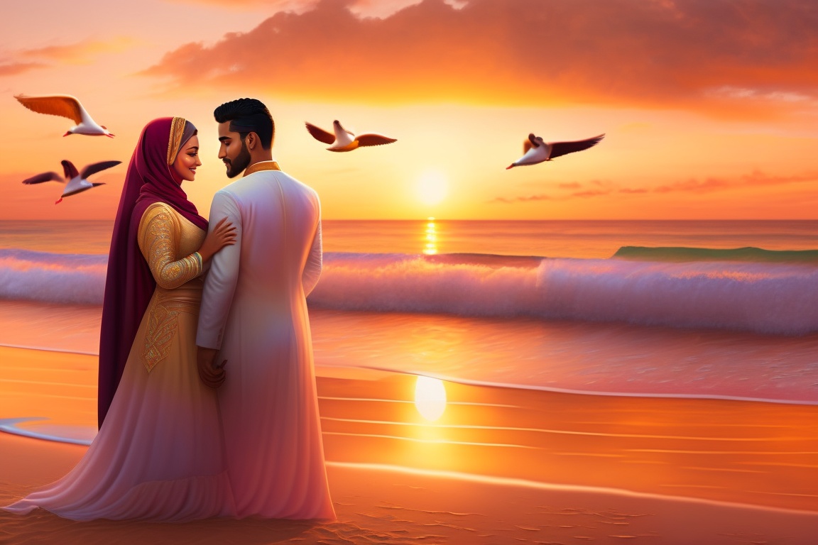 /imagine prompt: a muslim couple stands hand in hand on the beach at sunset, the golden light of the sun setting behind them casting a warm glow over their faces. the couple is dressed in traditional attire, the woman wearing a colorful hijab and the man wearing a thobe. the image is rendered in a soft, dreamy style with a warm color palette that complements the romantic mood of the scene. the couple gazes lovingly into each other's eyes as the waves gently lap at their feet. seagulls fly overhead, adding to the peaceful, serene atmosphere of the image