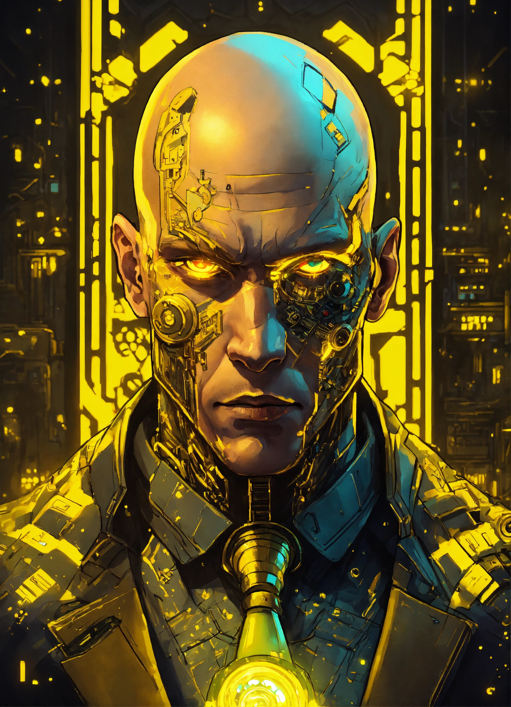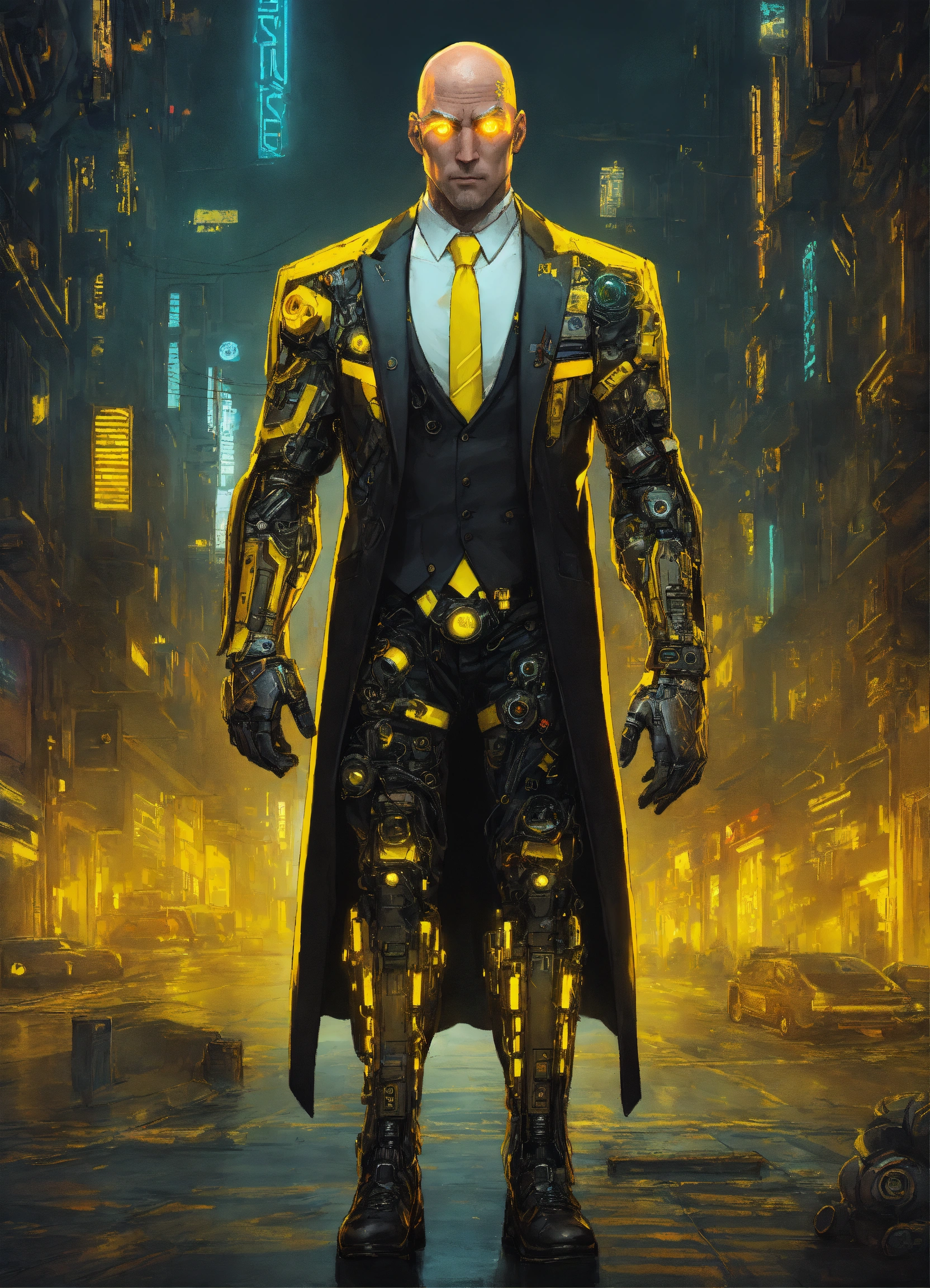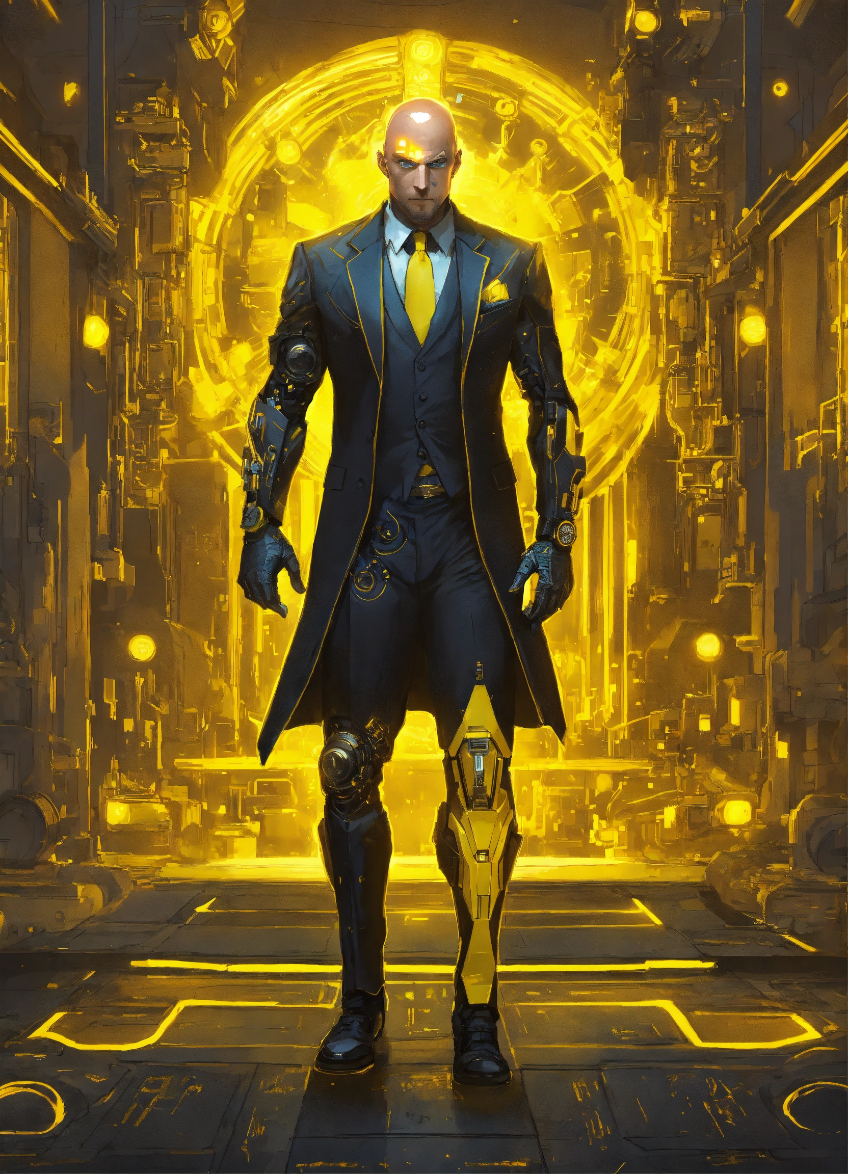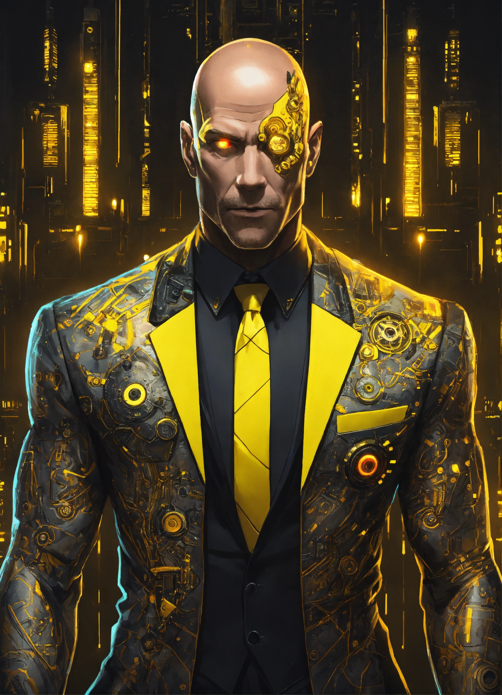 Pale middle-aged bald muscular heavily tattoed cyberpunk cyborg man with yellow cybernetic parts and glowing eyes, mostly human and wearing a black fancy tuxedo suit, cyberpunk drawing