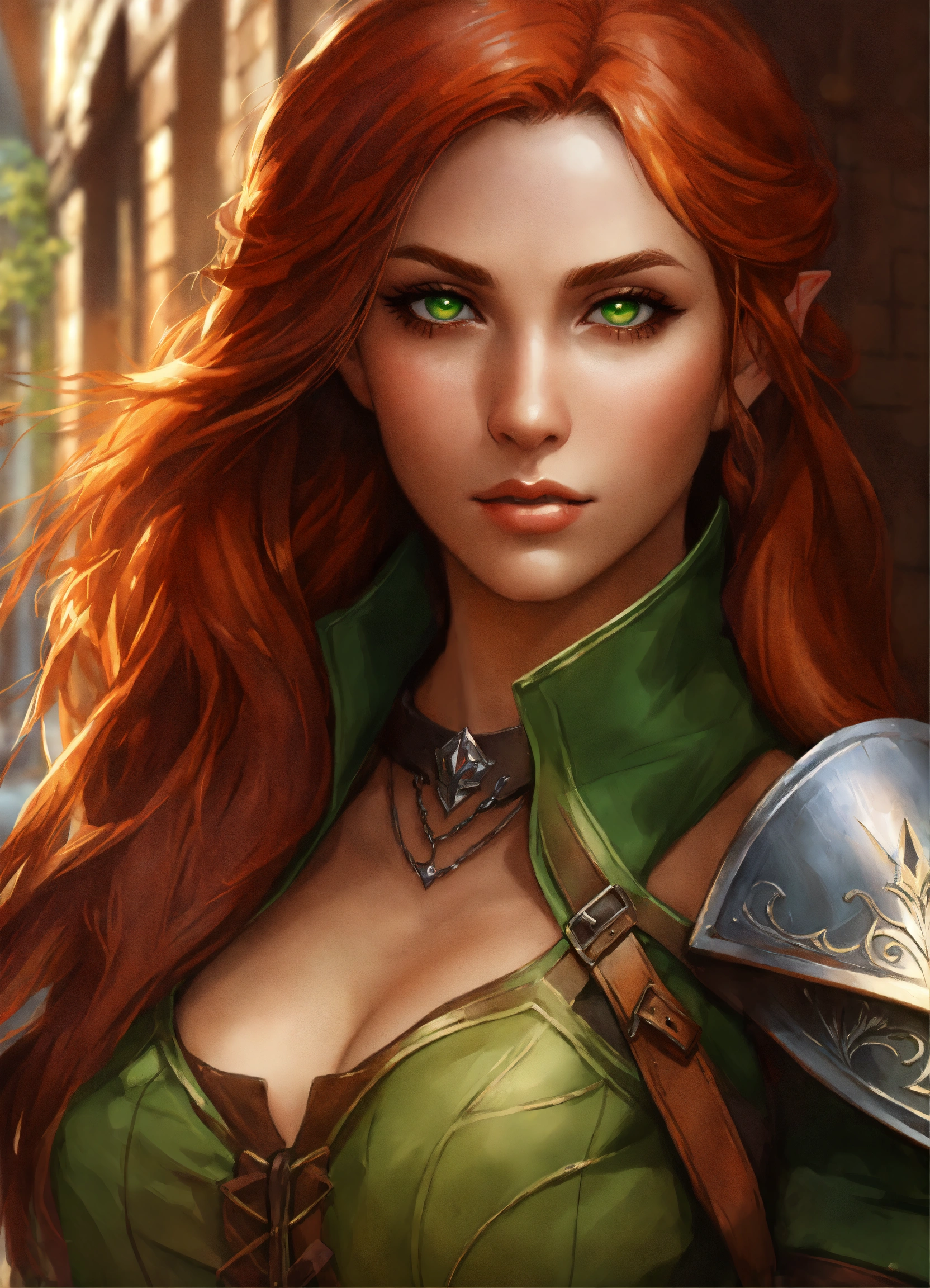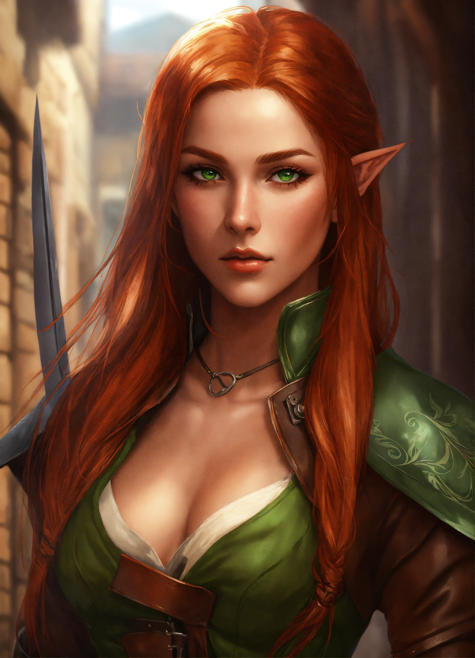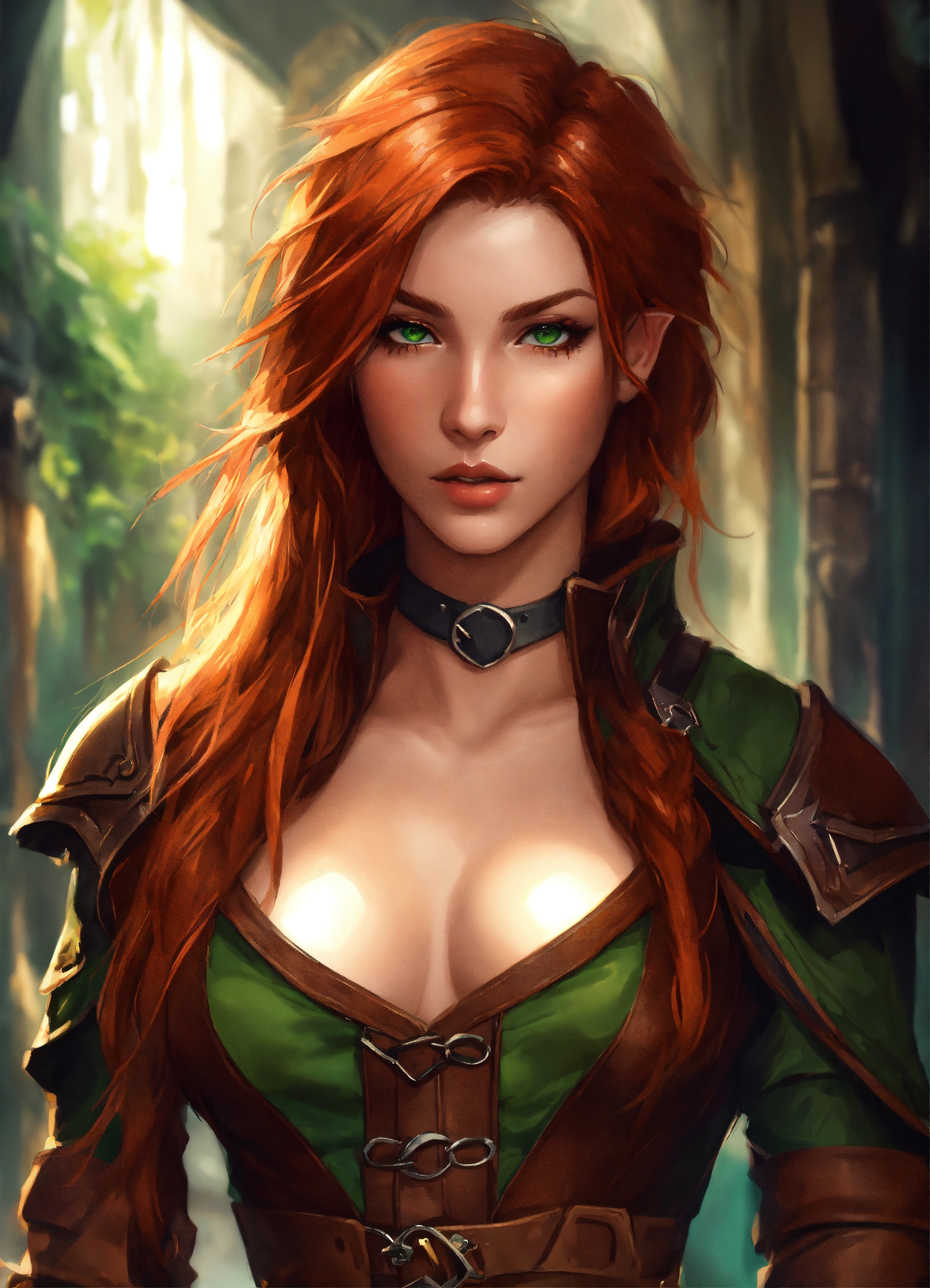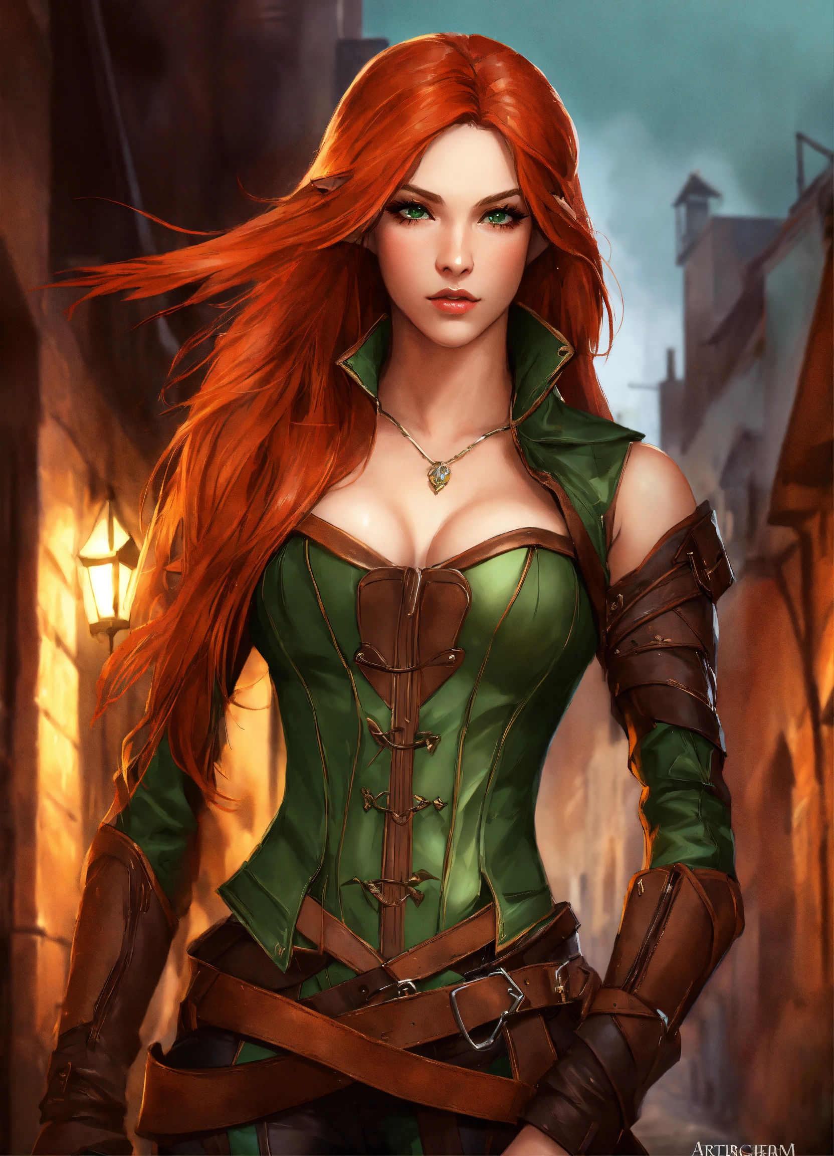 Portrait of a beautiful red haired elf rogue, long hair, concept art, in an alley, symmetrical face, attractive elf, soft green eyes, digital art, wearing brown leather corset, assassin, medieval fantasy, art by artgerm, brown leathers, long elf ears, no shoulder guards, thief, exquisite detail