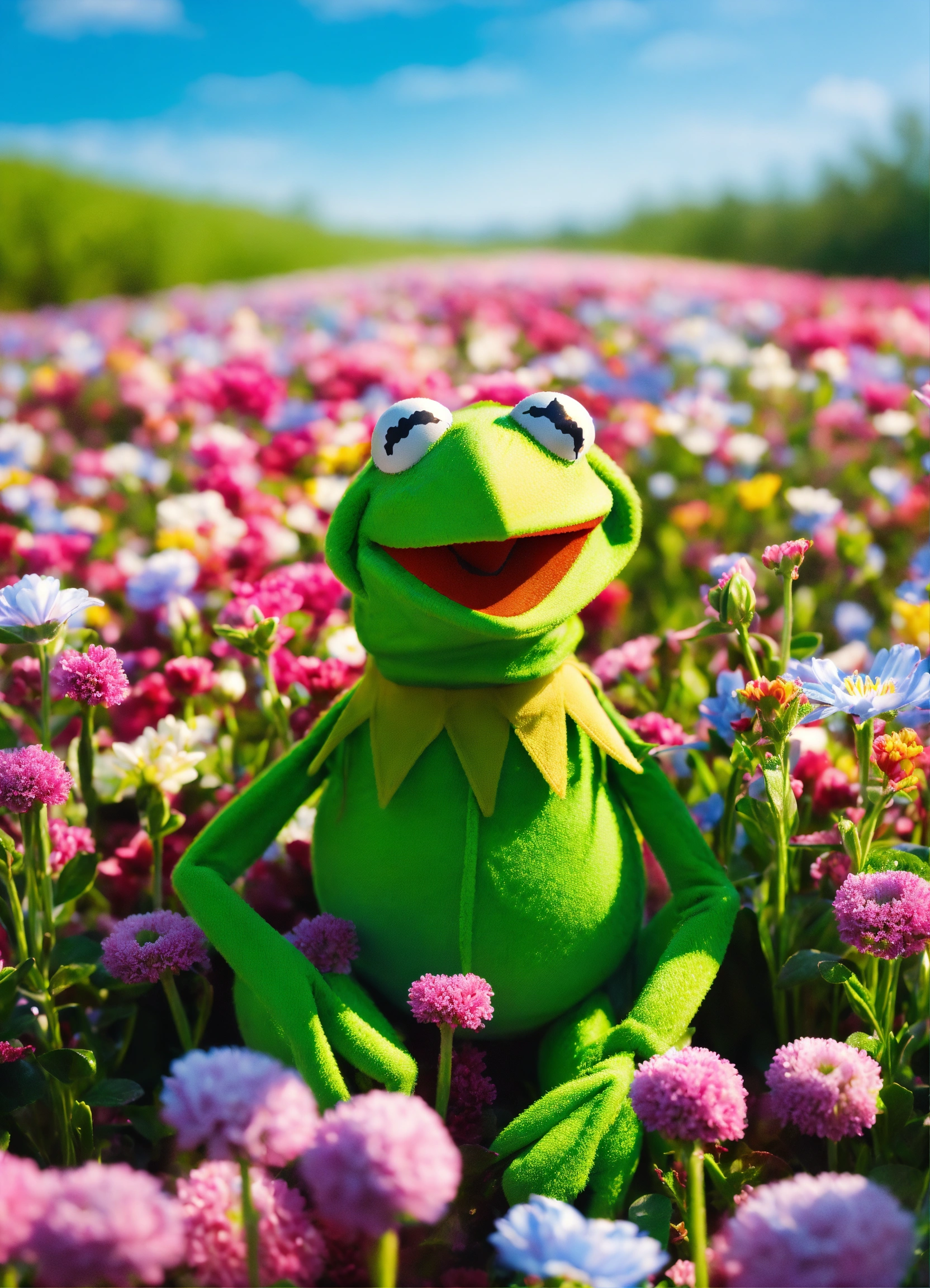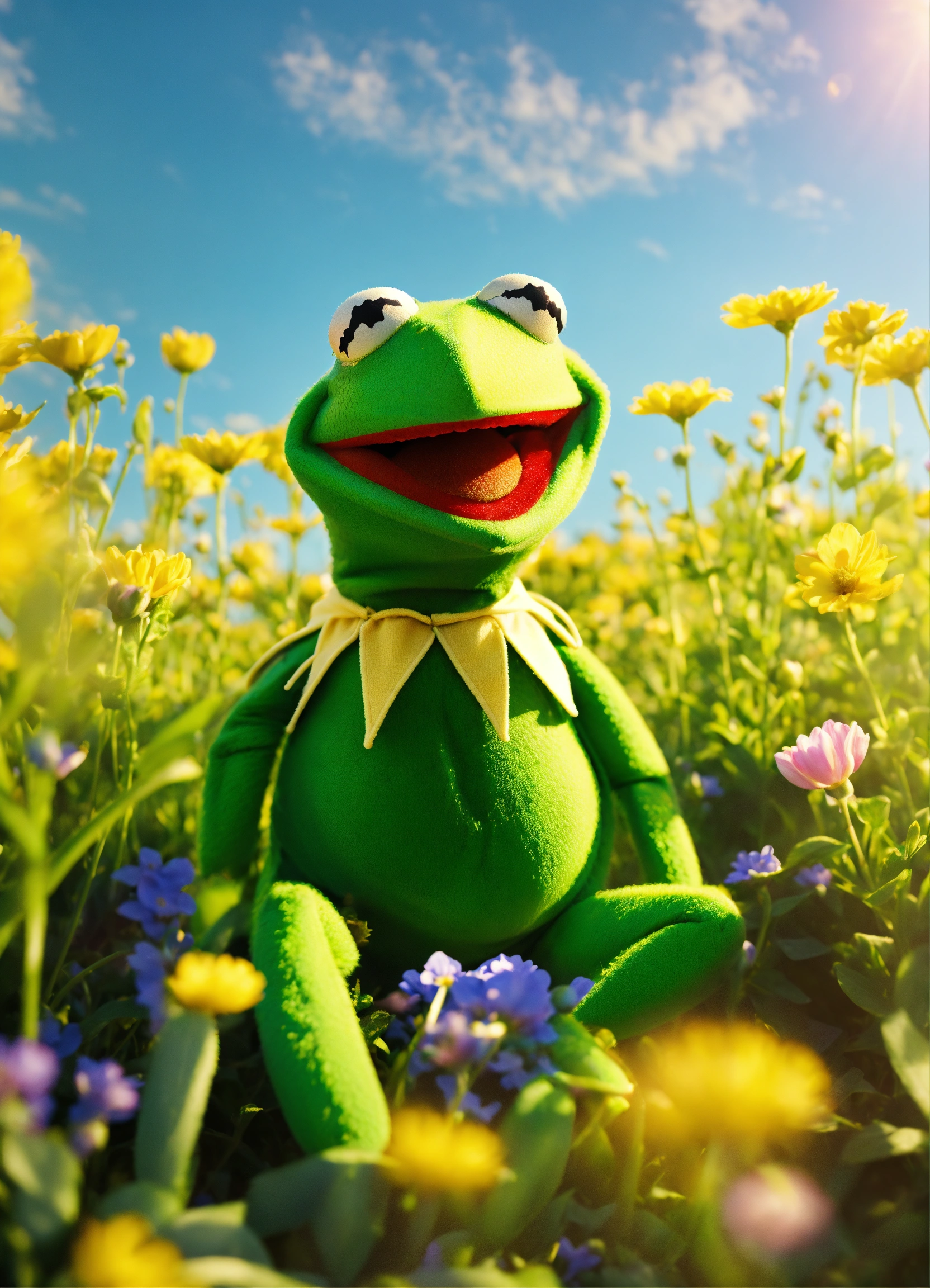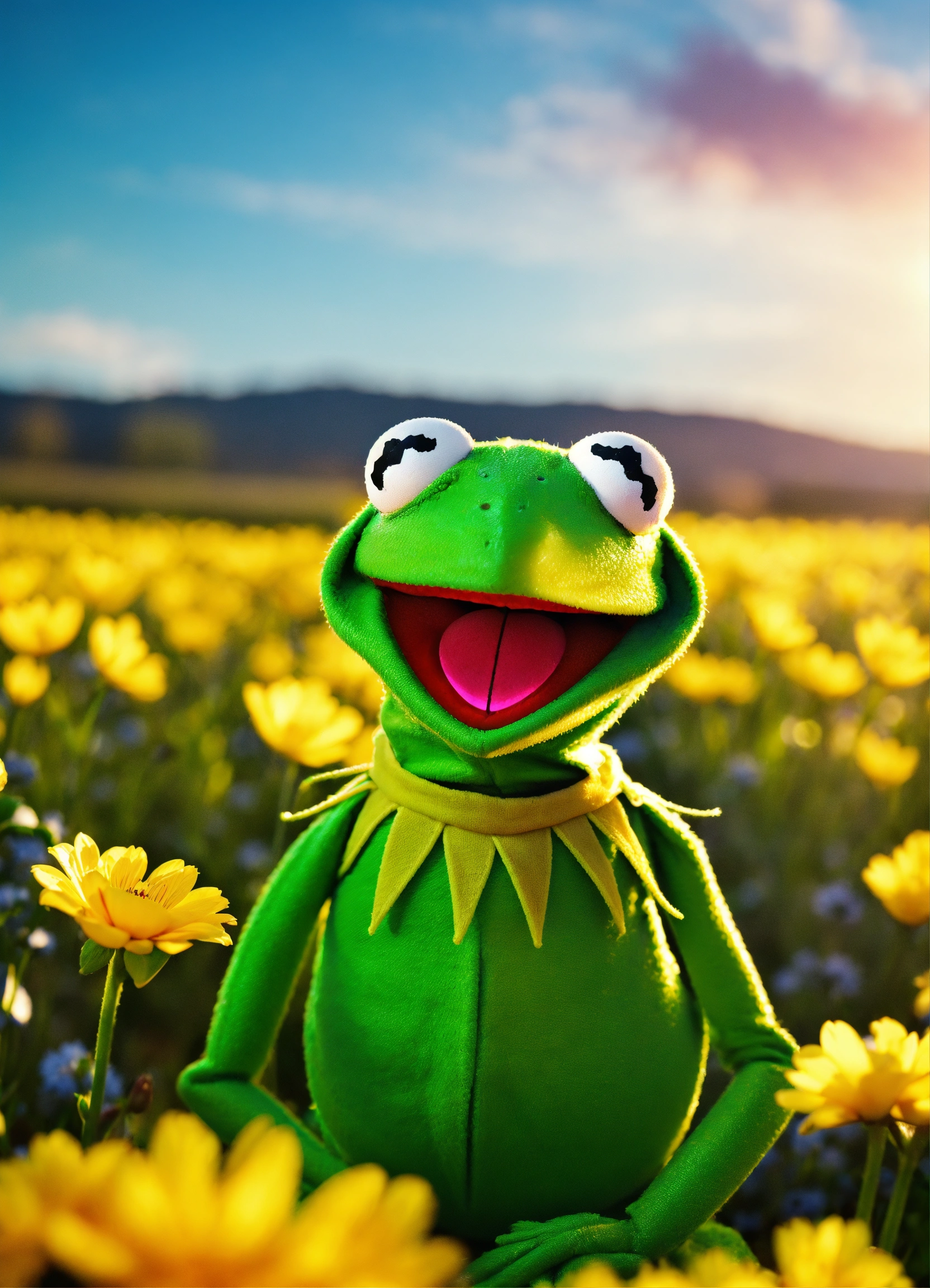 Kermit the frog, happy, light, surrounded by a blue sky on a flower field. a beautiful light theater stage cinematic lighting, ultra 4k hd