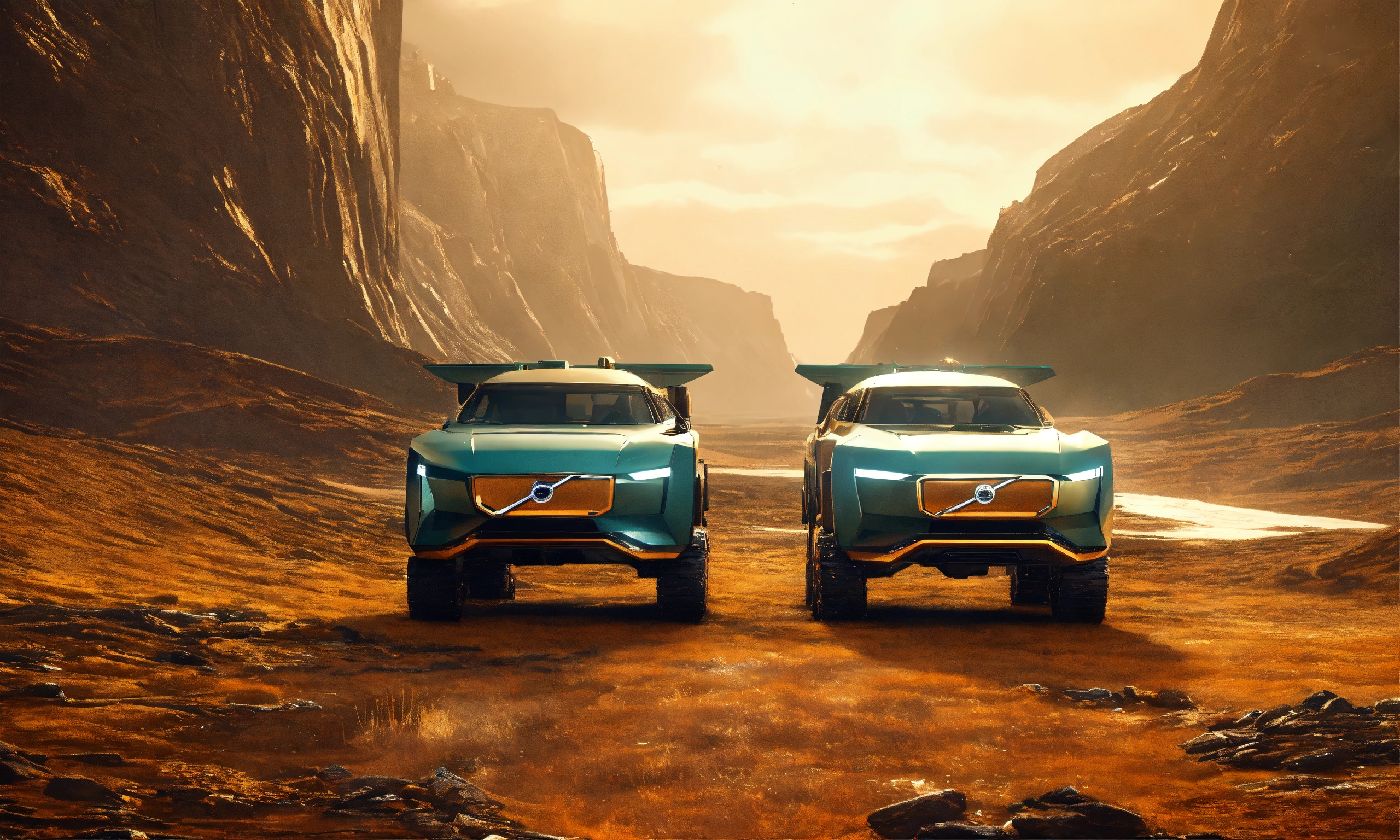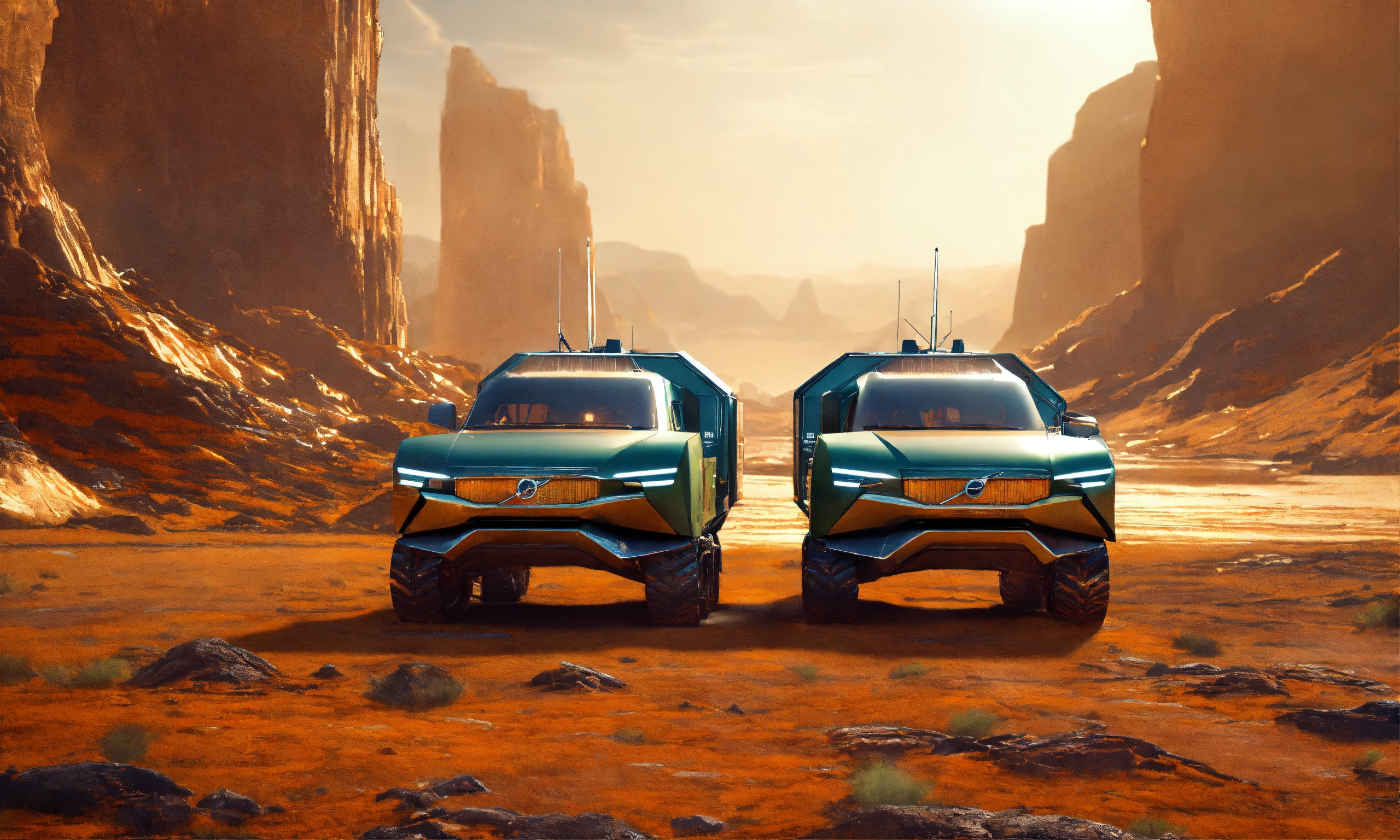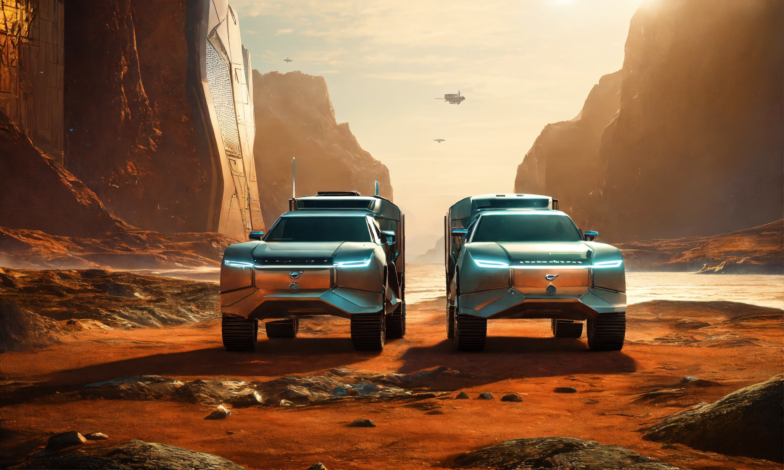 Two volvo-truck spaceships floating side by side with no wheels. frontal view. articulated trucks in a futuristic alien landscape, photorealistic light. floating beside each other and insync, frontal-flat view. a cinematic image. sci-fi. in the detailed style of paul chadeisson. with the style of paul chadeisson using the 60% percent dominant color 30% secondary color and 10% accent colour.