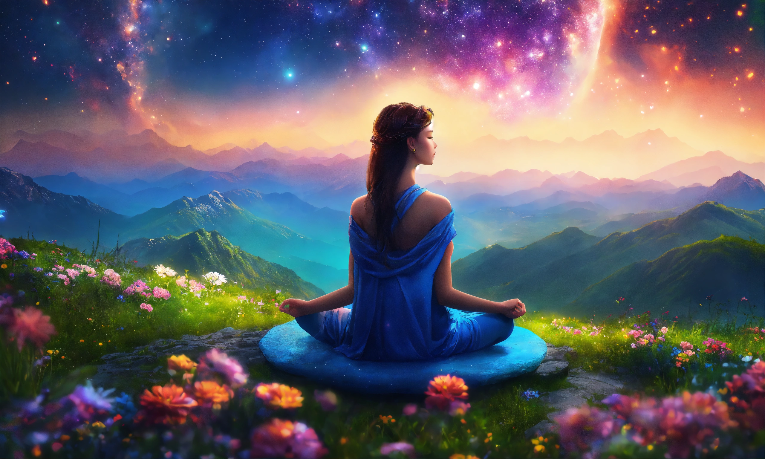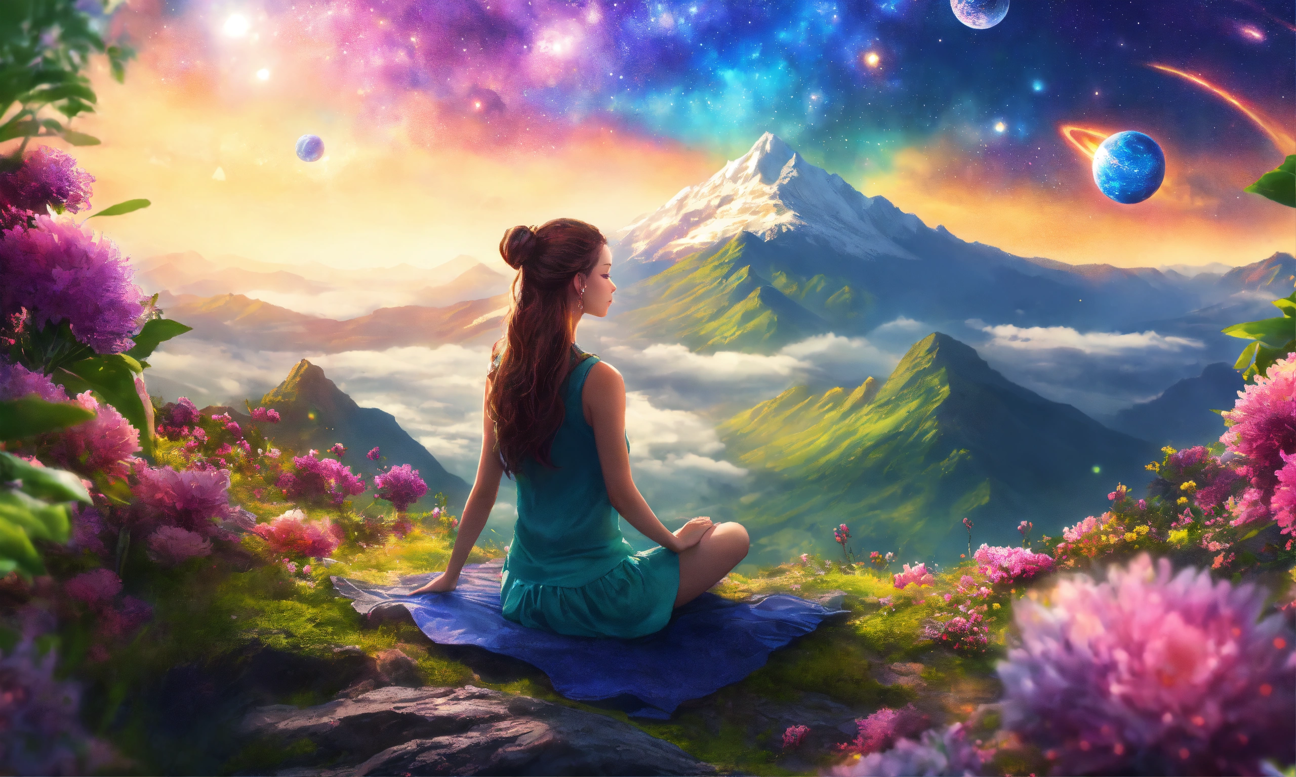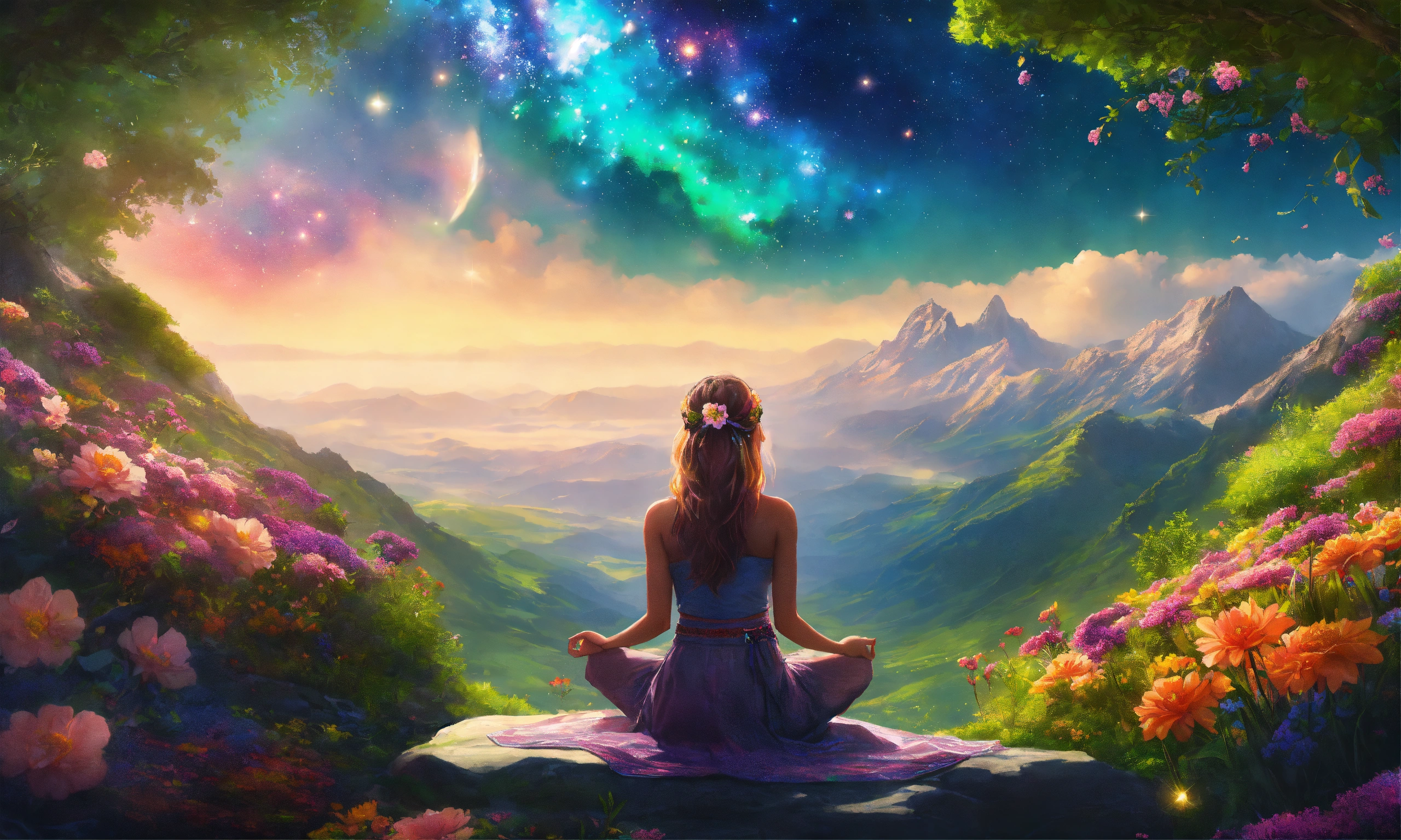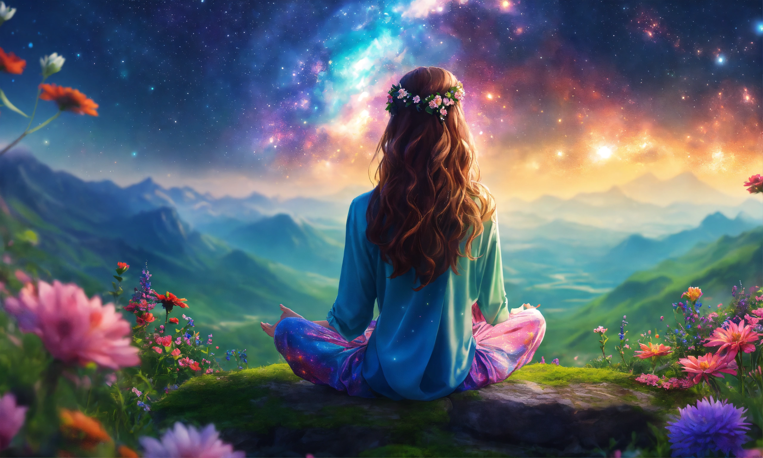 A beautiful girl sitting in meditation on the top of a mountain, lush green, vibrant flowers, mesmerizing universe with vibrant galaxies all around, realistic, 8k
