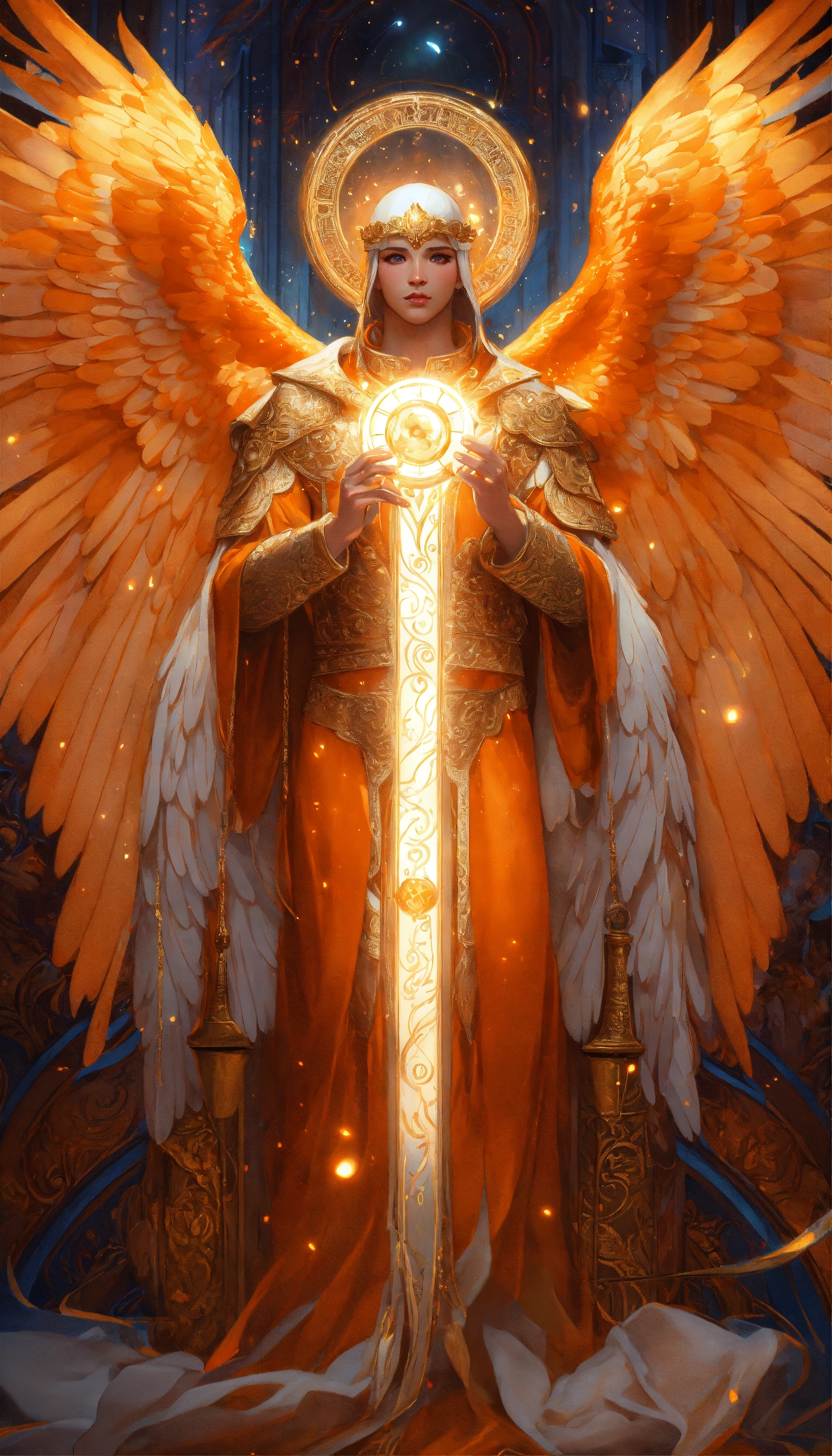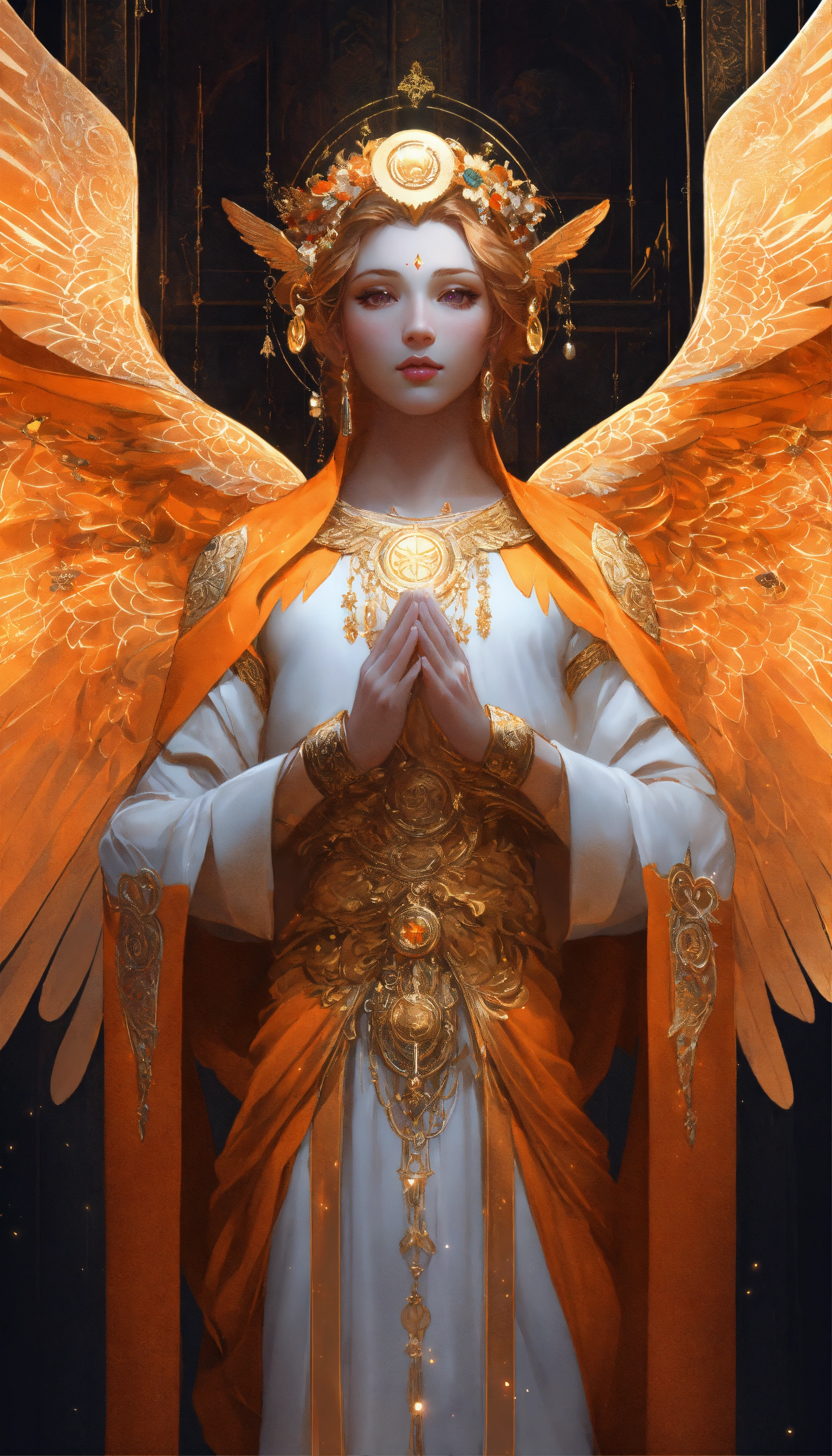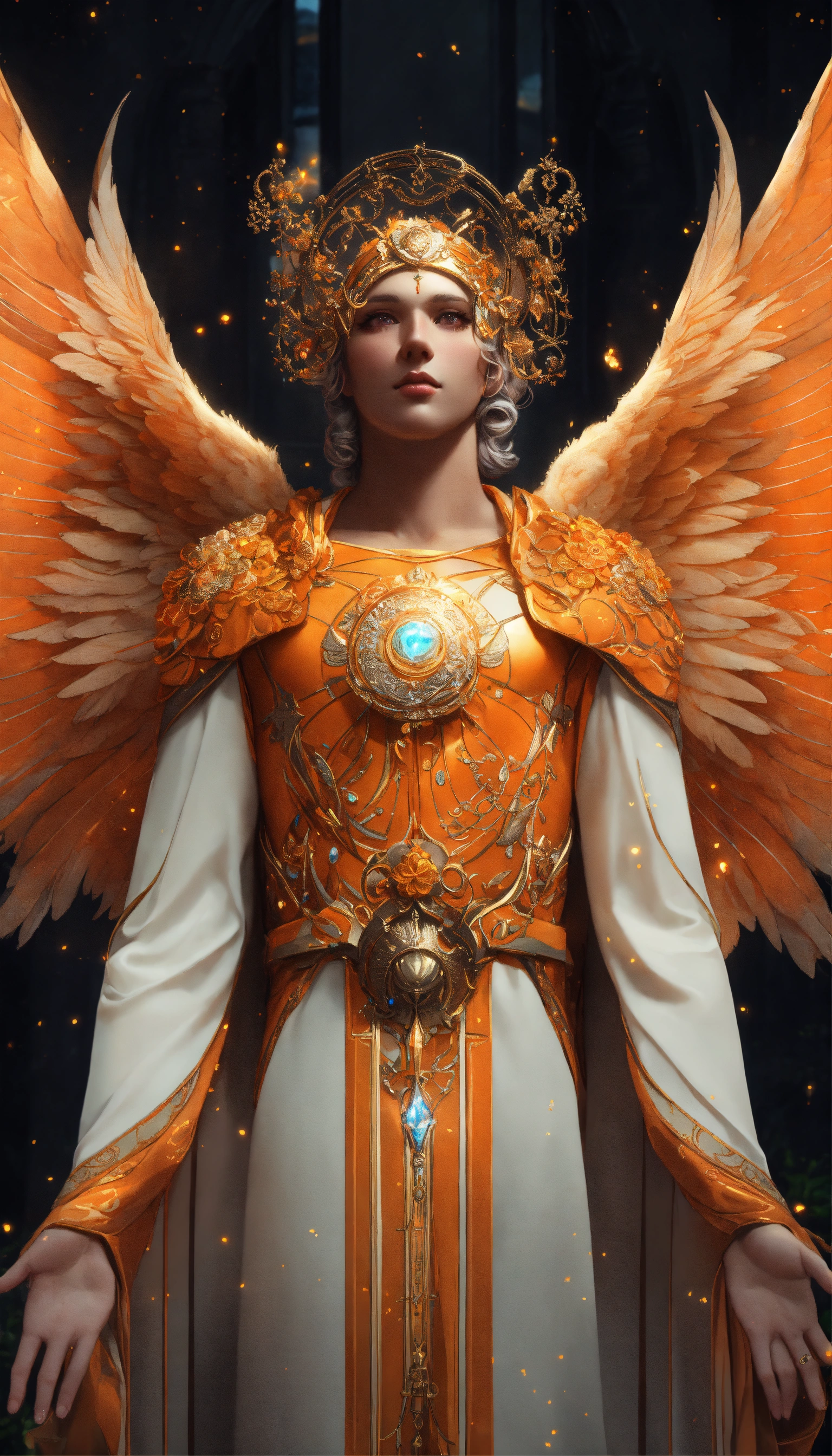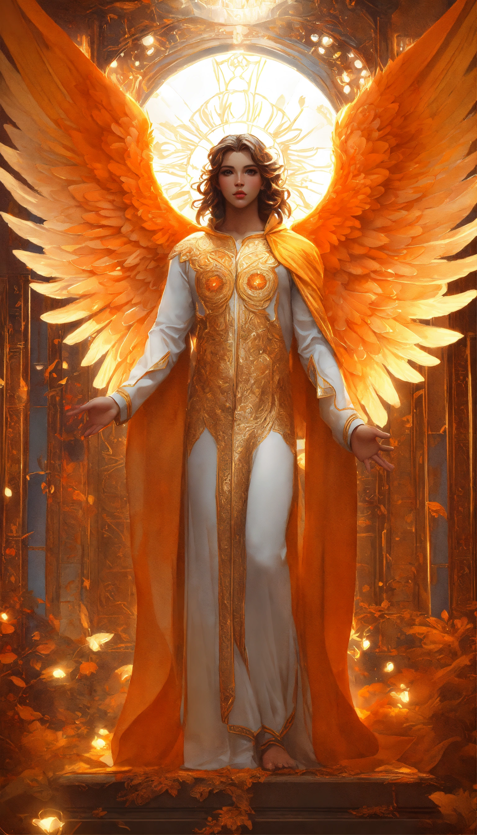 Text male angel, wings, intricate, highly detailed, digital painting, illustration, art station, real, 3d, orange wings with luminous white flashes, large and detailed wings, clear eyes and deep look, face perfect in beauty and detail, jewel in the third eye, orange robe with white and gold details, sacred, mystical, sharp focus, cinematic lighting, 8k, art by artgerm and greg rutkowski, alphonse mucha, cgsociety, high quality and resolution, hyper realistic