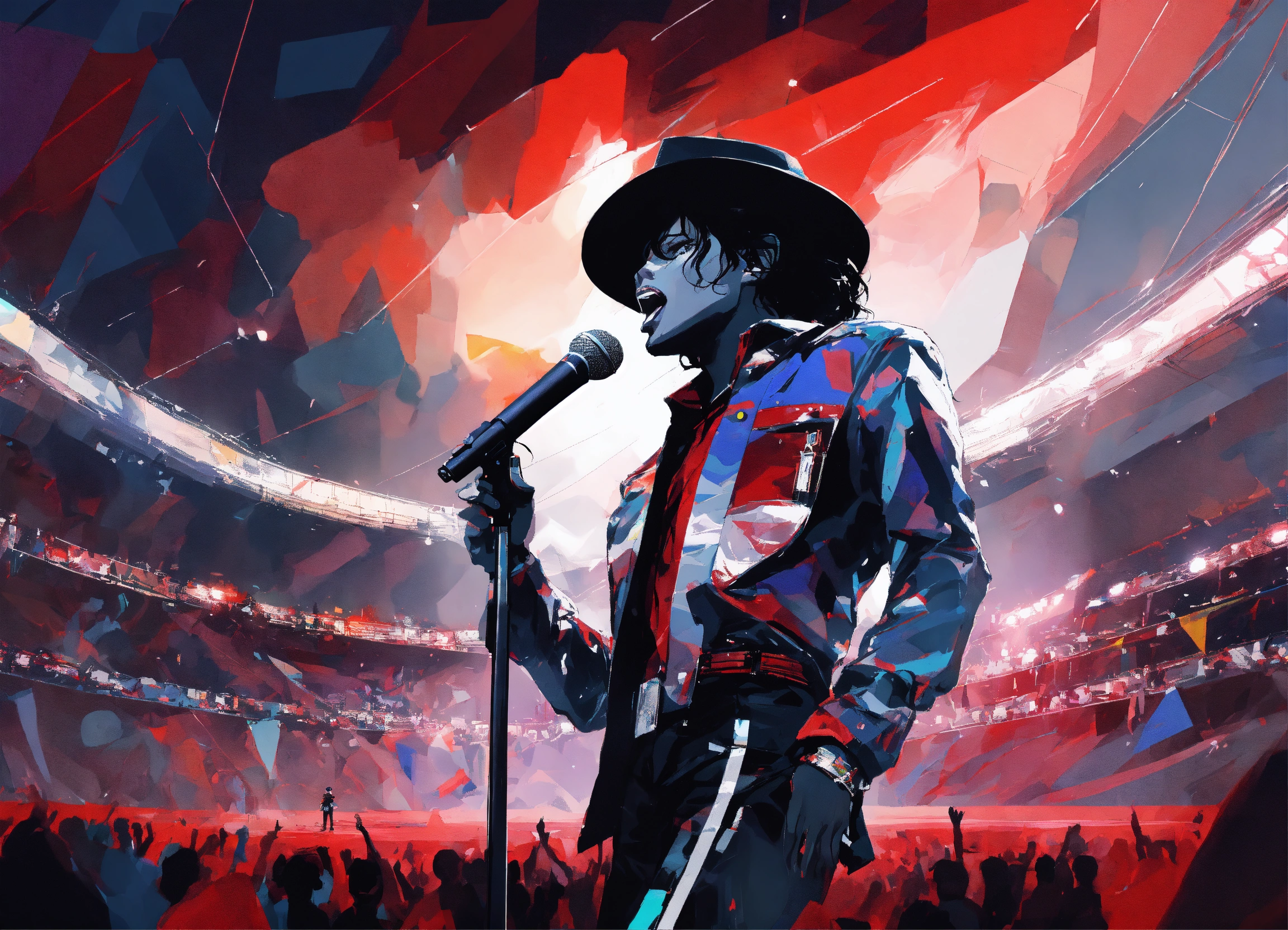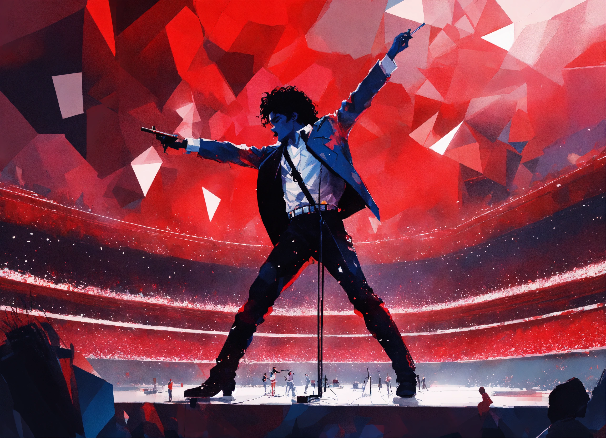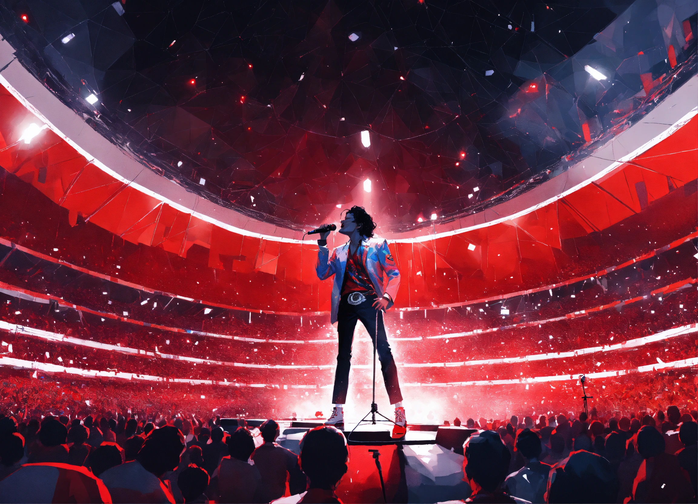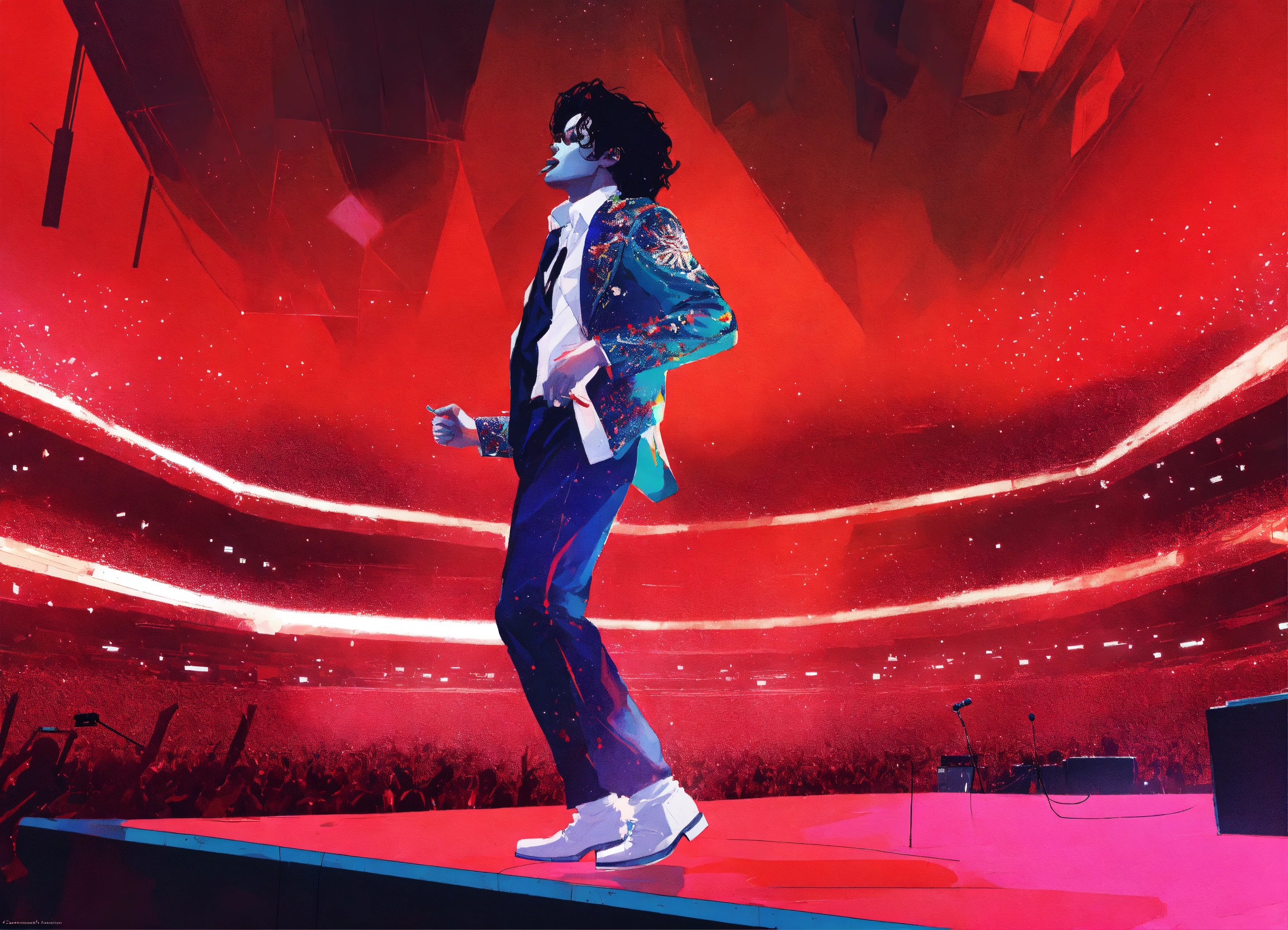 Michael jackson singing at a standing microphone on a super-wide stage in a really big arena, by conrad roset, greg rutkowski, makoto shinkai, low poly, abstract, style of black and white drawing with red pops of color