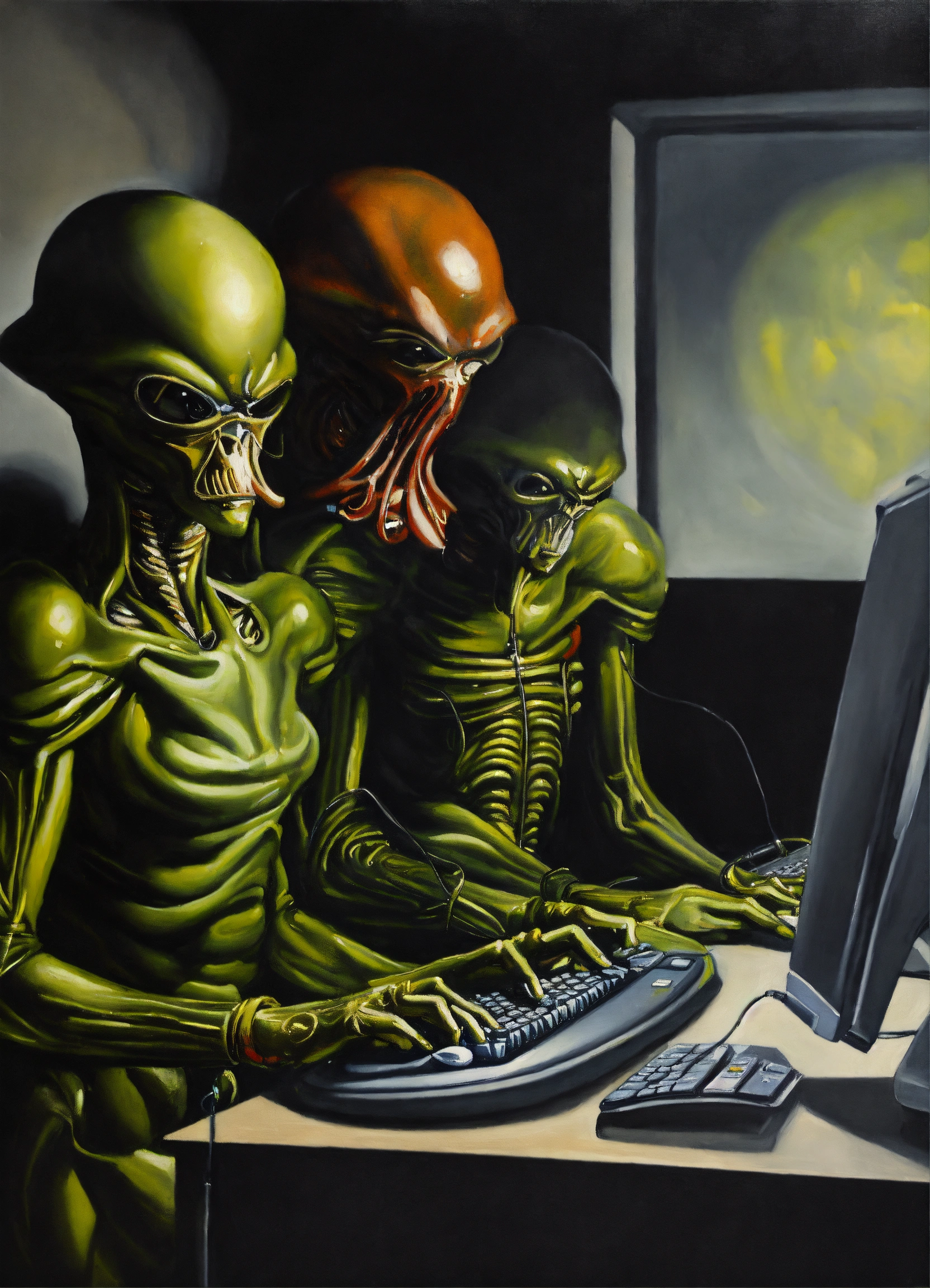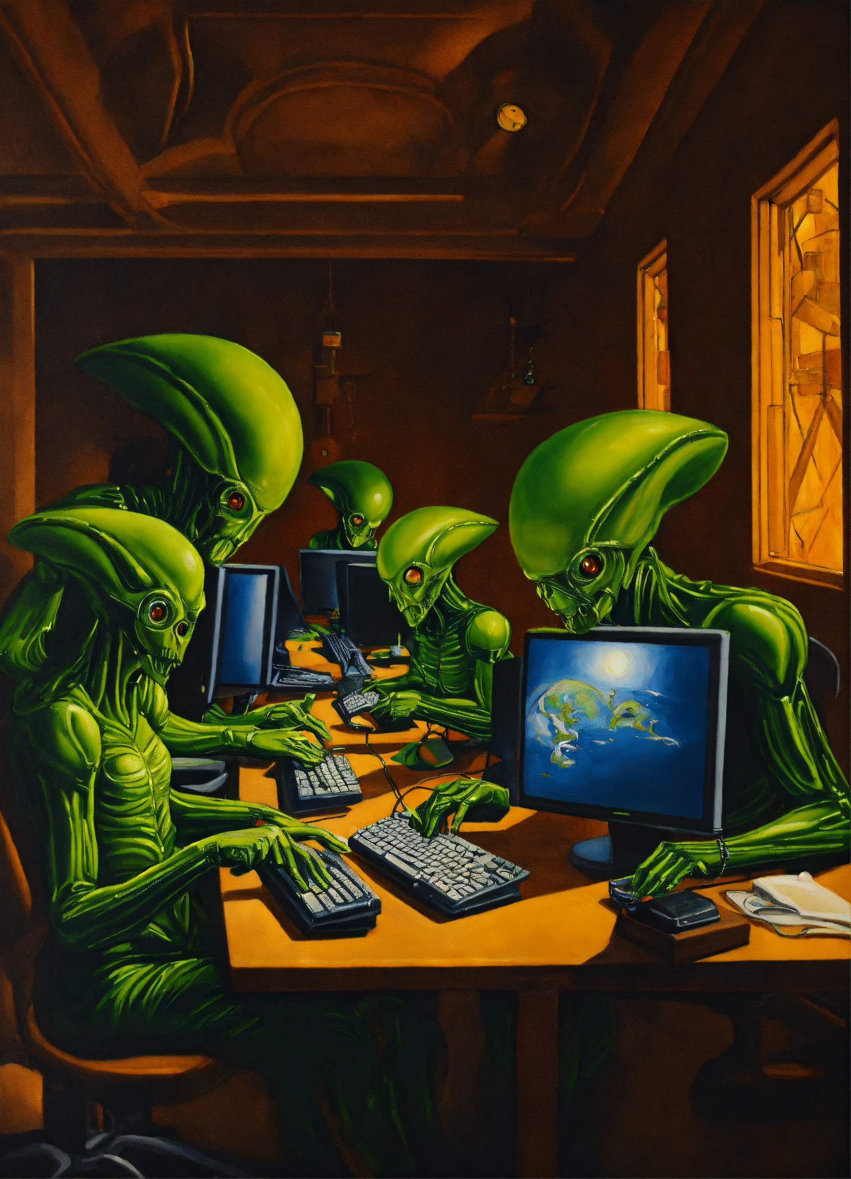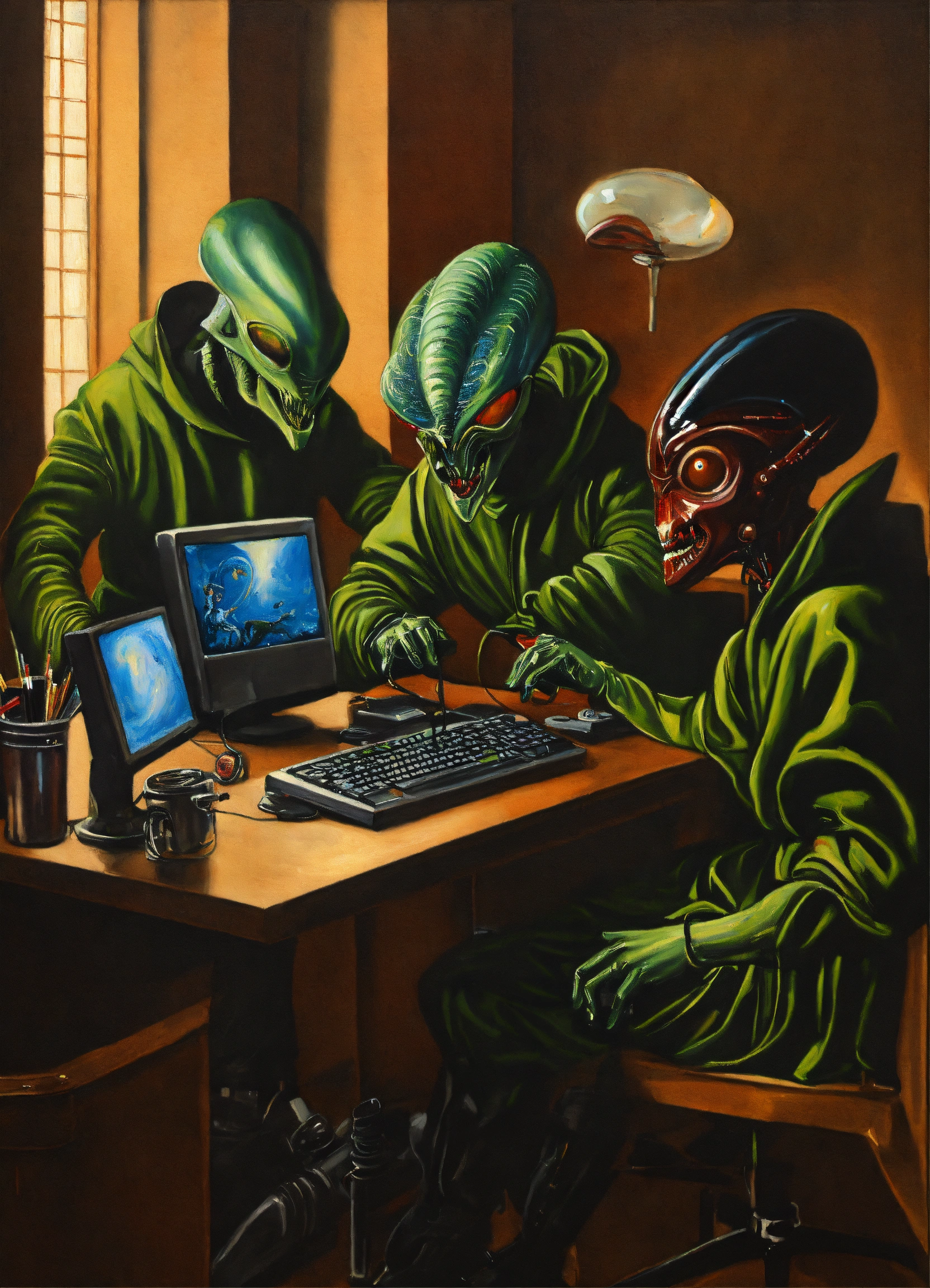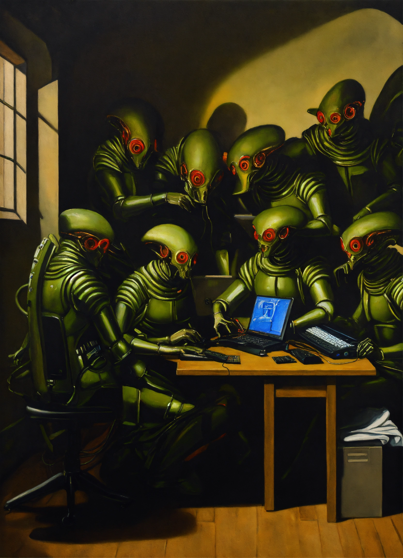A detailed painting inspired by caravaggio of aliens working on computers in office