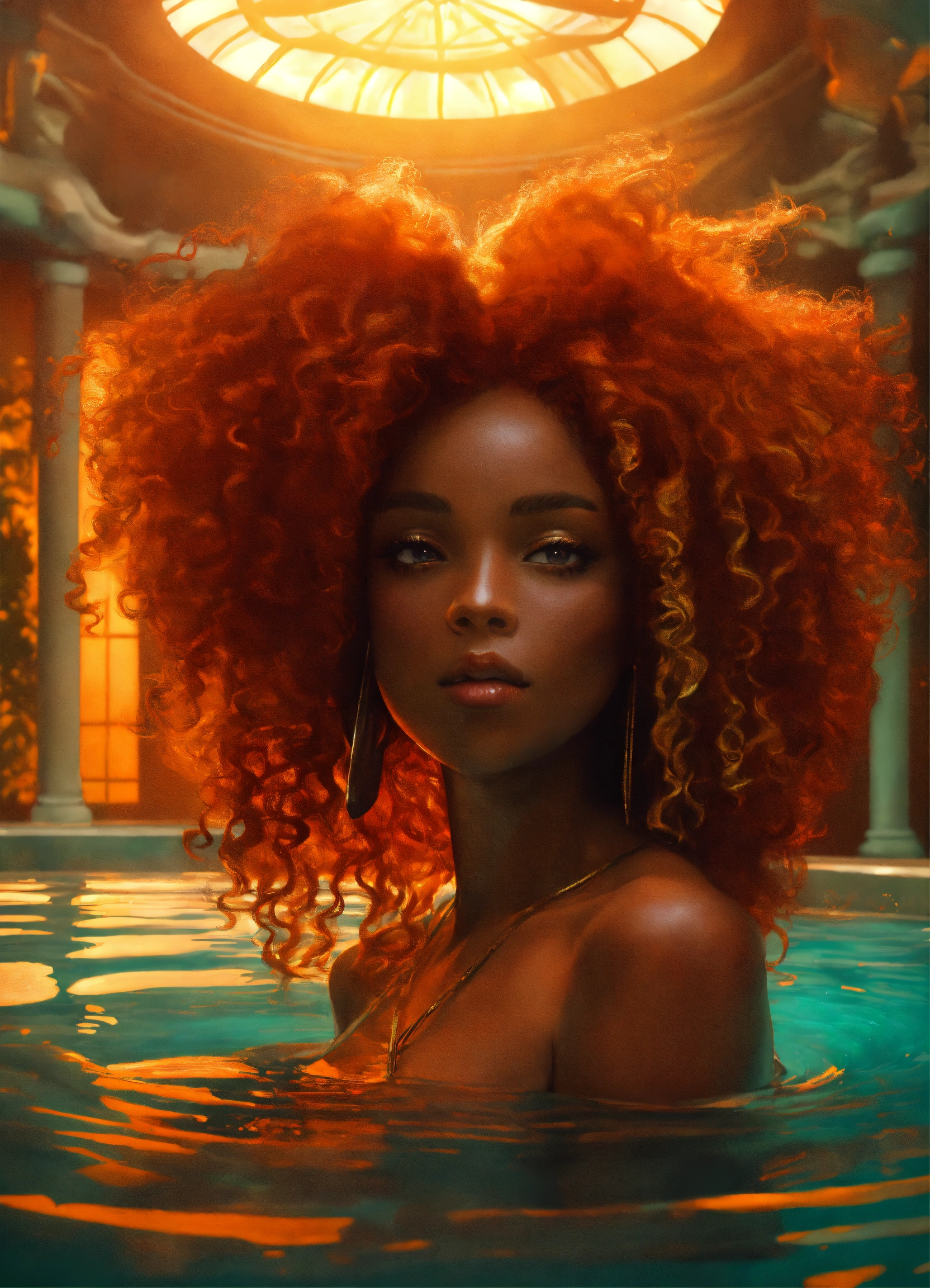 Pretty human looking alien with dark orange skin, huge reddish orange curly hair, african features, volumpious, wide hips, dressed in swim wear, in mystical indoor pool
