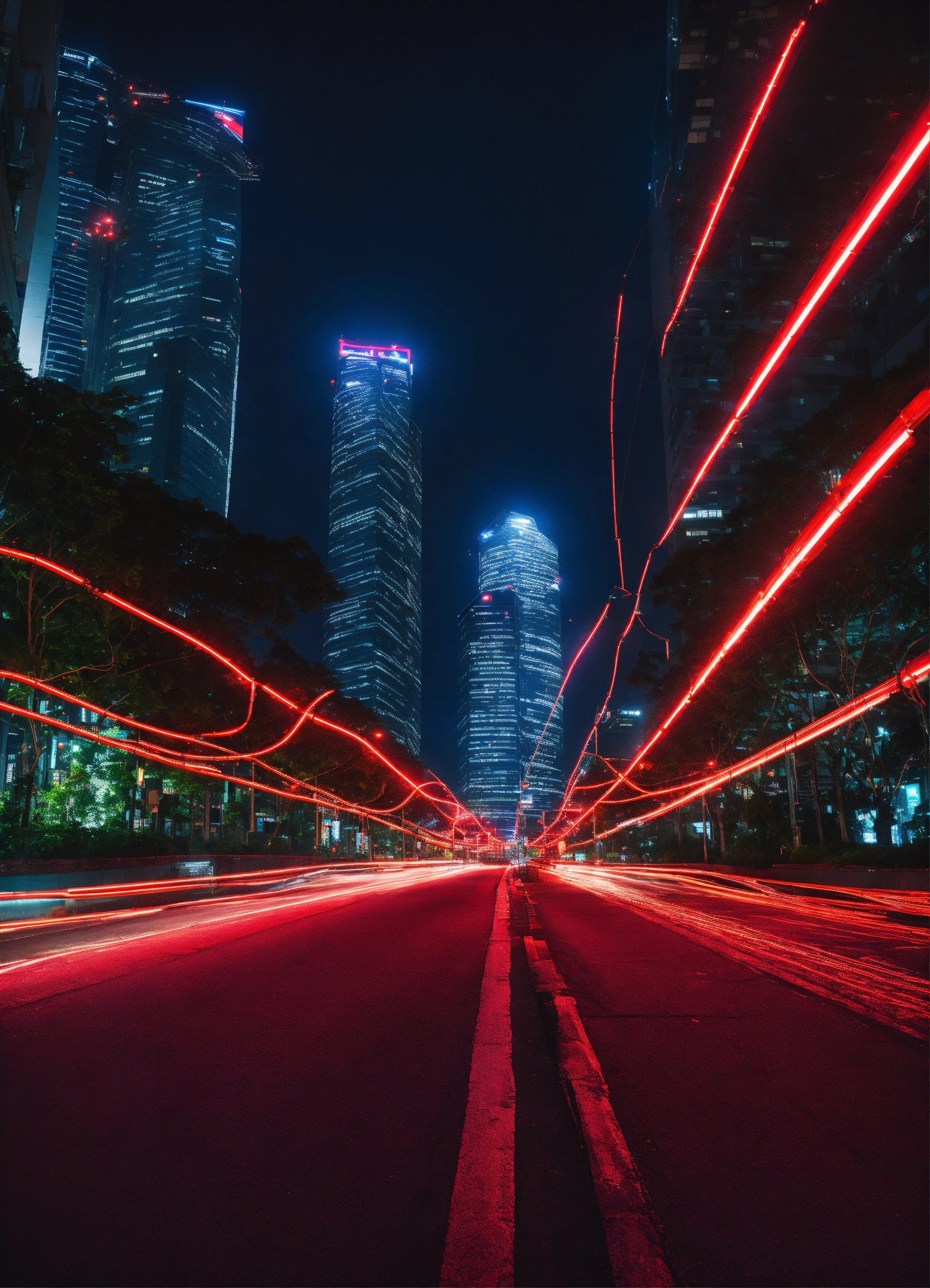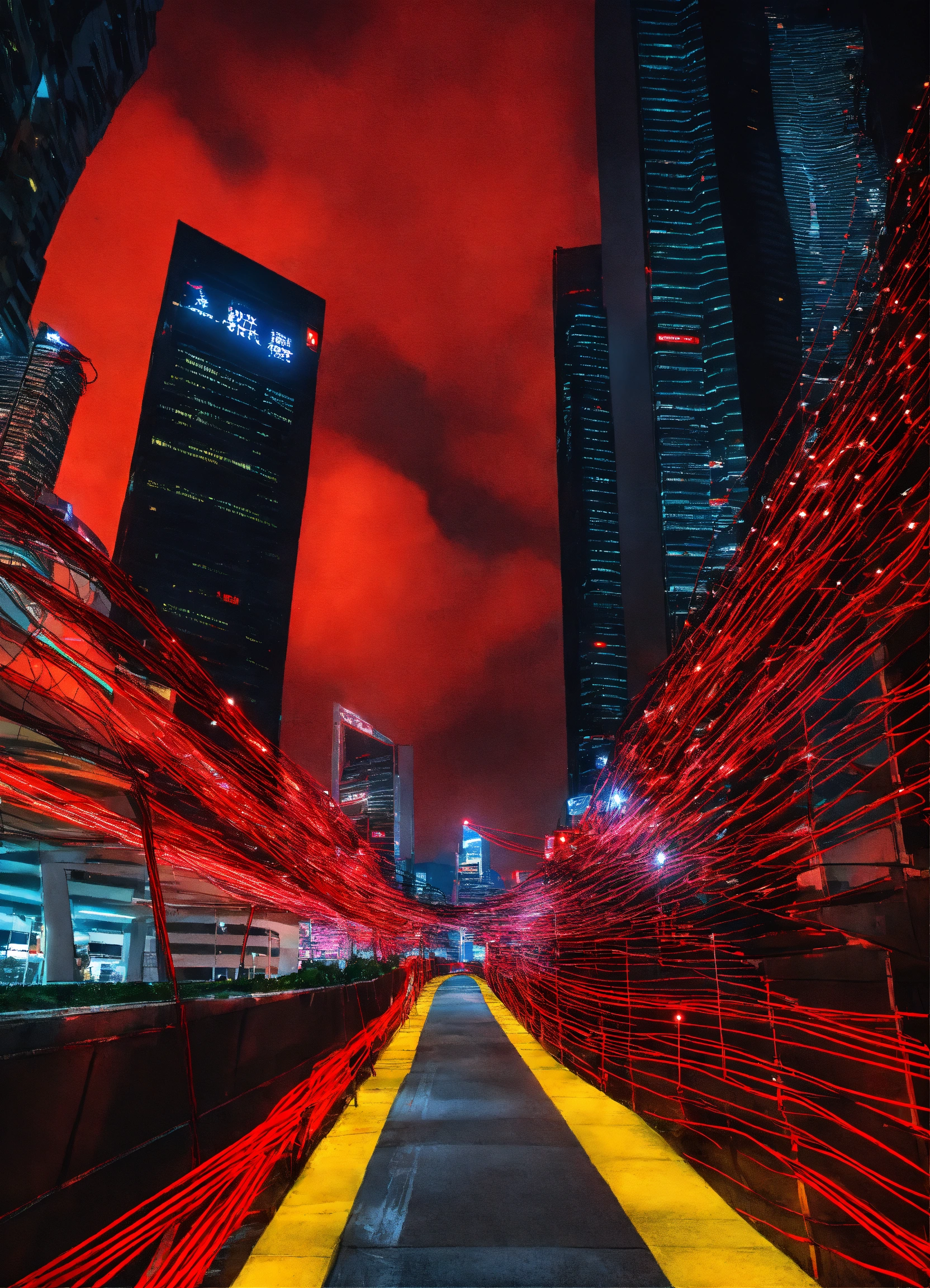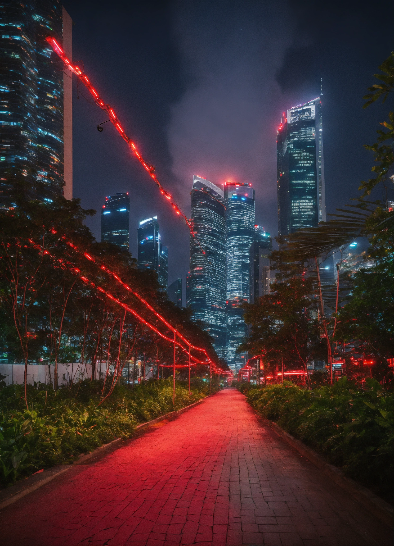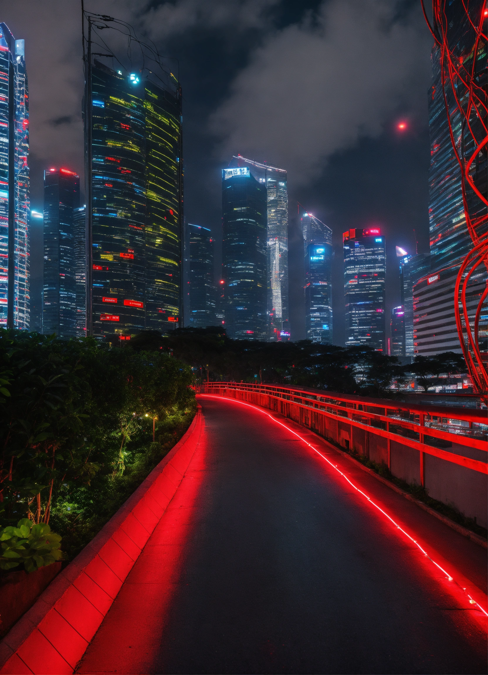 City path in dark futurist eco singapour street surrounded by skycrapper, red light wire coming from the sky glowing in the night, dark sky, multiple angle