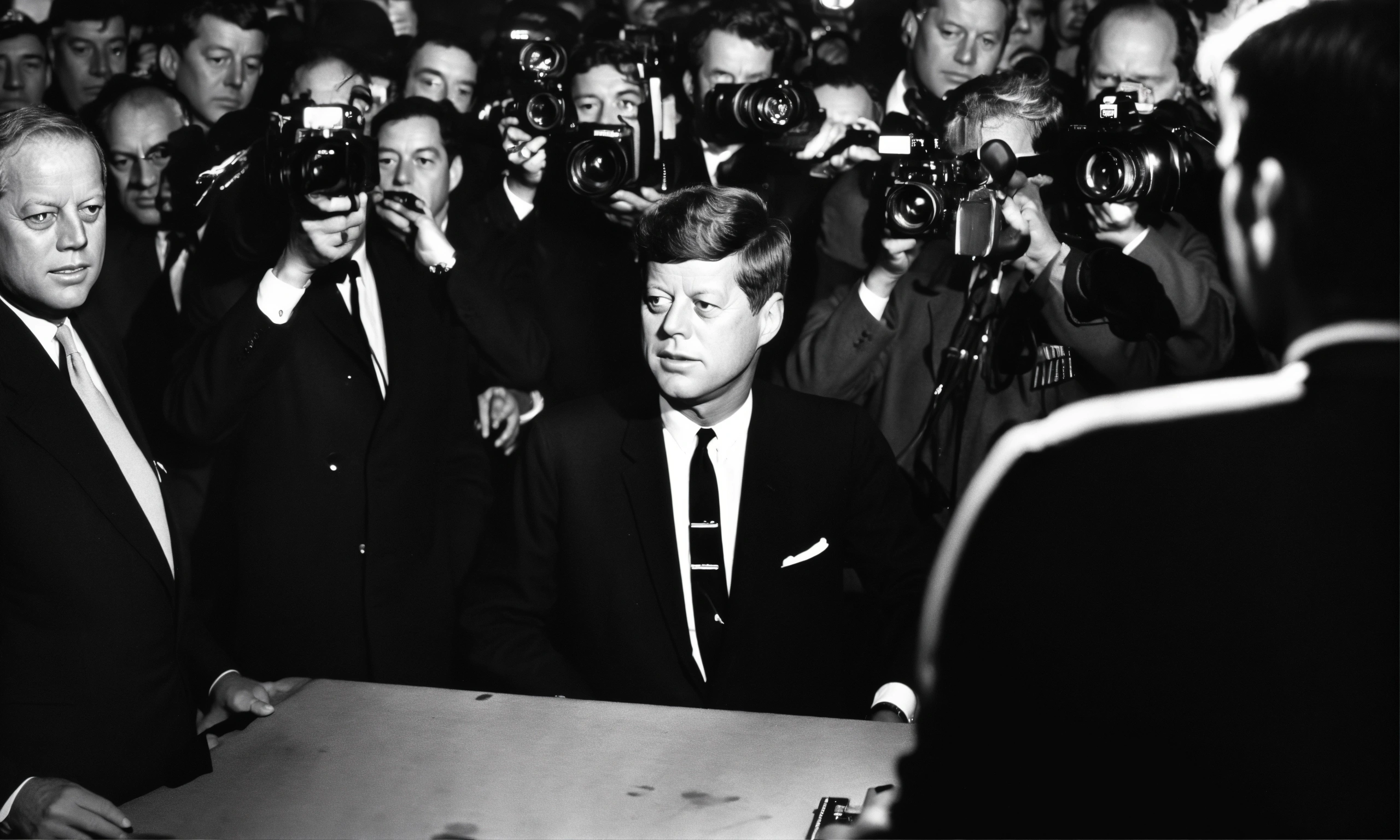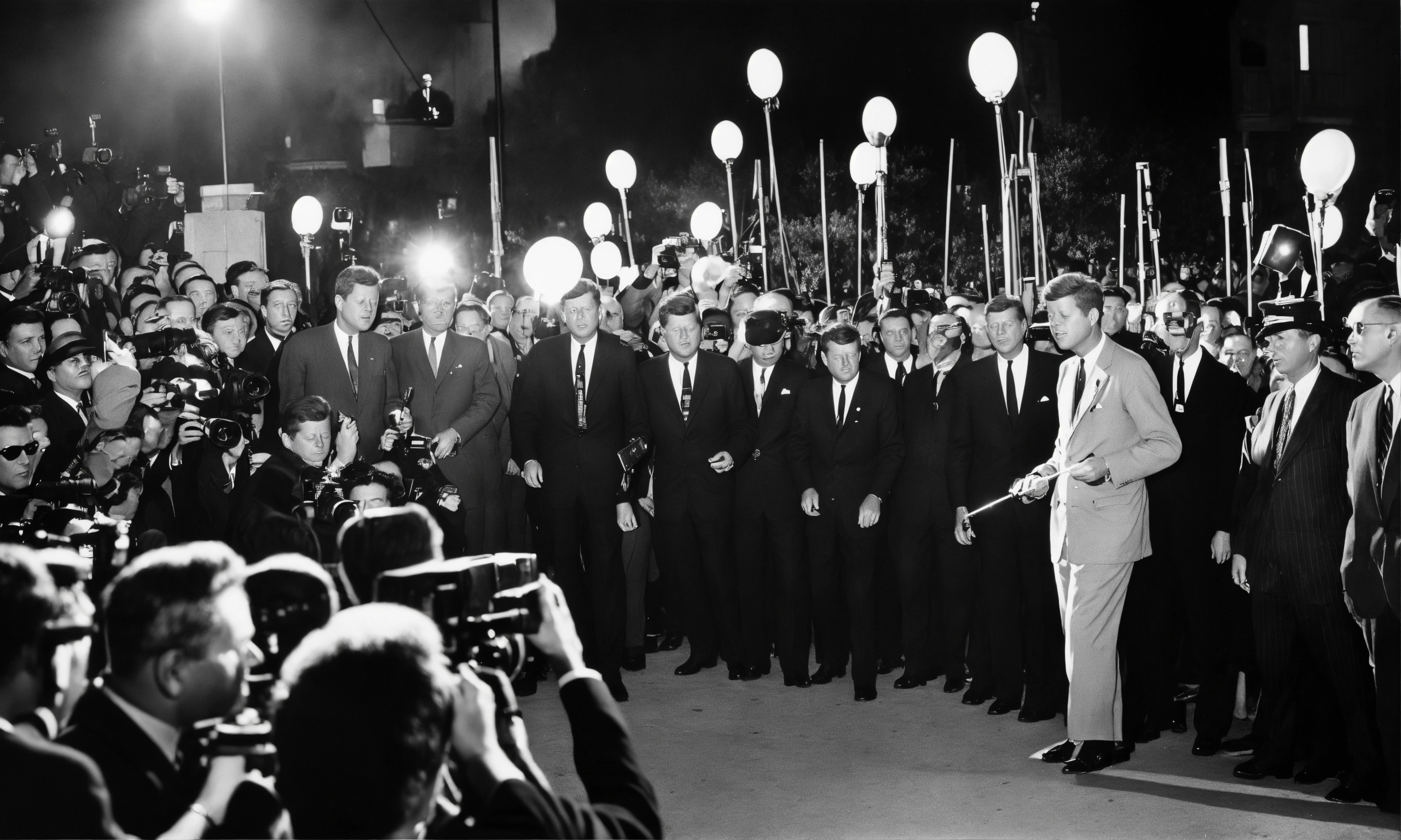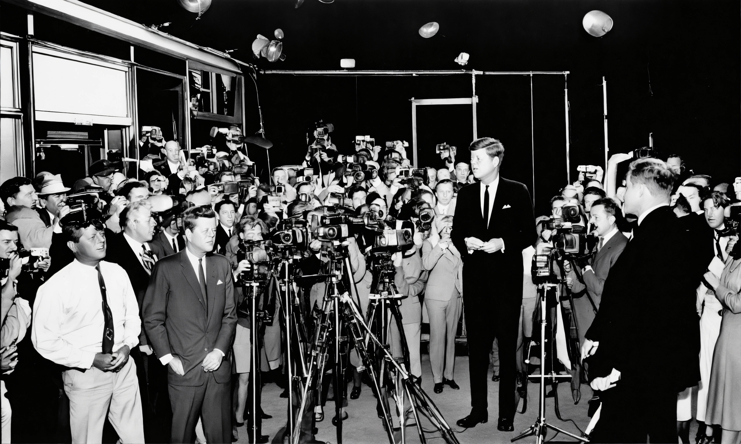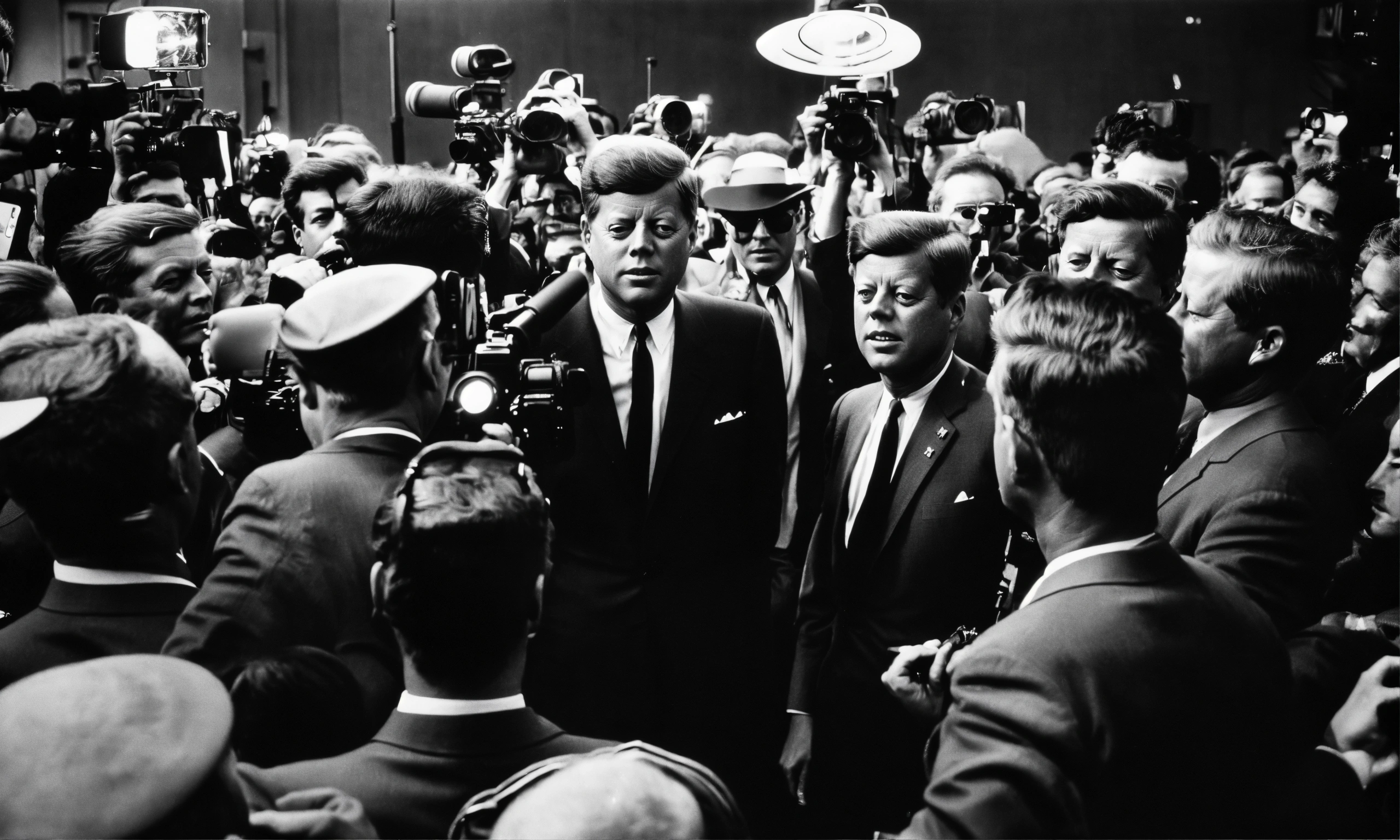 John f kennedy being photographed with flash by the press