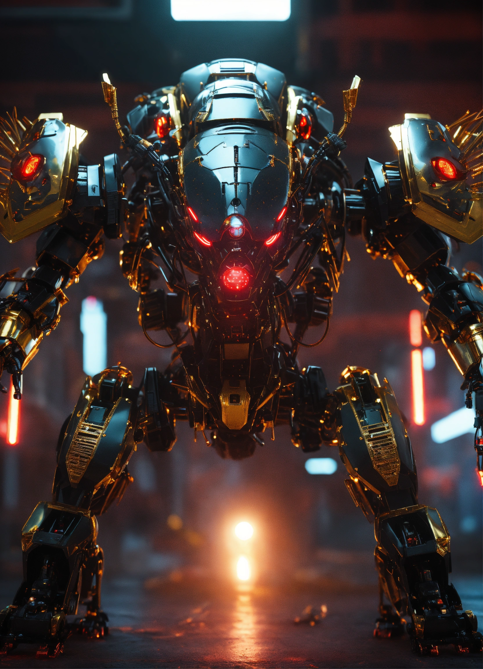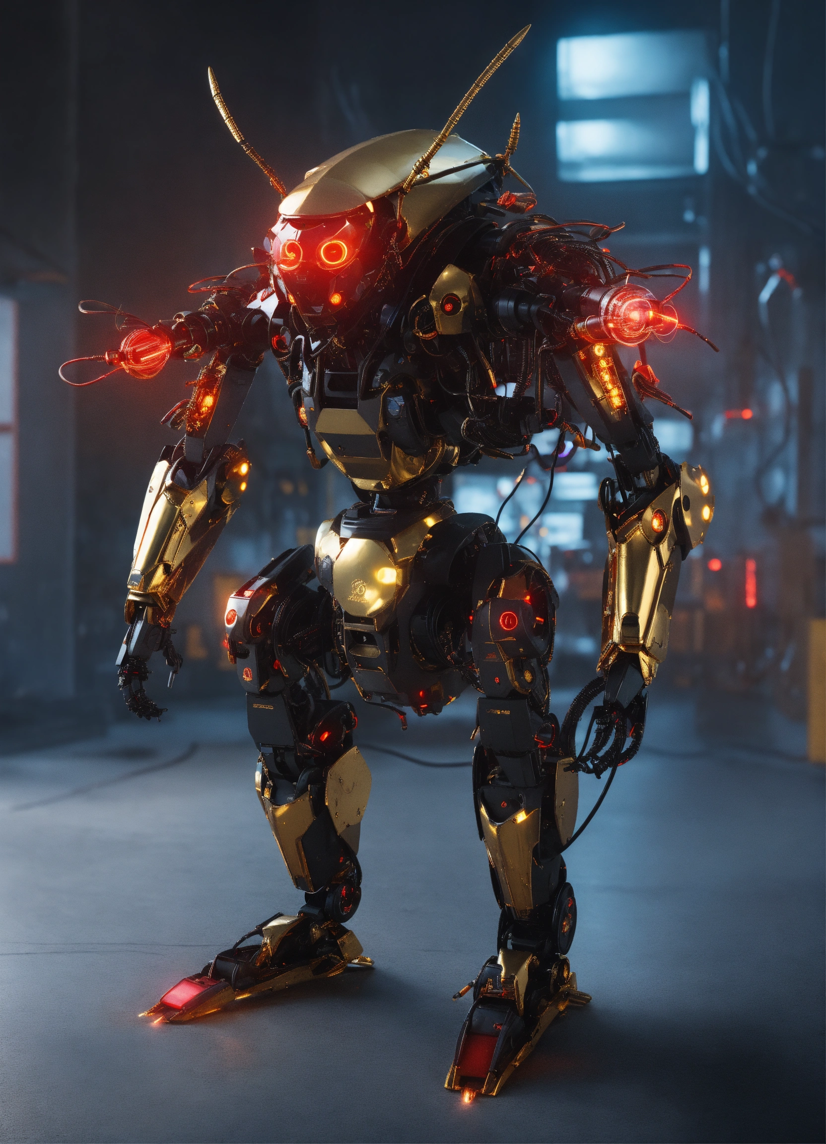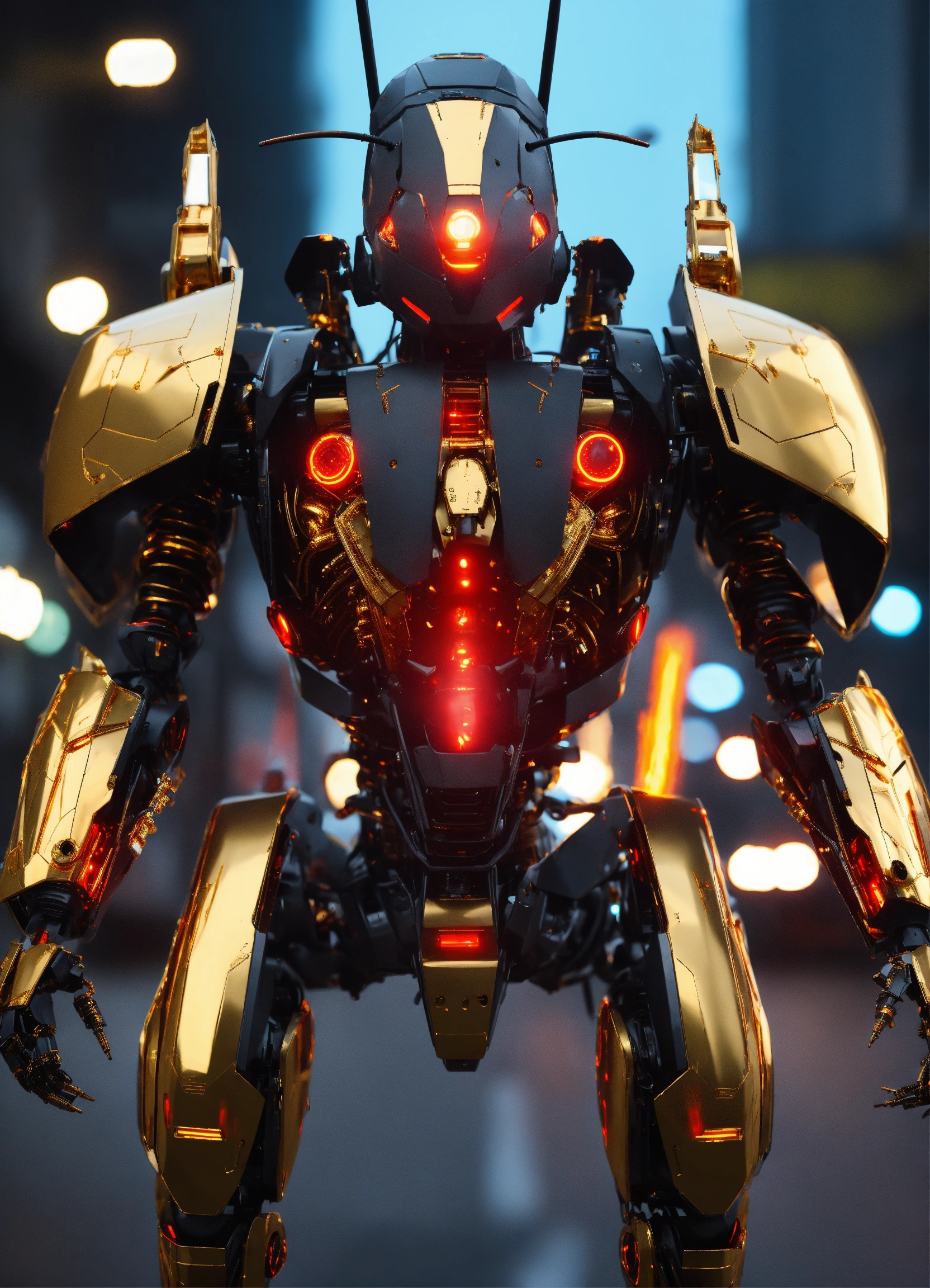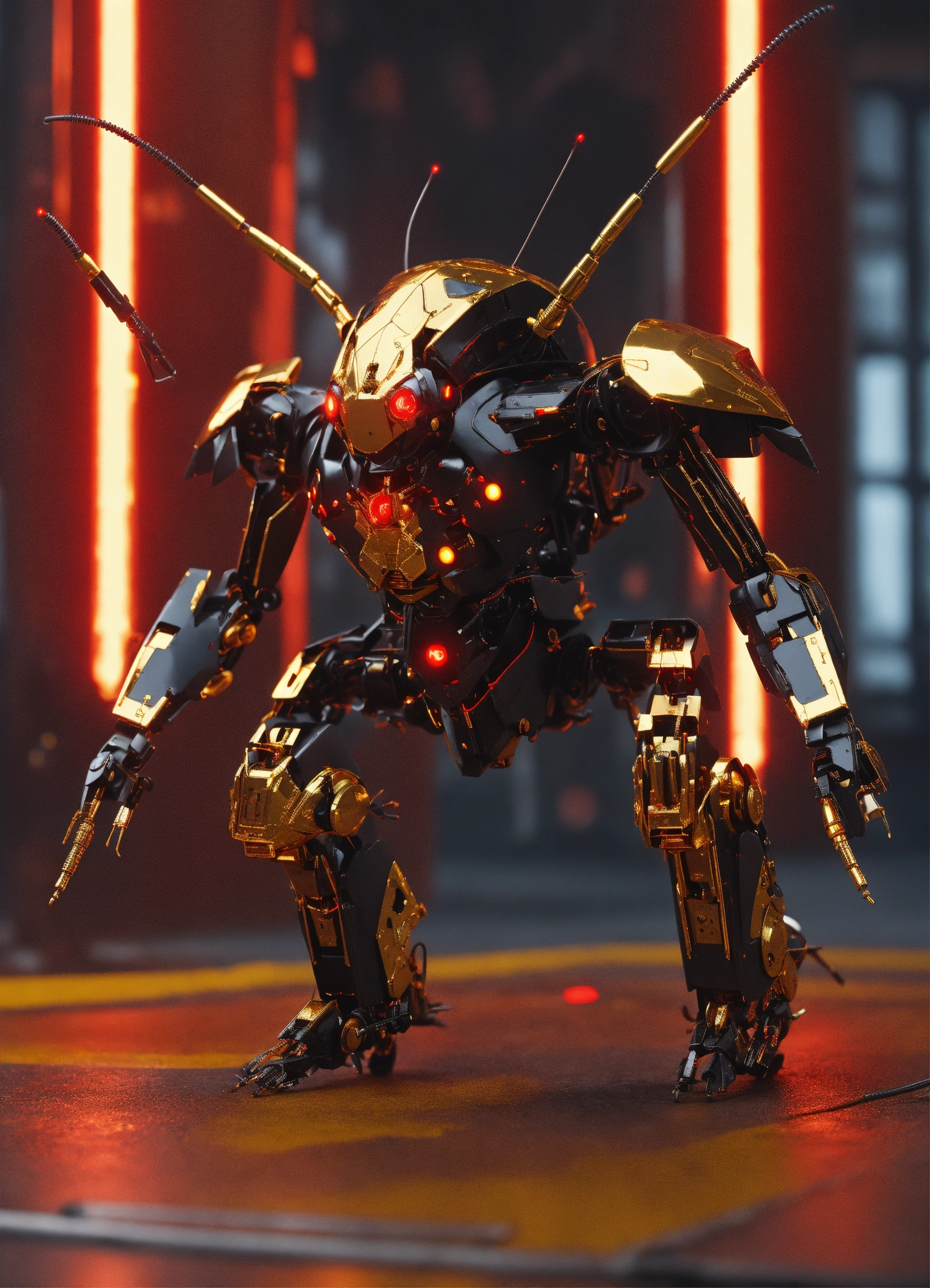 Zoom out of black cockroach faced humanoid robot with red glowing eyes, detailed gold circuitry on it's armor. standing and shooting electricity from his powerful antenna attacking, realistic, 8k